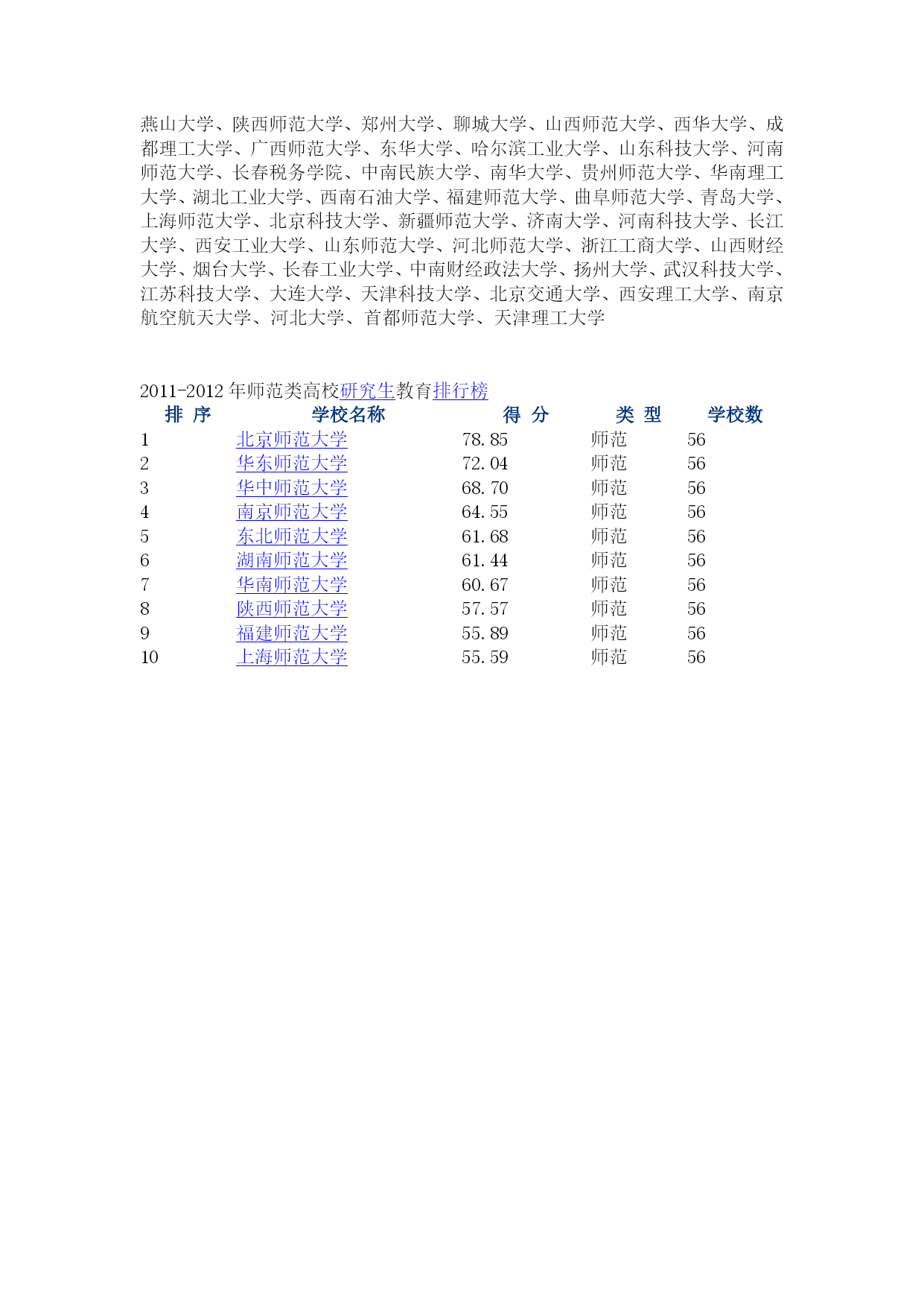 中国研究生教育分专业排行榜:050211外国语言学及应用语言学HYPERLINK"http://kaoyan.eol.cn/"http://kaoyan.eol.cn武汉大学中国科学评价研究中心2007-09-13HYPERLINK"javascript:fontZoom(16)"\t"_self"大HYPERLINK"javascript:fontZoom(14)"\t"_self"中HYPERLINK"javascript:fontZoom(12)"\t"_self"小HYPERLINK"http://kaoyan.eol.cn/html/ky/2012ky/"全国165万考生参加考研HYPERLINK"http://kaoyan.eol.cn/html/ky/paihang/2011.shtml"中国研究生教育排行榜HYPERLINK"http://kaoyan.eol.cn/fu_xi_gui_hua_3979/20120203/t20120203_736538.shtml"2013年考研备战时间表HYPERLINK"http://kaoyan.eol.cn/yuan_xiao_xin_xi_3988/20071127/t20071127_267351.shtml"名校周边备研生存手册HYPERLINK"http://kaoyan.eol.cn/html/ky/zhuanshuo/"专业学位硕士报考热攀升HYPERLINK"http://kaoyan.eol.cn/focus_6151/20120109/t20120109_729368.shtml"历年考研复试分数线排名学校名称等级排名学校名称等级排名学校名称等级1广东外语外贸大学A+13北京师范大学A25湖南大学A2北京外国语大学A+14华中师范大学A26厦门大学A3南京大学A+15中南大学A27中国海洋大学A4中山大学A+16东南大学A28延边大学A5对外经济贸易大学A+17上海大学A29大连外国语学院A6南京师范大学A+18华南师范大学A30山东大学A7上海外国语大学A+19宁波大学A31清华大学A8四川大学A+20华东师范大学A32江苏大学A9上海交通大学A21南昌航空工业学院A33重庆大学A10西安外国语大学A22吉林大学A34同济大学A11复旦大学A23暨南大学A12上海对外贸易学院A24西安交通大学AB+等(53个):北京航空航天大学、西南交通大学、苏州大学、南开大学、电子科技大学、深圳大学、四川外语学院、上海海事大学、长春理工大学、哈尔滨师范大学、长沙理工大学、沈阳师范大学、云南师范大学、大连理工大学、华中科技大学、湘潭大学、浙江大学、浙江师范大学、西南政法大学、广西大学、湖南师范大学、河南大学、华东理工大学、太原理工大学、湖北大学、东北财经大学、东北师范大学、天津大学、贵州大学、北京语言大学、东北大学、南京工业大学、西安电子科技大学、西南大学、西南财经大学、安徽大学、中国地质大学、黑龙江大学、江西师范大学、武汉理工大学、上海理工大学、西北师范大学、北京理工大学、重庆师范大学、外交学院、北华大学、西北农林科技大学、大连海事大学、广西民族学院、北京第二外国语学院、西北大学、青岛科技大学、西北工业大学B等(52个):武汉大学、南昌大学、北京林业大学、内蒙古大学、山西大学、燕山大学、陕西师范大学、郑州大学、聊城大学、山西师范大学、西华大学、成都理工大学、广西师范大学、东华大学、哈尔滨工业大学、山东科技大学、河南师范大学、长春税务学院、中南民族大学、南华大学、贵州师范大学、华南理工大学、湖北工业大学、西南石油大学、福建师范大学、曲阜师范大学、青岛大学、上海师范大学、北京科技大学、新疆师范大学、济南大学、河南科技大学、长江大学、西安工业大学、山东师范大学、河北师范大学、浙江工商大学、山西财经大学、烟台大学、长春工业大学、中南财经政法大学、扬州大学、武汉科技大学、江苏科技大学、大连大学、天津科技大学、北京交通大学、西安理工大学、南京航空航天大学、河北大学、首都师范大学、天津理工大学2011-2012年师范类高校HYPERLINK"http://www.nseac.com/html/2/"\t"_blank"研究生教育HYPERLINK"http://www.nseac.com/"\t"_blank"排行榜排序学校名称得分类型学校数1HYPERLINK"http://school.nseac.com/sch.php?schid=10027"\t"_blank"北京师范大学78.85师范562HYPERLINK"http://school.nseac.com/sc