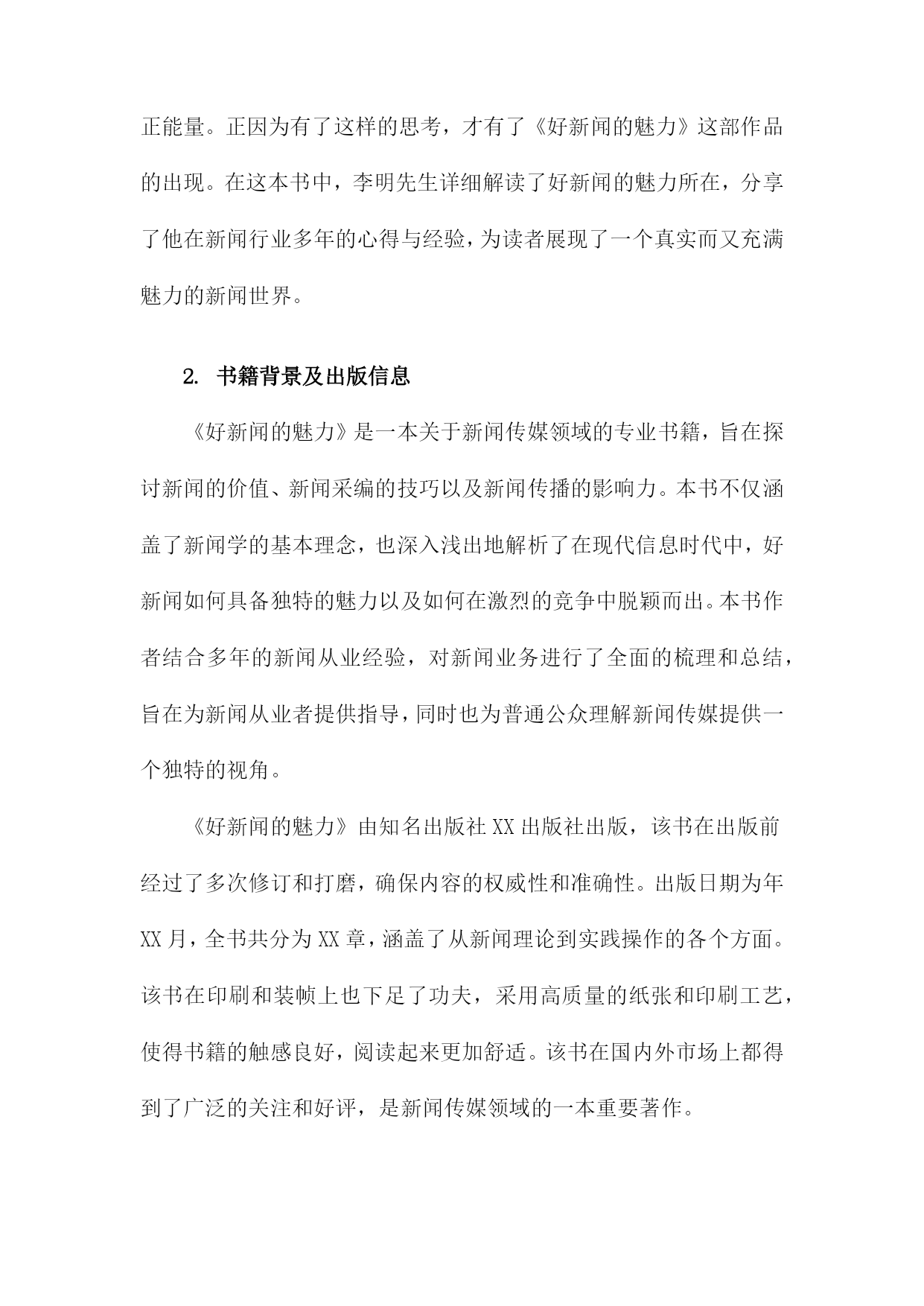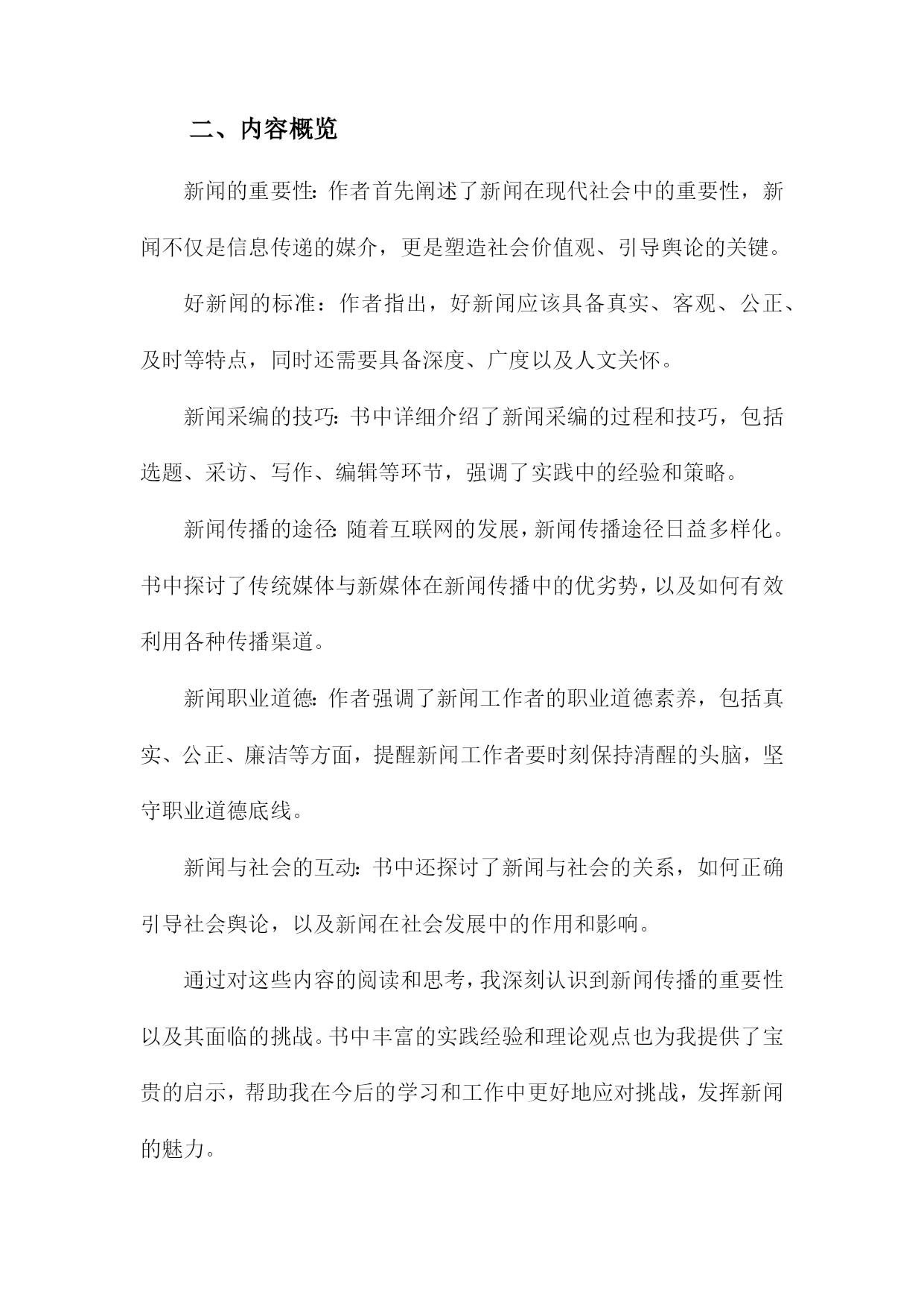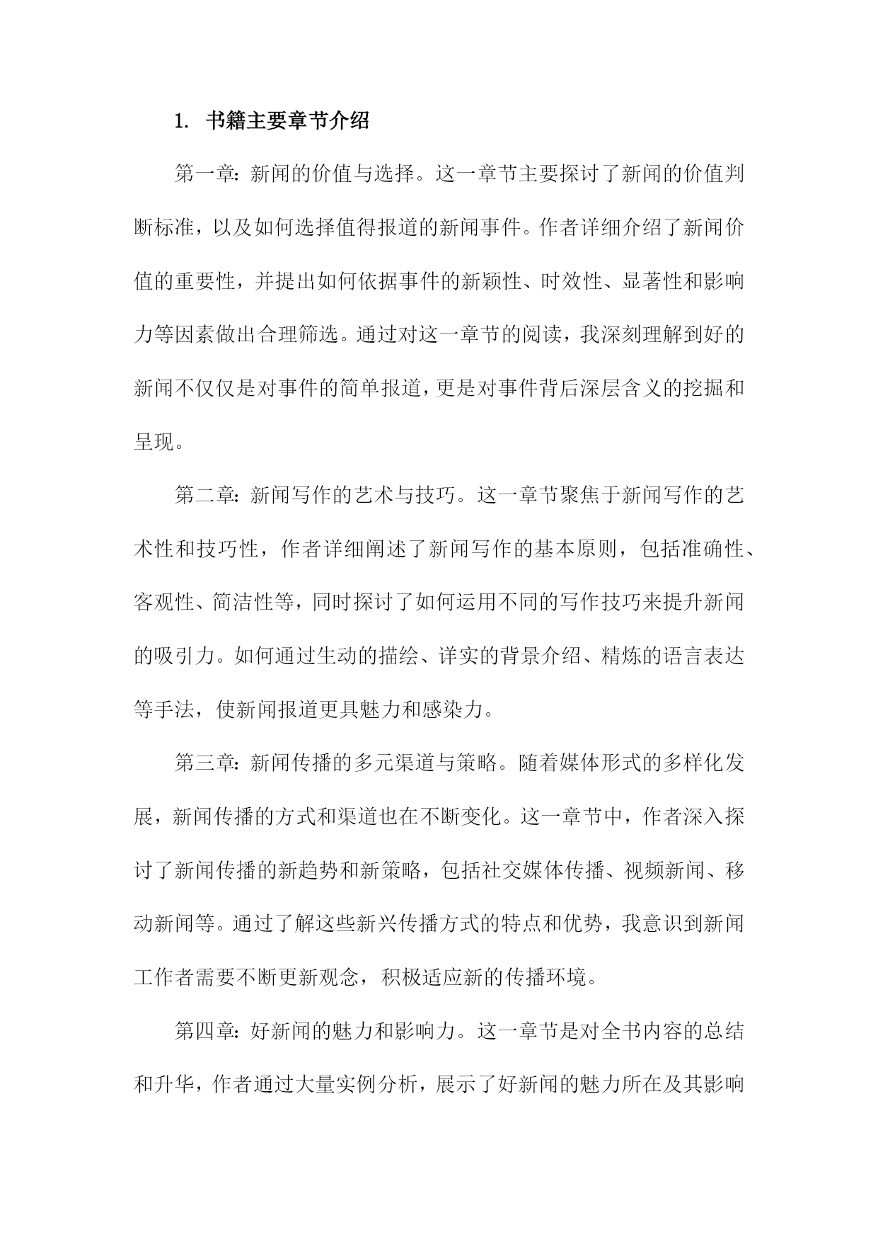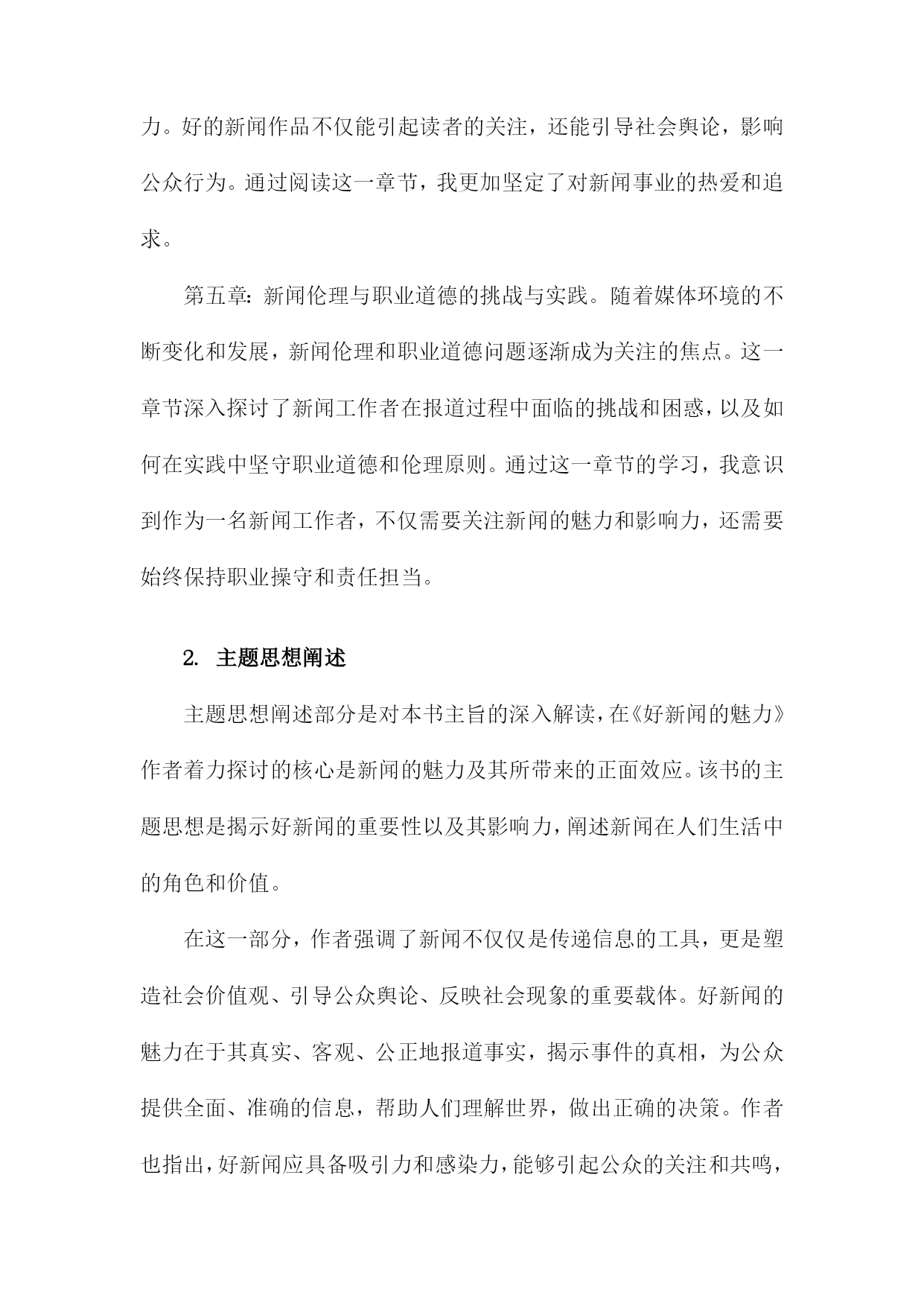 《好新闻的魅力》读书笔记一、书籍简介《好新闻的魅力》是一本关于新闻传媒领域的专业书籍,深入探讨了新闻的价值和魅力所在。本书旨在帮助读者理解新闻背后的深层含义,以及如何从新闻中获取有价值的信息。本书不仅涵盖了新闻的制作和传播过程,还详细介绍了新闻与社会的相互影响和关系,是一部理论和实践相结合的专业作品。通过阅读这本书,读者能够深入理解新闻的价值,认识到好新闻对社会和个人的影响力,从而增强对新闻行业的认识和了解。本书内容充实、语言生动,既适合新闻传播专业人士的学习研究,也适合对新闻传媒感兴趣的普通读者阅读。1.作者介绍我所阅读的这本书《好新闻的魅力》的作者是著名的新闻界专家——李明。李明先生是中国新闻界的重要人物之一,拥有多年的新闻从业经验,不仅在新闻采编方面有着深厚的功底,还曾在新闻教育、新闻理论研究等领域有所建树。他对于新闻事业的热爱与执着,使得他对于新闻的洞察更为敏锐,对于新闻价值的判断更为精准。李明先生对于新闻工作的理解不仅仅停留在事件的报道上,他更关注新闻背后的深层含义,以及如何更好地通过新闻传递真实、传递正能量。正因为有了这样的思考,才有了《好新闻的魅力》这部作品的出现。在这本书中,李明先生详细解读了好新闻的魅力所在,分享了他在新闻行业多年的心得与经验,为读者展现了一个真实而又充满魅力的新闻世界。2.书籍背景及出版信息《好新闻的魅力》是一本关于新闻传媒领域的专业书籍,旨在探讨新闻的价值、新闻采编的技巧以及新闻传播的影响力。本书不仅涵盖了新闻学的基本理念,也深入浅出地解析了在现代信息时代中,好新闻如何具备独特的魅力以及如何在激烈的竞争中脱颖而出。本书作者结合多年的新闻从业经验,对新闻业务进行了全面的梳理和总结,旨在为新闻从业者提供指导,同时也为普通公众理解新闻传媒提供一个独特的视角。《好新闻的魅力》由知名出版社XX出版社出版,该书在出版前经过了多次修订和打磨,确保内容的权威性和准确性。出版日期为年XX月,全书共分为XX章,涵盖了从新闻理论到实践操作的各个方面。该书在印刷和装帧上也下足了功夫,采用高质量的纸张和印刷工艺,使得书籍的触感良好,阅读起来更加舒适。该书在国内外市场上都得到了广泛的关注和好评,是新闻传媒领域的一本重要著作。二、内容概览新闻的重要性:作者首先阐述了新闻在现代社会中的重要性,新闻不仅是信息传递的媒介,更是塑造社会价值观、引导舆论的关键。好新闻的标准:作者指出,好新闻应该具备真实、客观、公正、及时等特点,同时还需要具备深度、广度以及人文关怀。新闻采编的技巧:书中详细介绍了新闻采编的过程和技巧,包括选题、采访、写作、编辑等环节,强调了实践中的经验和策略。新闻传播的途径:随着互联网的发展,新闻传播途径日益多样化。书中探讨了传统媒体与新媒体在新闻传播中的优劣势,以及如何有效利用各种传播渠道。新闻职业道德:作者强调了新闻工作者的职业道德素养,包括真实、公正、廉洁等方面,提醒新闻工作者要时刻保持清醒的头脑,坚守职业道德底线。新闻与社会的互动:书中还探讨了新闻与社会的关系,如何正确引导社会舆论,以及新闻在社会发展中的作用和影响。通过对这些内容的阅读和思考,我深刻认识到新闻传播的重要性以及其面临的挑战。书中丰富的实践经验和理论观点也为我提供了宝贵的启示,帮助我在今后的学习和工作中更好地应对挑战,发挥新闻的魅力。1.书籍主要章节介绍第一章:新闻的价值与选择。这一章节主要探讨了新闻的价值判断标准,以及如何选择值得报道的新闻事件。作者详细介绍了新闻价值的重要性,并提出如何依据事件的新颖性、时效性、显著性和影响力等因素做出合理筛选。通过对这一章节的阅读,我深刻理解到好的新闻不仅仅是对事件的简单报道,更是对事件背后深层含义的挖掘和呈现。第二章:新闻写作的艺术与技巧。这一章节聚焦于新闻写作的艺术性和技巧性,作者详细阐述了新闻写作的基本原则,包括准确性、客观性、简洁性等,同时探讨了如何运用不同的写作技巧来提升新闻的吸引力。如何通过生动的描绘、详实的背景介绍、精炼的语言表达等手法,使新闻报道更具魅力和感染力。第三章:新闻传播的多元渠道与策略。随着媒体形式的多样化发展,新闻传播的方式和渠道也在不断变化。这一章节中,作者深入探讨了新闻传播的新趋势和新策略,包括社交媒体传播、视频新闻、移动新闻等。通过了解这些新兴传播方式的特点和优势,我意识到新闻工作者需要不断更新观念,积极适应新的传播环境。第四章:好新闻的魅力和影响力。这一章节是对全书内容的总结和升华,作者通过大量实例分析,展示了好新闻的魅力所在及其影响力。好的新闻作品不仅能引起读者的关注,还能引导社会舆论,影响公众行为。通过阅读这一章节,我更加坚定了对新闻事业的热爱和追求。第五章:新闻伦理与职业道德的挑战与实践。随着媒体环境的不断变化和发展,新