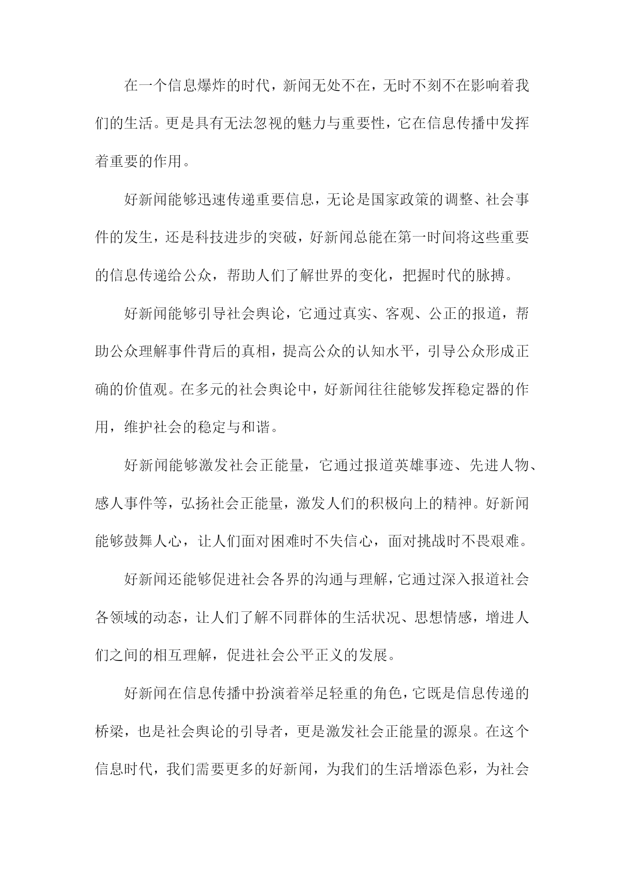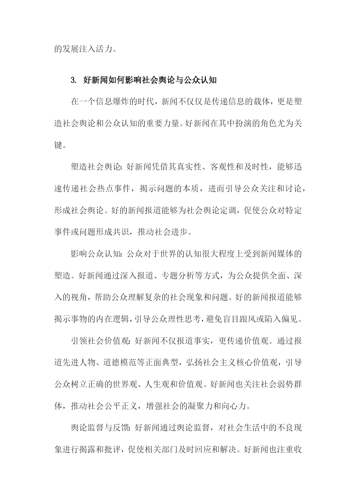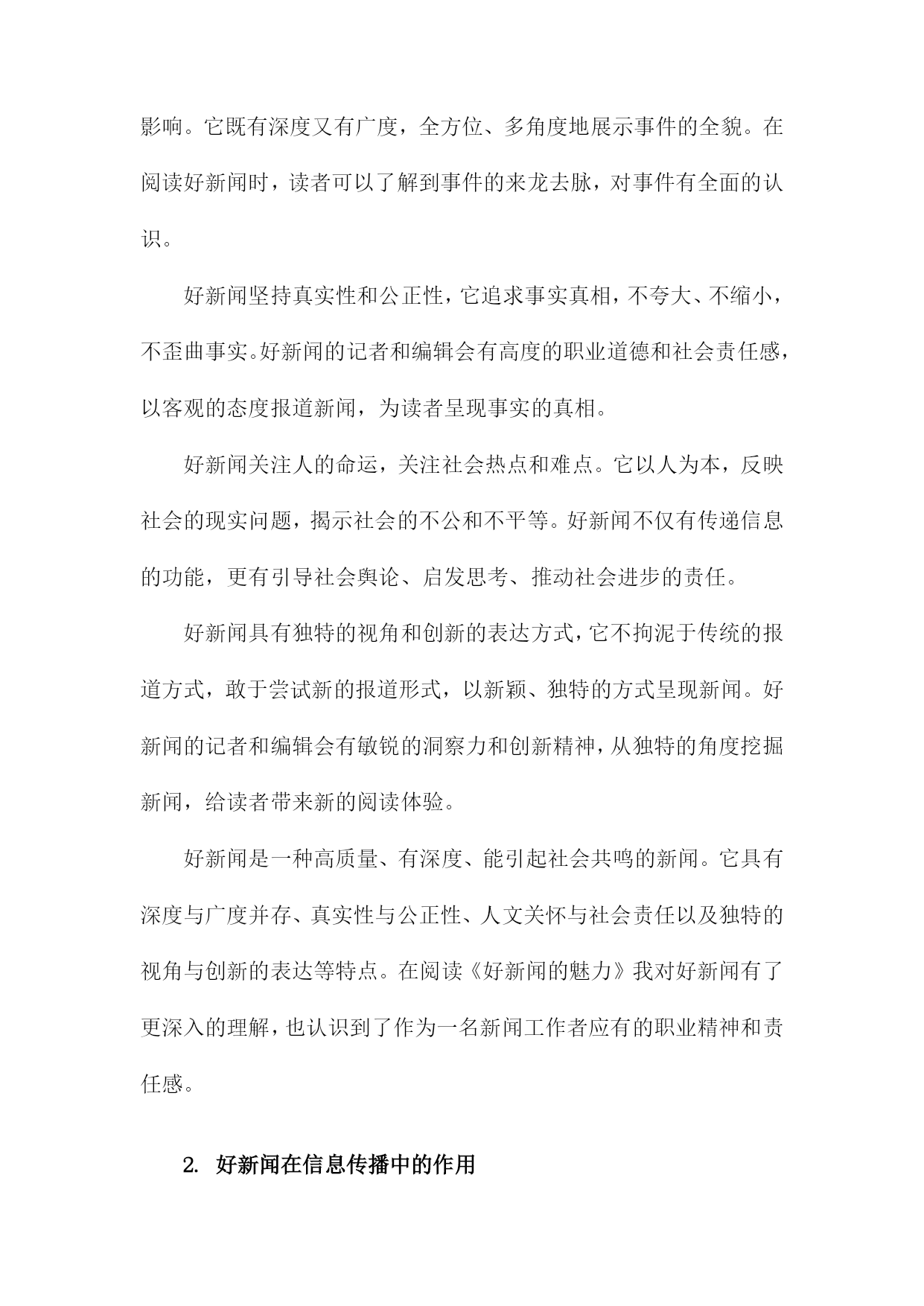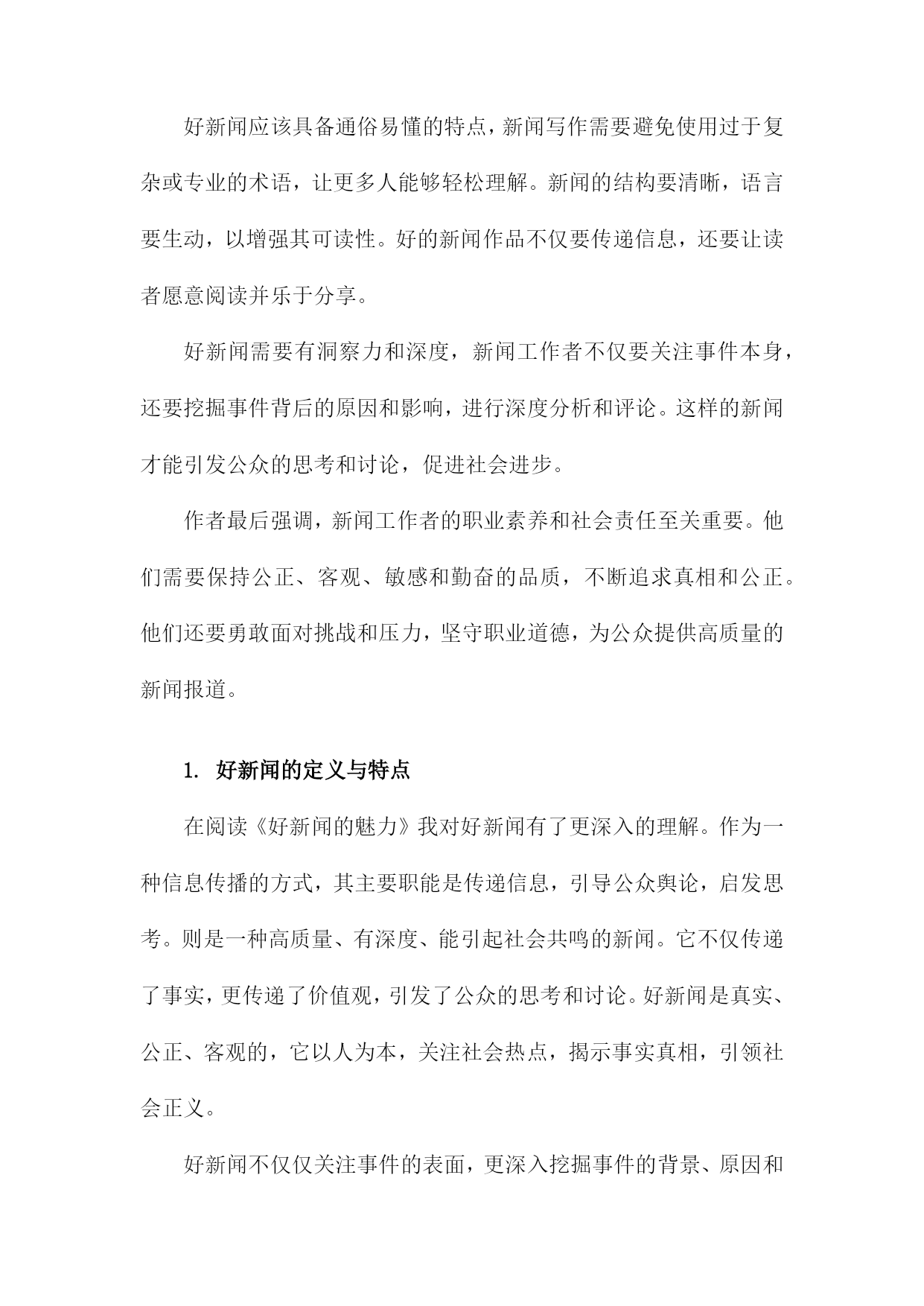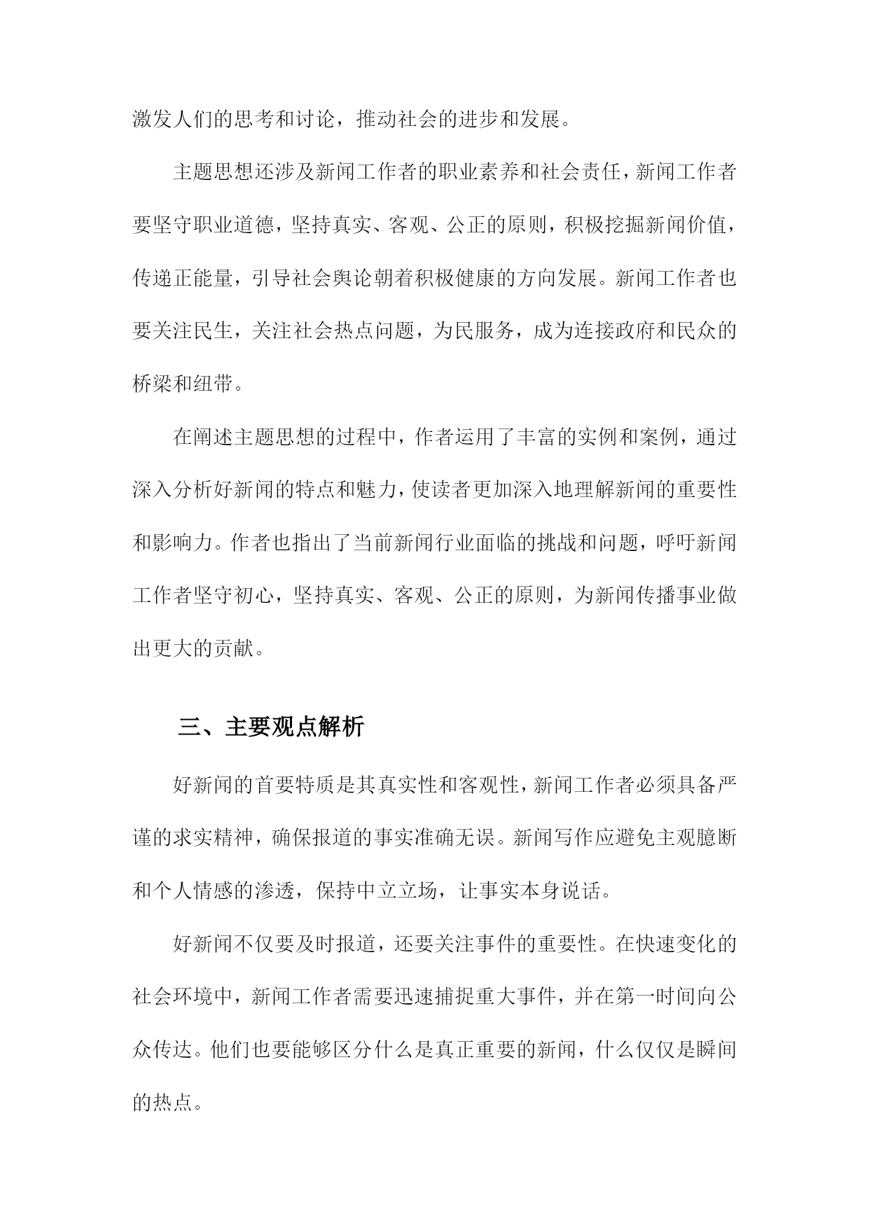 《好新闻的魅力》读书笔记一、书籍简介《好新闻的魅力》是一本关于新闻传媒领域的专业书籍,深入探讨了新闻的价值和魅力所在。本书旨在帮助读者理解新闻背后的深层含义,以及如何从新闻中获取有价值的信息。本书不仅涵盖了新闻的制作和传播过程,还详细介绍了新闻与社会的相互影响和关系,是一部理论和实践相结合的专业作品。通过阅读这本书,读者能够深入理解新闻的价值,认识到好新闻对社会和个人的影响力,从而增强对新闻行业的认识和了解。本书内容充实、语言生动,既适合新闻传播专业人士的学习研究,也适合对新闻传媒感兴趣的普通读者阅读。1.作者介绍我所阅读的这本书《好新闻的魅力》的作者是著名的新闻界专家——李明。李明先生是中国新闻界的重要人物之一,拥有多年的新闻从业经验,不仅在新闻采编方面有着深厚的功底,还曾在新闻教育、新闻理论研究等领域有所建树。他对于新闻事业的热爱与执着,使得他对于新闻的洞察更为敏锐,对于新闻价值的判断更为精准。李明先生对于新闻工作的理解不仅仅停留在事件的报道上,他更关注新闻背后的深层含义,以及如何更好地通过新闻传递真实、传递正能量。正因为有了这样的思考,才有了《好新闻的魅力》这部作品的出现。在这本书中,李明先生详细解读了好新闻的魅力所在,分享了他在新闻行业多年的心得与经验,为读者展现了一个真实而又充满魅力的新闻世界。2.书籍背景及出版信息《好新闻的魅力》是一本关于新闻传媒领域的专业书籍,旨在探讨新闻的价值、新闻采编的技巧以及新闻传播的影响力。本书不仅涵盖了新闻学的基本理念,也深入浅出地解析了在现代信息时代中,好新闻如何具备独特的魅力以及如何在激烈的竞争中脱颖而出。本书作者结合多年的新闻从业经验,对新闻业务进行了全面的梳理和总结,旨在为新闻从业者提供指导,同时也为普通公众理解新闻传媒提供一个独特的视角。《好新闻的魅力》由知名出版社XX出版社出版,该书在出版前经过了多次修订和打磨,确保内容的权威性和准确性。出版日期为年XX月,全书共分为XX章,涵盖了从新闻理论到实践操作的各个方面。该书在印刷和装帧上也下足了功夫,采用高质量的纸张和印刷工艺,使得书籍的触感良好,阅读起来更加舒适。该书在国内外市场上都得到了广泛的关注和好评,是新闻传媒领域的一本重要著作。二、内容概览新闻的重要性:作者首先阐述了新闻在现代社会中的重要性,新闻不仅是信息传递的媒介,更是塑造社会价值观、引导舆论的关键。好新闻的标准:作者指出,好新闻应该具备真实、客观、公正、及时等特点,同时还需要具备深度、广度以及人文关怀。新闻采编的技巧:书中详细介绍了新闻采编的过程和技巧,包括选题、采访、写作、编辑等环节,强调了实践中的经验和策略。新闻传播的途径:随着互联网的发展,新闻传播途径日益多样化。书中探讨了传统媒体与新媒体在新闻传播中的优劣势,以及如何有效利用各种传播渠道。新闻职业道德:作者强调了新闻工作者的职业道德素养,包括真实、公正、廉洁等方面,提醒新闻工作者要时刻保持清醒的头脑,坚守职业道德底线。新闻与社会的互动:书中还探讨了新闻与社会的关系,如何正确引导社会舆论,以及新闻在社会发展中的作用和影响。通过对这些内容的阅读和思考,我深刻认识到新闻传播的重要性以及其面临的挑战。书中丰富的实践经验和理论观点也为我提供了宝贵的启示,帮助我在今后的学习和工作中更好地应对挑战,发挥新闻的魅力。1.书籍主要章节介绍第一章:新闻的价值与选择。这一章节主要探讨了新闻的价值判断标准,以及如何选择值得报道的新闻事件。作者详细介绍了新闻价值的重要性,并提出如何依据事件的新颖性、时效性、显著性和影响力等因素做出合理筛选。通过对这一章节的阅读,我深刻理解到好的新闻不仅仅是对事件的简单报道,更是对事件背后深层含义的挖掘和呈现。第二章:新闻写作的艺术与技巧。这一章节聚焦于新闻写作的艺术性和技巧性,作者详细阐述了新闻写作的基本原则,包括准确性、客观性、简洁性等,同时探讨了如何运用不同的写作技巧来提升新闻的吸引力。如何通过生动的描绘、详实的背景介绍、精炼的语言表达等手法,使新闻报道更具魅力和感染力。第三章:新闻传播的多元渠道与策略。随着媒体形式的多样化发展,新闻传播的方式和渠道也在不断变化。这一章节中,作者深入探讨了新闻传播的新趋势和新策略,包括社交媒体传播、视频新闻、移动新闻等。通过了解这些新兴传播方式的特点和优势,我意识到新闻工作者需要不断更新观念,积极适应新的传播环境。第四章:好新闻的魅力和影响力。这一章节是对全书内容的总结和升华,作者通过大量实例分析,展示了好新闻的魅力所在及其影响力。好的新闻作品不仅能引起读者的关注,还能引导社会舆论,影响公众行为。通过阅读这一章节,我更加坚定了对新闻事业的热爱和追求。第五章:新闻伦理与职业道德的挑战与实践。随着媒体环境的不断变化和发展,新