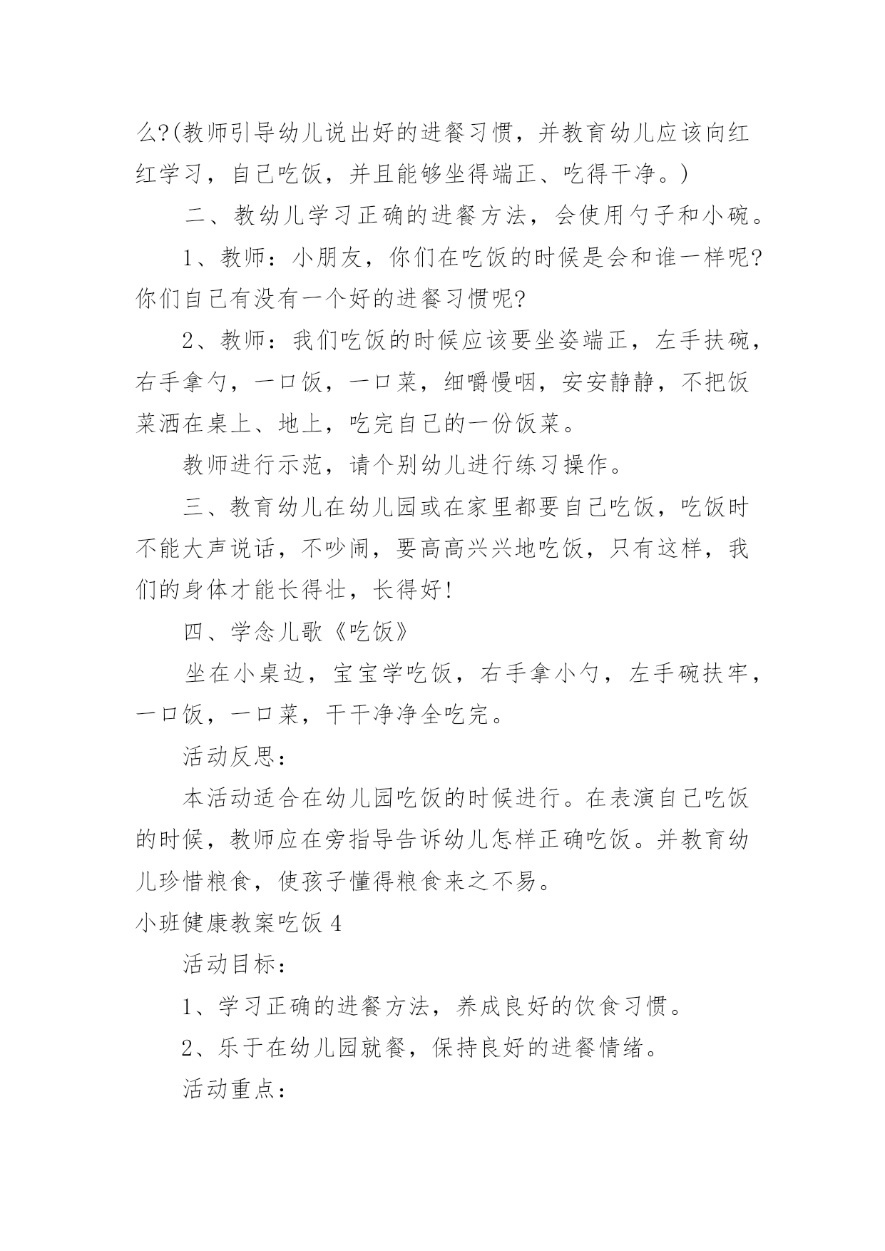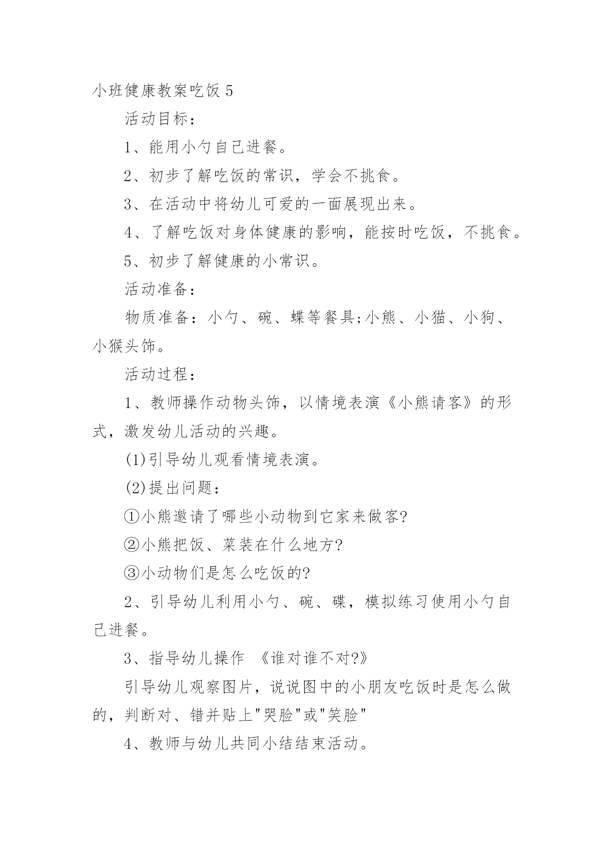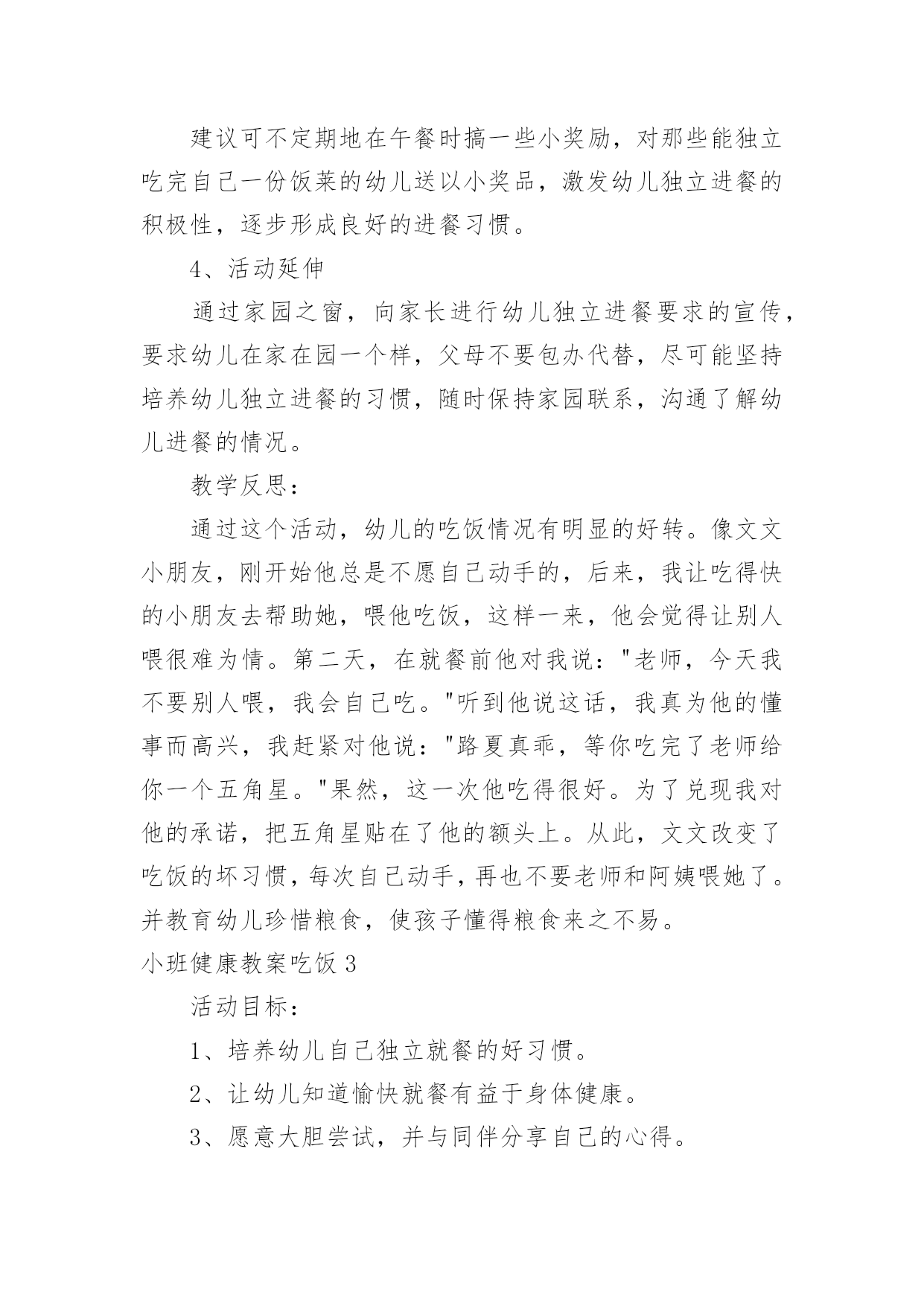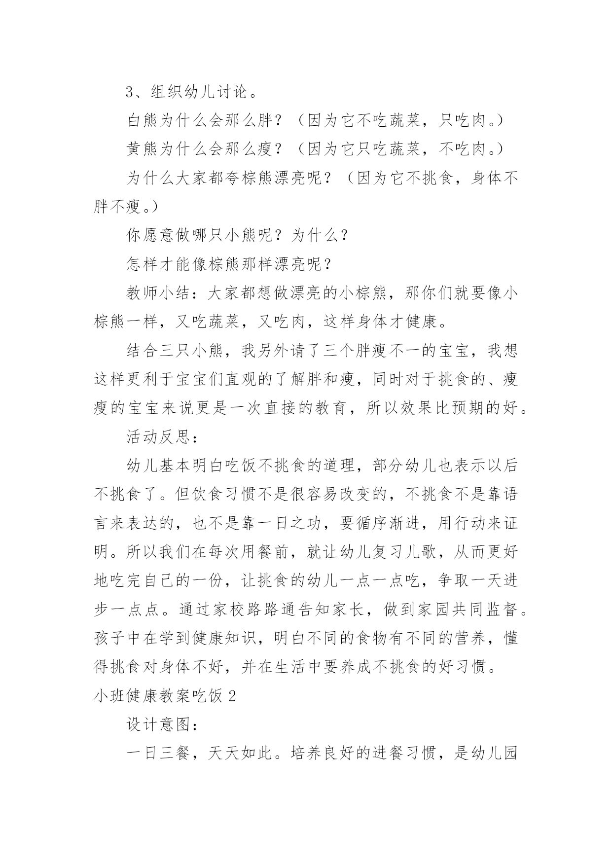 小班健康教案吃饭小班健康教案吃饭作为一名默默奉献的教育工作者,常常要根据教学需要编写教案,教案是教学蓝图,可以有效提高教学效率。教案应该怎么写呢?下面是小编为大家收集的小班健康教案吃饭,欢迎大家分享。小班健康教案吃饭1活动目标:1、知道人体需要各种不同的营养。2、通过故事,懂得只有又吃蔬菜,又吃荤菜,才有利于身体健康和生长发育。3、养成不挑食的好习惯。4、了解吃饭对身体健康的影响,能按时吃饭,不挑食。5、初步了解健康的小常识。活动准备:三只小熊的图片。活动过程:1、教师出示三只小熊图片,引起幼儿观察,提问:这三只小熊一样吗?什么地方不一样?(颜色、胖瘦不一样。)你知道他们为什么会有的'胖,有的瘦吗?2、教师操作图片讲述故事。3、组织幼儿讨论。白熊为什么会那么胖?(因为它不吃蔬菜,只吃肉。)黄熊为什么会那么瘦?(因为它只吃蔬菜,不吃肉。)为什么大家都夸棕熊漂亮呢?(因为它不挑食,身体不胖不瘦。)你愿意做哪只小熊呢?为什么?怎样才能像棕熊那样漂亮呢?教师小结:大家都想做漂亮的小棕熊,那你们就要像小棕熊一样,又吃蔬菜,又吃肉,这样身体才健康。结合三只小熊,我另外请了三个胖瘦不一的宝宝,我想这样更利于宝宝们直观的了解胖和瘦,同时对于挑食的、瘦瘦的宝宝来说更是一次直接的教育,所以效果比预期的好。活动反思:幼儿基本明白吃饭不挑食的道理,部分幼儿也表示以后不挑食了。但饮食习惯不是很容易改变的,不挑食不是靠语言来表达的,也不是靠一日之功,要循序渐进,用行动来证明。所以我们在每次用餐前,就让幼儿复习儿歌,从而更好地吃完自己的一份,让挑食的幼儿一点一点吃,争取一天进步一点点。通过家校路路通告知家长,做到家园共同监督。孩子中在学到健康知识,明白不同的食物有不同的营养,懂得挑食对身体不好,并在生活中要养成不挑食的好习惯。小班健康教案吃饭2设计意图:一日三餐,天天如此。培养良好的进餐习惯,是幼儿园小班生活教育中,最基本的内容之一。因为,现在的孩子在家大多数往往是饭来张口,家长包办代替。那么,进入幼儿园以后,集体的生活场所,需要他们增强一些生活的自理能力,逐步学会自己的事自己做。自己吃饭是最基本的生活自理能力,也是这一年龄的孩子力所能及的。注重幼儿独立进餐习惯的培养,不仅能使幼儿摆脱依赖的习惯,还将对幼儿形成良好的进餐习惯,获得一些生活能力的锻炼,促进他们身心健康的发展都是非常有利的。因此,我根据小班幼儿特点设计了本次活动。活动目标:1、得要自己吃饭,不要别人喂。2、学习一些独立进餐的基本方法:学用小勺,能把饭莱一勺一勺送进嘴里细嚼慢咽。3、培养幼儿乐观开朗的性格。4、让幼儿养成珍惜粮食的习惯。重点与难点:掌握一些独立进餐的基本方法,改变进餐依赖的习惯。活动准备:1、生活区角活动:舀小勺2、体育游戏:给小动物喂食3、饭厅环境布置:自己吃饭真能干、小镜子若干、小奖品若干活动过程:感知讨论——实践操作——强化巩固1、感知讨论(1)餐厅环境布置“自己吃饭真能干”。用环境隐性的教育手段,让幼儿潜移默化感知,吃饭要自己吃。(2)演示“学用小勺”。请几名幼儿演示各自用小勺的方法,然后让小朋友说说谁拿的方法对或不对。教师再示范讲解正确使用小勺的方法:左手扶碗,右手拿小勺,用拇指、食指和中指捏住勺柄,无名指和小指配合抵住,不宜捏得过低或过高。(3)照镜子“我们的牙齿真能干”建议可利用吃点心时,发给每位幼儿一面小镜子,先张开小嘴照一照,看见嘴巴里有牙齿和咽喉部等,再拿一块点心放进嘴里,看看原来的.点心怎么会变得越来越碎?最后是从哪里咽下去的?让幼儿直观感知一下,自己的牙齿真能干,吃东西时要咀嚼,一口一口咽下去,这样才能吸收营养长身体。2、实践操作(1)生活区角活动:在生活角里投放一些玻璃弹或各类豆粒等材料,让幼儿练习舀小勺,掌握正确用小勺的方法。(2)体育游戏“给小动物喂食”,让幼儿扮演饲养员,给小动物喂食(要用小勺舀起“食物”送进小动物嘴里)看哪组饲养员喂得又快又多。(3)幼儿餐点时,注意督促提醒幼儿要正确使用小勺,一勺一勺把食物舀进嘴里,要细嚼慢咽。对特殊幼儿,先要求会嚼会咽,逐步要求自己拿勺吃。3、强化巩固建议可不定期地在午餐时搞一些小奖励,对那些能独立吃完自己一份饭莱的幼儿送以小奖品,激发幼儿独立进餐的积极性,逐步形成良好的进餐习惯。4、活动延伸通过家园之窗,向家长进行幼儿独立进餐要求的宣传,要求幼儿在家在园一个样,父母不要包办代替,尽可能坚持培养幼儿独立进餐的习惯,随时保持家园联系,沟通了解幼儿进餐的情况。教学反思:通过这个活动,幼儿的吃饭情况有明显的好转。像文文小朋友,刚开始他总是不愿自己动手的,后来,我让吃得快的小朋友去帮助她,喂他吃饭,这样一来,他会觉得让别人喂很难为情。第二天,在就餐前他对我说:"老师,今天我不要别人喂,我会自己吃。"听到他说这话,我