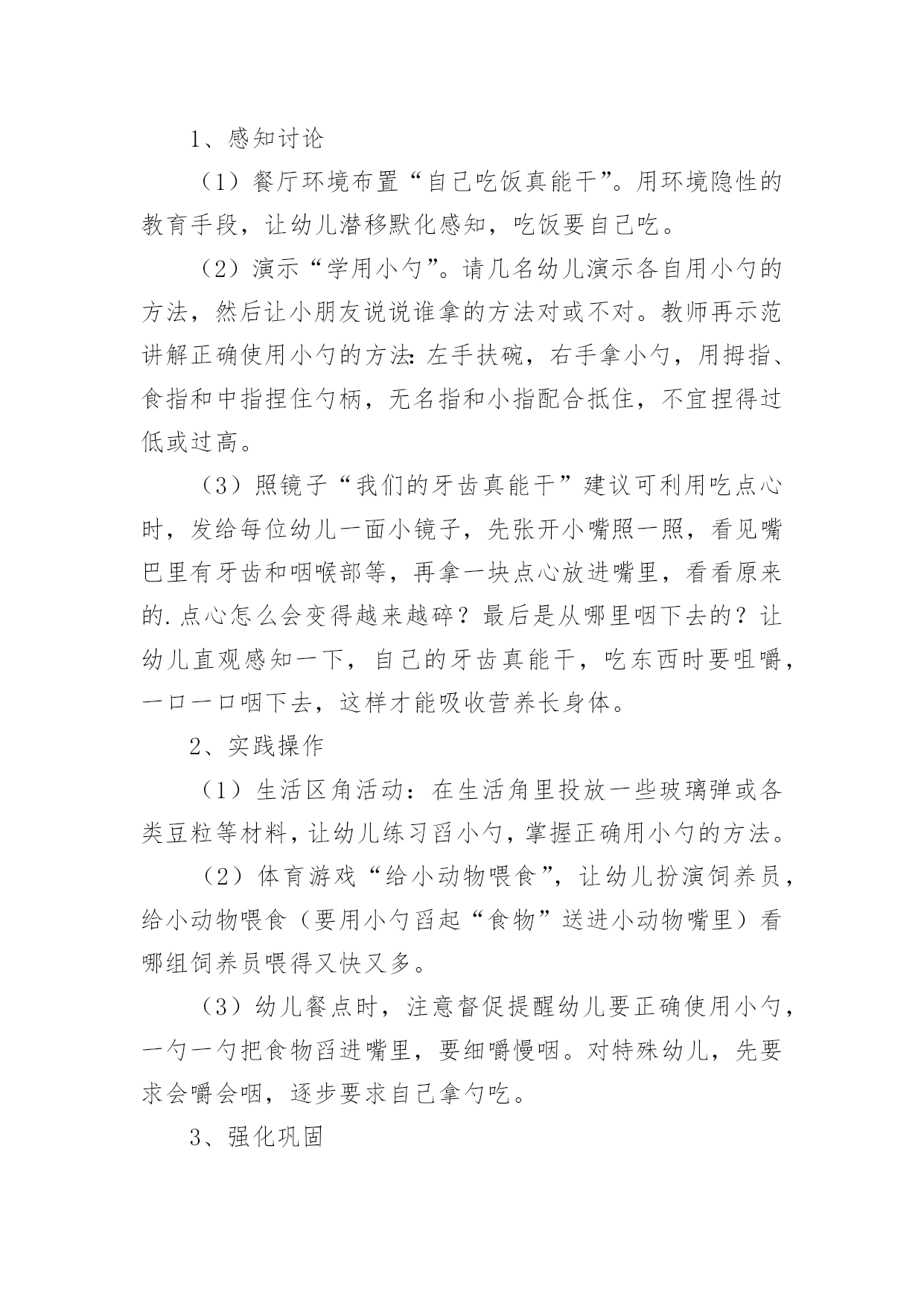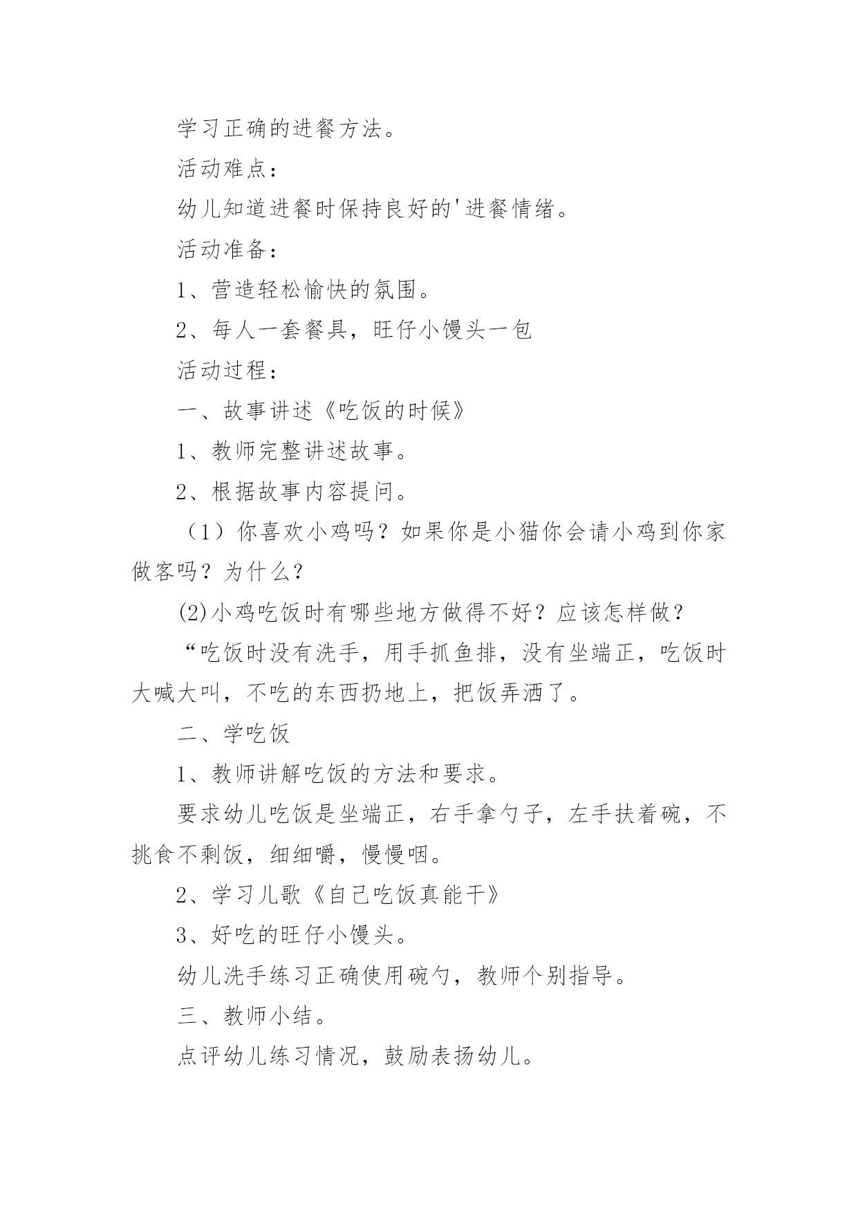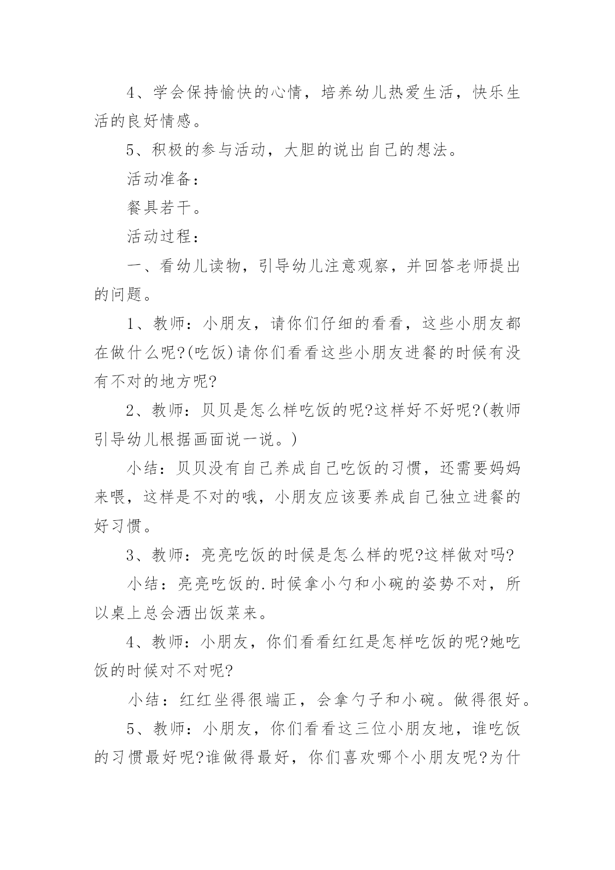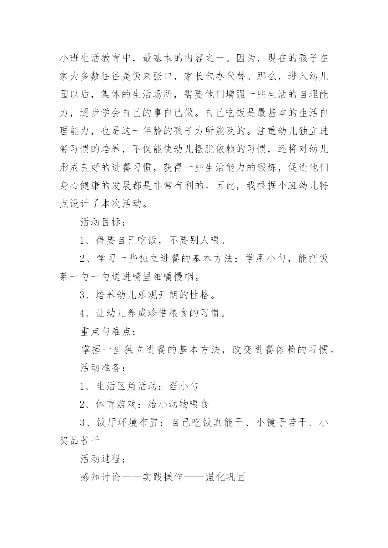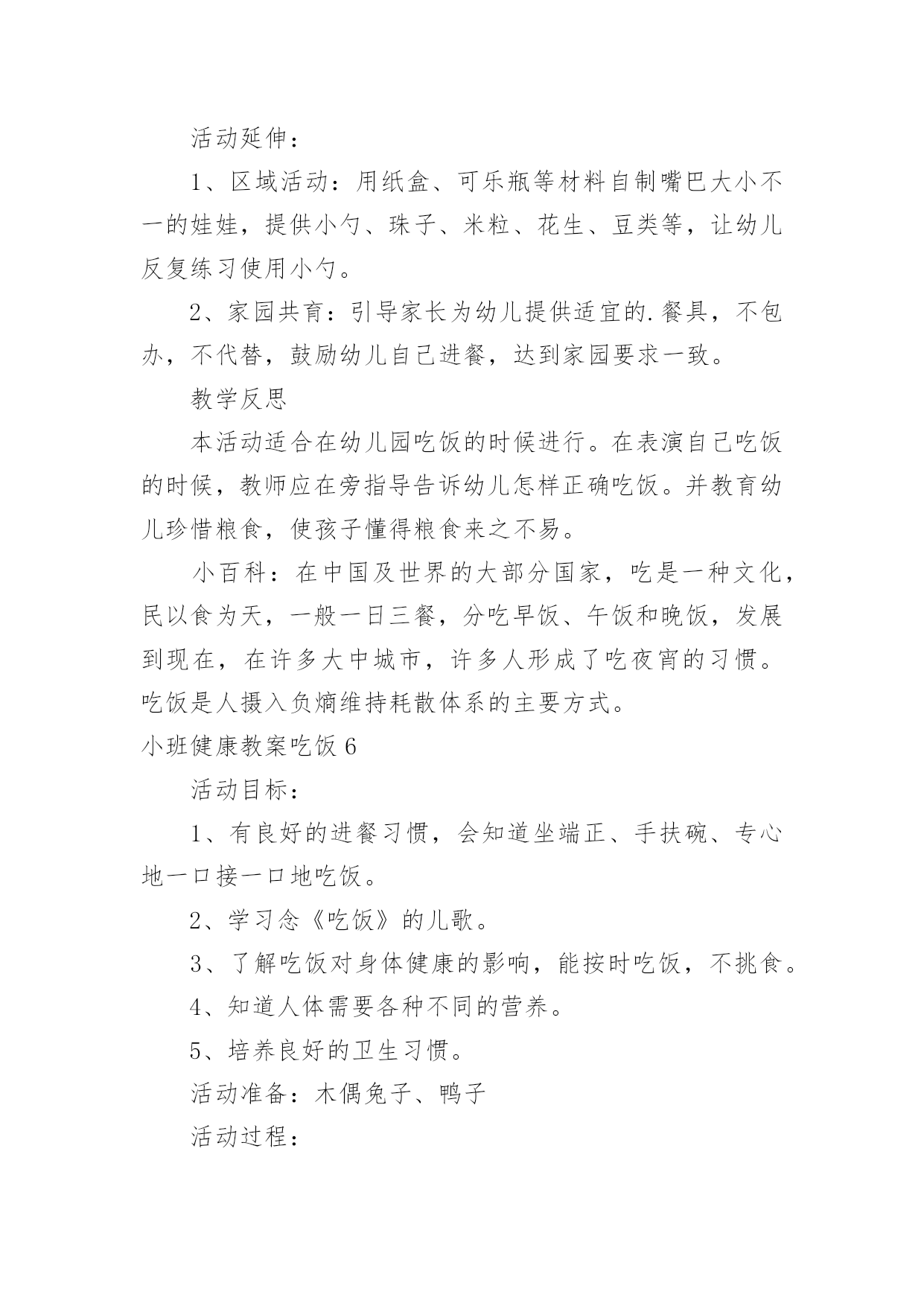 小班健康教案吃饭小班健康教案吃饭作为一名默默奉献的教育工作者,常常要根据教学需要编写教案,教案是教学蓝图,可以有效提高教学效率。教案应该怎么写呢?下面是小编为大家收集的小班健康教案吃饭,欢迎大家分享。小班健康教案吃饭1活动目标:1、知道人体需要各种不同的营养。2、通过故事,懂得只有又吃蔬菜,又吃荤菜,才有利于身体健康和生长发育。3、养成不挑食的好习惯。4、了解吃饭对身体健康的影响,能按时吃饭,不挑食。5、初步了解健康的小常识。活动准备:三只小熊的图片。活动过程:1、教师出示三只小熊图片,引起幼儿观察,提问:这三只小熊一样吗?什么地方不一样?(颜色、胖瘦不一样。)你知道他们为什么会有的'胖,有的瘦吗?2、教师操作图片讲述故事。3、组织幼儿讨论。白熊为什么会那么胖?(因为它不吃蔬菜,只吃肉。)黄熊为什么会那么瘦?(因为它只吃蔬菜,不吃肉。)为什么大家都夸棕熊漂亮呢?(因为它不挑食,身体不胖不瘦。)你愿意做哪只小熊呢?为什么?怎样才能像棕熊那样漂亮呢?教师小结:大家都想做漂亮的小棕熊,那你们就要像小棕熊一样,又吃蔬菜,又吃肉,这样身体才健康。结合三只小熊,我另外请了三个胖瘦不一的宝宝,我想这样更利于宝宝们直观的了解胖和瘦,同时对于挑食的、瘦瘦的宝宝来说更是一次直接的教育,所以效果比预期的好。活动反思:幼儿基本明白吃饭不挑食的道理,部分幼儿也表示以后不挑食了。但饮食习惯不是很容易改变的,不挑食不是靠语言来表达的,也不是靠一日之功,要循序渐进,用行动来证明。所以我们在每次用餐前,就让幼儿复习儿歌,从而更好地吃完自己的一份,让挑食的幼儿一点一点吃,争取一天进步一点点。通过家校路路通告知家长,做到家园共同监督。孩子中在学到健康知识,明白不同的食物有不同的营养,懂得挑食对身体不好,并在生活中要养成不挑食的好习惯。小班健康教案吃饭2设计意图:一日三餐,天天如此。培养良好的进餐习惯,是幼儿园小班生活教育中,最基本的内容之一。因为,现在的孩子在家大多数往往是饭来张口,家长包办代替。那么,进入幼儿园以后,集体的生活场所,需要他们增强一些生活的自理能力,逐步学会自己的事自己做。自己吃饭是最基本的生活自理能力,也是这一年龄的孩子力所能及的。注重幼儿独立进餐习惯的培养,不仅能使幼儿摆脱依赖的习惯,还将对幼儿形成良好的进餐习惯,获得一些生活能力的锻炼,促进他们身心健康的发展都是非常有利的。因此,我根据小班幼儿特点设计了本次活动。活动目标:1、得要自己吃饭,不要别人喂。2、学习一些独立进餐的基本方法:学用小勺,能把饭莱一勺一勺送进嘴里细嚼慢咽。3、培养幼儿乐观开朗的性格。4、让幼儿养成珍惜粮食的习惯。重点与难点:掌握一些独立进餐的基本方法,改变进餐依赖的习惯。活动准备:1、生活区角活动:舀小勺2、体育游戏:给小动物喂食3、饭厅环境布置:自己吃饭真能干、小镜子若干、小奖品若干活动过程:感知讨论——实践操作——强化巩固1、感知讨论(1)餐厅环境布置“自己吃饭真能干”。用环境隐性的教育手段,让幼儿潜移默化感知,吃饭要自己吃。(2)演示“学用小勺”。请几名幼儿演示各自用小勺的方法,然后让小朋友说说谁拿的方法对或不对。教师再示范讲解正确使用小勺的方法:左手扶碗,右手拿小勺,用拇指、食指和中指捏住勺柄,无名指和小指配合抵住,不宜捏得过低或过高。(3)照镜子“我们的牙齿真能干”建议可利用吃点心时,发给每位幼儿一面小镜子,先张开小嘴照一照,看见嘴巴里有牙齿和咽喉部等,再拿一块点心放进嘴里,看看原来的.点心怎么会变得越来越碎?最后是从哪里咽下去的?让幼儿直观感知一下,自己的牙齿真能干,吃东西时要咀嚼,一口一口咽下去,这样才能吸收营养长身体。2、实践操作(1)生活区角活动:在生活角里投放一些玻璃弹或各类豆粒等材料,让幼儿练习舀小勺,掌握正确用小勺的方法。(2)体育游戏“给小动物喂食”,让幼儿扮演饲养员,给小动物喂食(要用小勺舀起“食物”送进小动物嘴里)看哪组饲养员喂得又快又多。(3)幼儿餐点时,注意督促提醒幼儿要正确使用小勺,一勺一勺把食物舀进嘴里,要细嚼慢咽。对特殊幼儿,先要求会嚼会咽,逐步要求自己拿勺吃。3、强化巩固建议可不定期地在午餐时搞一些小奖励,对那些能独立吃完自己一份饭莱的幼儿送以小奖品,激发幼儿独立进餐的积极性,逐步形成良好的进餐习惯。4、活动延伸通过家园之窗,向家长进行幼儿独立进餐要求的宣传,要求幼儿在家在园一个样,父母不要包办代替,尽可能坚持培养幼儿独立进餐的习惯,随时保持家园联系,沟通了解幼儿进餐的情况。教学反思:通过这个活动,幼儿的吃饭情况有明显的好转。像文文小朋友,刚开始他总是不愿自己动手的,后来,我让吃得快的小朋友去帮助她,喂他吃饭,这样一来,他会觉得让别人喂很难为情。第二天,在就餐前他对我说:"老师,今天我不要别人喂,我会自己吃。"听到他说这话,我