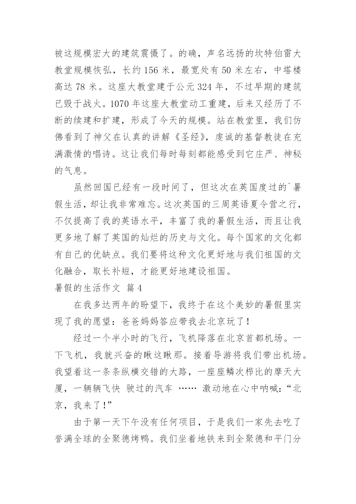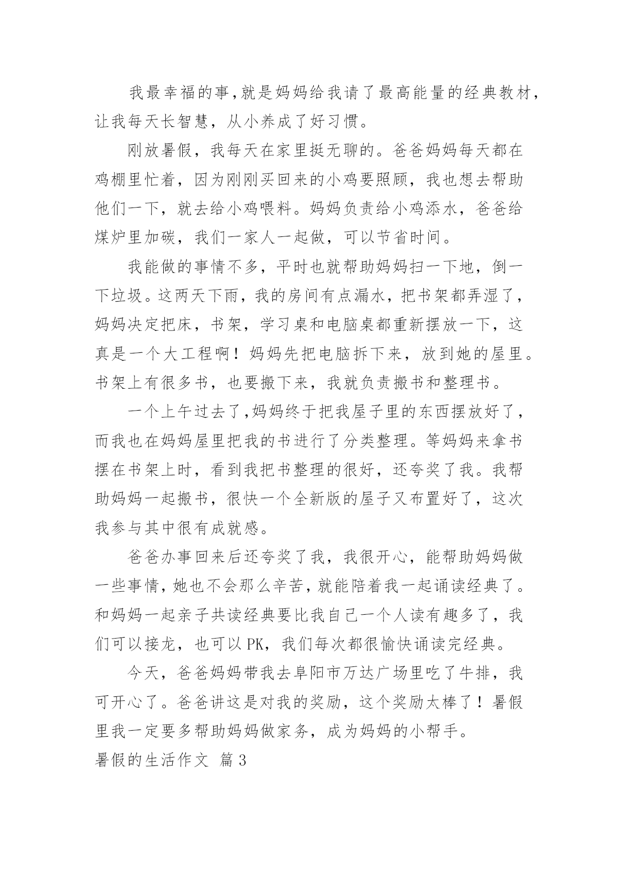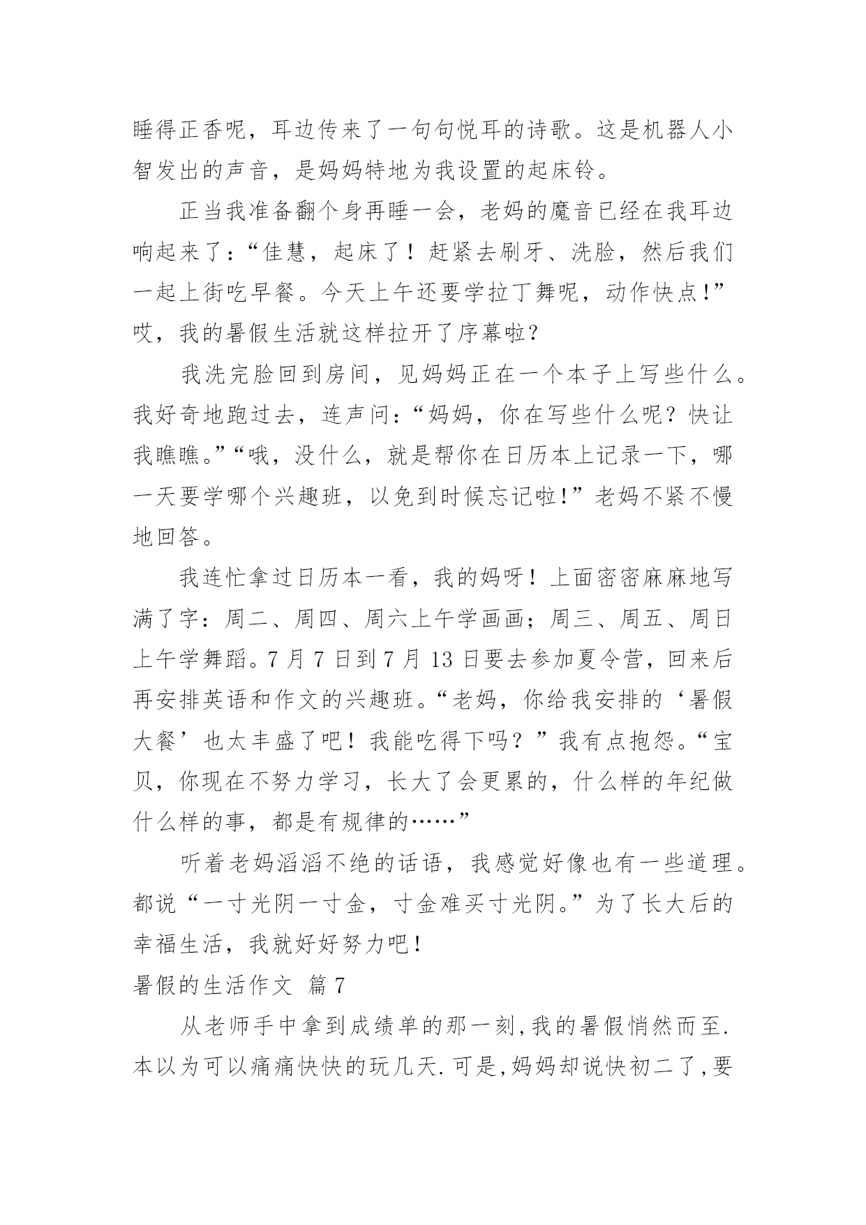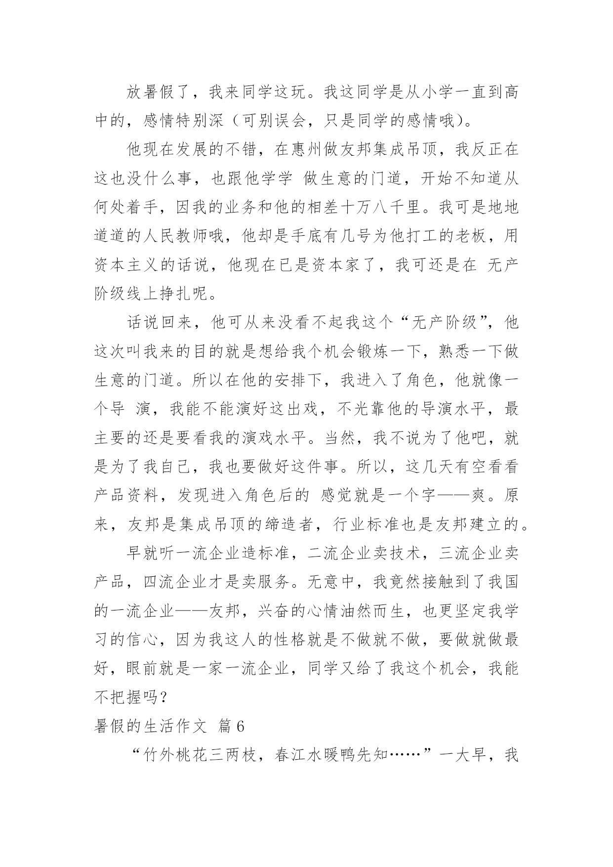 暑假的生活作文暑假的生活作文10篇在日常学习、工作抑或是生活中,大家都接触过作文吧,作文可分为小学作文、中学作文、大学作文(论文)。还是对作文一筹莫展吗?下面是小编收集整理的暑假的生活作文10篇,希望对大家有所帮助。暑假的生活作文篇1暑假里,终于可以甩掉那学习重重的包袱,回到“一觉睡到自然醒,电视看到眼抽筋”的时代。但是,一段时间后,我就尝到了暑假生活的酸甜苦辣。——题记快乐篇早晨,不用早早地起床,不用听那数不清的唠叨声,不需要背着学生的书包去学校……写完作业,晚上,我就当着“机械母老虎”的面,大摇大摆的走向电视机。打开电视机,看我最喜欢看的《我的父亲是板凳》。让我没想到的是,我老妈居然没有我吼叫了,还微笑着走过来,跟我一起欣赏和讨论电视剧情,这种放松的感觉,真好!痛苦篇还没放暑假,我的妈妈就自作主张,给我报了话多的补习班,不仅有ABC英语,还有游泳。整个暑假里的周一至周五下午,我都得去ABC学英语了,学完了英语,还得赶到游泳馆学游泳池,只有上午才有时间做暑假作业。晚饭后,疲惫不堪的我还得背那枯燥无味的古诗,真是苦啊!思念篇不知怎么的,暑假才刚过几个星期,我就特别想念学校里的生活。因为在家里的生活千篇一律,每天就听着妈妈的唠叨,所以就特别想上学。我好想念学校里慈祥的老师,想念和同学课间打打闹闹的情形。我的暑假生活真是五彩缤纷,五味俱全啊!暑假的生活作文篇2大家好,我是来自安徽阜阳的陈铭涵,今年12岁。我从20xx10月份开始系统诵读育心经典,至今已经读了20余部经典书籍。其中,《易经》《老子》《增广贤文》和《三字经》这几本,我在20xx年的时候,到深圳报考参加过读经考核。放假啦,我和妈妈一起做了读经计划。我们边复习诵读过的经典,边读新课。妈妈说她要和我一起亲子共读,我们把复习的经典,以接龙的方式读出来。我意外的发现,几年前背诵过的经典,我竟然还能背诵一部分。我们读经的孩子,看似比没有读经的孩子付出了一些时间,可是坚持下来,我们就会收获很多很多。比如经常参加平台的分享,定期参加学经班活动,我都能大胆自信地当领读小老师,并且读得都很棒。通过诵读经典,我现在的语文成绩也越来越好了。我最幸福的事,就是妈妈给我请了最高能量的经典教材,让我每天长智慧,从小养成了好习惯。刚放暑假,我每天在家里挺无聊的。爸爸妈妈每天都在鸡棚里忙着,因为刚刚买回来的小鸡要照顾,我也想去帮助他们一下,就去给小鸡喂料。妈妈负责给小鸡添水,爸爸给煤炉里加碳,我们一家人一起做,可以节省时间。我能做的事情不多,平时也就帮助妈妈扫一下地,倒一下垃圾。这两天下雨,我的房间有点漏水,把书架都弄湿了,妈妈决定把床,书架,学习桌和电脑桌都重新摆放一下,这真是一个大工程啊!妈妈先把电脑拆下来,放到她的屋里。书架上有很多书,也要搬下来,我就负责搬书和整理书。一个上午过去了,妈妈终于把我屋子里的东西摆放好了,而我也在妈妈屋里把我的书进行了分类整理。等妈妈来拿书摆在书架上时,看到我把书整理的很好,还夸奖了我。我帮助妈妈一起搬书,很快一个全新版的屋子又布置好了,这次我参与其中很有成就感。爸爸办事回来后还夸奖了我,我很开心,能帮助妈妈做一些事情,她也不会那么辛苦,就能陪着我一起诵读经典了。和妈妈一起亲子共读经典要比我自己一个人读有趣多了,我们可以接龙,也可以PK,我们每次都很愉快诵读完经典。今天,爸爸妈妈带我去阜阳市万达广场里吃了牛排,我可开心了。爸爸讲这是对我的奖励,这个奖励太棒了!暑假里我一定要多帮助妈妈做家务,成为妈妈的小帮手。暑假的生活作文篇3七月中旬,经过一系列的准备后,我参加了英国剑桥修学夏令营,开始了我为期21天的异域修学暑假生活。在英国的日子里,我们除了紧张的英语语言课学习以外,最开心的就是去游览参观了。在英国,第一个周末,我们首先游览了伦敦。伦敦是英国的首都、欧洲最大的都会及世界四大世界级城市之一。从1801年到20世纪初,作为世界性帝国——大英帝国的首都,伦敦因其在政治、经济、文化、科技等领域上的卓越成就,而成为全世界最大的都市。同时,伦敦也是一个非常多元化的大都市,其居民来自世界各地,具有多元的种族、宗教和文化,城市中使用的语言超过300种。而且,伦敦还是世界闻名的旅游胜地,拥有数量众多的名胜景点与博物馆等。站在著名的“伦敦眼”包厢里望下看,简洁的现代大楼与古老的建筑融为一体,构成了一幅瑰丽的风景画。在导游的带领下,我们来到伦敦的中心城区。转过一个街区,突然,一个高大的哥特式尖塔映入我们的眼帘。“哇,大本钟!”旁边的一个女孩尖叫起来。“对,这就是世界闻名的伦敦大本钟,”导游介绍道,“大本钟是由埃德蒙德·格林斯罗普勋爵设计,并由爱德华·登特及他的儿子弗雷德里克建造的。钟重13.5吨,钟盘直径7米,时针和分针长度分别为2.75米和4.27米,钟摆重305公斤。大钟造于1