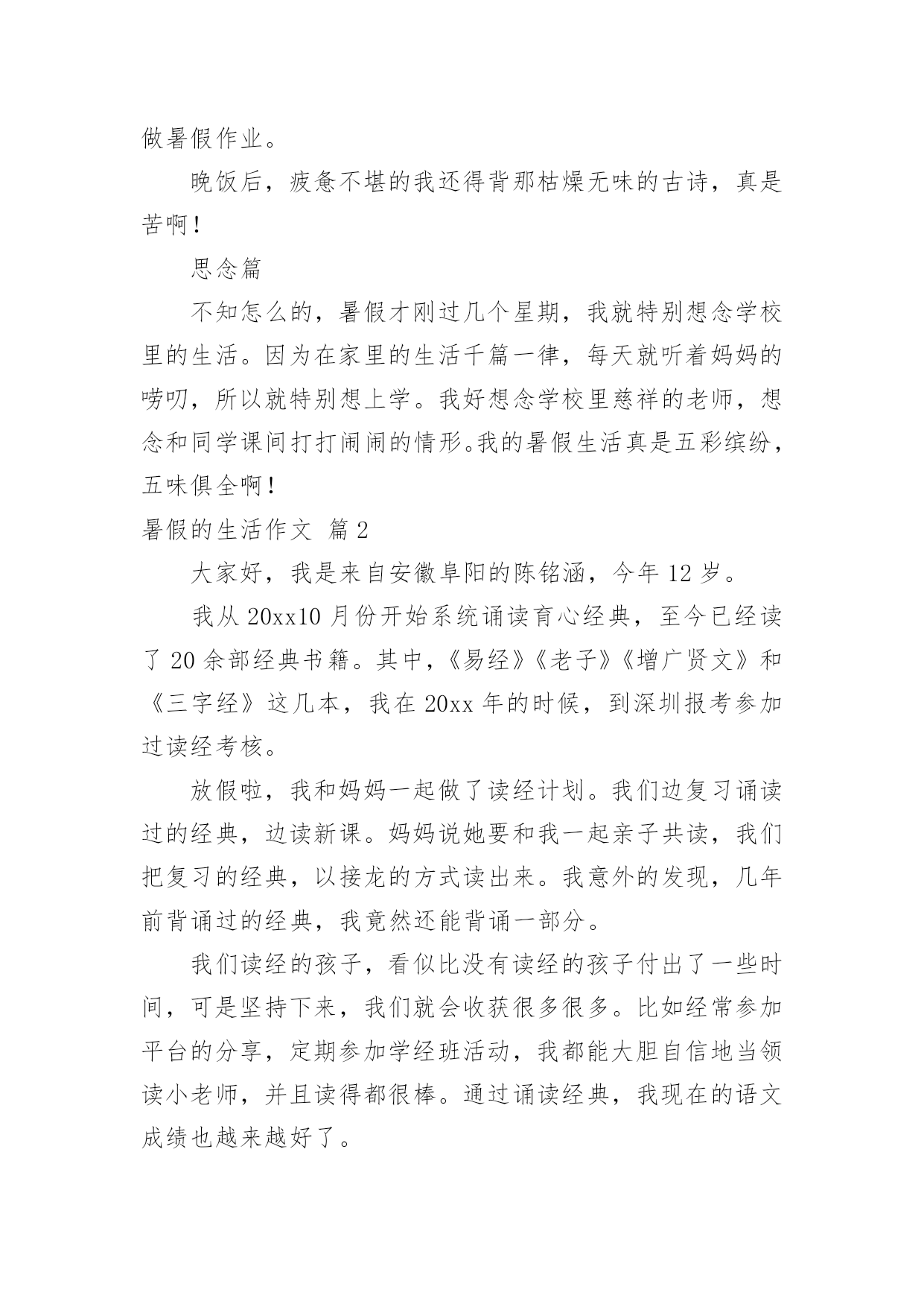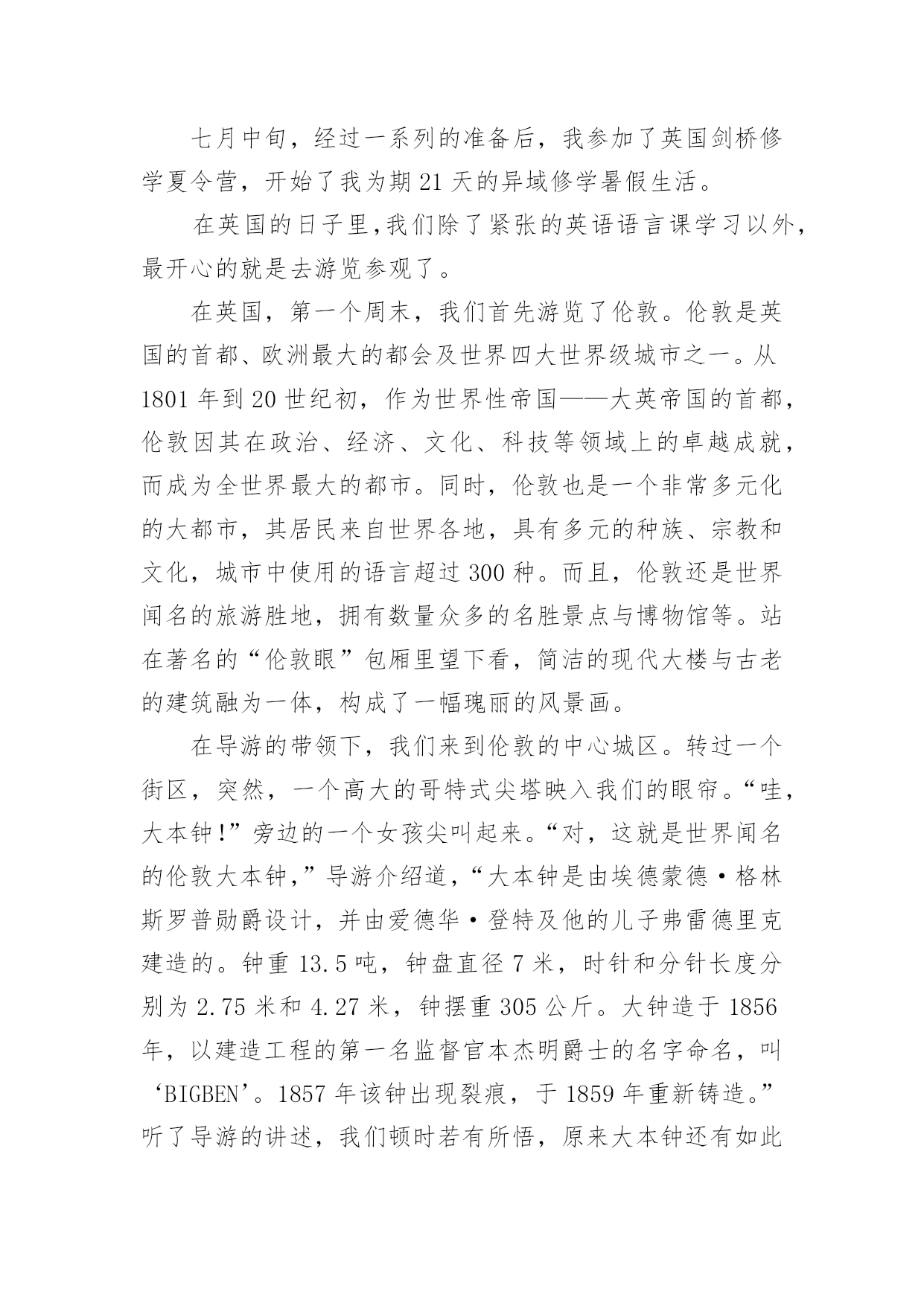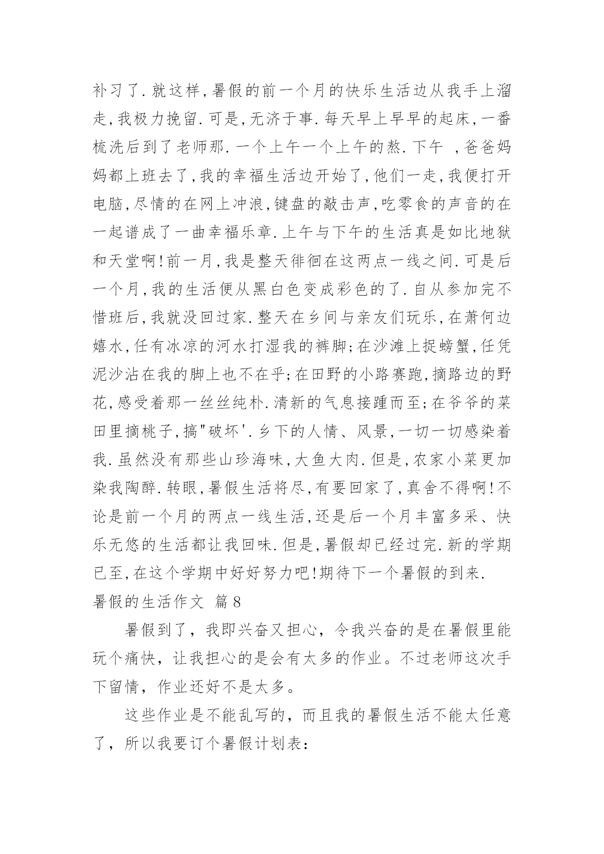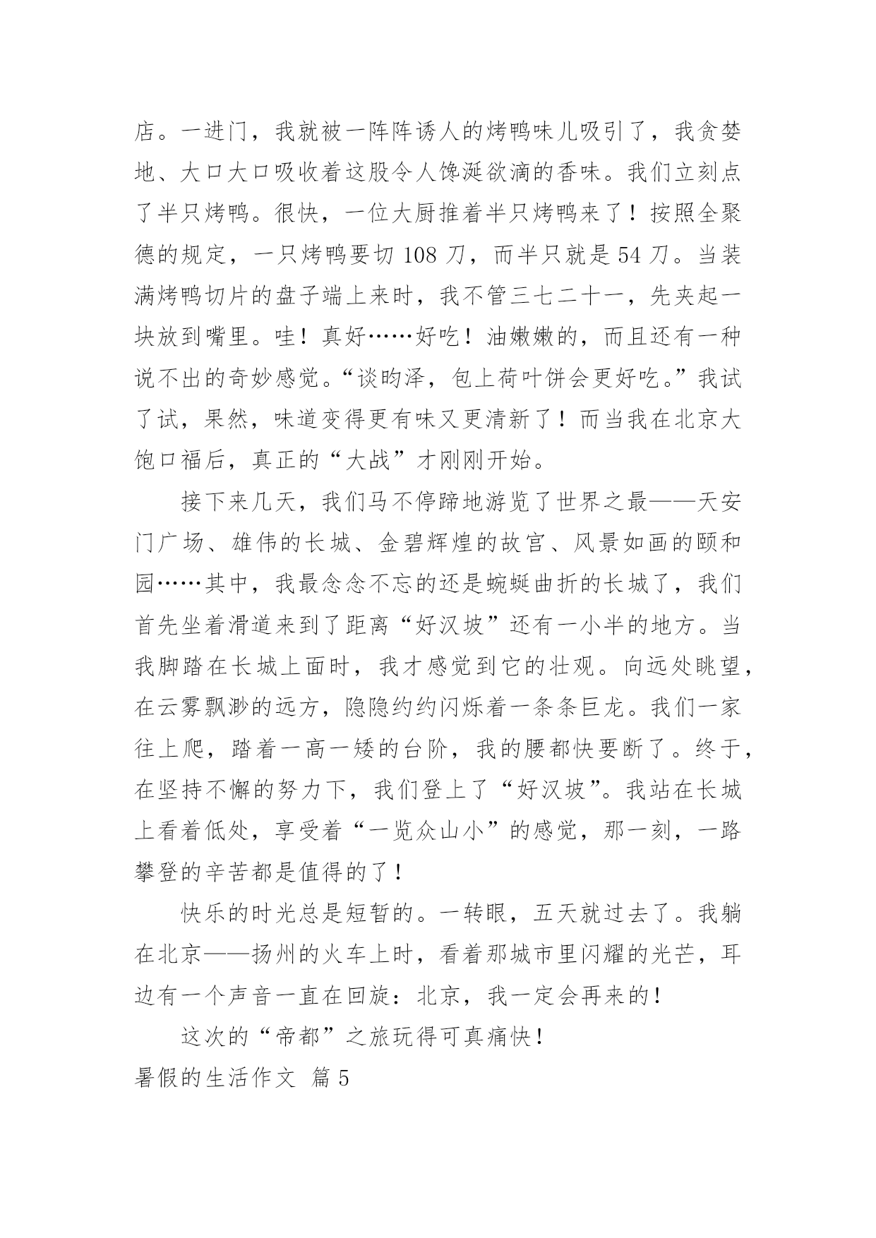 暑假的生活作文暑假的生活作文10篇在日常学习、工作抑或是生活中,大家都接触过作文吧,作文可分为小学作文、中学作文、大学作文(论文)。还是对作文一筹莫展吗?下面是小编收集整理的暑假的生活作文10篇,希望对大家有所帮助。暑假的生活作文篇1暑假里,终于可以甩掉那学习重重的包袱,回到“一觉睡到自然醒,电视看到眼抽筋”的时代。但是,一段时间后,我就尝到了暑假生活的酸甜苦辣。——题记快乐篇早晨,不用早早地起床,不用听那数不清的唠叨声,不需要背着学生的书包去学校……写完作业,晚上,我就当着“机械母老虎”的面,大摇大摆的走向电视机。打开电视机,看我最喜欢看的《我的父亲是板凳》。让我没想到的是,我老妈居然没有我吼叫了,还微笑着走过来,跟我一起欣赏和讨论电视剧情,这种放松的感觉,真好!痛苦篇还没放暑假,我的妈妈就自作主张,给我报了话多的补习班,不仅有ABC英语,还有游泳。整个暑假里的周一至周五下午,我都得去ABC学英语了,学完了英语,还得赶到游泳馆学游泳池,只有上午才有时间做暑假作业。晚饭后,疲惫不堪的我还得背那枯燥无味的古诗,真是苦啊!思念篇不知怎么的,暑假才刚过几个星期,我就特别想念学校里的生活。因为在家里的生活千篇一律,每天就听着妈妈的唠叨,所以就特别想上学。我好想念学校里慈祥的老师,想念和同学课间打打闹闹的情形。我的暑假生活真是五彩缤纷,五味俱全啊!暑假的生活作文篇2大家好,我是来自安徽阜阳的陈铭涵,今年12岁。我从20xx10月份开始系统诵读育心经典,至今已经读了20余部经典书籍。其中,《易经》《老子》《增广贤文》和《三字经》这几本,我在20xx年的时候,到深圳报考参加过读经考核。放假啦,我和妈妈一起做了读经计划。我们边复习诵读过的经典,边读新课。妈妈说她要和我一起亲子共读,我们把复习的经典,以接龙的方式读出来。我意外的发现,几年前背诵过的经典,我竟然还能背诵一部分。我们读经的孩子,看似比没有读经的孩子付出了一些时间,可是坚持下来,我们就会收获很多很多。比如经常参加平台的分享,定期参加学经班活动,我都能大胆自信地当领读小老师,并且读得都很棒。通过诵读经典,我现在的语文成绩也越来越好了。我最幸福的事,就是妈妈给我请了最高能量的经典教材,让我每天长智慧,从小养成了好习惯。刚放暑假,我每天在家里挺无聊的。爸爸妈妈每天都在鸡棚里忙着,因为刚刚买回来的小鸡要照顾,我也想去帮助他们一下,就去给小鸡喂料。妈妈负责给小鸡添水,爸爸给煤炉里加碳,我们一家人一起做,可以节省时间。我能做的事情不多,平时也就帮助妈妈扫一下地,倒一下垃圾。这两天下雨,我的房间有点漏水,把书架都弄湿了,妈妈决定把床,书架,学习桌和电脑桌都重新摆放一下,这真是一个大工程啊!妈妈先把电脑拆下来,放到她的屋里。书架上有很多书,也要搬下来,我就负责搬书和整理书。一个上午过去了,妈妈终于把我屋子里的东西摆放好了,而我也在妈妈屋里把我的书进行了分类整理。等妈妈来拿书摆在书架上时,看到我把书整理的很好,还夸奖了我。我帮助妈妈一起搬书,很快一个全新版的屋子又布置好了,这次我参与其中很有成就感。爸爸办事回来后还夸奖了我,我很开心,能帮助妈妈做一些事情,她也不会那么辛苦,就能陪着我一起诵读经典了。和妈妈一起亲子共读经典要比我自己一个人读有趣多了,我们可以接龙,也可以PK,我们每次都很愉快诵读完经典。今天,爸爸妈妈带我去阜阳市万达广场里吃了牛排,我可开心了。爸爸讲这是对我的奖励,这个奖励太棒了!暑假里我一定要多帮助妈妈做家务,成为妈妈的小帮手。暑假的生活作文篇3七月中旬,经过一系列的准备后,我参加了英国剑桥修学夏令营,开始了我为期21天的异域修学暑假生活。在英国的日子里,我们除了紧张的英语语言课学习以外,最开心的就是去游览参观了。在英国,第一个周末,我们首先游览了伦敦。伦敦是英国的首都、欧洲最大的都会及世界四大世界级城市之一。从1801年到20世纪初,作为世界性帝国——大英帝国的首都,伦敦因其在政治、经济、文化、科技等领域上的卓越成就,而成为全世界最大的都市。同时,伦敦也是一个非常多元化的大都市,其居民来自世界各地,具有多元的种族、宗教和文化,城市中使用的语言超过300种。而且,伦敦还是世界闻名的旅游胜地,拥有数量众多的名胜景点与博物馆等。站在著名的“伦敦眼”包厢里望下看,简洁的现代大楼与古老的建筑融为一体,构成了一幅瑰丽的风景画。在导游的带领下,我们来到伦敦的中心城区。转过一个街区,突然,一个高大的哥特式尖塔映入我们的眼帘。“哇,大本钟!”旁边的一个女孩尖叫起来。“对,这就是世界闻名的伦敦大本钟,”导游介绍道,“大本钟是由埃德蒙德·格林斯罗普勋爵设计,并由爱德华·登特及他的儿子弗雷德里克建造的。钟重13.5吨,钟盘直径7米,时针和分针长度分别为2.75米和4.27米,钟摆重305公斤。大钟造于1
