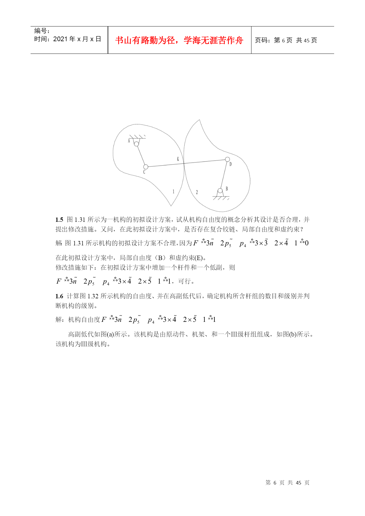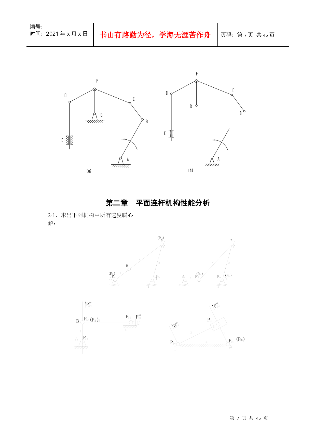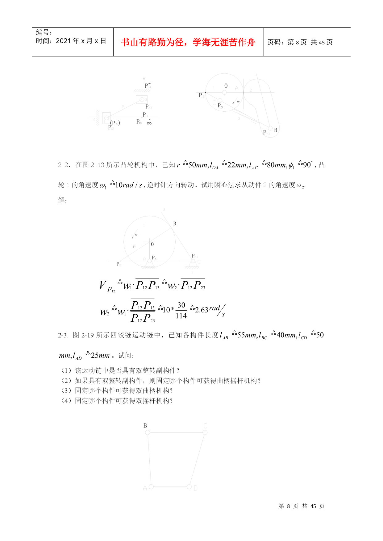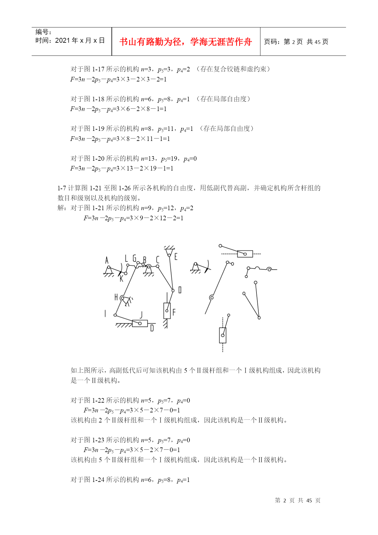 编号:时间:2021年x月x日书山有路勤为径,学海无涯苦作舟页码:第PAGE45页共NUMPAGES45页第PAGE\*MERGEFORMAT45页共NUMPAGES\*MERGEFORMAT45页第一章机构的组成和结构分析1-1~1-4绘出图1-7~图1-10所示机构的机构运动简图。解:图1-7~图1-10所示机构的机构运动简图如下:1-5试判断图1-11、图1-12所示运动链能否成为机构,并说明理由。若不能成为机构请提出修改办法。解:对于图1-11所示运动链n=5,p5=7,p4=1F=3n-2p5-p4=3×5-2×7-1=0∵F=0∴不能成为机构对于图1-12所示运动链n=4,p5=6,p4=0F=3n-2p5-p4=3×4-2×6-0=0∵F=0∴不能成为机构1-6计算图1.13~1.20所示各机构的自由度。并指出其中是否含有复合铰链、局部自由度或虚约束,说明计算自由度时应做何处理。解:对于图1-13所示的机构n=5,p5=7,p4=0F=3n-2p5-p4=3×5-2×7-0=1对于图1-14所示的机构n=7,p5=10,p4=0(存在一个复合铰链)F=3n-2p5-p4=3×7-2×10-0=1对于图1-15所示的机构n=4,p5=5,p4=1F=3n-2p5-p4=3×4-2×5-1=1对于图1-16所示的机构n=4,p5=4,p4=2(存在局部自由度和虚约束)F=3n-2p5-p4=3×4-2×4-2=2对于图1-17所示的机构n=3,p5=3,p4=2(存在复合铰链和虚约束)F=3n-2p5-p4=3×3-2×3-2=1对于图1-18所示的机构n=6,p5=8,p4=1(存在局部自由度)F=3n-2p5-p4=3×6-2×8-1=1对于图1-19所示的机构n=8,p5=11,p4=1(存在局部自由度)F=3n-2p5-p4=3×8-2×11-1=1对于图1-20所示的机构n=13,p5=19,p4=0F=3n-2p5-p4=3×13-2×19-1=11-7计算图1-21至图1-26所示各机构的自由度,用低副代替高副,并确定机构所含杆组的数目和级别以及机构的级别。解:对于图1-21所示的机构n=9,p5=12,p4=2F=3n-2p5-p4=3×9-2×12-2=1如上图所示,高副低代后可知该机构由5个Ⅱ级杆组和一个Ⅰ级机构组成,因此该机构是一个Ⅱ级机构。对于图1-22所示的机构n=5,p5=7,p4=0F=3n-2p5-p4=3×5-2×7-0=1该机构由2个Ⅱ级杆组和一个Ⅰ级机构组成,因此该机构是一个Ⅱ级机构。对于图1-23所示的机构n=5,p5=7,p4=0F=3n-2p5-p4=3×5-2×7-0=1该机构由5个Ⅱ级杆组和一个Ⅰ级机构组成,因此该机构是一个Ⅱ级机构。对于图1-24所示的机构n=6,p5=8,p4=1F=3n-2p5-p4=3×6-2×8-1=1如上图所示,高副低代后可知该机构由1个Ⅲ级杆组、1个Ⅱ级杆组和一个Ⅰ级机构组成,因此该机构是一个Ⅲ级机构。对于图1-25所示的机构n=3,p5=3,p4=2F=3n-2p5-p4=3×3-2×3-2=1如上图所示,高副低代后可知该机构由2个Ⅱ级杆组和一个Ⅰ级机构组成,因此该机构是一个Ⅱ级机构。对于图1-26所示的机构n=5,p5=7,p4=0F=3n-2p5-p4=3×5-2×7-0=1该机构由1个Ⅲ级杆组和一个Ⅰ级机构组成,因此该机构是一个Ⅲ级机构。综合测试题1.1填空题及简答题1.平面机构中若引入一个高副将带入1个约束,而引入一个低副将带入2个约束。2.高副低代必须满足的条件是代替前后机构的自由度不变,代替前后机构的瞬时速度和瞬时加速度不变。3.何谓“运动链”?具备什么条件,运动链才具有运动的可能性,具备什么条件后才具有运动的确定性?具备什么条件,运动链才能成为机构。答:两个或两个以上的构件通过运动副联接而成的相对可动的系统称为运动链。当运动链的自由度大于零时,运动链具有运动的可能性;运动链成为机构的条件是:取运动链中一个构件相对固定作为机架,运动链相对于机架的自由度必须大于零,且原动件的数目等于运动链的自由度数。4.何谓“机构运动简图”?绘制的步骤如何?答:根据机构的运动尺寸,按一定的比例尺定出各运动副的位置,再用国标规定的简单符号和线条代表运动副和构件,并将机构的运动情况表示出来,这种简单的图形称为机构运动简图。机构运动简图的绘制方法和步骤:1)分析机械的动作原理、组成情况和运动情况,确定其组成的各构件何为原动件、机架、执行部分和传动部分。2)沿着运
