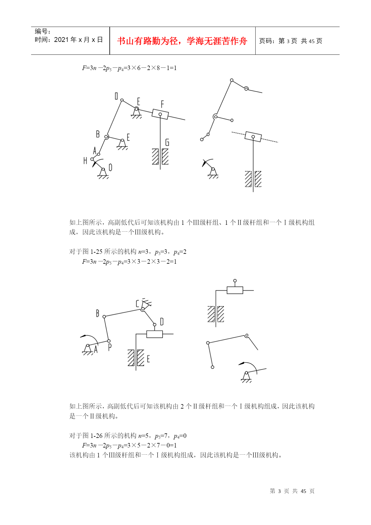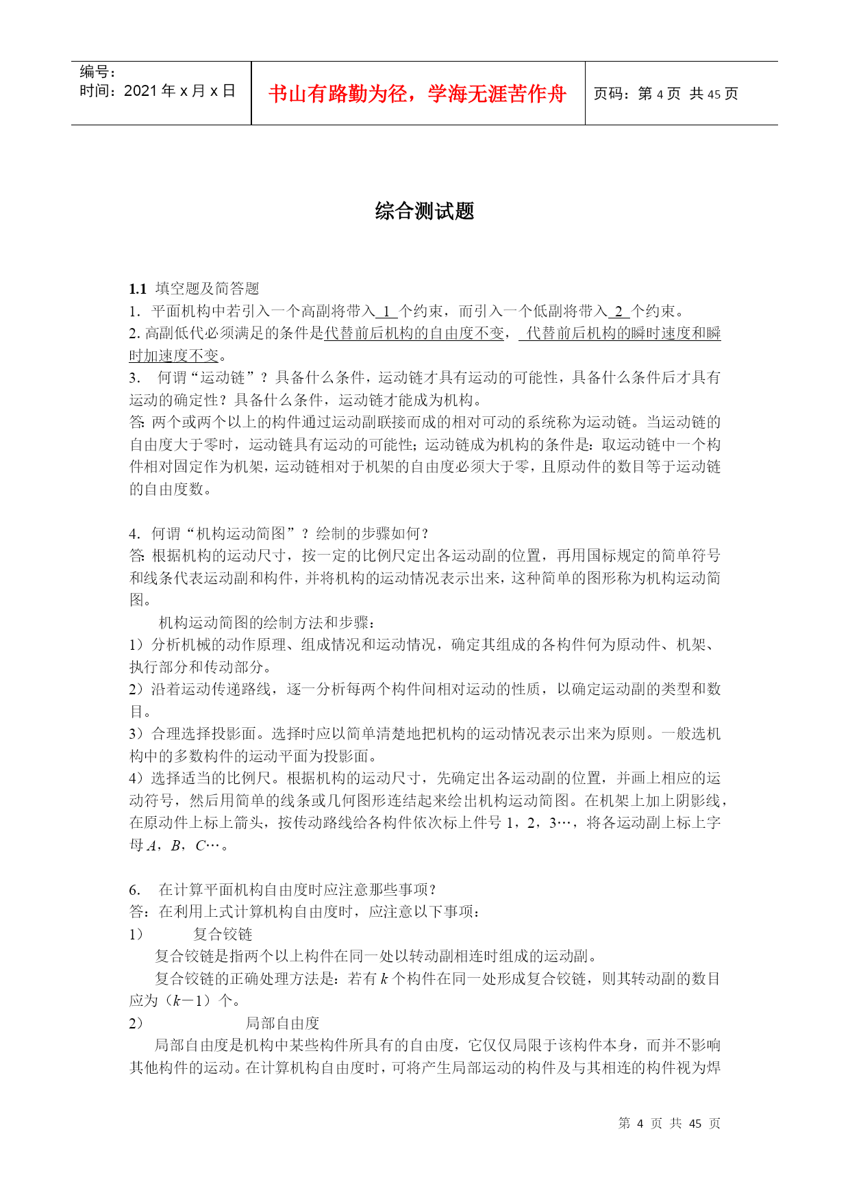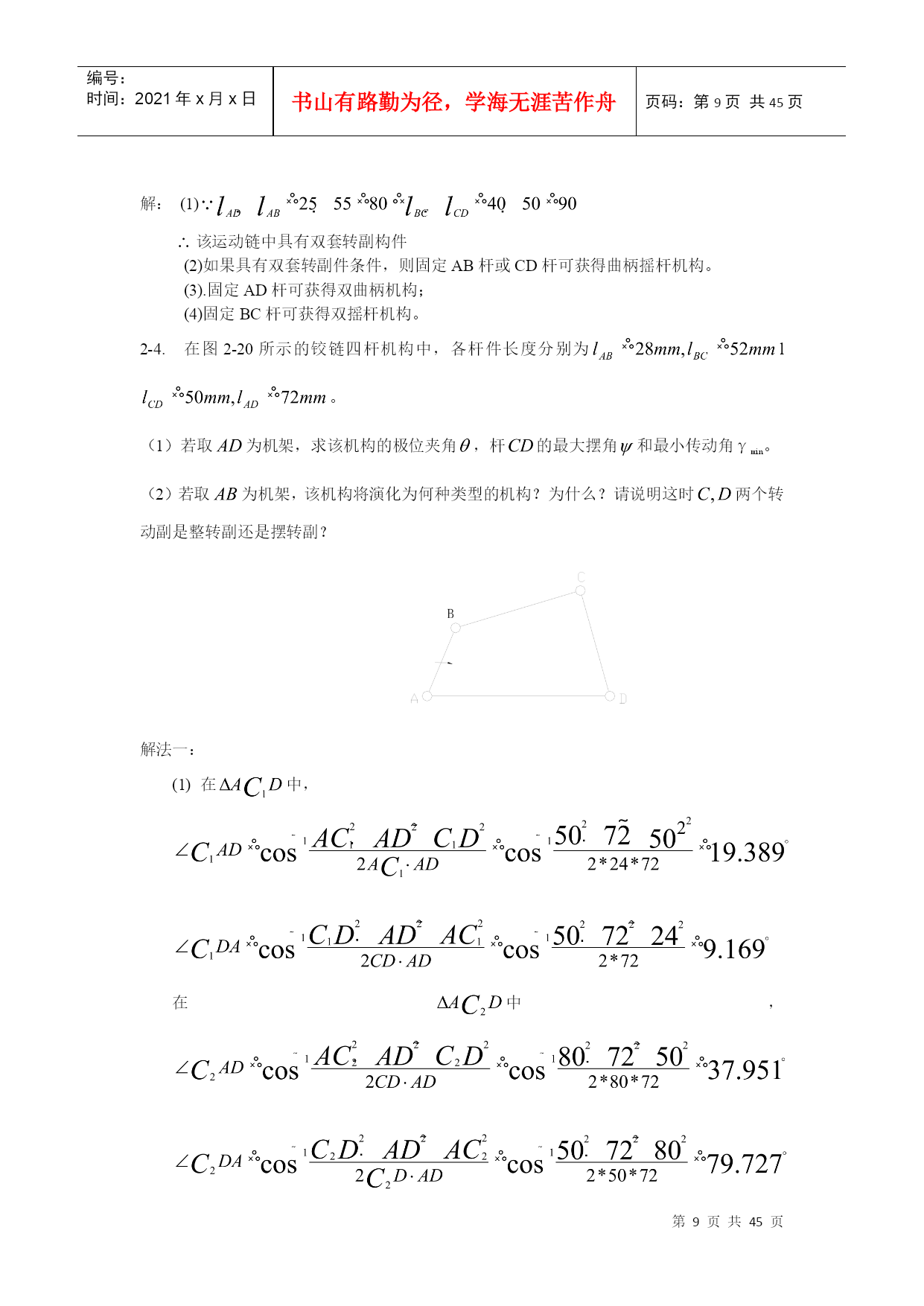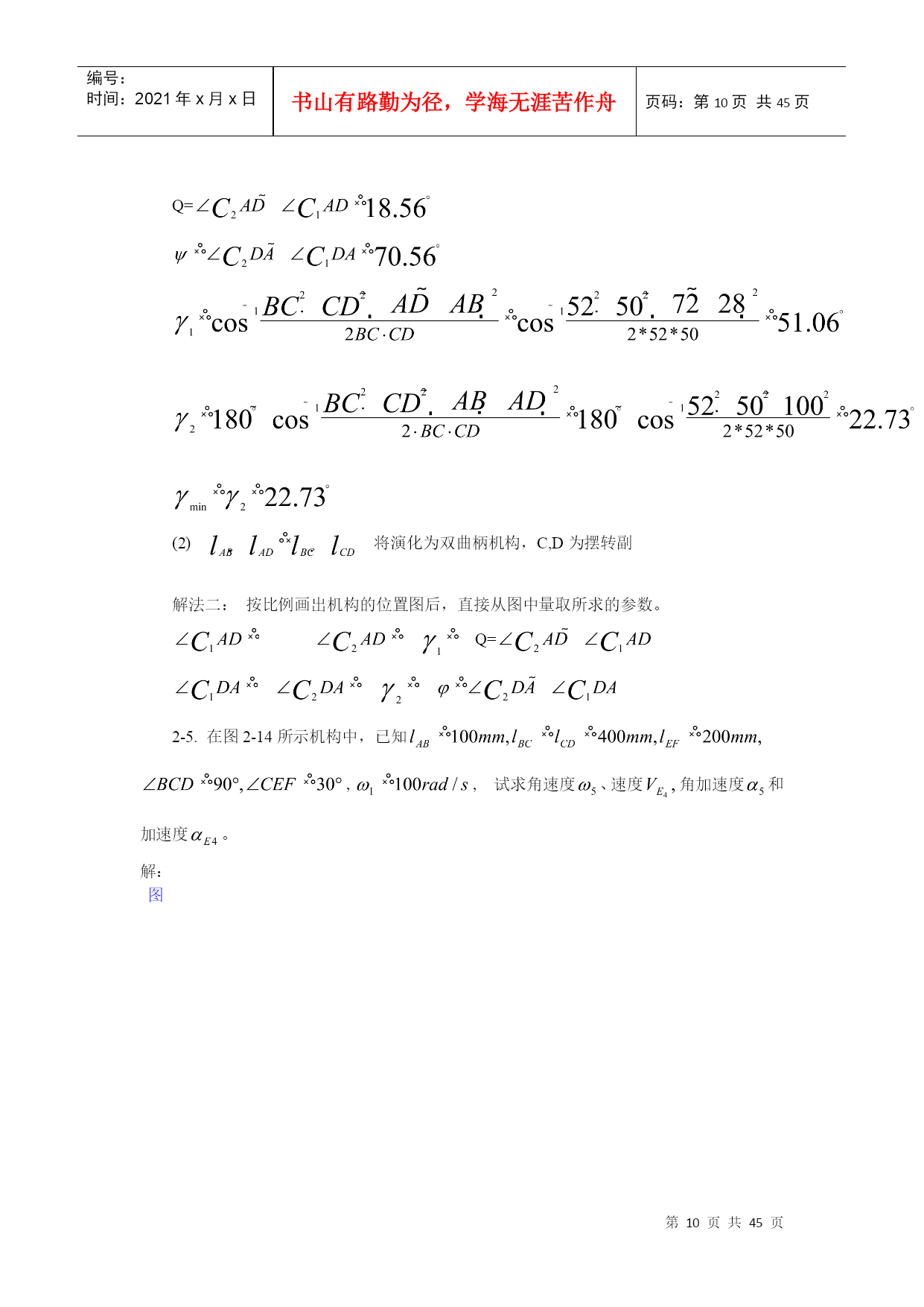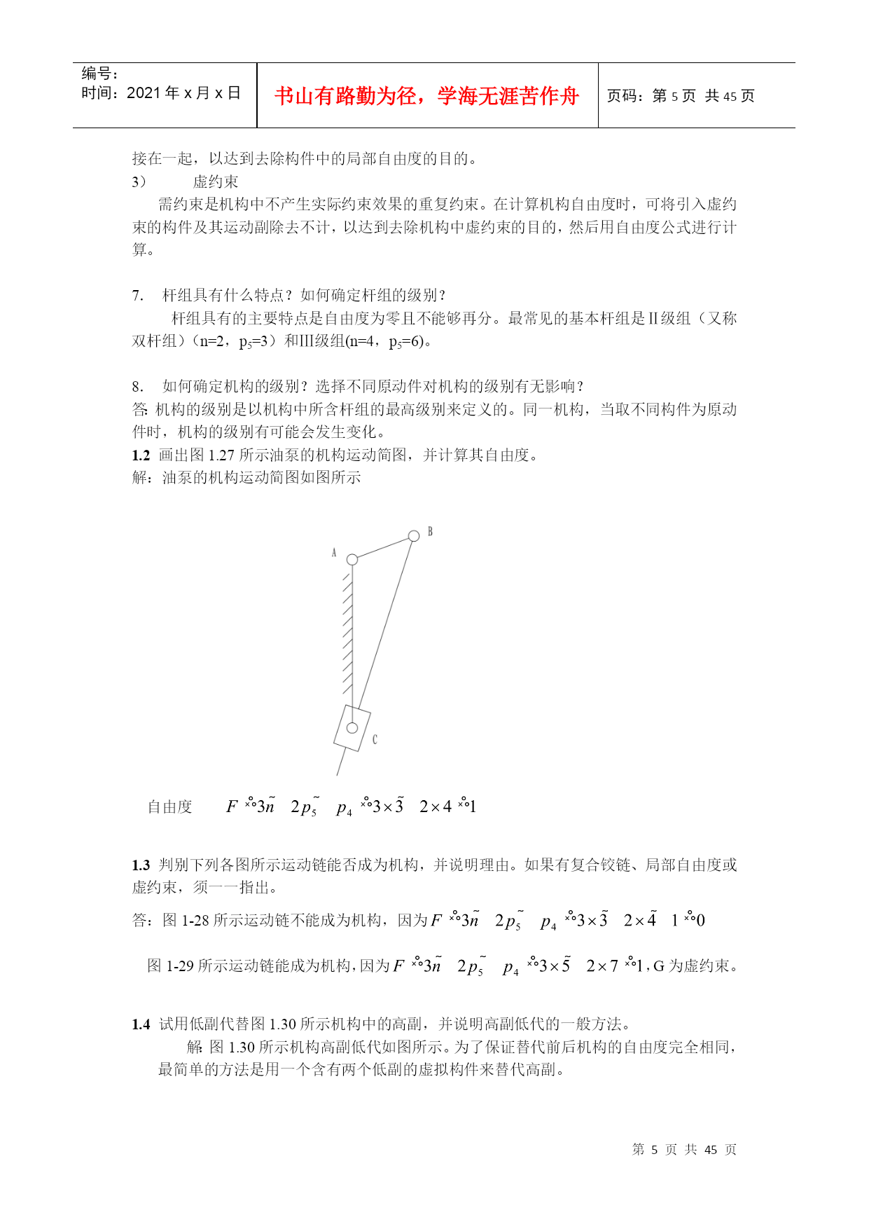 编号:时间:2021年x月x日书山有路勤为径,学海无涯苦作舟页码:第PAGE45页共NUMPAGES45页第PAGE\*MERGEFORMAT45页共NUMPAGES\*MERGEFORMAT45页第一章机构的组成和结构分析1-1~1-4绘出图1-7~图1-10所示机构的机构运动简图。解:图1-7~图1-10所示机构的机构运动简图如下:1-5试判断图1-11、图1-12所示运动链能否成为机构,并说明理由。若不能成为机构请提出修改办法。解:对于图1-11所示运动链n=5,p5=7,p4=1F=3n-2p5-p4=3×5-2×7-1=0∵F=0∴不能成为机构对于图1-12所示运动链n=4,p5=6,p4=0F=3n-2p5-p4=3×4-2×6-0=0∵F=0∴不能成为机构1-6计算图1.13~1.20所示各机构的自由度。并指出其中是否含有复合铰链、局部自由度或虚约束,说明计算自由度时应做何处理。解:对于图1-13所示的机构n=5,p5=7,p4=0F=3n-2p5-p4=3×5-2×7-0=1对于图1-14所示的机构n=7,p5=10,p4=0(存在一个复合铰链)F=3n-2p5-p4=3×7-2×10-0=1对于图1-15所示的机构n=4,p5=5,p4=1F=3n-2p5-p4=3×4-2×5-1=1对于图1-16所示的机构n=4,p5=4,p4=2(存在局部自由度和虚约束)F=3n-2p5-p4=3×4-2×4-2=2对于图1-17所示的机构n=3,p5=3,p4=2(存在复合铰链和虚约束)F=3n-2p5-p4=3×3-2×3-2=1对于图1-18所示的机构n=6,p5=8,p4=1(存在局部自由度)F=3n-2p5-p4=3×6-2×8-1=1对于图1-19所示的机构n=8,p5=11,p4=1(存在局部自由度)F=3n-2p5-p4=3×8-2×11-1=1对于图1-20所示的机构n=13,p5=19,p4=0F=3n-2p5-p4=3×13-2×19-1=11-7计算图1-21至图1-26所示各机构的自由度,用低副代替高副,并确定机构所含杆组的数目和级别以及机构的级别。解:对于图1-21所示的机构n=9,p5=12,p4=2F=3n-2p5-p4=3×9-2×12-2=1如上图所示,高副低代后可知该机构由5个Ⅱ级杆组和一个Ⅰ级机构组成,因此该机构是一个Ⅱ级机构。对于图1-22所示的机构n=5,p5=7,p4=0F=3n-2p5-p4=3×5-2×7-0=1该机构由2个Ⅱ级杆组和一个Ⅰ级机构组成,因此该机构是一个Ⅱ级机构。对于图1-23所示的机构n=5,p5=7,p4=0F=3n-2p5-p4=3×5-2×7-0=1该机构由5个Ⅱ级杆组和一个Ⅰ级机构组成,因此该机构是一个Ⅱ级机构。对于图1-24所示的机构n=6,p5=8,p4=1F=3n-2p5-p4=3×6-2×8-1=1如上图所示,高副低代后可知该机构由1个Ⅲ级杆组、1个Ⅱ级杆组和一个Ⅰ级机构组成,因此该机构是一个Ⅲ级机构。对于图1-25所示的机构n=3,p5=3,p4=2F=3n-2p5-p4=3×3-2×3-2=1如上图所示,高副低代后可知该机构由2个Ⅱ级杆组和一个Ⅰ级机构组成,因此该机构是一个Ⅱ级机构。对于图1-26所示的机构n=5,p5=7,p4=0F=3n-2p5-p4=3×5-2×7-0=1该机构由1个Ⅲ级杆组和一个Ⅰ级机构组成,因此该机构是一个Ⅲ级机构。综合测试题1.1填空题及简答题1.平面机构中若引入一个高副将带入1个约束,而引入一个低副将带入2个约束。2.高副低代必须满足的条件是代替前后机构的自由度不变,代替前后机构的瞬时速度和瞬时加速度不变。3.何谓“运动链”?具备什么条件,运动链才具有运动的可能性,具备什么条件后才具有运动的确定性?具备什么条件,运动链才能成为机构。答:两个或两个以上的构件通过运动副联接而成的相对可动的系统称为运动链。当运动链的自由度大于零时,运动链具有运动的可能性;运动链成为机构的条件是:取运动链中一个构件相对固定作为机架,运动链相对于机架的自由度必须大于零,且原动件的数目等于运动链的自由度数。4.何谓“机构运动简图”?绘制的步骤如何?答:根据机构的运动尺寸,按一定的比例尺定出各运动副的位置,再用国标规定的简单符号和线条代表运动副和构件,并将机构的运动情况表示出来,这种简单的图形称为机构运动简图。机构运动简图的绘制方法和步骤:1)分析机械的动作原理、组成情况和运动情况,确定其组成的各构件何为原动件、机架、执行部分和传动部分。2)沿着运