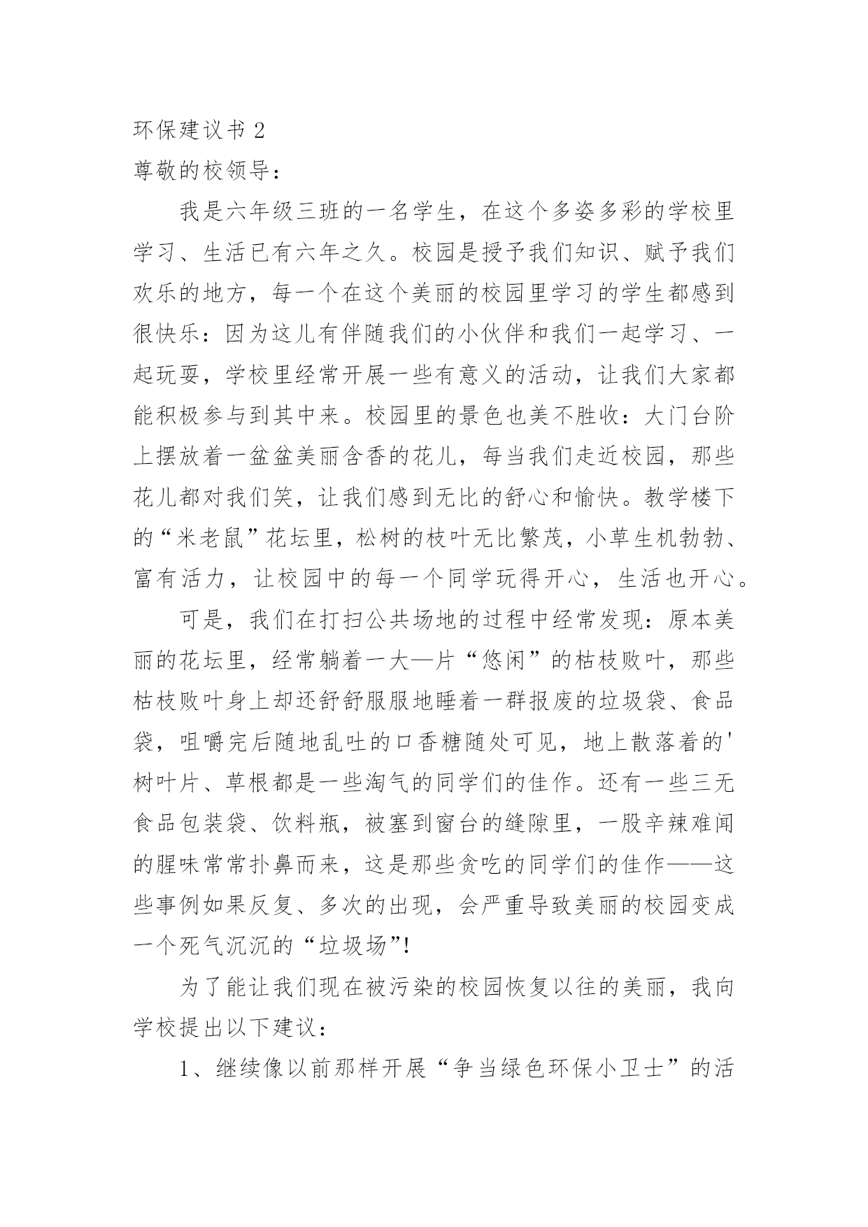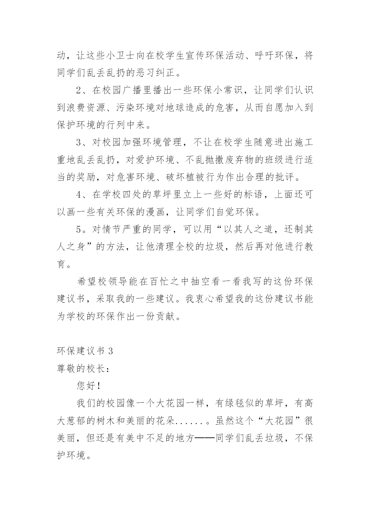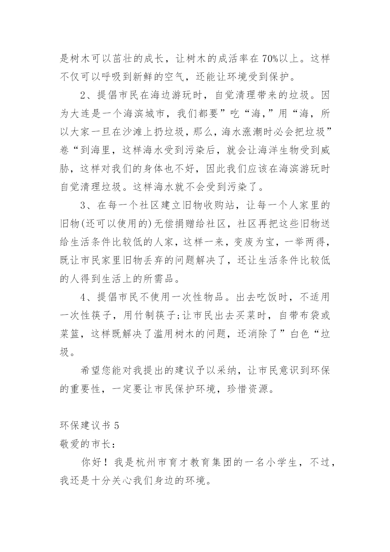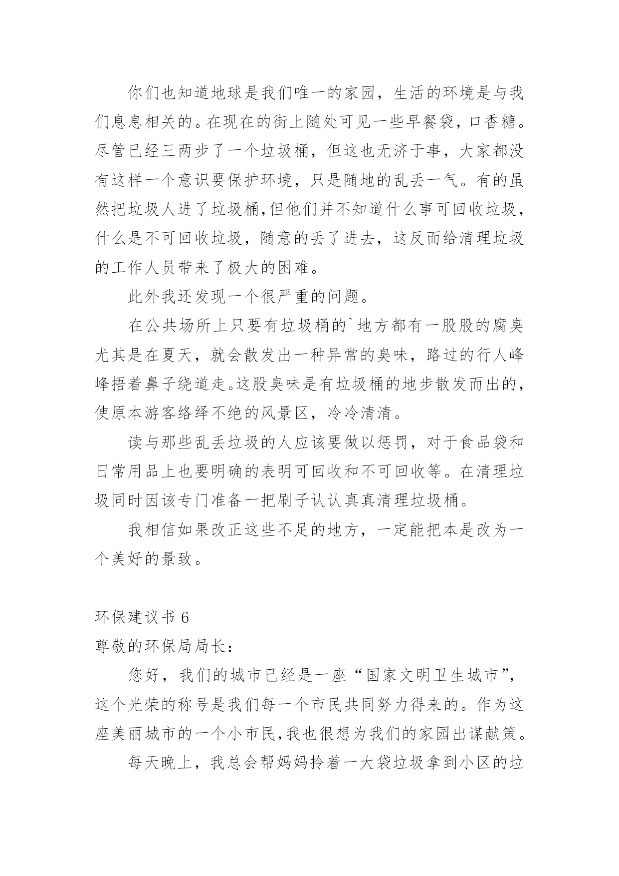 环保建议书在现在的社会生活中,我们都可能会用到建议书,当建议书是面对领导和有关部门时,可以中肯地提出自己对对方工作的意见和自己的建议。为了让您在写建议书时更加简单方便,下面是小编整理的环保建议书,仅供参考,希望能够帮助到大家。环保建议书1敬爱的广汉市市长:您好!自从您接管广汉市以后,广汉市发生了翻天覆地的变化!以前破旧的南街不在了!以前的南街,路烂得不能再烂了!只要一下雨,南街就成了“无敌丑女”,本来就很烂的街道!更是彻底的毁了容!稀泥满地!汽车从这开过!稀泥就四溅,要是旁边有路人的.话,他就会被加工成“巧克力棒”——身上全是稀泥!市民们都不常在南街上逛!但是,自从您接管广汉以后,南街变了,变得漂亮,变得时尚!给我们一种焕然一新的感觉!平房变成了高楼,烂路变成了平坦宽敞的柏油马路!市民们也爱来南街逛了!逛逛商店,买些东西,都方便多了!你上任以后,不仅改变了南街!还改变了武昌路和桂花街等等!广汉真的变漂亮了!这一切都一切,我们都要感谢您——尊敬的市长!但是,我作为一个小学生!作为一个爱护环境的小学生来说,广汉市还是有一些缺点:1街道的卫生管理:走在街上看着美丽的广汉,我不禁兴奋起来!好美丽到城市!这就是我的家!突然,街道旁的一堆散发着一阵阵恶臭的垃圾引起我的注意,这严重的影响力市容啊!我边走边看,一路上,垃圾越来越多,街道变的丑陋不堪!加上垃圾堆散发出的那一阵阵恶臭,我突然感到无比难受!市长,如果我们每一个市民都能做到爱护环境卫生,不随手乱扔垃圾,那么,我们的广汉是否能变得更美丽?不仅如此,广汉市存在一个较为严重,且很棘手的问题:一些不法的商贩为了节约每一个月那少的可怜的摊费,就私自占用街道,躲避城管!这种人不是没有,反而还很多,一条街,摆上几个这样的摊位,街道就变得很狭窄了!路人有时也会“无路可走!”街道的保护者在哪?城管在哪?不是没有城管,而是不法商贩太多!难道就没有人能够制服这些不法商贩吗?市长,如果我们能加强打击不法商贩的力度,街道是否会更宽敞一些?商贩们,如果你们能遵章守纪,租个摊位,你们也就不会再出现在大街上了!那么,街道是否能更宽敞呢?请你们铭记:广汉是我家,人人关爱她!为了建设我们美好的家园,我提出建议,市长应亲自出面呼吁大家,同时提出倡议:爱护环境卫生!爱护我们生存的家园!让广汉不再是灰尘满天飞的“光灰”城市,而是,人人都爱的光辉城市!环保建议书2尊敬的校领导:我是六年级三班的一名学生,在这个多姿多彩的学校里学习、生活已有六年之久。校园是授予我们知识、赋予我们欢乐的地方,每一个在这个美丽的校园里学习的学生都感到很快乐:因为这儿有伴随我们的小伙伴和我们一起学习、一起玩耍,学校里经常开展一些有意义的活动,让我们大家都能积极参与到其中来。校园里的景色也美不胜收:大门台阶上摆放着一盆盆美丽含香的花儿,每当我们走近校园,那些花儿都对我们笑,让我们感到无比的舒心和愉快。教学楼下的“米老鼠”花坛里,松树的枝叶无比繁茂,小草生机勃勃、富有活力,让校园中的每一个同学玩得开心,生活也开心。可是,我们在打扫公共场地的过程中经常发现:原本美丽的花坛里,经常躺着一大—片“悠闲”的枯枝败叶,那些枯枝败叶身上却还舒舒服服地睡着一群报废的垃圾袋、食品袋,咀嚼完后随地乱吐的口香糖随处可见,地上散落着的'树叶片、草根都是一些淘气的同学们的佳作。还有一些三无食品包装袋、饮料瓶,被塞到窗台的缝隙里,一股辛辣难闻的腥味常常扑鼻而来,这是那些贪吃的同学们的佳作——这些事例如果反复、多次的出现,会严重导致美丽的校园变成一个死气沉沉的“垃圾场”!为了能让我们现在被污染的校园恢复以往的美丽,我向学校提出以下建议:1、继续像以前那样开展“争当绿色环保小卫士”的活动,让这些小卫士向在校学生宣传环保活动、呼吁环保,将同学们乱丢乱扔的恶习纠正。2、在校园广播里播出一些环保小常识,让同学们认识到浪费资源、污染环境对地球造成的危害,从而自愿加入到保护环境的行列中来。3、对校园加强环境管理,不让在校学生随意进出施工重地乱丢乱扔,对爱护环境、不乱抛撒废弃物的班级进行适当的奖励,对危害环境、破坏植被行为作出合理的批评。4、在学校四处的草坪里立上一些好的标语,上面还可以画一些有关环保的漫画,让同学们自觉环保。5。对情节严重的同学,可以用“以其人之道,还制其人之身”的方法,让他清理全校的垃圾,然后再对他进行教育。希望校领导能在百忙之中抽空看一看我写的这份环保建议书,采取我的一些建议。我衷心希望我的这份建议书能为学校的环保作出一份贡献。环保建议书3尊敬的校长:您好!我们的校园像一个大花园一样,有绿毯似的草坪,有高大葱郁的树木和美丽的花朵......。虽然这个“大花园”很美丽,但还是有美中不足的地方──同学们乱丢垃圾,不保护环境。我每天早晨来到学校的时候都能发现地上有许多大大小小的