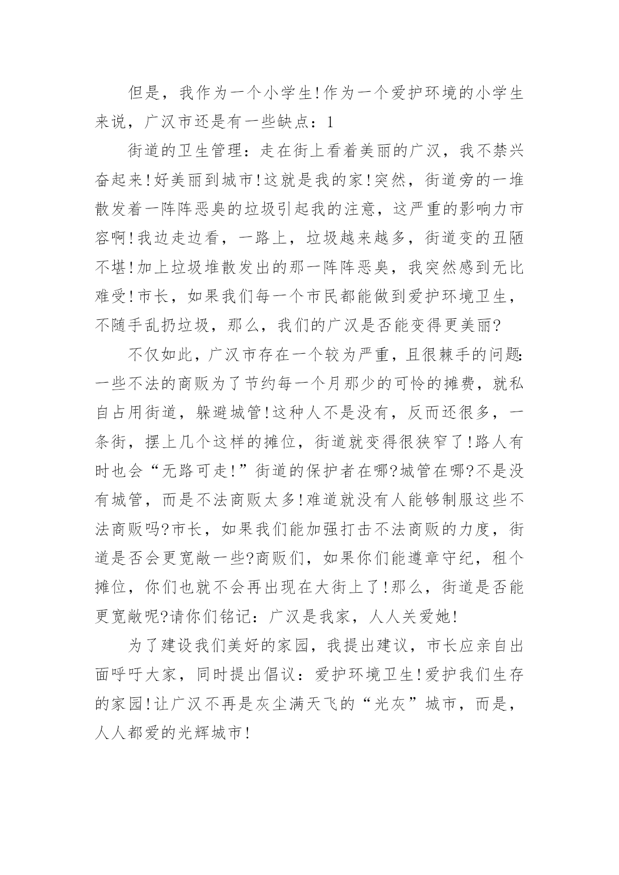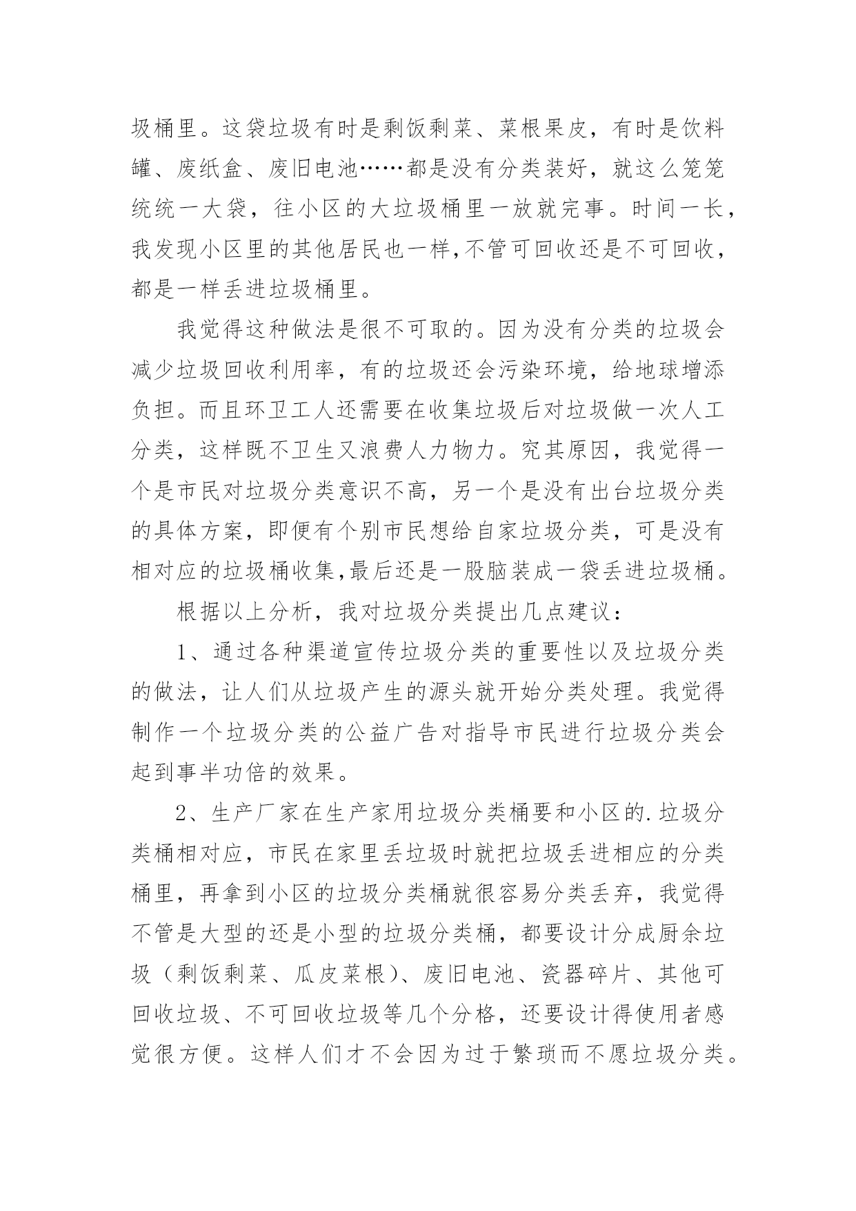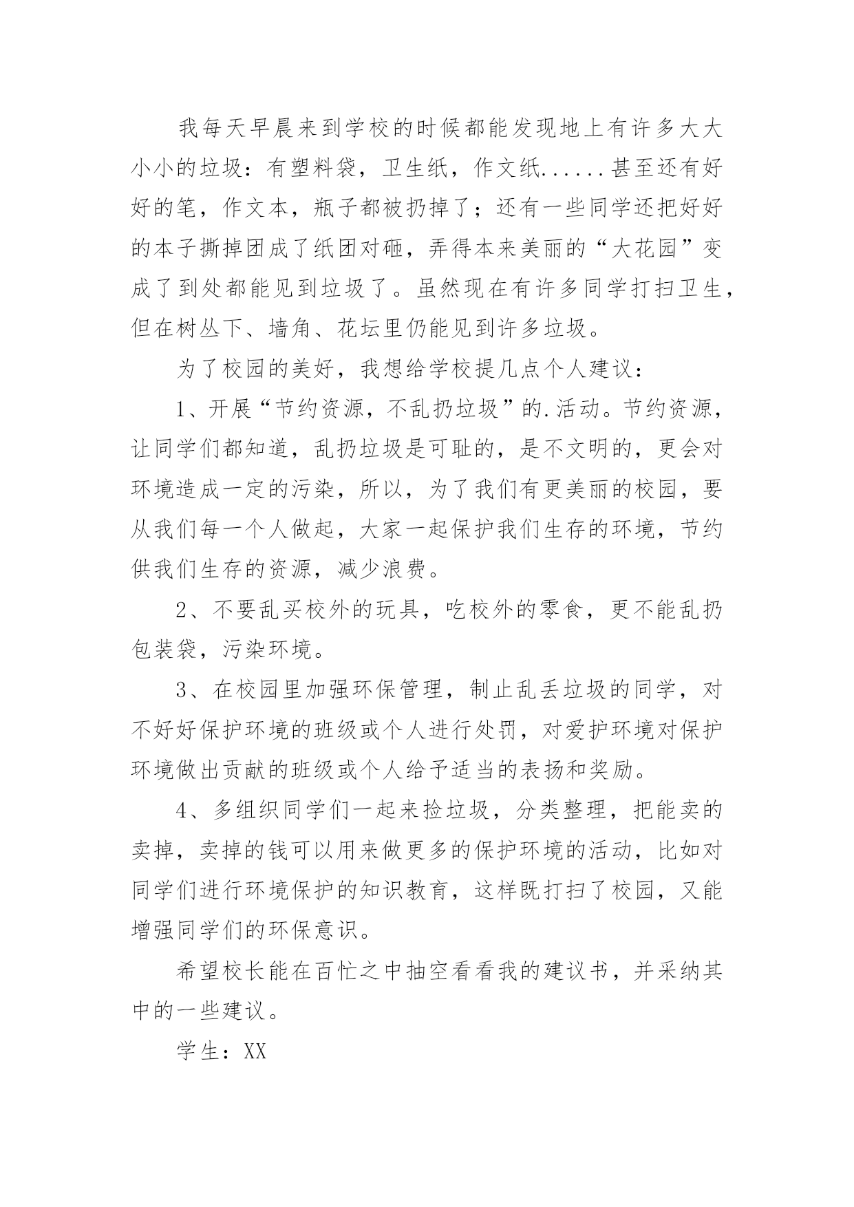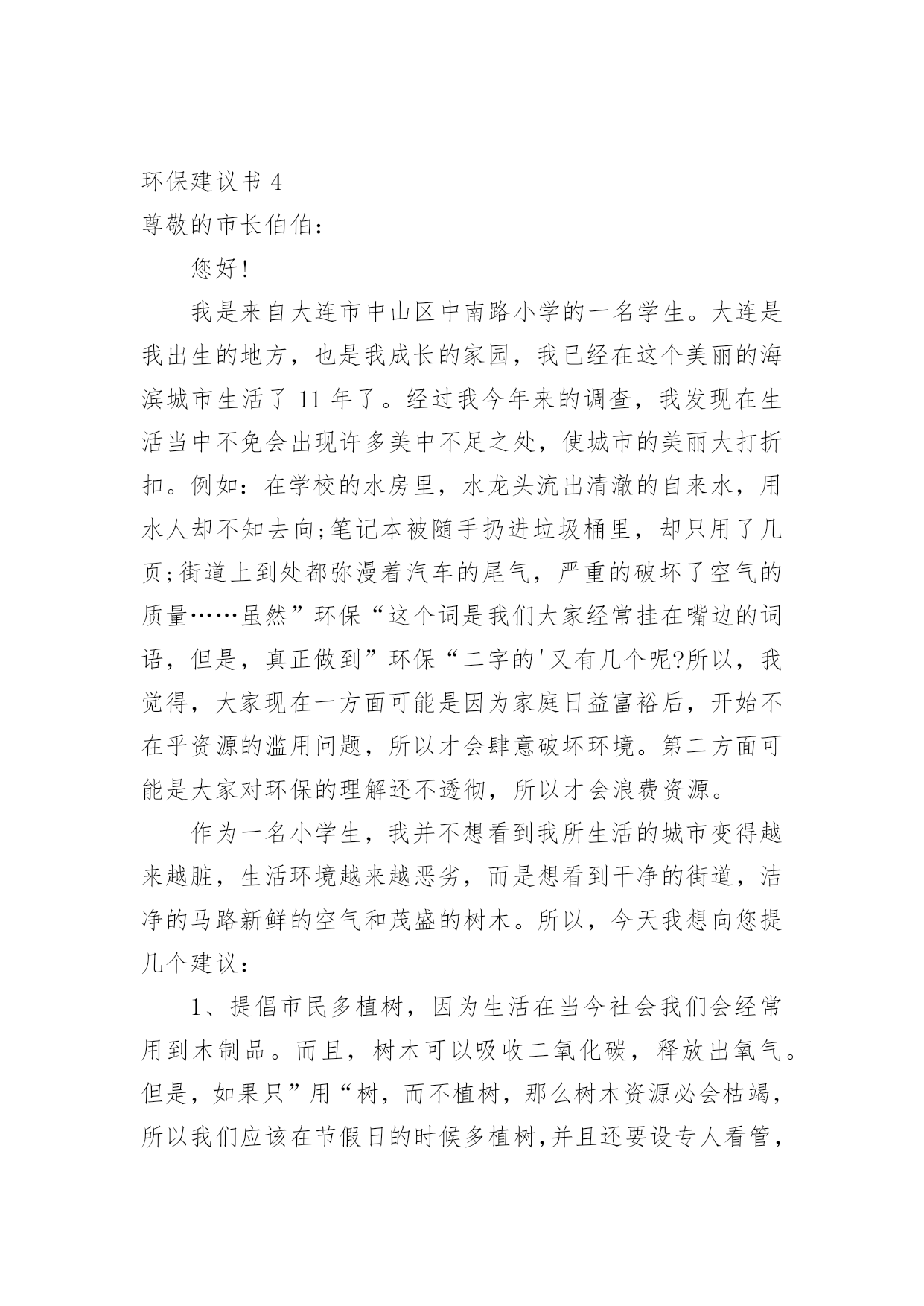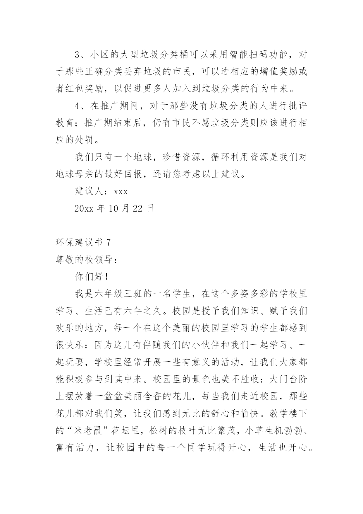 环保建议书在现在的社会生活中,我们都可能会用到建议书,当建议书是面对领导和有关部门时,可以中肯地提出自己对对方工作的意见和自己的建议。为了让您在写建议书时更加简单方便,下面是小编整理的环保建议书,仅供参考,希望能够帮助到大家。环保建议书1敬爱的广汉市市长:您好!自从您接管广汉市以后,广汉市发生了翻天覆地的变化!以前破旧的南街不在了!以前的南街,路烂得不能再烂了!只要一下雨,南街就成了“无敌丑女”,本来就很烂的街道!更是彻底的毁了容!稀泥满地!汽车从这开过!稀泥就四溅,要是旁边有路人的.话,他就会被加工成“巧克力棒”——身上全是稀泥!市民们都不常在南街上逛!但是,自从您接管广汉以后,南街变了,变得漂亮,变得时尚!给我们一种焕然一新的感觉!平房变成了高楼,烂路变成了平坦宽敞的柏油马路!市民们也爱来南街逛了!逛逛商店,买些东西,都方便多了!你上任以后,不仅改变了南街!还改变了武昌路和桂花街等等!广汉真的变漂亮了!这一切都一切,我们都要感谢您——尊敬的市长!但是,我作为一个小学生!作为一个爱护环境的小学生来说,广汉市还是有一些缺点:1街道的卫生管理:走在街上看着美丽的广汉,我不禁兴奋起来!好美丽到城市!这就是我的家!突然,街道旁的一堆散发着一阵阵恶臭的垃圾引起我的注意,这严重的影响力市容啊!我边走边看,一路上,垃圾越来越多,街道变的丑陋不堪!加上垃圾堆散发出的那一阵阵恶臭,我突然感到无比难受!市长,如果我们每一个市民都能做到爱护环境卫生,不随手乱扔垃圾,那么,我们的广汉是否能变得更美丽?不仅如此,广汉市存在一个较为严重,且很棘手的问题:一些不法的商贩为了节约每一个月那少的可怜的摊费,就私自占用街道,躲避城管!这种人不是没有,反而还很多,一条街,摆上几个这样的摊位,街道就变得很狭窄了!路人有时也会“无路可走!”街道的保护者在哪?城管在哪?不是没有城管,而是不法商贩太多!难道就没有人能够制服这些不法商贩吗?市长,如果我们能加强打击不法商贩的力度,街道是否会更宽敞一些?商贩们,如果你们能遵章守纪,租个摊位,你们也就不会再出现在大街上了!那么,街道是否能更宽敞呢?请你们铭记:广汉是我家,人人关爱她!为了建设我们美好的家园,我提出建议,市长应亲自出面呼吁大家,同时提出倡议:爱护环境卫生!爱护我们生存的家园!让广汉不再是灰尘满天飞的“光灰”城市,而是,人人都爱的光辉城市!环保建议书2尊敬的校领导:我是六年级三班的一名学生,在这个多姿多彩的学校里学习、生活已有六年之久。校园是授予我们知识、赋予我们欢乐的地方,每一个在这个美丽的校园里学习的学生都感到很快乐:因为这儿有伴随我们的小伙伴和我们一起学习、一起玩耍,学校里经常开展一些有意义的活动,让我们大家都能积极参与到其中来。校园里的景色也美不胜收:大门台阶上摆放着一盆盆美丽含香的花儿,每当我们走近校园,那些花儿都对我们笑,让我们感到无比的舒心和愉快。教学楼下的“米老鼠”花坛里,松树的枝叶无比繁茂,小草生机勃勃、富有活力,让校园中的每一个同学玩得开心,生活也开心。可是,我们在打扫公共场地的过程中经常发现:原本美丽的花坛里,经常躺着一大—片“悠闲”的枯枝败叶,那些枯枝败叶身上却还舒舒服服地睡着一群报废的垃圾袋、食品袋,咀嚼完后随地乱吐的口香糖随处可见,地上散落着的'树叶片、草根都是一些淘气的同学们的佳作。还有一些三无食品包装袋、饮料瓶,被塞到窗台的缝隙里,一股辛辣难闻的腥味常常扑鼻而来,这是那些贪吃的同学们的佳作——这些事例如果反复、多次的出现,会严重导致美丽的校园变成一个死气沉沉的“垃圾场”!为了能让我们现在被污染的校园恢复以往的美丽,我向学校提出以下建议:1、继续像以前那样开展“争当绿色环保小卫士”的活动,让这些小卫士向在校学生宣传环保活动、呼吁环保,将同学们乱丢乱扔的恶习纠正。2、在校园广播里播出一些环保小常识,让同学们认识到浪费资源、污染环境对地球造成的危害,从而自愿加入到保护环境的行列中来。3、对校园加强环境管理,不让在校学生随意进出施工重地乱丢乱扔,对爱护环境、不乱抛撒废弃物的班级进行适当的奖励,对危害环境、破坏植被行为作出合理的批评。4、在学校四处的草坪里立上一些好的标语,上面还可以画一些有关环保的漫画,让同学们自觉环保。5。对情节严重的同学,可以用“以其人之道,还制其人之身”的方法,让他清理全校的垃圾,然后再对他进行教育。希望校领导能在百忙之中抽空看一看我写的这份环保建议书,采取我的一些建议。我衷心希望我的这份建议书能为学校的环保作出一份贡献。环保建议书3尊敬的校长:您好!我们的校园像一个大花园一样,有绿毯似的草坪,有高大葱郁的树木和美丽的花朵......。虽然这个“大花园”很美丽,但还是有美中不足的地方──同学们乱丢垃圾,不保护环境。我每天早晨来到学校的时候都能发现地上有许多大大小小的