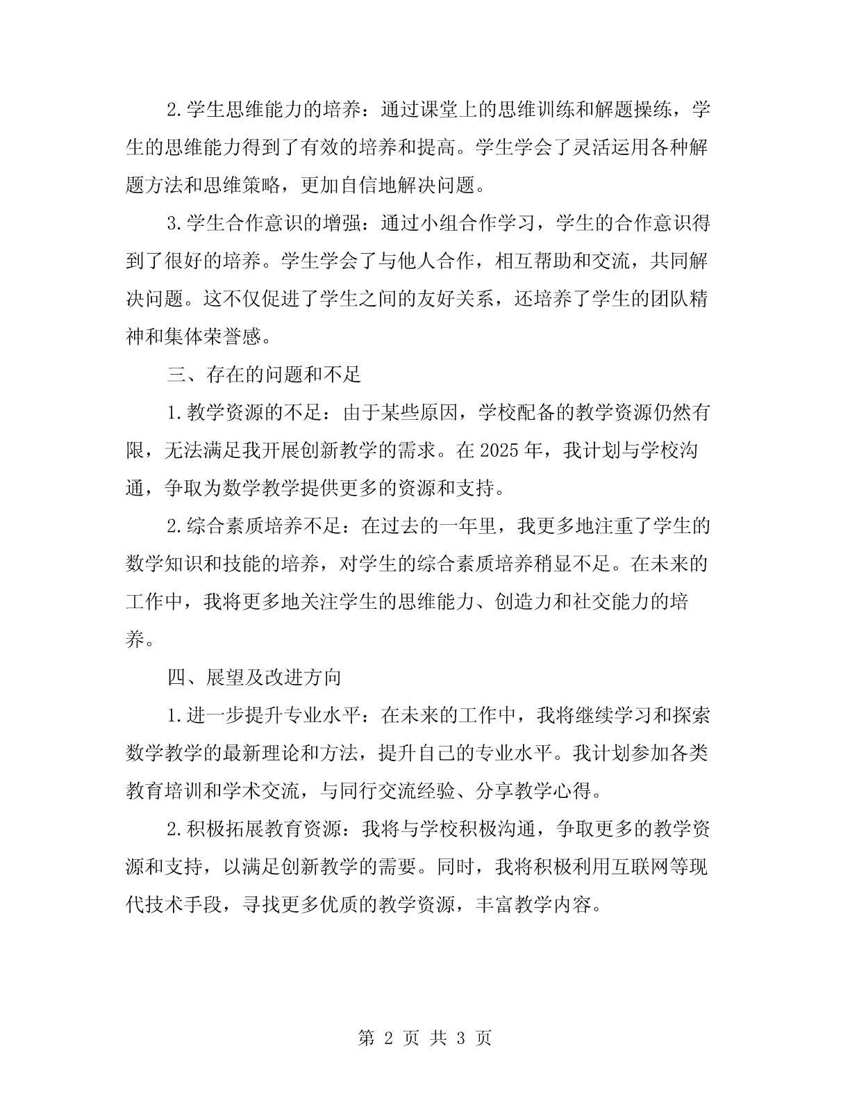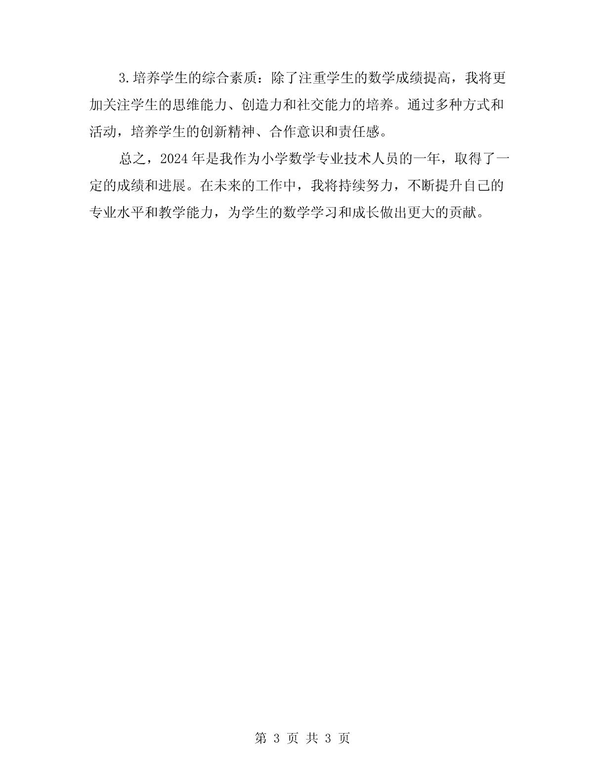2024年小学数学专业技术工作总结20xx年,我在小学数学专业技术工作中取得了一定的成绩和进展。以下是我对2024年的工作进行总结和回顾。一、工作内容1.教学设计:根据小学生的认知特点和学习需求,我设计了一些富有趣味性和互动性的课程,以激发学生的学习兴趣和主动性。同时,我注重知识的系统性和针对性,根据学生的学习情况进行灵活调整和个性化教学。2.课堂教学:在课堂上,我运用了多种教学方法和策略,如小组合作学习、案例分析、游戏等。(1)小组合作学习:通过小组合作学习的方式,培养了学生的合作意识和团队精神,同时也提高了学生的思维能力和解决问题的能力。(2)案例分析:通过实际生活中的案例分析,让学生将数学知识应用到实际问题中,提升学生的应用能力和创新意识。(3)游戏:在复习和巩固知识时,我设计了一些有趣的数学游戏,以提高学生的学习积极性和主动性。3.学生评价:我注重对学生的评价和反馈,及时发现学生的问题和困惑,并针对性地给予指导和帮助。我鼓励学生勇于表达自己的想法和疑问,培养学生的自信心和自学能力。二、取得的成绩1.学生学习成绩的提高:通过我在教学中的努力和创新,学生的数学学习成绩有了明显的提高。一些原本对数学不感兴趣的学生也逐渐对数学产生了浓厚的兴趣,积极参与学习。2.学生思维能力的培养:通过课堂上的思维训练和解题操练,学生的思维能力得到了有效的培养和提高。学生学会了灵活运用各种解题方法和思维策略,更加自信地解决问题。3.学生合作意识的增强:通过小组合作学习,学生的合作意识得到了很好的培养。学生学会了与他人合作,相互帮助和交流,共同解决问题。这不仅促进了学生之间的友好关系,还培养了学生的团队精神和集体荣誉感。三、存在的问题和不足1.教学资源的不足:由于某些原因,学校配备的教学资源仍然有限,无法满足我开展创新教学的需求。在2025年,我计划与学校沟通,争取为数学教学提供更多的资源和支持。2.综合素质培养不足:在过去的一年里,我更多地注重了学生的数学知识和技能的培养,对学生的综合素质培养稍显不足。在未来的工作中,我将更多地关注学生的思维能力、创造力和社交能力的培养。四、展望及改进方向1.进一步提升专业水平:在未来的工作中,我将继续学习和探索数学教学的最新理论和方法,提升自己的专业水平。我计划参加各类教育培训和学术交流,与同行交流经验、分享教学心得。2.积极拓展教育资源:我将与学校积极沟通,争取更多的教学资源和支持,以满足创新教学的需要。同时,我将积极利用互联网等现代技术手段,寻找更多优质的教学资源,丰富教学内容。3.培养学生的综合素质:除了注重学生的数学成绩提高,我将更加关注学生的思维能力、创造力和社交能力的培养。通过多种方式和活动,培养学生的创新精神、合作意识和责任感。总之,2024年是我作为小学数学专业技术人员的一年,取得了一定的成绩和进展。在未来的工作中,我将持续努力,不断提升自己的专业水平和教学能力,为学生的数学学习和成长做出更大的贡献。