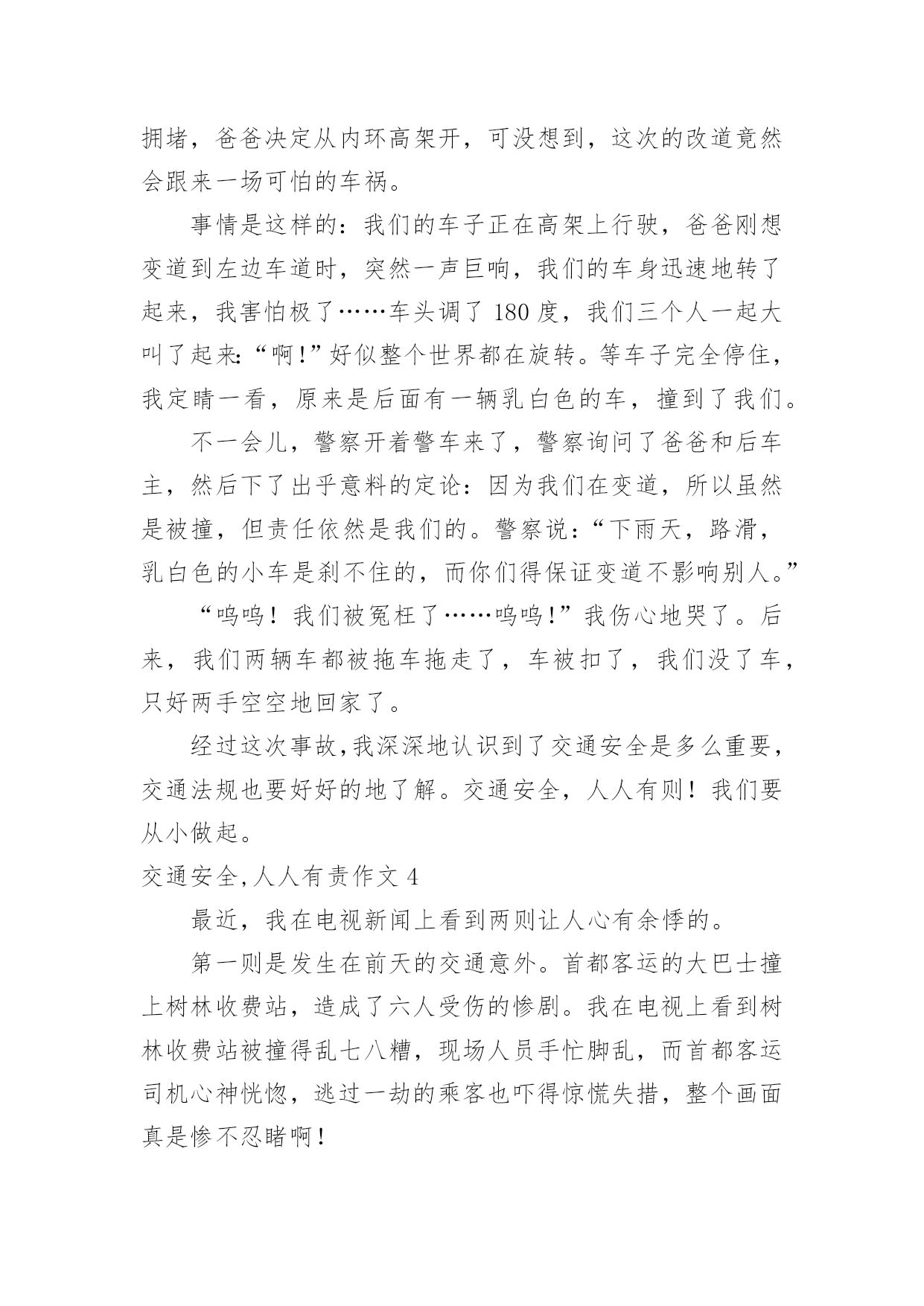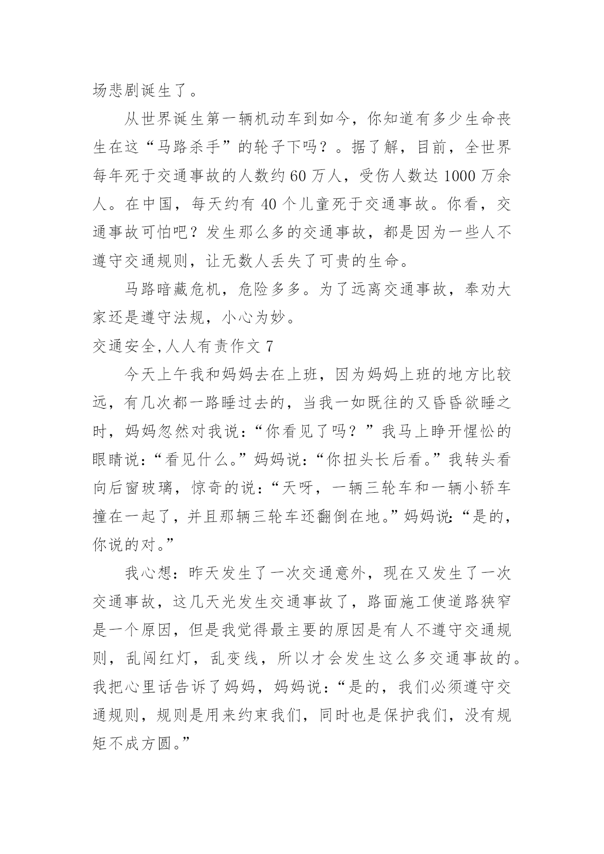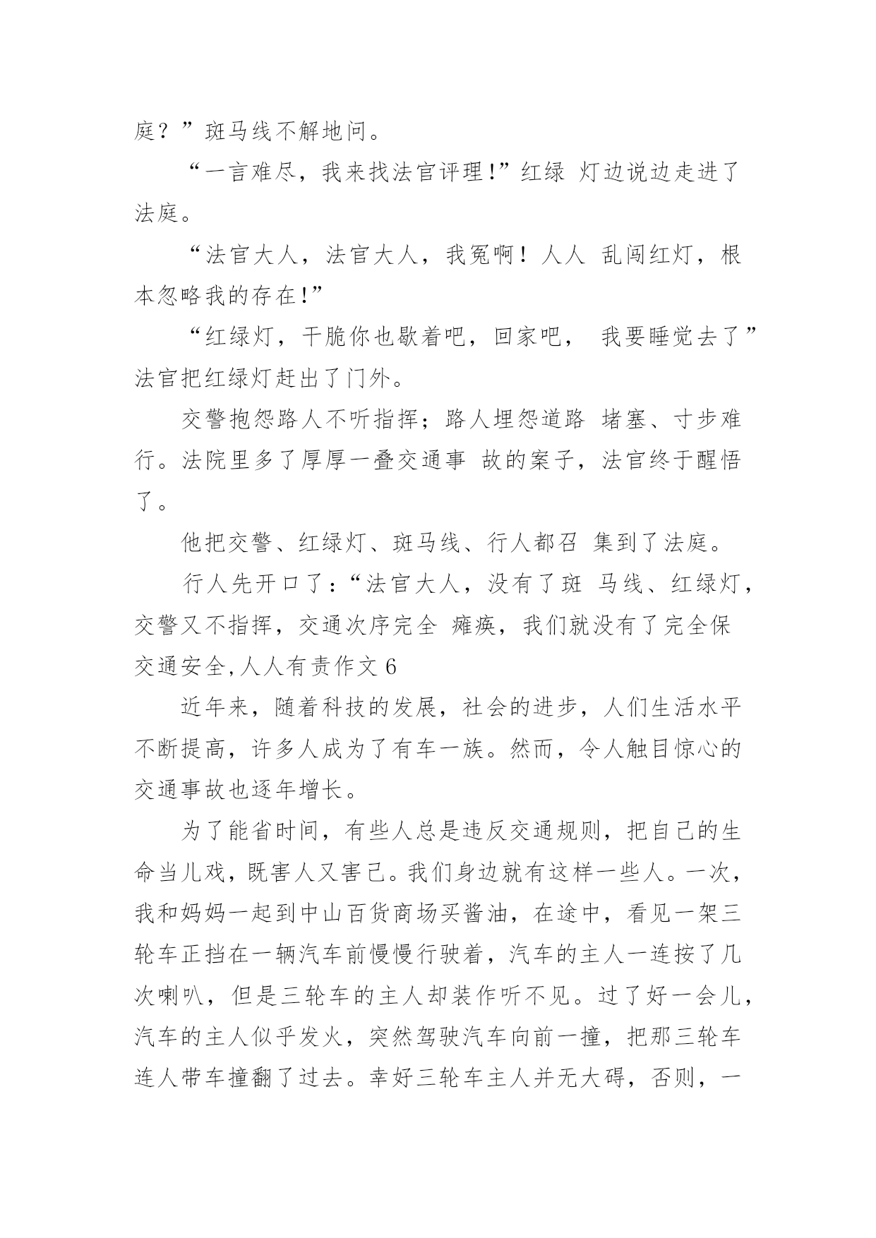 交通安全,人人有责作文交通安全,人人有责作文在日常学习、工作或生活中,大家或多或少都会接触过作文吧,作文是由文字组成,经过人的思想考虑,通过语言组织来表达一个主题意义的文体。写起作文来就毫无头绪?以下是小编为大家收集的交通安全,人人有责作文,欢迎阅读与收藏。交通安全,人人有责作文1遵守交通,安全出行,从小做起,人人有责。现在行驶在马路上的车辆是越来越多了,各式各样,交通便捷的时代,不忘交通安全意识。只有人人遵守,时刻牢记,我们才能远离危害。说到交通安全,我想起那时我才刚刚上一年级,有一次我被电动车撞了,到现在我还心有余悸,因为那时正是放学的时候,我和同学走出校门口侧边大概二十多米处往回家的路上,同学拉着我奔跑,一辆电动车突然停住了,我的左眼角下方被电动车的篮子刮到了,流血了,还缝了四针,现在脸上还有伤疤痕,每次看到伤疤痕我心里十分伤心,也因此在心里烙下阴影。每次走在路上看那车来车往,心里总是一种恐惧感,走在斑马线上车辆都是疾驰而过,现在的现像是人让车不是车让人,真希望我们国家能借鉴国外的交通法规,以人为本、生命至上。文明礼让,文明出行,不闯红灯,预防事故,交通安全从小做起,从我做起,珍惜生命,远离危险,因为生命才是惟一的。交通安全,人人有责作文2现在的社会,城市的马路上车来车往,就连农村也不例外。虽然马路上有许多注意安全的标志,但还有一些人不遵守交通规则。记得有一天,我与爸爸上街买菜。马路上车来车往,穿流不息。走到半路上,我发现有一位中年男子要过马路。他只要往前走几步就到天桥了,可他却没有这样做。只见他左瞧瞧,右望望发现马路上没车。便像一位绅士似地大步走了过去。突然,一辆汽车飞快地开过来。差一点就撞上他了,可他没往回走,却继续向马路中间走去。他翻过栏杆。这时候,一辆汽车飞快的开过来,司机紧急刹车,那位男子吓得哆嗦一下,又缩着头跑到马路的另一边,而他的背后却是传来不停的责怪声。这时,一位年轻的交通警察把他拦住了,开了罚单,又口头批评了他。他接受了批评,脸红着走了。同学们,你们听了这件事,一定对这件事中不走天桥,不走人行横道,不遵守交通规则的男子深感厌恶吧,那么我们就一起遵守交通规则,减少不必要的损失。这样我们对自己,对家庭,对社会也是尽了一份责则。交通安全,人人有责作文3在这个世界上,交通安全很重要。今天中午放学时,天空中下着密密的小雨,道路湿滑。爸爸开车来接我和妈妈回家,我们驶上高架,由于中环黄色拥堵,爸爸决定从内环高架开,可没想到,这次的改道竟然会跟来一场可怕的车祸。事情是这样的:我们的车子正在高架上行驶,爸爸刚想变道到左边车道时,突然一声巨响,我们的车身迅速地转了起来,我害怕极了……车头调了180度,我们三个人一起大叫了起来:“啊!”好似整个世界都在旋转。等车子完全停住,我定睛一看,原来是后面有一辆乳白色的车,撞到了我们。不一会儿,警察开着警车来了,警察询问了爸爸和后车主,然后下了出乎意料的定论:因为我们在变道,所以虽然是被撞,但责任依然是我们的。警察说:“下雨天,路滑,乳白色的小车是刹不住的,而你们得保证变道不影响别人。”“呜呜!我们被冤枉了……呜呜!”我伤心地哭了。后来,我们两辆车都被拖车拖走了,车被扣了,我们没了车,只好两手空空地回家了。经过这次事故,我深深地认识到了交通安全是多么重要,交通法规也要好好的地了解。交通安全,人人有则!我们要从小做起。交通安全,人人有责作文4最近,我在电视新闻上看到两则让人心有余悸的。第一则是发生在前天的交通意外。首都客运的大巴士撞上树林收费站,造成了六人受伤的惨剧。我在电视上看到树林收费站被撞得乱七八糟,现场人员手忙脚乱,而首都客运司机心神恍惚,逃过一劫的乘客也吓得惊慌失措,整个画面真是惨不忍睹啊!第二则令人印象深刻的,是昨天发生在高速公路上的车祸。我看到电视新闻上播出的画面真是夸张啊!肇事车辆一直蛇行又逼车,害得被逼的休旅车撞到护栏后竟然翻滚了八圈,真是恐怖啊!还好休旅车中的两人都有系安全带,所以只受了轻伤,真是不幸中的大幸啊!但是肇事的车辆却逃之夭夭,被各大媒体大张挞伐。其实,这两件车祸都是人为疏失。首都客运的司机不应该疲劳驾驶,另一个蛇行的司机不应该抢快。如果这两位驾驶者都能遵守交通规则的话,就可以避免意外发生。“马路如虎口”,妈妈常耳提面命的告诫我,过马路时要注意左右方是否有来车。其实,人人都希望“快快乐乐的出门,平平安安的回家”,但是“交通安全,人人有责”。如果每个人都能遵守交通规则,很多车祸就不会发生,也不会造成不可挽救的家庭悲剧。交通安全,人人有责作文5法庭上的.对话:“法官,您给我评评理,有我在人们还乱穿马路,您说我的面子还往哪搁呀?”“斑马线,这是你的不对了,交通安全,人人有责。这样吧,干脆我宣判,把你撤了,你也省事,节约资源嘛!”斑马线被弄得一头雾水,丧气地出了