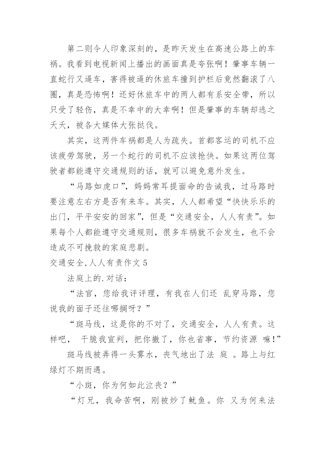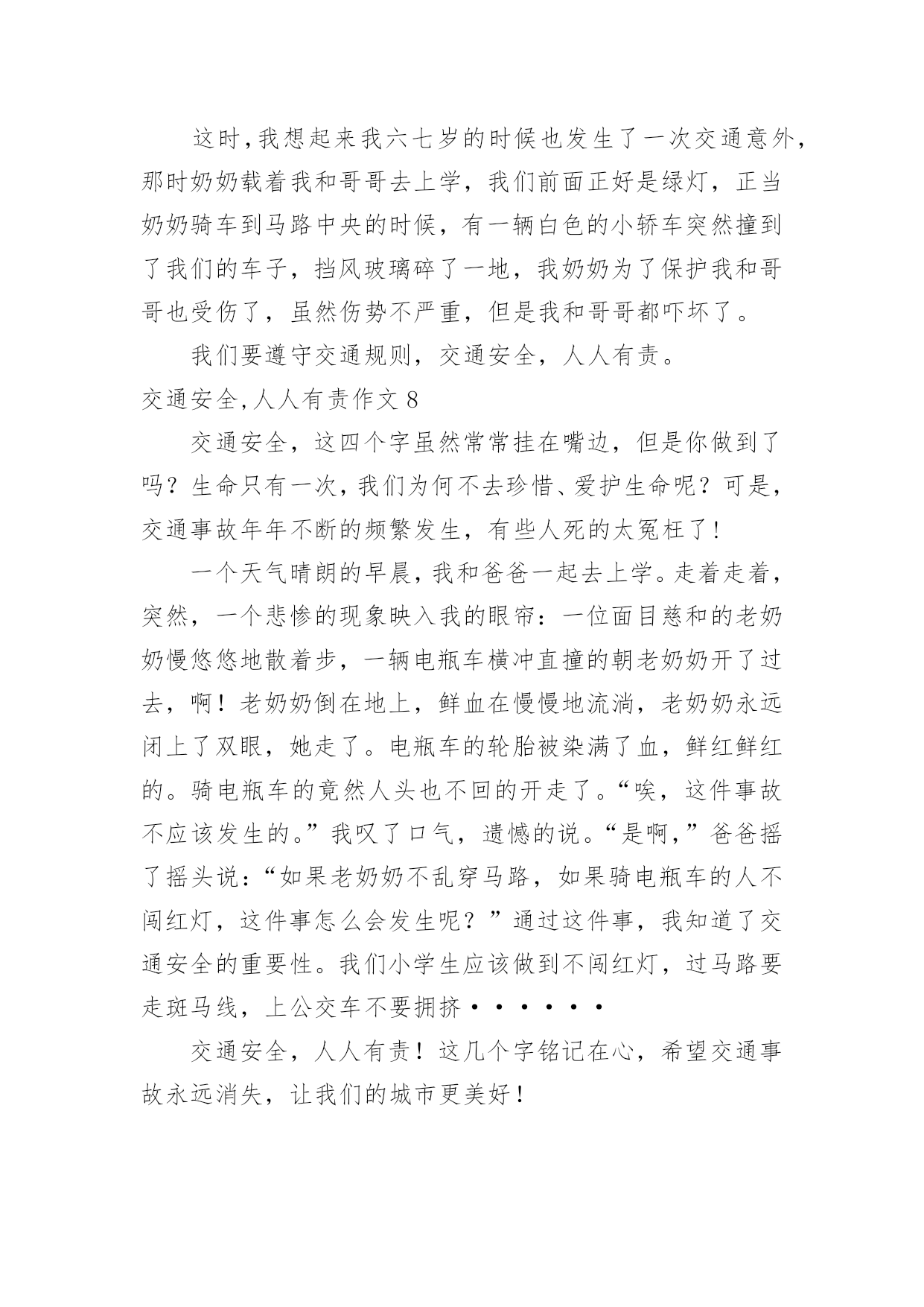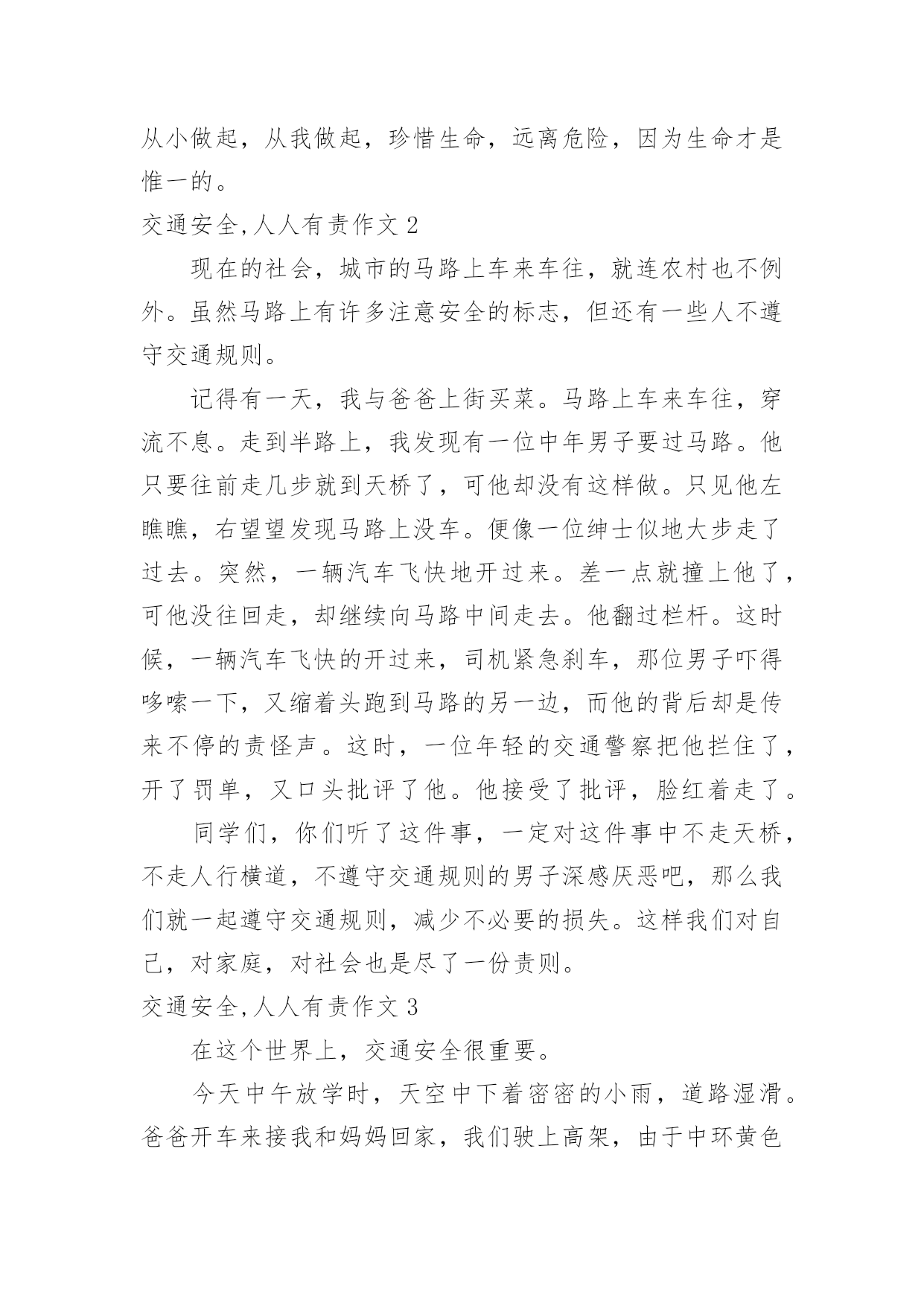 交通安全,人人有责作文交通安全,人人有责作文在日常学习、工作或生活中,大家或多或少都会接触过作文吧,作文是由文字组成,经过人的思想考虑,通过语言组织来表达一个主题意义的文体。写起作文来就毫无头绪?以下是小编为大家收集的交通安全,人人有责作文,欢迎阅读与收藏。交通安全,人人有责作文1遵守交通,安全出行,从小做起,人人有责。现在行驶在马路上的车辆是越来越多了,各式各样,交通便捷的时代,不忘交通安全意识。只有人人遵守,时刻牢记,我们才能远离危害。说到交通安全,我想起那时我才刚刚上一年级,有一次我被电动车撞了,到现在我还心有余悸,因为那时正是放学的时候,我和同学走出校门口侧边大概二十多米处往回家的路上,同学拉着我奔跑,一辆电动车突然停住了,我的左眼角下方被电动车的篮子刮到了,流血了,还缝了四针,现在脸上还有伤疤痕,每次看到伤疤痕我心里十分伤心,也因此在心里烙下阴影。每次走在路上看那车来车往,心里总是一种恐惧感,走在斑马线上车辆都是疾驰而过,现在的现像是人让车不是车让人,真希望我们国家能借鉴国外的交通法规,以人为本、生命至上。文明礼让,文明出行,不闯红灯,预防事故,交通安全从小做起,从我做起,珍惜生命,远离危险,因为生命才是惟一的。交通安全,人人有责作文2现在的社会,城市的马路上车来车往,就连农村也不例外。虽然马路上有许多注意安全的标志,但还有一些人不遵守交通规则。记得有一天,我与爸爸上街买菜。马路上车来车往,穿流不息。走到半路上,我发现有一位中年男子要过马路。他只要往前走几步就到天桥了,可他却没有这样做。只见他左瞧瞧,右望望发现马路上没车。便像一位绅士似地大步走了过去。突然,一辆汽车飞快地开过来。差一点就撞上他了,可他没往回走,却继续向马路中间走去。他翻过栏杆。这时候,一辆汽车飞快的开过来,司机紧急刹车,那位男子吓得哆嗦一下,又缩着头跑到马路的另一边,而他的背后却是传来不停的责怪声。这时,一位年轻的交通警察把他拦住了,开了罚单,又口头批评了他。他接受了批评,脸红着走了。同学们,你们听了这件事,一定对这件事中不走天桥,不走人行横道,不遵守交通规则的男子深感厌恶吧,那么我们就一起遵守交通规则,减少不必要的损失。这样我们对自己,对家庭,对社会也是尽了一份责则。交通安全,人人有责作文3在这个世界上,交通安全很重要。今天中午放学时,天空中下着密密的小雨,道路湿滑。爸爸开车来接我和妈妈回家,我们驶上高架,由于中环黄色拥堵,爸爸决定从内环高架开,可没想到,这次的改道竟然会跟来一场可怕的车祸。事情是这样的:我们的车子正在高架上行驶,爸爸刚想变道到左边车道时,突然一声巨响,我们的车身迅速地转了起来,我害怕极了……车头调了180度,我们三个人一起大叫了起来:“啊!”好似整个世界都在旋转。等车子完全停住,我定睛一看,原来是后面有一辆乳白色的车,撞到了我们。不一会儿,警察开着警车来了,警察询问了爸爸和后车主,然后下了出乎意料的定论:因为我们在变道,所以虽然是被撞,但责任依然是我们的。警察说:“下雨天,路滑,乳白色的小车是刹不住的,而你们得保证变道不影响别人。”“呜呜!我们被冤枉了……呜呜!”我伤心地哭了。后来,我们两辆车都被拖车拖走了,车被扣了,我们没了车,只好两手空空地回家了。经过这次事故,我深深地认识到了交通安全是多么重要,交通法规也要好好的地了解。交通安全,人人有则!我们要从小做起。交通安全,人人有责作文4最近,我在电视新闻上看到两则让人心有余悸的。第一则是发生在前天的交通意外。首都客运的大巴士撞上树林收费站,造成了六人受伤的惨剧。我在电视上看到树林收费站被撞得乱七八糟,现场人员手忙脚乱,而首都客运司机心神恍惚,逃过一劫的乘客也吓得惊慌失措,整个画面真是惨不忍睹啊!第二则令人印象深刻的,是昨天发生在高速公路上的车祸。我看到电视新闻上播出的画面真是夸张啊!肇事车辆一直蛇行又逼车,害得被逼的休旅车撞到护栏后竟然翻滚了八圈,真是恐怖啊!还好休旅车中的两人都有系安全带,所以只受了轻伤,真是不幸中的大幸啊!但是肇事的车辆却逃之夭夭,被各大媒体大张挞伐。其实,这两件车祸都是人为疏失。首都客运的司机不应该疲劳驾驶,另一个蛇行的司机不应该抢快。如果这两位驾驶者都能遵守交通规则的话,就可以避免意外发生。“马路如虎口”,妈妈常耳提面命的告诫我,过马路时要注意左右方是否有来车。其实,人人都希望“快快乐乐的出门,平平安安的回家”,但是“交通安全,人人有责”。如果每个人都能遵守交通规则,很多车祸就不会发生,也不会造成不可挽救的家庭悲剧。交通安全,人人有责作文5法庭上的.对话:“法官,您给我评评理,有我在人们还乱穿马路,您说我的面子还往哪搁呀?”“斑马线,这是你的不对了,交通安全,人人有责。这样吧,干脆我宣判,把你撤了,你也省事,节约资源嘛!”斑马线被弄得一头雾水,丧气地出了