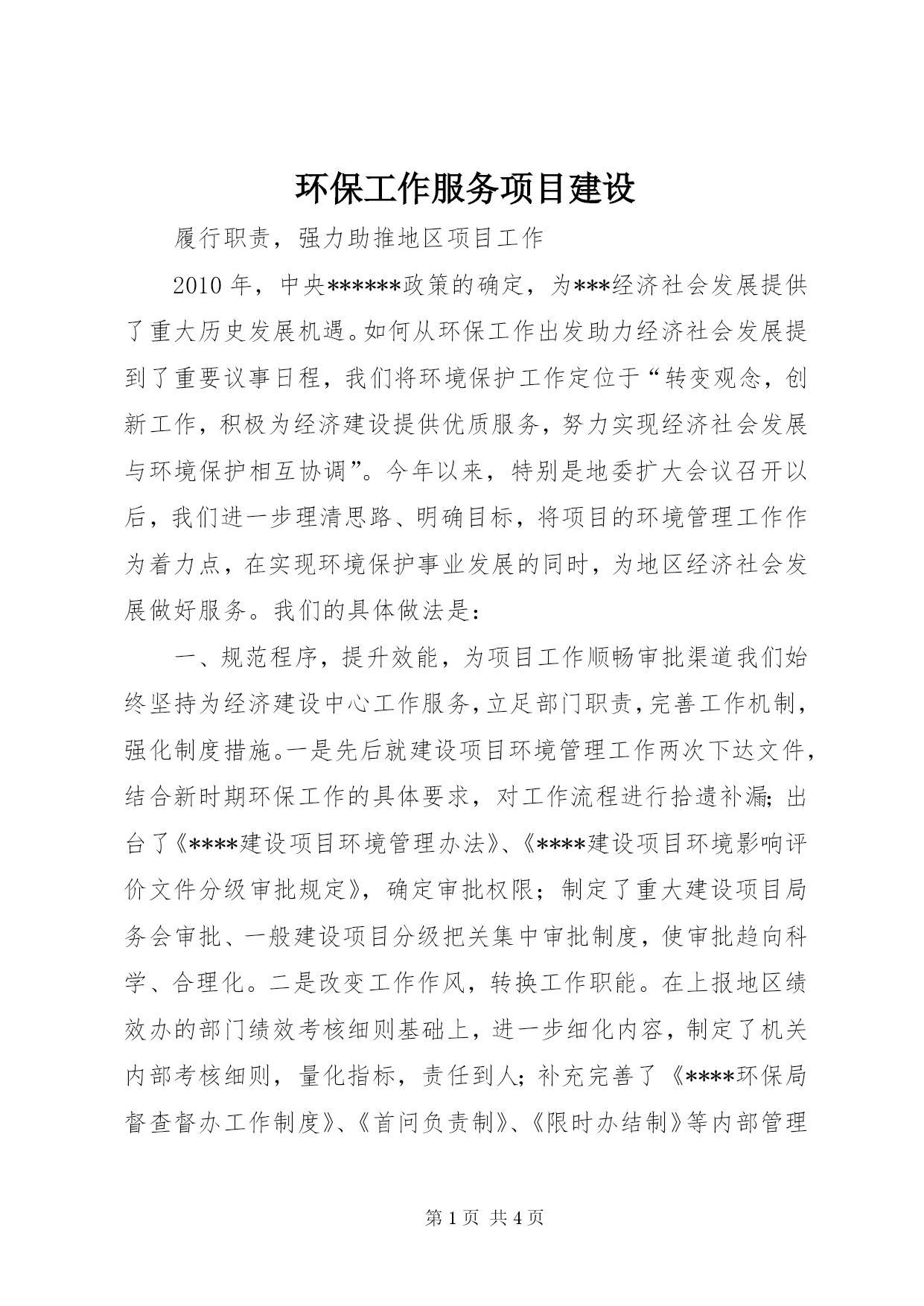 第PAGE\*Arabic\*MERGEFORMAT4页共NUMPAGES\*MERGEFORMAT4页环保工作服务项目建设履行职责,强力助推地区项目工作2010年,中央******政策的确定,为***经济社会发展提供了重大历史发展机遇。如何从环保工作出发助力经济社会发展提到了重要议事日程,我们将环境保护工作定位于“转变观念,创新工作,积极为经济建设提供优质服务,努力实现经济社会发展与环境保护相互协调”。今年以来,特别是地委扩大会议召开以后,我们进一步理清思路、明确目标,将项目的环境管理工作作为着力点,在实现环境保护事业发展的同时,为地区经济社会发展做好服务。我们的具体做法是:一、规范程序,提升效能,为项目工作顺畅审批渠道我们始终坚持为经济建设中心工作服务,立足部门职责,完善工作机制,强化制度措施。一是先后就建设项目环境管理工作两次下达文件,结合新时期环保工作的具体要求,对工作流程进行拾遗补漏;出台了《****建设项目环境管理办法》、《****建设项目环境影响评价文件分级审批规定》,确定审批权限;制定了重大建设项目局务会审批、一般建设项目分级把关集中审批制度,使审批趋向科学、合理化。二是改变工作作风,转换工作职能。在上报地区绩效办的部门绩效考核细则基础上,进一步细化内容,制定了机关内部考核细则,量化指标,责任到人;补充完善了《****环保局督查督办工作制度》、《首问负责制》、《限时办结制》等内部管理制度,工作作风不断改良,工作效率不断提高,顺利完成了管理向服务的职能转换。三是实行政务公开,主动接受监督。统一制作了工作桌牌、胸牌、人员去向牌,挂牌上岗;印制了《政务公开办事指南》,主动向社会、管理对象发放、领取;将办事程序、收费标准、办理时限、行政决策等一系列事项在网站媒体、办公地点上公布,接受监督。四是设立了建设项目审批绿色通道,将事关改善民生、增加农牧民及弱势群体收入、地区资源转化战略、节能减排、基础设施的建设项目列为绿色通道项目,本着特事特办、急事快办的原则,实行区别对待,将审批时限在法定时限的基础上缩短至三分之一,同时,加强与其他审批部门的联系,尽可能实现多管齐下、同步进行,在去年审批的富民兴边3个水利建设项目中,平均审批时间均在3日以内。通过狠抓措施落实,简化了审批程序,减少了审批环节,为经济建设提供便利服务的能力进一步强化。二、主动出击,早作准备,为项目工作做好申报准备我们以项目工作的基础是储备,关键在跑办为指导,掌握主动,积极开展工作。首先,我们对“十二五”期间的各项工作提前进行谋划,安排部署了农村环保、污染治理、生态建设与保护等专项规划的编制,并将这一类项目的收集、梳理贯穿规划编制全过程,积极筹建了项目库,实现规划实施与项目申报同步,同时,对项目进行筛选、把关,安排专人对项目申报进行培训、审查,提高申报质量和准确率。其次,我们建立了领导干部项目包干制度,按照职责分工,对地区经济社会、行业、部门具有重大影响的项目,由分管领导亲自负责沟通衔接,近年来,先后为****、****、***化、***、***等企业前往**区相关厅局协调;为加快农村环境保护工作步伐,成功申报国家级、****级环境优美乡镇、环境综合整治项目近20个,累计争取资金1000余万元;为加强环境保护部门能力建设,多次向国家部委、****厅局汇报,实现地区申报项目全额落地,争取资金2300余万元,接近总额的50%。三、强化监管,依法行政,为项目工作提供持续服务我们牢固树立环境容量是有限资源这一理念,科学合理分配,为项目工作可持续腾出更大发展空间。为此,一方面我们坚持严格把关,实现源头控制。时刻把握“三个绝不审批”原则,即超区域污染物总量的项目绝不审批、违反国家产业政策的项目绝不审批、涉嫌污染转移的项目绝不审批。另一方面坚持“审、查、验三管齐下”的管理路线,即审批中,建立部门联动机制,不允许违规项目过关;查处中,结合工程建设领域专项整治,不允许未批先建“黑项目”藏身;验收中,不允许未落实“三同时”项目竣工。通过强化“环评”、“三同时”制度落实,环境因素作为项目前置条件的意识不断加强,环境容量得到有效利用。同时,我们加强了污染治理工作,“向治理要容量”。一方面,对拒不采取治理的项目坚决依法予以处理;另一方面,积极为主动承担治理任务的项目争取资金支持,发挥示范效应,为在污染治理方面做出突出贡献的***糖业食品有限责任公司等一批企业项目争取国家专项补助资金1200余万元。通过防治措施的有效结合,环境容量不断得以开发,项目快速、顺利落地的可能性不断增大。四、扎实开展基础工作,为项目工作做好参谋项目工作的开展遵循****确立的“环保优先、生态立区”的发展理念,坚持“资源开发可持续、生态环境可持续”的发展道路,必然要以环境因素作为先决条件。为此
