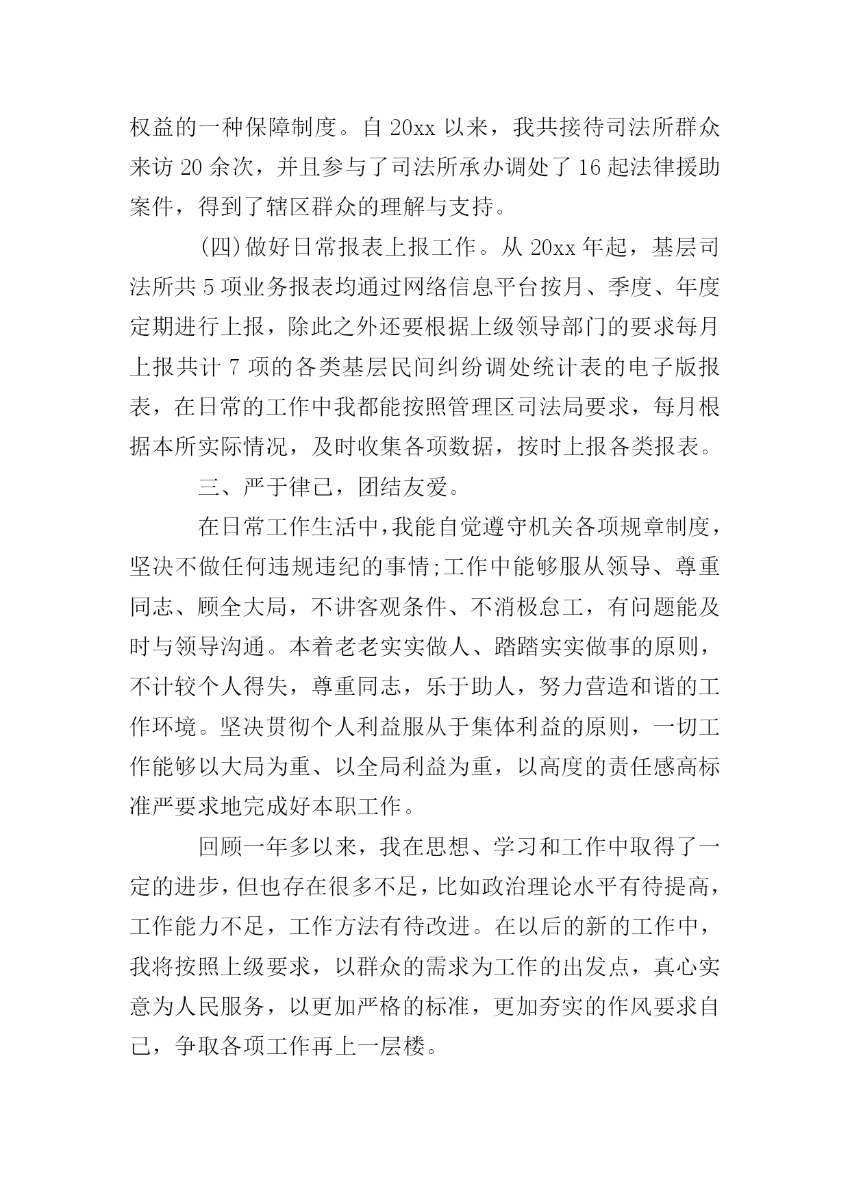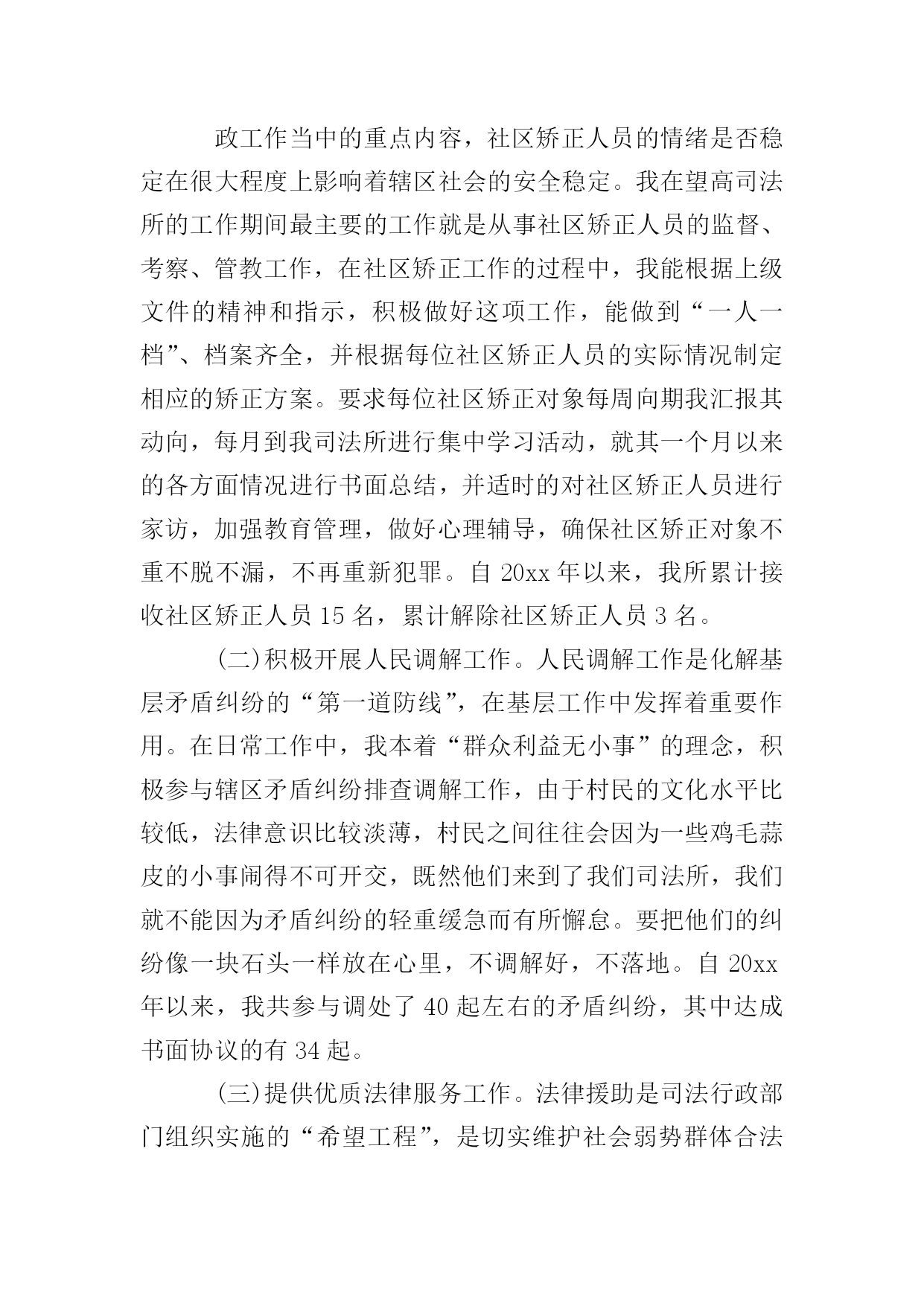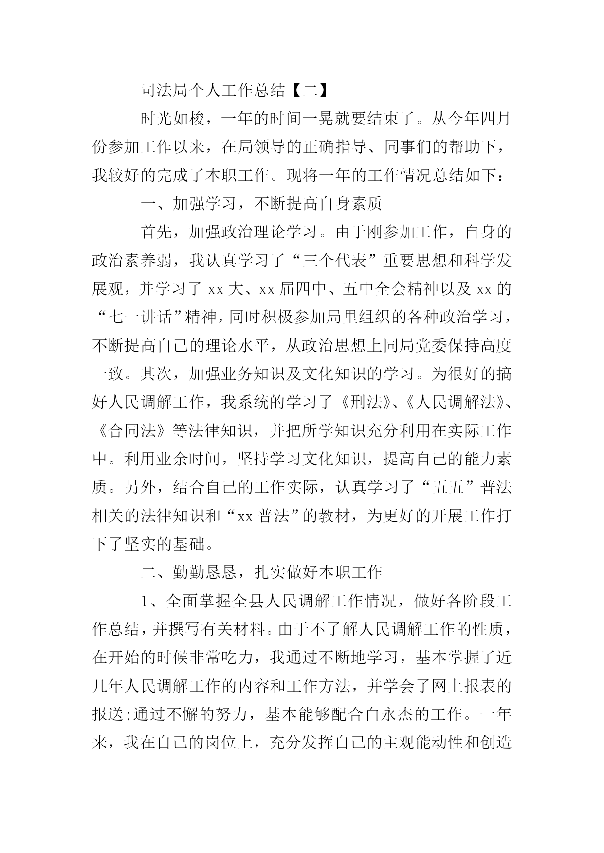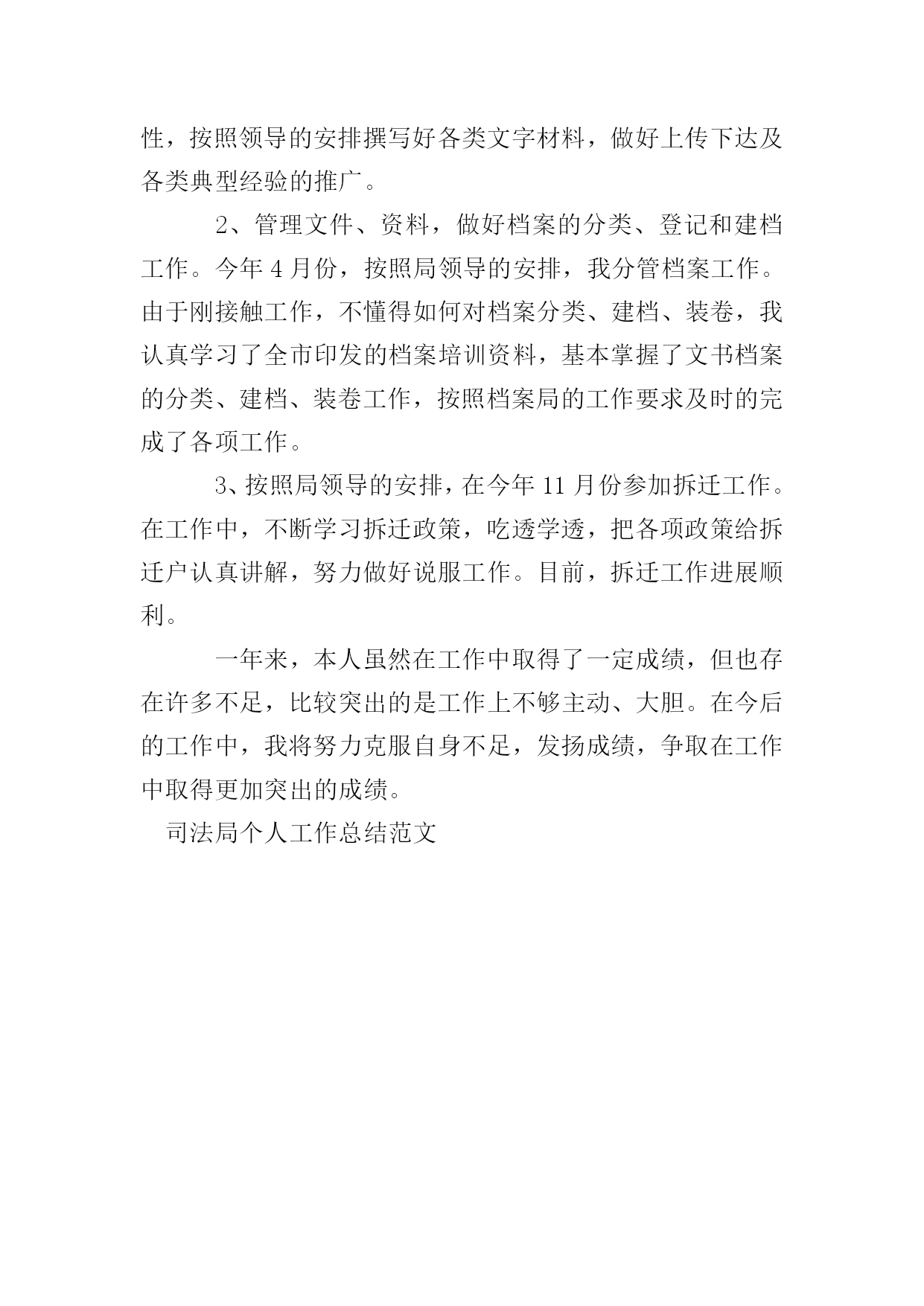司法局个人工作总结范文司法局个人工作总结【一】在xx司法所工作的这段时间里,在管理区司法局、xx镇党委的正确领导下,我按照所在岗位的职责要求,自觉服从各项工作安排,扎实工作,圆满完成了各项工作任务。现将两年来的学习、工作情况汇报如下:一、加强学习,提高素质。要做好新形势下司法行政的各项工作,就必须主动加强学习,不断提高自身素质和工作水平。(一)加强政治理论学习,提高思想政治素质。在日常的工作、生活中,我能以科学发展观为统领,根据实际工作需要积极主动学习党的各项路线方针政策,提高自己的思想政治素质,深刻领会基层司法工作者的重要地位,理清工作思路,鼓足干事劲头。(二)加强业务知识学习,提高工作水平。除了参加管理区司法局组织的业务培训学习之余,我还能根据自己岗位职责和工作性质的要求,我能利用空闲时间了解、学习与实际工作中密切相关的法律法规。通过学习,为自己更好的胜任本职工作奠定坚实的基础。二、抓好业务,认真工作。在xx司法所的直接领导下,我能服从安排,认真对待工作,全面完成各项任务。(一)努力抓好社区矫正工作。社区矫正是当前基层司法行政工作当中的重点内容,社区矫正人员的情绪是否稳定在很大程度上影响着辖区社会的安全稳定。我在望高司法所的工作期间最主要的工作就是从事社区矫正人员的监督、考察、管教工作,在社区矫正工作的过程中,我能根据上级文件的精神和指示,积极做好这项工作,能做到“一人一档”、档案齐全,并根据每位社区矫正人员的实际情况制定相应的矫正方案。要求每位社区矫正对象每周向期我汇报其动向,每月到我司法所进行集中学习活动,就其一个月以来的各方面情况进行书面总结,并适时的对社区矫正人员进行家访,加强教育管理,做好心理辅导,确保社区矫正对象不重不脱不漏,不再重新犯罪。自20xx年以来,我所累计接收社区矫正人员15名,累计解除社区矫正人员3名。(二)积极开展人民调解工作。人民调解工作是化解基层矛盾纠纷的“第一道防线”,在基层工作中发挥着重要作用。在日常工作中,我本着“群众利益无小事”的理念,积极参与辖区矛盾纠纷排查调解工作,由于村民的文化水平比较低,法律意识比较淡薄,村民之间往往会因为一些鸡毛蒜皮的小事闹得不可开交,既然他们来到了我们司法所,我们就不能因为矛盾纠纷的轻重缓急而有所懈怠。要把他们的纠纷像一块石头一样放在心里,不调解好,不落地。自20xx年以来,我共参与调处了40起左右的矛盾纠纷,其中达成书面协议的有34起。(三)提供优质法律服务工作。法律援助是司法行政部门组织实施的“希望工程”,是切实维护社会弱势群体合法权益的一种保障制度。自20xx以来,我共接待司法所群众来访20余次,并且参与了司法所承办调处了16起法律援助案件,得到了辖区群众的理解与支持。(四)做好日常报表上报工作。从20xx年起,基层司法所共5项业务报表均通过网络信息平台按月、季度、年度定期进行上报,除此之外还要根据上级领导部门的要求每月上报共计7项的各类基层民间纠纷调处统计表的电子版报表,在日常的工作中我都能按照管理区司法局要求,每月根据本所实际情况,及时收集各项数据,按时上报各类报表。三、严于律己,团结友爱。在日常工作生活中,我能自觉遵守机关各项规章制度,坚决不做任何违规违纪的事情;工作中能够服从领导、尊重同志、顾全大局,不讲客观条件、不消极怠工,有问题能及时与领导沟通。本着老老实实做人、踏踏实实做事的原则,不计较个人得失,尊重同志,乐于助人,努力营造和谐的工作环境。坚决贯彻个人利益服从于集体利益的原则,一切工作能够以大局为重、以全局利益为重,以高度的责任感高标准严要求地完成好本职工作。回顾一年多以来,我在思想、学习和工作中取得了一定的进步,但也存在很多不足,比如政治理论水平有待提高,工作能力不足,工作方法有待改进。在以后的新的工作中,我将按照上级要求,以群众的需求为工作的出发点,真心实意为人民服务,以更加严格的标准,更加夯实的作风要求自己,争取各项工作再上一层楼。司法局个人工作总结【二】时光如梭,一年的时间一晃就要结束了。从今年四月份参加工作以来,在局领导的正确指导、同事们的帮助下,我较好的完成了本职工作。现将一年的工作情况总结如下:一、加强学习,不断提高自身素质首先,加强政治理论学习。由于刚参加工作,自身的政治素养弱,我认真学习了“三个代表”重要思想和科学发展观,并学习了xx大、xx届四中、五中全会精神以及xx的“七一讲话”精神,同时积极参加局里组织的各种政治学习,不断提高自己的理论水平,从政治思想上同局党委保持高度一致。其次,加强业务知识及文化知识的学习。为很好的搞好人民调解工作,我系统的学习了《刑法》、《人民调解法》、《合同法》等法律知识,并把所学知识充分利用在实际工作中。利用业余