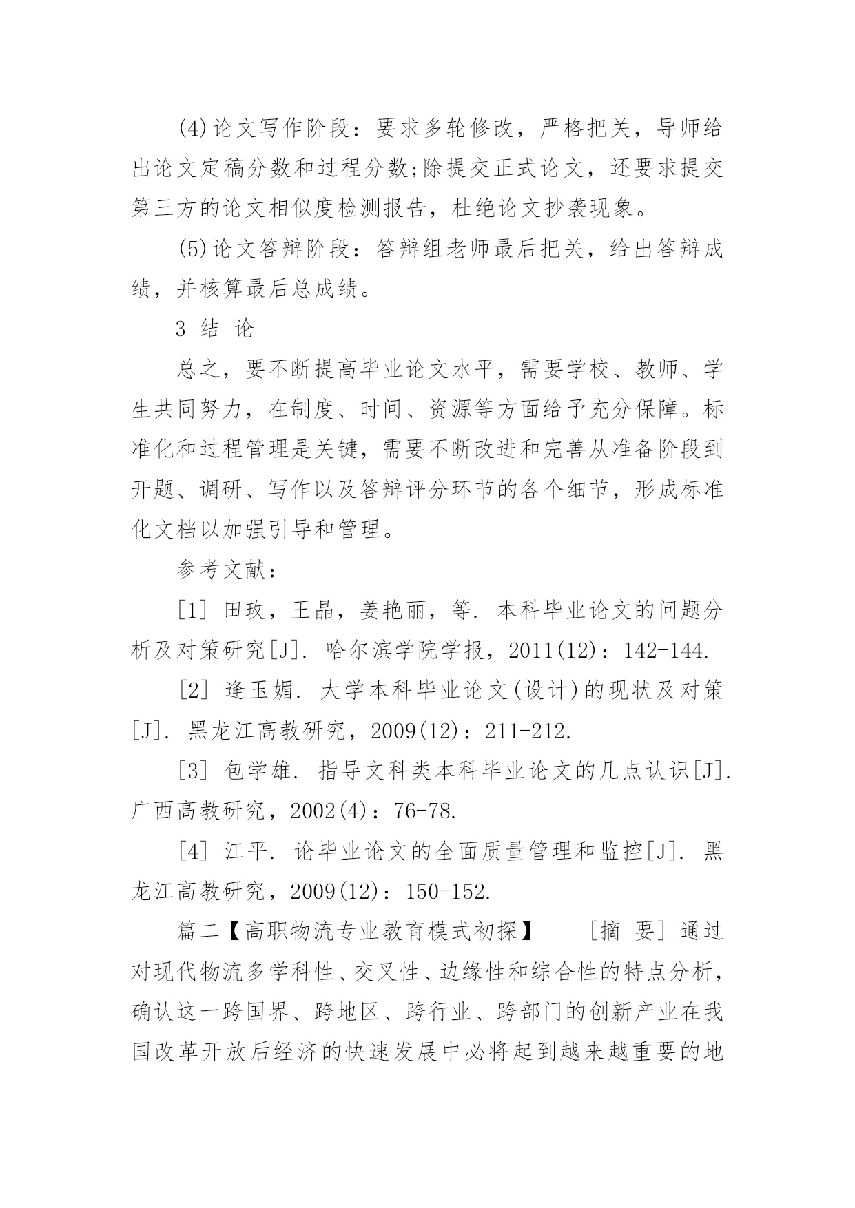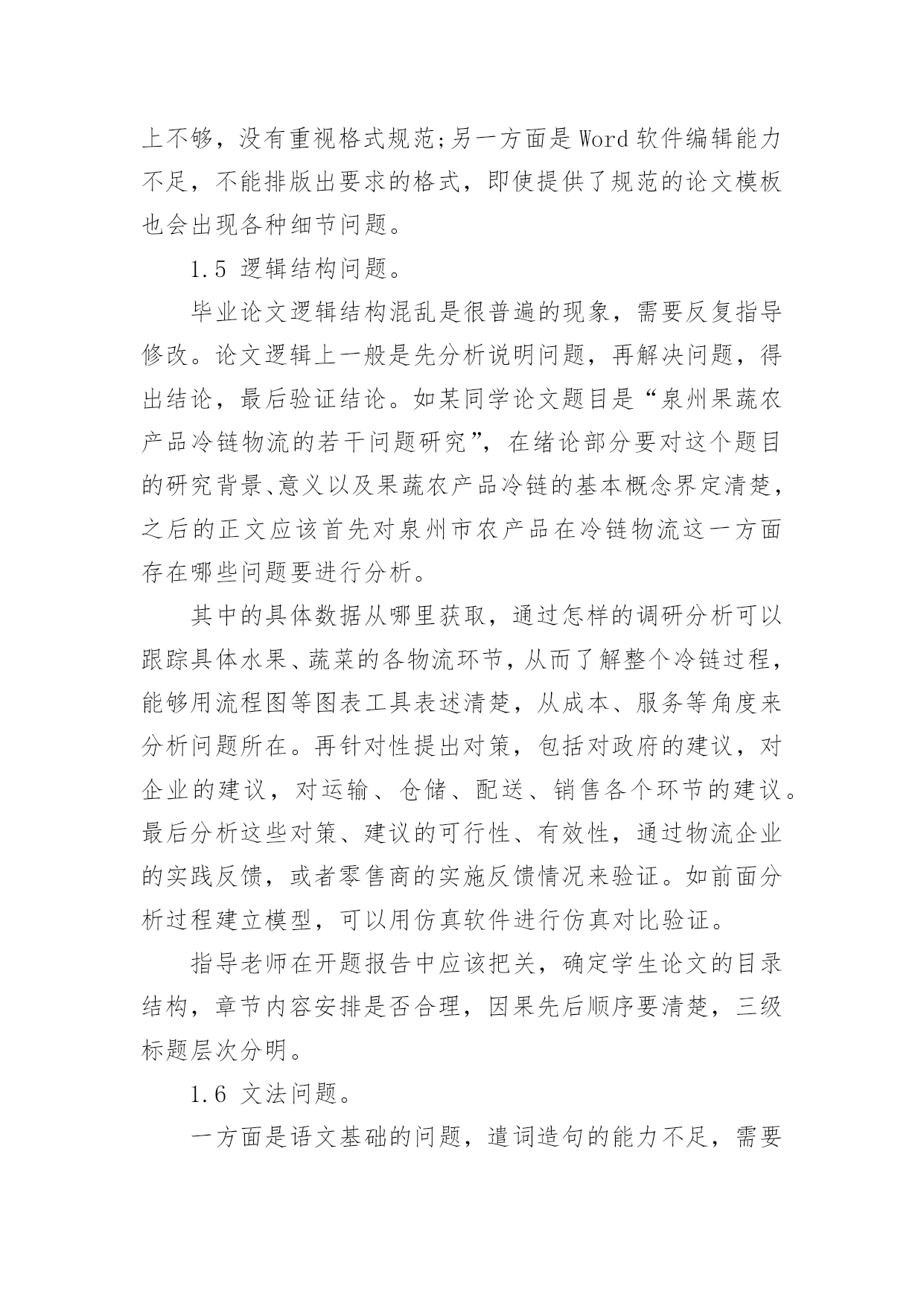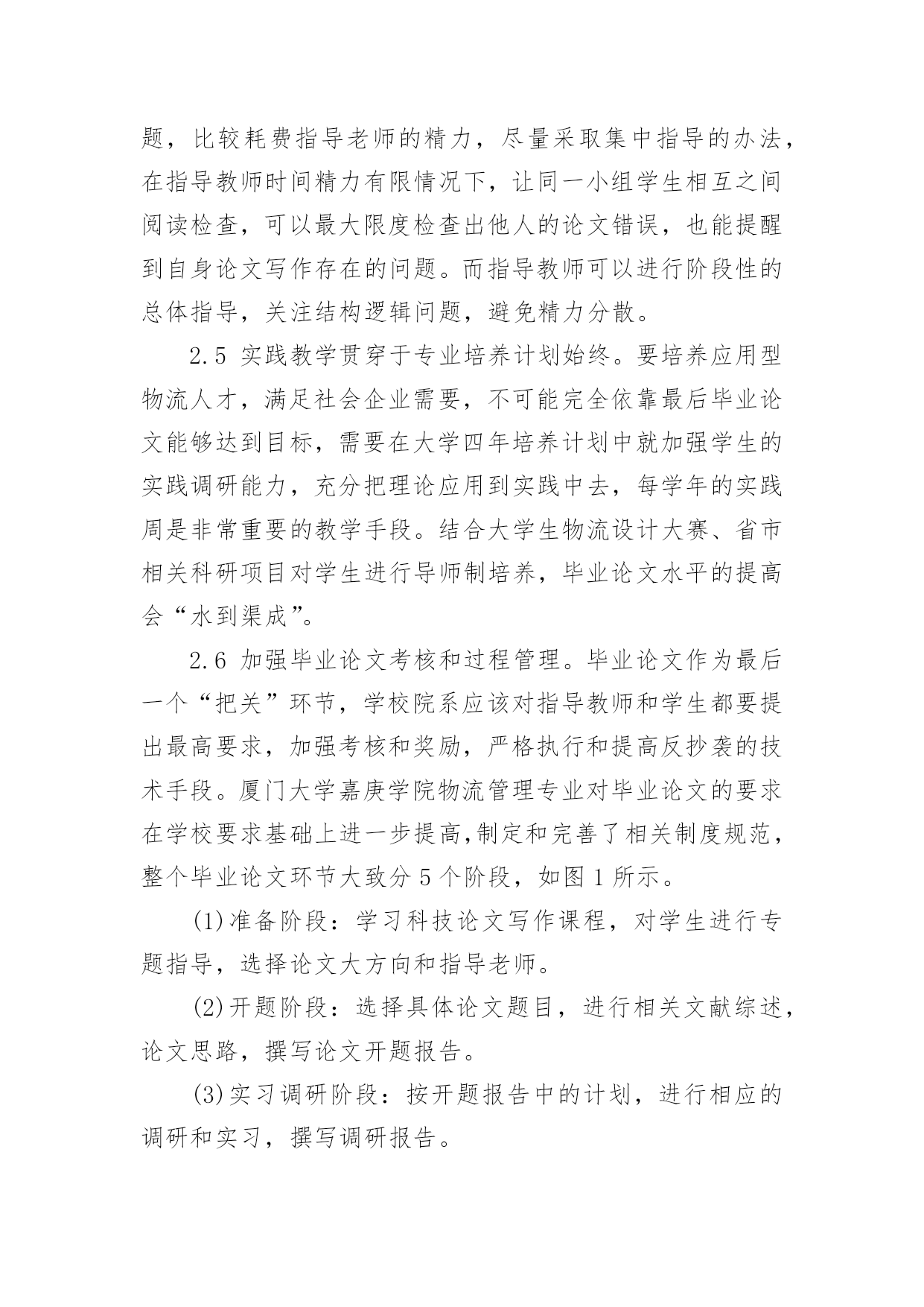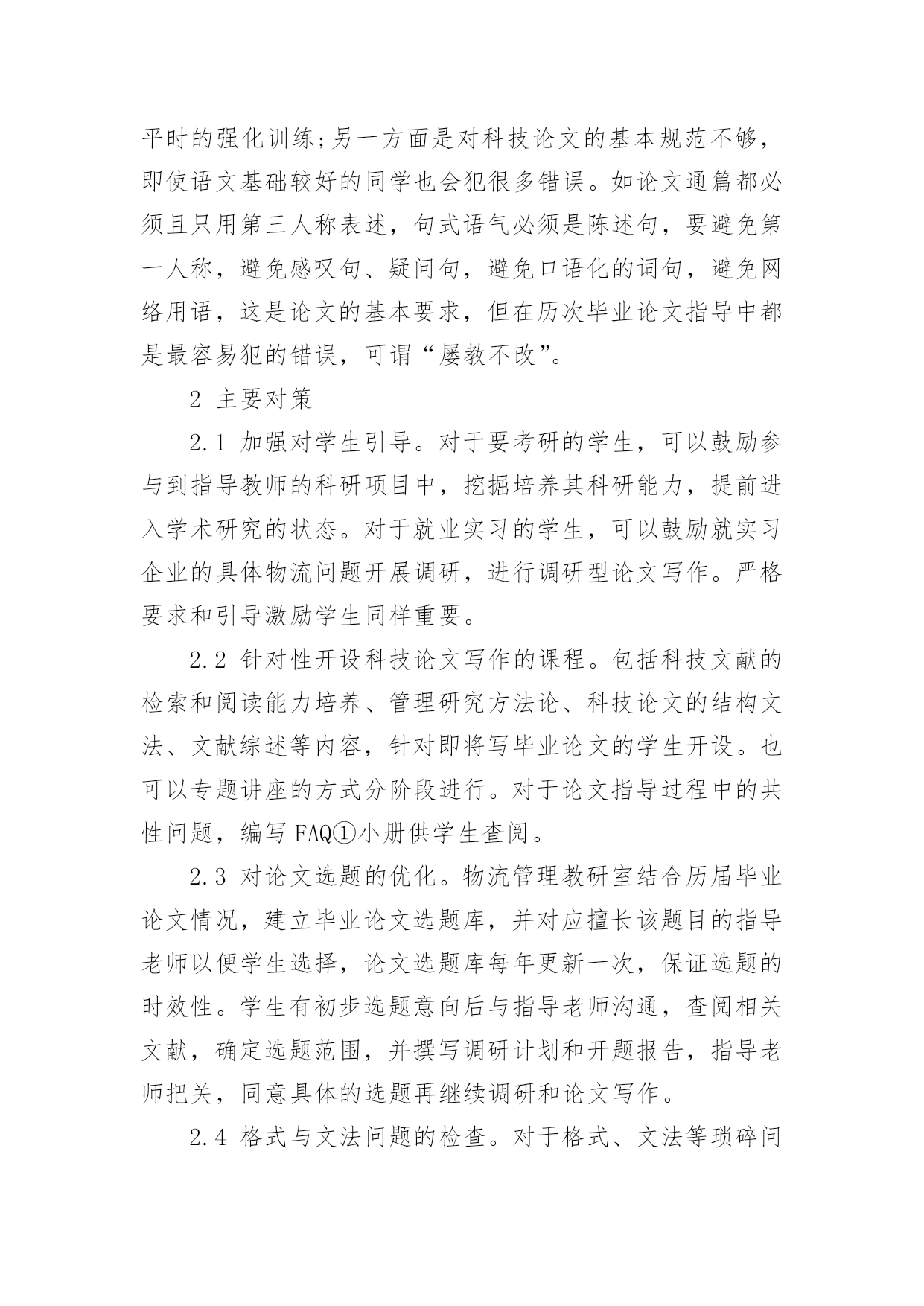 物流就业指导论文物流就业指导论文想要把一篇论文写好,一定要多花心思五查阅资料。下面是小编为大家搜集整理出来的有关于物流就业指导论文,希望可以帮助到大家!篇一:物流就业指导论文摘要:毕业论文是本科教育质量工程的重要环节,毕业论文质量是检验学生专业综合能力、衡量教学质量的重要标准之一。文章通过分析和总结在指导物流管理专业学生的本科论文写作过程中发现的主要问题,提出加强过程管理为主的对策,以提升论文和教学质量。关键词:物流管理专业;本科毕业论文;问题;对策中图分类号:G642文献标识码:A本科毕业论文作为学生毕业前最后一个教学环节,能够检验学生综合应用专业理论、基本技能、独立完成工作,分析解决实际问题的能力,也是学生取得毕业和学位资格的重要依据。毕业论文的水平反映了学生本科四年学习的基本情况,也展示了学校教学水平高低。毕业论文指导过程应该起到引导学生和提高水平的作用。物流管理专业在管理类专业中属于新兴专业,毕业论文对学生的应用能力要求更高。笔者结合在历届毕业论文教学指导中发现的一些问题,对如何提高物流管理专业毕业论文质量进行探讨。1毕业论文存在的问题1.1认识偏差问题。学生对毕业论文的认识高度很大程度决定了最终毕业论文的水平高低。大四学生面临就业、实习、考研等问题,部分学生认为毕业论文没有实际用途,不愿花费太多时间和精力写论文。大多用人单位只关注毕业生平时学习成绩而忽视了毕业论文,使学生产生功利心而忽视毕业论文。认识不足就会导致学生态度上应付,以至于抄袭、代写等非常严重的问题发生。所以引导学生正确认识毕业论文的重要性,调整论文写作动机是首要任务。1.2文献综述问题。不少学生的文献检索的能力比较欠缺,没有充分阅读相关文献,对题目的理解就容易出现偏差。文献阅读和综述应该放在开题报告前,做好了充分的调研和阅读,才可能对论文要研究和解决的问题有充分认识。1.3选题空泛的问题。本科毕业论文选题应该符合本专业培养方案要求,应该具有一定的实践价值或者理论价值,要有一定的可行性。综合考虑学生的专业兴趣、能力因素,结合实习经历等各种因素,找到合适的备选题目,再和指导老师斟酌确定具体的题目。最常见的问题是题目太大,泛泛而谈,应该提倡“小题大做”,要求初步调研之后再确定具体选题。1.4格式规范问题。格式问题在学生毕业论文中非常常见,一方面因为认识上不够,没有重视格式规范;另一方面是Word软件编辑能力不足,不能排版出要求的格式,即使提供了规范的论文模板也会出现各种细节问题。1.5逻辑结构问题。毕业论文逻辑结构混乱是很普遍的现象,需要反复指导修改。论文逻辑上一般是先分析说明问题,再解决问题,得出结论,最后验证结论。如某同学论文题目是“泉州果蔬农产品冷链物流的若干问题研究”,在绪论部分要对这个题目的研究背景、意义以及果蔬农产品冷链的基本概念界定清楚,之后的正文应该首先对泉州市农产品在冷链物流这一方面存在哪些问题要进行分析。其中的具体数据从哪里获取,通过怎样的调研分析可以跟踪具体水果、蔬菜的各物流环节,从而了解整个冷链过程,能够用流程图等图表工具表述清楚,从成本、服务等角度来分析问题所在。再针对性提出对策,包括对政府的建议,对企业的建议,对运输、仓储、配送、销售各个环节的建议。最后分析这些对策、建议的可行性、有效性,通过物流企业的实践反馈,或者零售商的实施反馈情况来验证。如前面分析过程建立模型,可以用仿真软件进行仿真对比验证。指导老师在开题报告中应该把关,确定学生论文的目录结构,章节内容安排是否合理,因果先后顺序要清楚,三级标题层次分明。1.6文法问题。一方面是语文基础的问题,遣词造句的能力不足,需要平时的强化训练;另一方面是对科技论文的基本规范不够,即使语文基础较好的同学也会犯很多错误。如论文通篇都必须且只用第三人称表述,句式语气必须是陈述句,要避免第一人称,避免感叹句、疑问句,避免口语化的词句,避免网络用语,这是论文的基本要求,但在历次毕业论文指导中都是最容易犯的错误,可谓“屡教不改”。2主要对策2.1加强对学生引导。对于要考研的学生,可以鼓励参与到指导教师的科研项目中,挖掘培养其科研能力,提前进入学术研究的状态。对于就业实习的学生,可以鼓励就实习企业的具体物流问题开展调研,进行调研型论文写作。严格要求和引导激励学生同样重要。2.2针对性开设科技论文写作的课程。包括科技文献的检索和阅读能力培养、管理研究方法论、科技论文的结构文法、文献综述等内容,针对即将写毕业论文的学生开设。也可以专题讲座的方式分阶段进行。对于论文指导过程中的共性问题,编写FAQ①小册供学生查阅。2.3对论文选题的优化。物流管理教研室结合历届毕业论文情况,建立毕业论文选题库,并对应擅长该题目的指导老师以便学生选择,论文选题库每年更新一次,保证选题的时效性。学生有初步选题意向后与指导老师