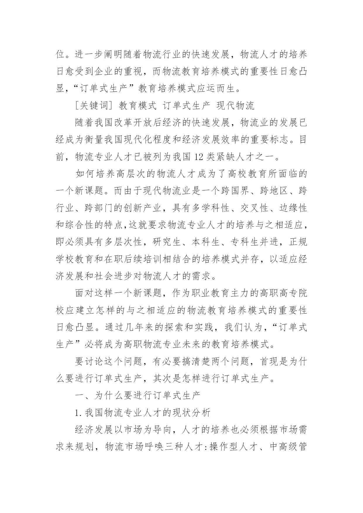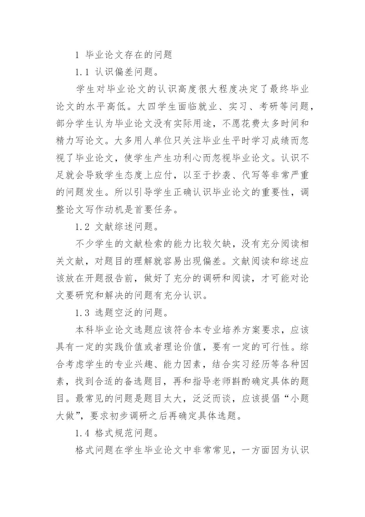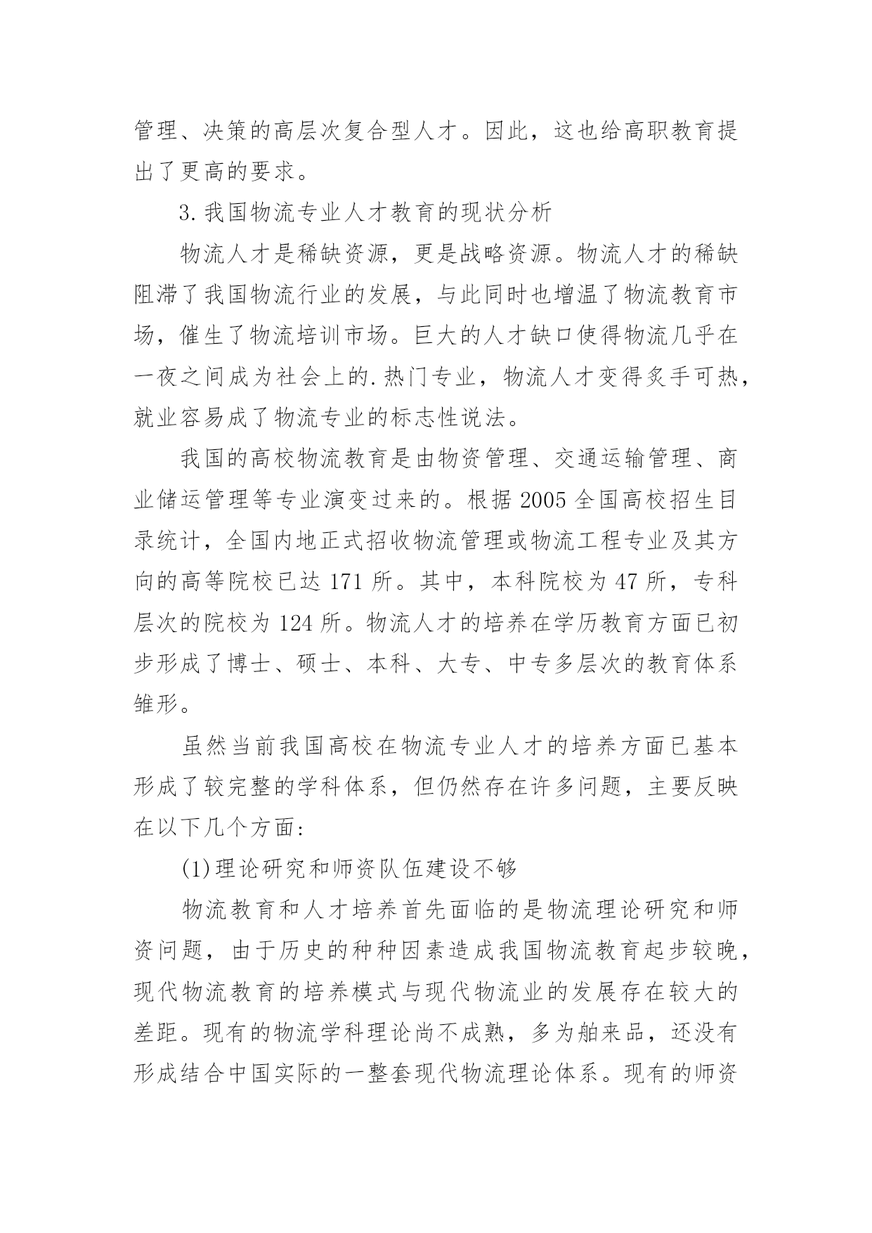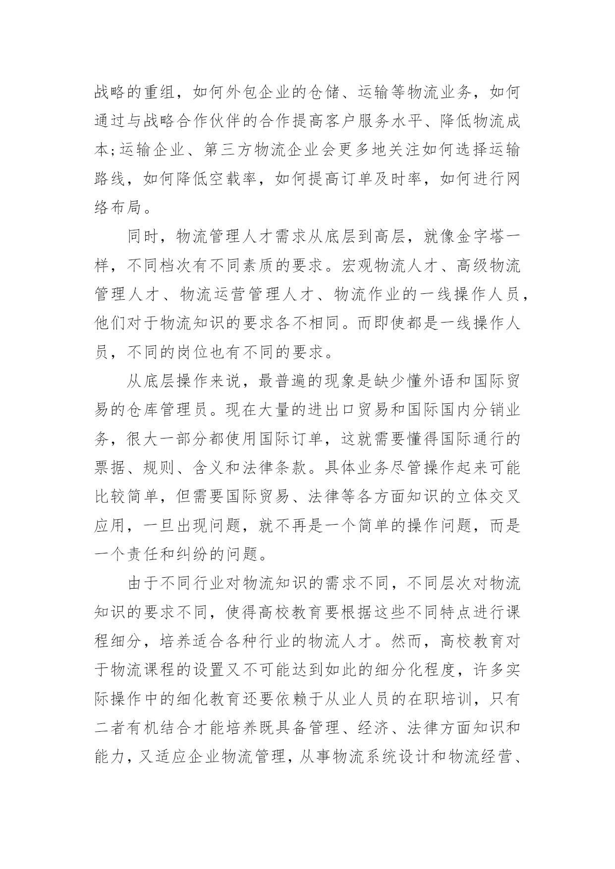 物流就业指导论文物流就业指导论文想要把一篇论文写好,一定要多花心思五查阅资料。下面是小编为大家搜集整理出来的有关于物流就业指导论文,希望可以帮助到大家!篇一:物流就业指导论文摘要:毕业论文是本科教育质量工程的重要环节,毕业论文质量是检验学生专业综合能力、衡量教学质量的重要标准之一。文章通过分析和总结在指导物流管理专业学生的本科论文写作过程中发现的主要问题,提出加强过程管理为主的对策,以提升论文和教学质量。关键词:物流管理专业;本科毕业论文;问题;对策中图分类号:G642文献标识码:A本科毕业论文作为学生毕业前最后一个教学环节,能够检验学生综合应用专业理论、基本技能、独立完成工作,分析解决实际问题的能力,也是学生取得毕业和学位资格的重要依据。毕业论文的水平反映了学生本科四年学习的基本情况,也展示了学校教学水平高低。毕业论文指导过程应该起到引导学生和提高水平的作用。物流管理专业在管理类专业中属于新兴专业,毕业论文对学生的应用能力要求更高。笔者结合在历届毕业论文教学指导中发现的一些问题,对如何提高物流管理专业毕业论文质量进行探讨。1毕业论文存在的问题1.1认识偏差问题。学生对毕业论文的认识高度很大程度决定了最终毕业论文的水平高低。大四学生面临就业、实习、考研等问题,部分学生认为毕业论文没有实际用途,不愿花费太多时间和精力写论文。大多用人单位只关注毕业生平时学习成绩而忽视了毕业论文,使学生产生功利心而忽视毕业论文。认识不足就会导致学生态度上应付,以至于抄袭、代写等非常严重的问题发生。所以引导学生正确认识毕业论文的重要性,调整论文写作动机是首要任务。1.2文献综述问题。不少学生的文献检索的能力比较欠缺,没有充分阅读相关文献,对题目的理解就容易出现偏差。文献阅读和综述应该放在开题报告前,做好了充分的调研和阅读,才可能对论文要研究和解决的问题有充分认识。1.3选题空泛的问题。本科毕业论文选题应该符合本专业培养方案要求,应该具有一定的实践价值或者理论价值,要有一定的可行性。综合考虑学生的专业兴趣、能力因素,结合实习经历等各种因素,找到合适的备选题目,再和指导老师斟酌确定具体的题目。最常见的问题是题目太大,泛泛而谈,应该提倡“小题大做”,要求初步调研之后再确定具体选题。1.4格式规范问题。格式问题在学生毕业论文中非常常见,一方面因为认识上不够,没有重视格式规范;另一方面是Word软件编辑能力不足,不能排版出要求的格式,即使提供了规范的论文模板也会出现各种细节问题。1.5逻辑结构问题。毕业论文逻辑结构混乱是很普遍的现象,需要反复指导修改。论文逻辑上一般是先分析说明问题,再解决问题,得出结论,最后验证结论。如某同学论文题目是“泉州果蔬农产品冷链物流的若干问题研究”,在绪论部分要对这个题目的研究背景、意义以及果蔬农产品冷链的基本概念界定清楚,之后的正文应该首先对泉州市农产品在冷链物流这一方面存在哪些问题要进行分析。其中的具体数据从哪里获取,通过怎样的调研分析可以跟踪具体水果、蔬菜的各物流环节,从而了解整个冷链过程,能够用流程图等图表工具表述清楚,从成本、服务等角度来分析问题所在。再针对性提出对策,包括对政府的建议,对企业的建议,对运输、仓储、配送、销售各个环节的建议。最后分析这些对策、建议的可行性、有效性,通过物流企业的实践反馈,或者零售商的实施反馈情况来验证。如前面分析过程建立模型,可以用仿真软件进行仿真对比验证。指导老师在开题报告中应该把关,确定学生论文的目录结构,章节内容安排是否合理,因果先后顺序要清楚,三级标题层次分明。1.6文法问题。一方面是语文基础的问题,遣词造句的能力不足,需要平时的强化训练;另一方面是对科技论文的基本规范不够,即使语文基础较好的同学也会犯很多错误。如论文通篇都必须且只用第三人称表述,句式语气必须是陈述句,要避免第一人称,避免感叹句、疑问句,避免口语化的词句,避免网络用语,这是论文的基本要求,但在历次毕业论文指导中都是最容易犯的错误,可谓“屡教不改”。2主要对策2.1加强对学生引导。对于要考研的学生,可以鼓励参与到指导教师的科研项目中,挖掘培养其科研能力,提前进入学术研究的状态。对于就业实习的学生,可以鼓励就实习企业的具体物流问题开展调研,进行调研型论文写作。严格要求和引导激励学生同样重要。2.2针对性开设科技论文写作的课程。包括科技文献的检索和阅读能力培养、管理研究方法论、科技论文的结构文法、文献综述等内容,针对即将写毕业论文的学生开设。也可以专题讲座的方式分阶段进行。对于论文指导过程中的共性问题,编写FAQ①小册供学生查阅。2.3对论文选题的优化。物流管理教研室结合历届毕业论文情况,建立毕业论文选题库,并对应擅长该题目的指导老师以便学生选择,论文选题库每年更新一次,保证选题的时效性。学生有初步选题意向后与指导老师