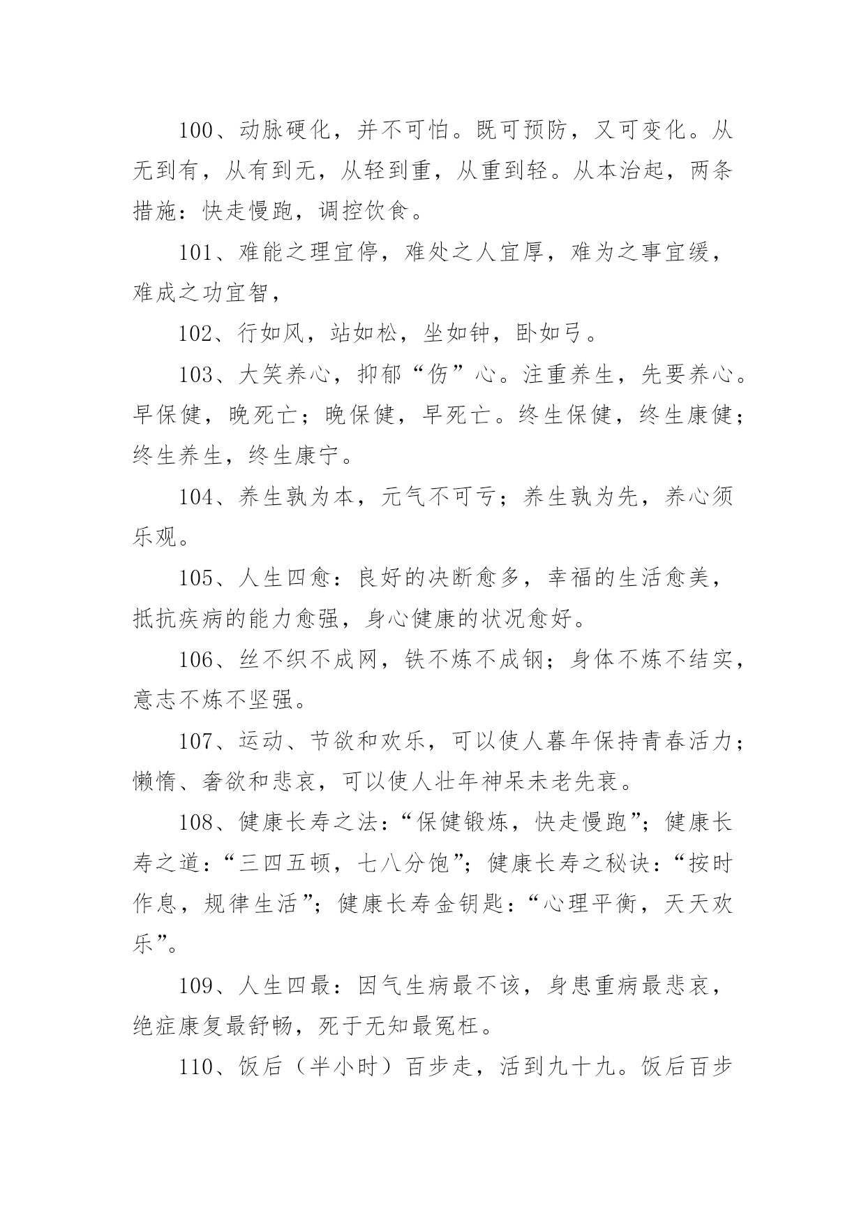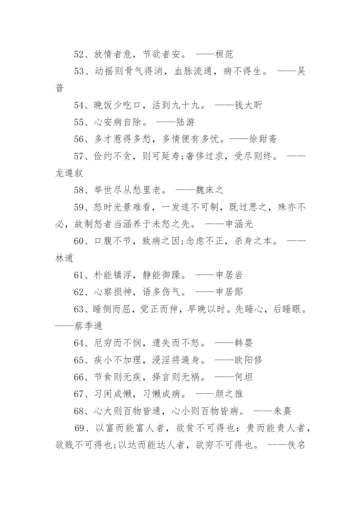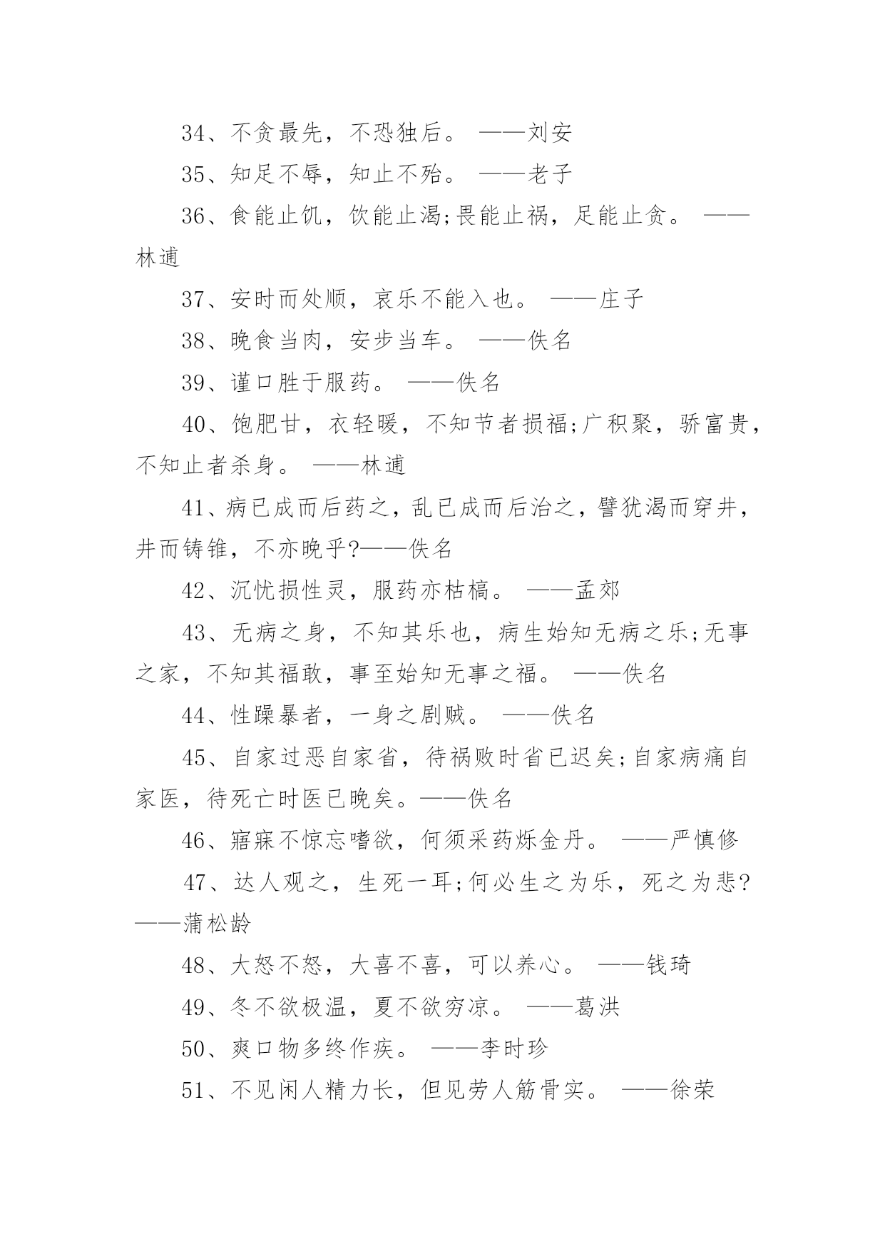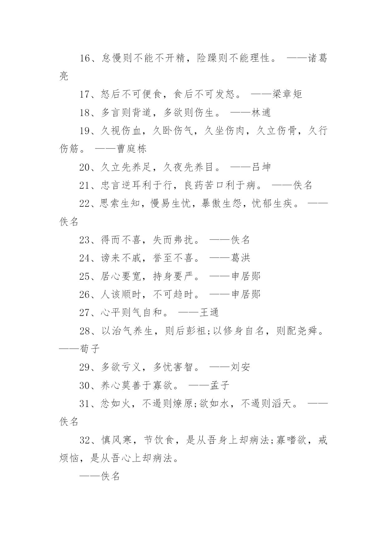 健康养生格言健康养生格言(通用230句)在日常学习、工作抑或是生活中,大家或多或少都接触过一些经典的格言吧,每句格言代表了不同的意义,它是人生的精华,是我们前进的动力,是我们努力的目标。还苦于找不到好的格言?以下是小编为大家整理的健康养生格言(通用230句),欢迎大家借鉴与参考,希望对大家有所帮助。1、食不语,寝不言。——佚名2、善养生者,若牧羊然;视其后者两鞭之。——庄子3、智者养生也,必须四时而调寒暑。——曹庭栋4、恼一恼,老一老;笑一笑,少一少。——佚名5、食欲数而少,又欲顿而多。——曹庭栋6、保生者寡欲,保身者避名。——林逋7、食能以时,身必无灾。——佚名8、吃饭先喝汤,不用请药方。——李光庭9、不欲极饥而食,食不过饱,不欲极渴而饮,饮不过多。——葛洪10、体欲常劳,食欲常少。——梁章矩11、食过则成积聚,饮过则成痰癖。——梁章矩12、食饮有节,起居有常。——梁章矩13、萝卜上了街,药方把嘴撅。——李光庭14、治已病,不若治未病。——曹庭栋15、树怕剥皮,人怕伤心。——李悝16、怠慢则不能不开精,险躁则不能理性。——诸葛亮17、怒后不可便食,食后不可发怒。——梁章矩18、多言则背道,多欲则伤生。——林逋19、久视伤血,久卧伤气,久坐伤肉,久立伤骨,久行伤筋。——曹庭栋20、久立先养足,久夜先养目。——吕坤21、忠言逆耳利于行,良药苦口利于病。——佚名22、思索生知,慢易生忧,暴傲生怨,忧郁生疾。——佚名23、得而不喜,失而弗扰。——佚名24、谤来不戚,誉至不喜。——葛洪25、居心要宽,持身要严。——申居郧26、人该顺时,不可趋时。——申居郧27、心平则气自和。——王通28、以治气养生,则后彭祖;以修身自名,则配尧舜。——荀子29、多欲亏义,多忧害智。——刘安30、养心莫善于寡欲。——孟子31、忿如火,不遏则燎原;欲如水,不遏则滔天。——佚名32、慎风寒,节饮食,是从吾身上却病法;寡嗜欲,戒烦恼,是从吾心上却病法。——佚名34、不贪最先,不恐独后。——刘安35、知足不辱,知止不殆。——老子36、食能止饥,饮能止渴;畏能止祸,足能止贪。——林逋37、安时而处顺,哀乐不能入也。——庄子38、晚食当肉,安步当车。——佚名39、谨口胜于服药。——佚名40、饱肥甘,衣轻暖,不知节者损福;广积聚,骄富贵,不知止者杀身。——林逋41、病已成而后药之,乱已成而后治之,譬犹渴而穿井,井而铸锥,不亦晚乎?——佚名42、沉忧损性灵,服药亦枯槁。——孟郊43、无病之身,不知其乐也,病生始知无病之乐;无事之家,不知其福敢,事至始知无事之福。——佚名44、性躁暴者,一身之剧贼。——佚名45、自家过恶自家省,待祸败时省已迟矣;自家病痛自家医,待死亡时医已晚矣。——佚名46、寤寐不惊忘嗜欲,何须采药烁金丹。——严慎修47、达人观之,生死一耳;何必生之为乐,死之为悲?——蒲松龄48、大怒不怒,大喜不喜,可以养心。——钱琦49、冬不欲极温,夏不欲穷凉。——葛洪50、爽口物多终作疾。——李时珍51、不见闲人精力长,但见劳人筋骨实。——徐荣52、放情者危,节欲者安。——桓范53、动摇则骨气得消,血脉流通,病不得生。——吴普54、晚饭少吃口,活到九十九。——钱大昕55、心安病自除。——陆游56、多才惹得多愁,多情便有多忧。——徐甜斋57、俭约不贪,则可延寿;奢侈过求,受尽则终。——龙遵叙58、举世尽从愁里老。——魏床之59、怒时光景难看,一发遂不可制,既过思之,殊亦不必,故制怒者当涵养于未怒之先。——申涵光60、口腹不节,致病之因;念虑不正,杀身之本。——林逋61、朴能镇浮,静能御躁。——申居岩62、心察损神,语多伤气。——申居郧63、睡侧而屈,觉正而伸,早晚以时。先睡心,后睡眼。——蔡季通64、厄穷而不悯,遗失而不怒。——韩婴65、疾小不加理,浸淫将遍身。——欧阳修66、节食则无疾,择言则无祸。——何坦67、习闲成懒,习懒成病。——颜之推68、心大则百物皆通,心小则百物皆病。——朱熹69、以富而能富人者,欲贫不可得也:贵而能贵人者,欲贱不可得也;以达而能达人者,欲穷不可得也。——佚名70、举世而誉之,而不加劝;举世而非之,而不加沮。——佚名71、不汲汲于富贵,不戚戚于贫贱。——佚名72、乐之方至,乐而弗骄;患之将至,思而弗忧。——佚名73、声色者败德之具,思虑者残存之本。——林逋74、吕祖谦想要有一个健康的身体,最好不要太过考虑身体的健康。——霍姆斯75、旷达的人长寿。——莎经亚76、“三吃”有益健康:吃“野”祛病健身、吃粗健康少病、吃“杂”营养平衡。77、你想变得年轻吗?跑步吧;你想变得健康吗?跑步吧;你想变得聪明吗?跑步吧;你想变得美丽吗?跑步吧。78、出汗不迎风,跑步莫凹胸。79、常开窗,透阳光;通空气,保健康。80、入厨先洗手,上灶莫多言。81、三