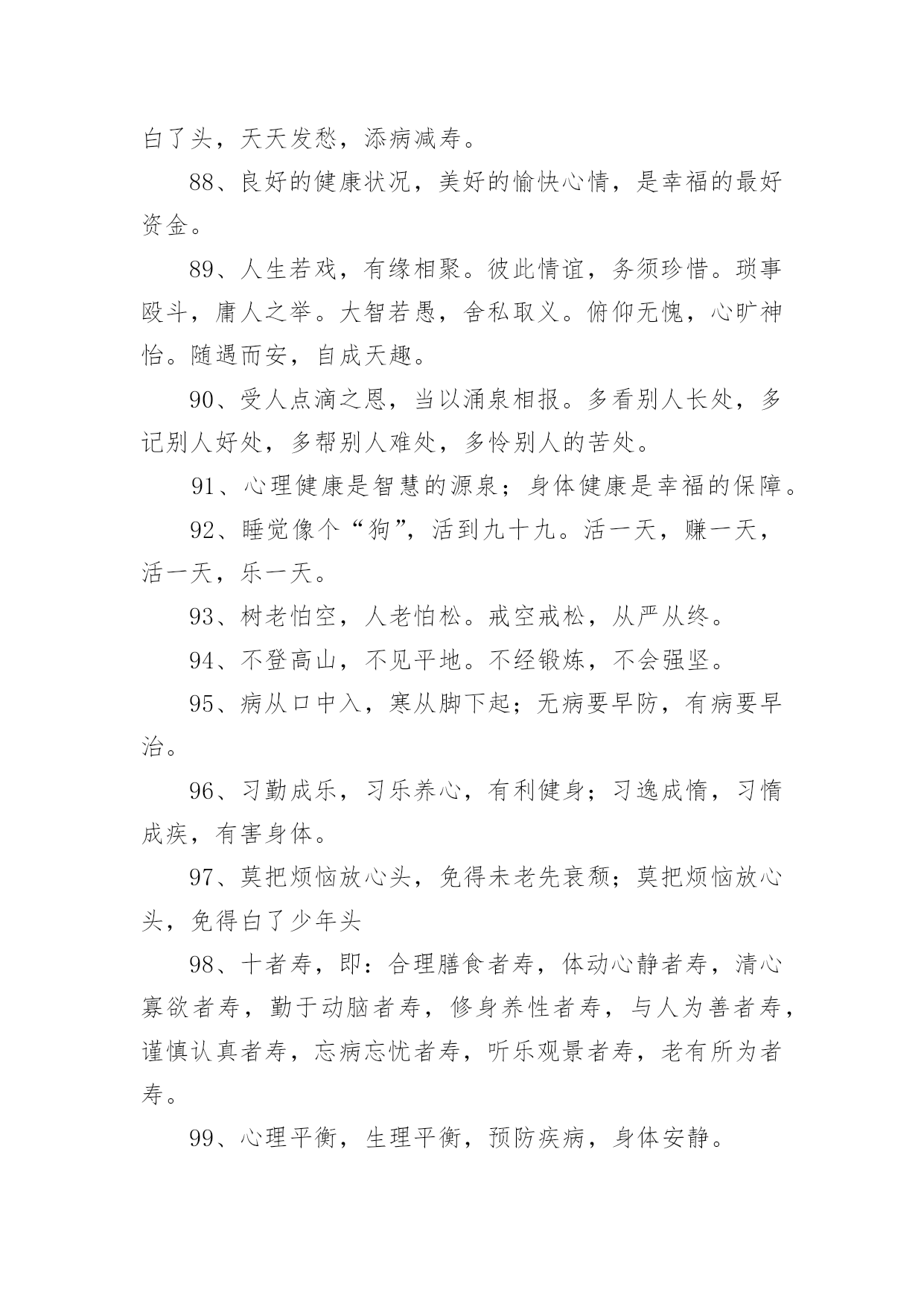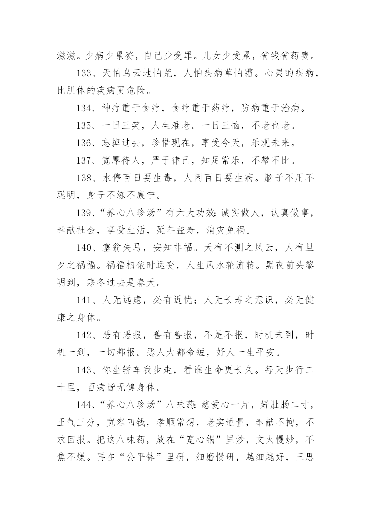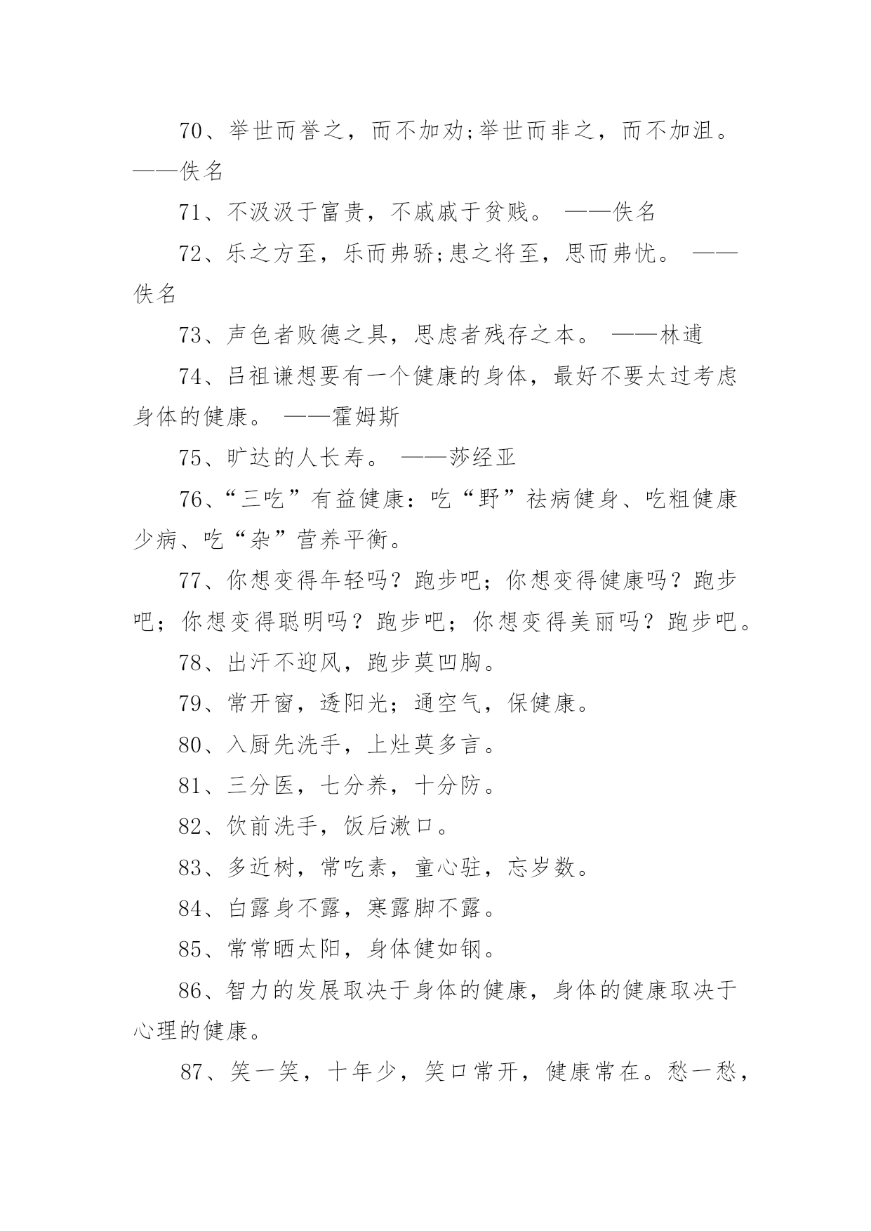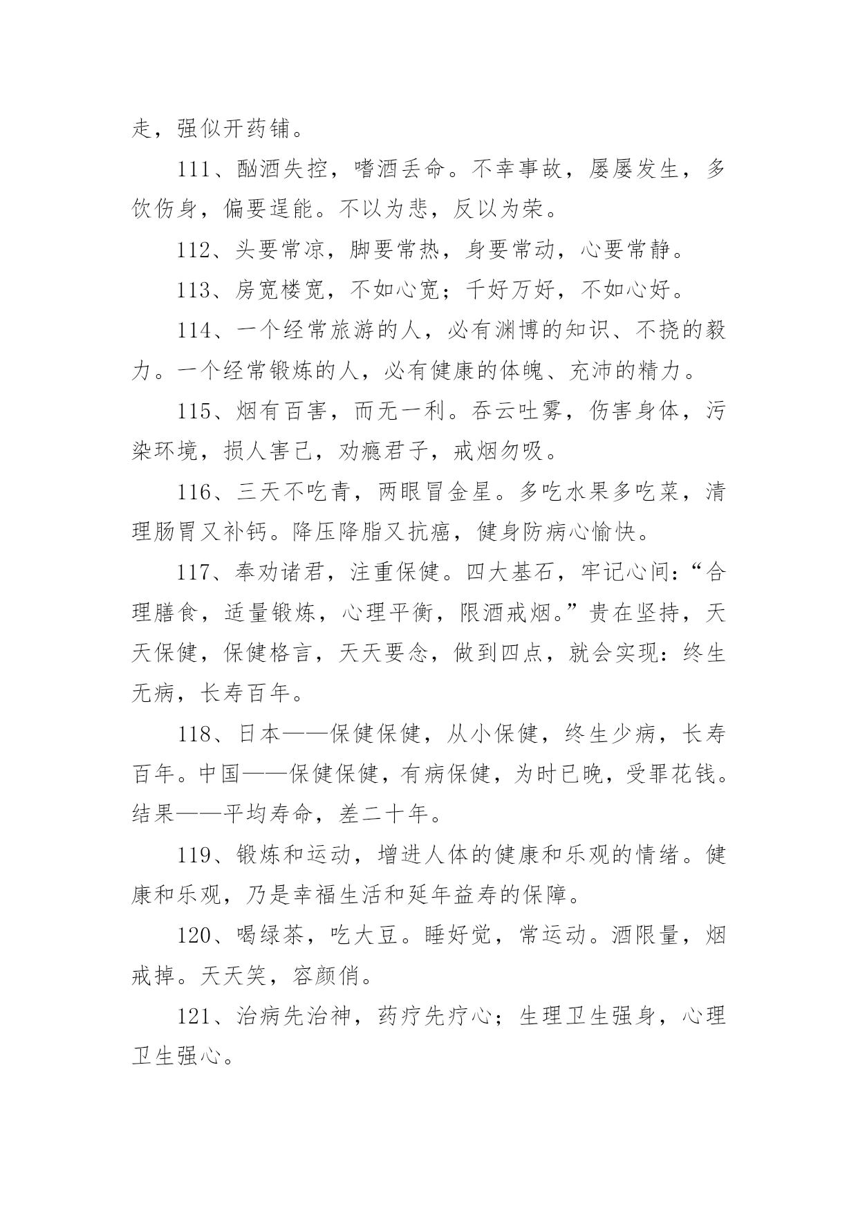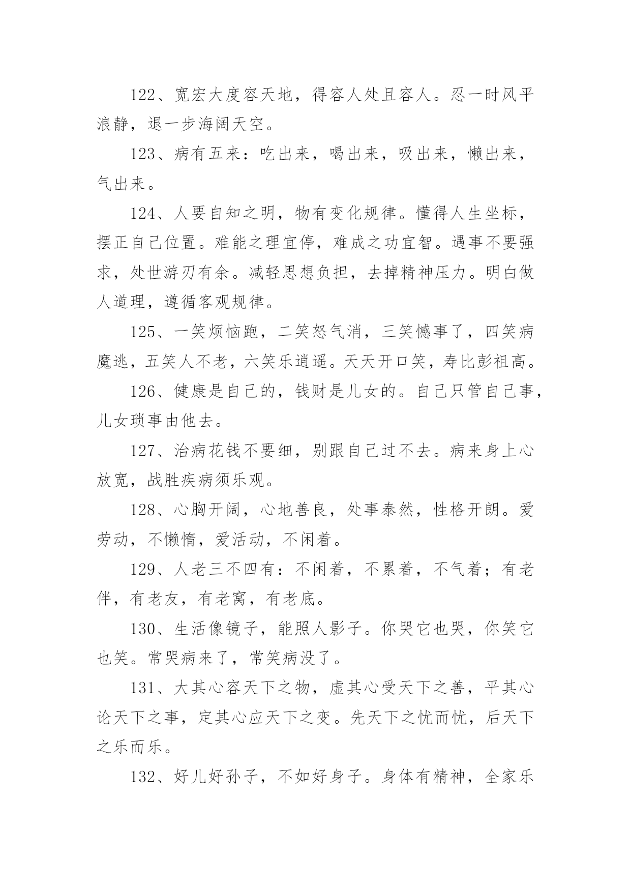 健康养生格言健康养生格言(通用230句)在日常学习、工作抑或是生活中,大家或多或少都接触过一些经典的格言吧,每句格言代表了不同的意义,它是人生的精华,是我们前进的动力,是我们努力的目标。还苦于找不到好的格言?以下是小编为大家整理的健康养生格言(通用230句),欢迎大家借鉴与参考,希望对大家有所帮助。1、食不语,寝不言。——佚名2、善养生者,若牧羊然;视其后者两鞭之。——庄子3、智者养生也,必须四时而调寒暑。——曹庭栋4、恼一恼,老一老;笑一笑,少一少。——佚名5、食欲数而少,又欲顿而多。——曹庭栋6、保生者寡欲,保身者避名。——林逋7、食能以时,身必无灾。——佚名8、吃饭先喝汤,不用请药方。——李光庭9、不欲极饥而食,食不过饱,不欲极渴而饮,饮不过多。——葛洪10、体欲常劳,食欲常少。——梁章矩11、食过则成积聚,饮过则成痰癖。——梁章矩12、食饮有节,起居有常。——梁章矩13、萝卜上了街,药方把嘴撅。——李光庭14、治已病,不若治未病。——曹庭栋15、树怕剥皮,人怕伤心。——李悝16、怠慢则不能不开精,险躁则不能理性。——诸葛亮17、怒后不可便食,食后不可发怒。——梁章矩18、多言则背道,多欲则伤生。——林逋19、久视伤血,久卧伤气,久坐伤肉,久立伤骨,久行伤筋。——曹庭栋20、久立先养足,久夜先养目。——吕坤21、忠言逆耳利于行,良药苦口利于病。——佚名22、思索生知,慢易生忧,暴傲生怨,忧郁生疾。——佚名23、得而不喜,失而弗扰。——佚名24、谤来不戚,誉至不喜。——葛洪25、居心要宽,持身要严。——申居郧26、人该顺时,不可趋时。——申居郧27、心平则气自和。——王通28、以治气养生,则后彭祖;以修身自名,则配尧舜。——荀子29、多欲亏义,多忧害智。——刘安30、养心莫善于寡欲。——孟子31、忿如火,不遏则燎原;欲如水,不遏则滔天。——佚名32、慎风寒,节饮食,是从吾身上却病法;寡嗜欲,戒烦恼,是从吾心上却病法。——佚名34、不贪最先,不恐独后。——刘安35、知足不辱,知止不殆。——老子36、食能止饥,饮能止渴;畏能止祸,足能止贪。——林逋37、安时而处顺,哀乐不能入也。——庄子38、晚食当肉,安步当车。——佚名39、谨口胜于服药。——佚名40、饱肥甘,衣轻暖,不知节者损福;广积聚,骄富贵,不知止者杀身。——林逋41、病已成而后药之,乱已成而后治之,譬犹渴而穿井,井而铸锥,不亦晚乎?——佚名42、沉忧损性灵,服药亦枯槁。——孟郊43、无病之身,不知其乐也,病生始知无病之乐;无事之家,不知其福敢,事至始知无事之福。——佚名44、性躁暴者,一身之剧贼。——佚名45、自家过恶自家省,待祸败时省已迟矣;自家病痛自家医,待死亡时医已晚矣。——佚名46、寤寐不惊忘嗜欲,何须采药烁金丹。——严慎修47、达人观之,生死一耳;何必生之为乐,死之为悲?——蒲松龄48、大怒不怒,大喜不喜,可以养心。——钱琦49、冬不欲极温,夏不欲穷凉。——葛洪50、爽口物多终作疾。——李时珍51、不见闲人精力长,但见劳人筋骨实。——徐荣52、放情者危,节欲者安。——桓范53、动摇则骨气得消,血脉流通,病不得生。——吴普54、晚饭少吃口,活到九十九。——钱大昕55、心安病自除。——陆游56、多才惹得多愁,多情便有多忧。——徐甜斋57、俭约不贪,则可延寿;奢侈过求,受尽则终。——龙遵叙58、举世尽从愁里老。——魏床之59、怒时光景难看,一发遂不可制,既过思之,殊亦不必,故制怒者当涵养于未怒之先。——申涵光60、口腹不节,致病之因;念虑不正,杀身之本。——林逋61、朴能镇浮,静能御躁。——申居岩62、心察损神,语多伤气。——申居郧63、睡侧而屈,觉正而伸,早晚以时。先睡心,后睡眼。——蔡季通64、厄穷而不悯,遗失而不怒。——韩婴65、疾小不加理,浸淫将遍身。——欧阳修66、节食则无疾,择言则无祸。——何坦67、习闲成懒,习懒成病。——颜之推68、心大则百物皆通,心小则百物皆病。——朱熹69、以富而能富人者,欲贫不可得也:贵而能贵人者,欲贱不可得也;以达而能达人者,欲穷不可得也。——佚名70、举世而誉之,而不加劝;举世而非之,而不加沮。——佚名71、不汲汲于富贵,不戚戚于贫贱。——佚名72、乐之方至,乐而弗骄;患之将至,思而弗忧。——佚名73、声色者败德之具,思虑者残存之本。——林逋74、吕祖谦想要有一个健康的身体,最好不要太过考虑身体的健康。——霍姆斯75、旷达的人长寿。——莎经亚76、“三吃”有益健康:吃“野”祛病健身、吃粗健康少病、吃“杂”营养平衡。77、你想变得年轻吗?跑步吧;你想变得健康吗?跑步吧;你想变得聪明吗?跑步吧;你想变得美丽吗?跑步吧。78、出汗不迎风,跑步莫凹胸。79、常开窗,透阳光;通空气,保健康。80、入厨先洗手,上灶莫多言。81、三