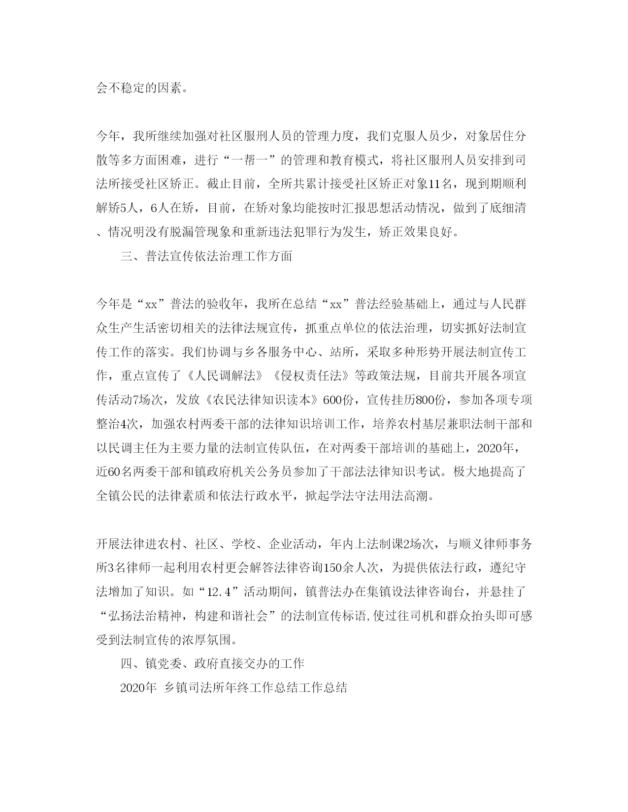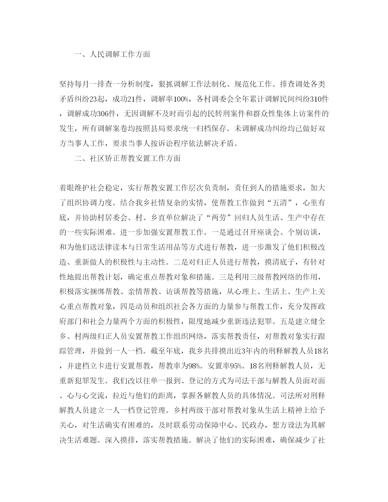 此资料由网络收集而来,如有侵权请告知上传者立即删除。资料共分享,我们负责传递知识。2020年乡镇司法所年终工作总结范文2020年乡镇司法所年终工作总结XX年,在县司法局的正确领导下和镇党委、政府的支持帮助下,我所紧紧围绕和服务于镇党委、政府中心工作,以邓小平理论和“三个代表”重要思想为指导,紧紧围绕党的xx大和xx届六中全会精神,围绕全面建设小康社会的奋斗目标,按照“执法为民”的要求,认真实践依法治国的方略,创新普法与依法治理工作,拓展和规范法律服务,夯实基层基础,加强队伍建设,坚持执法为民思想,牢固树立正确的执法观念和服务观念,切实改进工作作风,做到观念上有新转变,思想上有新飞跃,思路上有新调整,工作上有新突破。紧紧围绕府谷镇经济建设和社会稳定开展工作,充分发挥司法行政工作职能,针对镇域范围内可能出现的不安定因素,坚持“调防结合、以防为主”的方针,及时化解矛盾纠纷,确保了社会安定,人民安居乐业,取得了较好成绩。回顾一年来的工作,主要有以下几个方面:一、以总结“四五”普法、部署xx普法工作为契机,推进依法治镇,创建“平安府谷”为目标,充分发挥法制宣传教育职能,加快推进法制化建设。(一)、进一步提高对法制宣传教育和依法治理工作重要性的认识,把普法和依法治理列入重要议事日程,认真抓好落实。健全普法工作责任制,我所加强了对全镇普法工作落实的指导、协调、监督、检查和服务。各村根据不同实际情况,及时宣传学习相关的法律法规和各种规章。上半年由于土地征用引发的各种上访、纠纷较多,我们除上门调解外还极时的宣传《土管法》、《城市房屋拆迁条例》、《农村土地承包法》等。在农村开展反邪教警示教育活动,利用墙报、版报,书写标语和发放宣传材料等形式,对宪法、刑法等进行宣传。据统计、各村及镇属各企事业单位在此次活动中,书写标语240多条,办板报8块、墙报8块。适时举办法制讲座,普法培训等活动,进一步提高普法宣传效果。(三)、对青少年法制教育做到常抓不懈。以法制教育工作从娃娃开始的教导为方针,加强对在校学生的法制教育。我们帮助镇域范围内各中小学校将法制教育列入教育大纲,抓好青少年的法制宣传教育,不断提高青少年法制教育的质量和效果。促进他们珍爱生活,远离犯罪。二、以加强基层基础工作建设,创建“平安府谷”,维护社会稳定为抓手,为实现人民群众的根本利益提供法律保障。(一)、切实加强司法所规范化建设,充分发挥人民调解在维护基层社会稳定中的“第一道防线”作用。紧紧围绕镇党委政府中心工作,充分发挥基层司法行政工作的职能作用,当好镇政府依法行政的顾问和助手,努力做好排查社会不安定因素和调处社会矛盾纠纷工作,及时掌握动态,积极预防矛盾纠纷的激化,充分发挥基层人民调解委员会的作用,2020年共调解各类纠纷起,调解成功起。纠纷受理率达到100%,调处成功率达到98%,在司法所调处的纠纷中,集访案件5起,全部予以化解并妥善处置,全年无调解不当而发生民转刑或非正常死亡。针对今年以来我镇矛盾纠纷出现的新情况、新问题,我们及时整理思路,调整重心,重点加强了对涉及土地征用、土地承包、企业改制引发的劳资纠纷等社会突出问题的控制力度。对每位来访群众我们做到热情接待,认真办理,件件有答复、事事有落实,受到来访群众的交口称赞。(二)、切实加强刑满释放人员安置帮教工作,刑满释放人员安置帮教工作是一项长期而又艰巨的任务。为提高对刑满释放人员的管理和控制力,我们采取灵活多样的帮教方式,确保安置帮教工作真正落到实处。全镇2020年刑满释放人员人,对所有刑满释放人员全部建立了个人档案,并确定了具体的帮教人实施帮教,完善刑满释放人员年度帮教考察记录。对外出打工的刑满释放人员,采用书信、电话等形式落实帮教考察。(三)、以创建“民主法治村”为载体,完善行政村民主制度,切实加强农村法制建设。今年,府谷镇在56个行政村开展了“民主法治村”的创建工作,在此基础上,进一步健全和完善了民主自治章程和村规民约。三、不断提高队伍综合素质,增强机关效能建设。(一)、深入开展学习“xx大会议”精神。通过运用多种形式,把思想统一到“三个代表”的要求上来,把力量凝聚到实现“xx大”提出的奋斗目标上来,不断开创司法行政工作的新局面。(二)、切实加强村级调委会建设,充分发挥调委会在调处矛盾、纠纷中的生力军作用。今年,对全镇56个行政村的调委会进行了调整、充实,并进一步完善基层组织建设,坚持以人为本的原则,将素质高、能力强、威望高的人员充实到调解组织,不断提高调委会队伍的整体素质,确保调解质量。并通过会议组织各类培训活动,如组织调委会成员学习《人民法院关于审理涉及人民调解协议的民事案件的若干规定》的司法解释和人民调解卷宗的归档工作,为调委会成员不断提高自身的业务知识水平,熟练掌握调解技巧,把矛盾纠纷消灭在萌芽状态