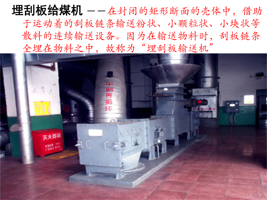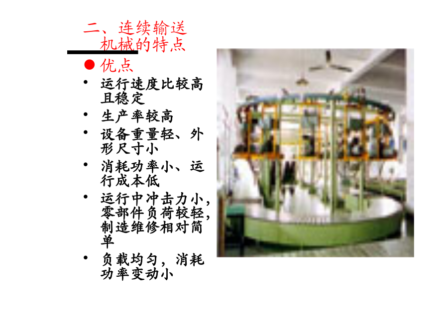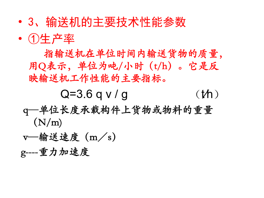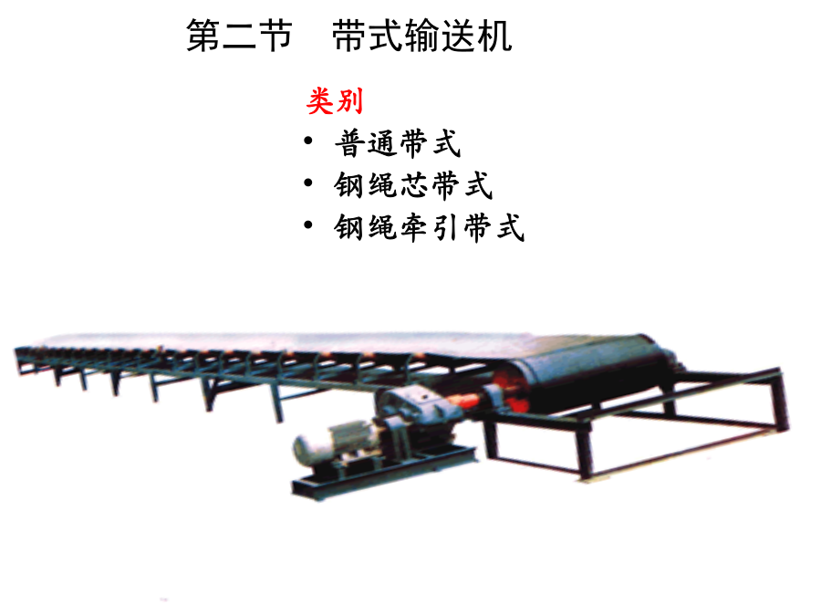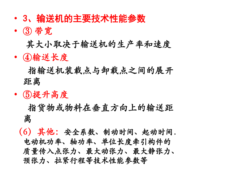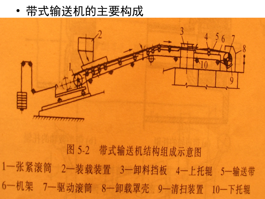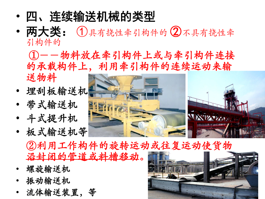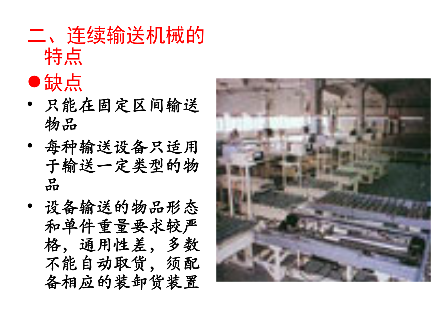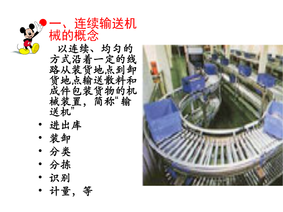 第五章连续输送机械一、连续输送机械的概念以连续、均匀的方式沿着一定的线路从装货地点到卸货地点输送散料和成件包装货物的机械装置,简称“输送机”进出库装卸分类分拣识别计量,等二、连续输送机械的特点优点运行速度比较高且稳定生产率较高设备重量轻、外形尺寸小消耗功率小、运行成本低运行中冲击力小,零部件负荷较轻,制造维修相对简单负载均匀,消耗功率变动小二、连续输送机械的特点缺点只能在固定区间输送物品每种输送设备只适用于输送一定类型的物品设备输送的物品形态和单件重量要求较严格,通用性差,多数不能自动取货,须配备相应的装卸货装置3、输送机的主要技术性能参数①生产率指输送机在单位时间内输送货物的质量,用Q表示,单位为吨/小时(t/h)。它是反映输送机工作性能的主要指标。Q=3.6qv/g(t∕h)q—单位长度承载构件上货物或物料的重量(N/m)v—输送速度(m/s)g----重力加速度3、输送机的主要技术性能参数③带宽其大小取决于输送机的生产率和速度④输送长度指输送机装载点与卸载点之间的展开距离⑤提升高度指货物或物料在垂直方向上的输送距离(6)其他:安全系数、制动时间、起动时间.电动机功率、轴功率、单位长度牵引构件的质量传入点张力、最大动张力、最大静张力、预张力、拉紧行程等技术性能参数等四、连续输送机械的类型两大类:①具有挠性牵引构件的②不具有挠性牵引构件的①--物料放在牵引构件上或与牵引构件连接的承载构件上,利用牵引构件的连续运动来输送物料埋刮板输送机带式输送机斗式提升机板式输送机等②利用工作构件的旋转运动或往复运动使货物沿封闭的管道或料槽移动。螺旋输送机振动输送机流体输送装置,等第二节带式输送机带式输送机的主要构成皮带输送机用输送带的连续或间歇运动来输送各种轻重不同的物品,既可输送各种散料,也可输送各种纸箱、包装袋等单件重量不大的件货,用途广泛板链式输送机以标准顶板链为承载面,由马达减速机为动力传动,运行在专用导轨中塑料网带式输送机--使用模块式塑料输送带,而且传动方式系采用链轮驱动斗式提升机--提升粉状、粒状,可提升磨琢性大的物料。螺旋输送机俗称绞龙,广泛应用于化工、建材、粮油、饲料、食品、冶金、矿山、塑料、医药等行业的一种输送设备,适用于---颗粒或粉状物料的水平输送,倾斜输送,垂直输送等形式,其输送距离从2米到70米,规格从120-600型多种,材质有碳钢和不锈钢等滚筒输送线滚筒输送线气力输送装置--利用压缩空气作动力,将固态颗粒物通过密封管道进行干法输送的全套系统设备三、带式输送机的使用与维护1、使用管理--专人集中管理的方式,集中开关机开机前确认没有人员触摸机件开机后检查指示灯、电动机、减速机等有无异常检查输送带是否平稳、带表面是否清洁、带是否在中心移动承载均匀、不得超重物品装卸轻拿轻放经常巡视、发现异常尽快通知系统管理人员处理关机后,及时检查、清洁,及时处理并填好设备检查记录三、带式输送机的使用与维护2、带式输送机的维护保养带式输送机结构简单,但是工作环境条件及工作负荷变动较大,维护保养必须注意(1)日常维护保养--清洁、调整、润滑、检查(2)常规保养--易损零件的换修,主要指输送带、支承滚筒的轴承、其它如装卸料刮板的调整和拆换、松动或损坏固件的上紧及调换(3)中、大修管理--中修一般为半年至一年一次;大修一到两年一次。应严格按照使用单位制定的维护保养规程办理
