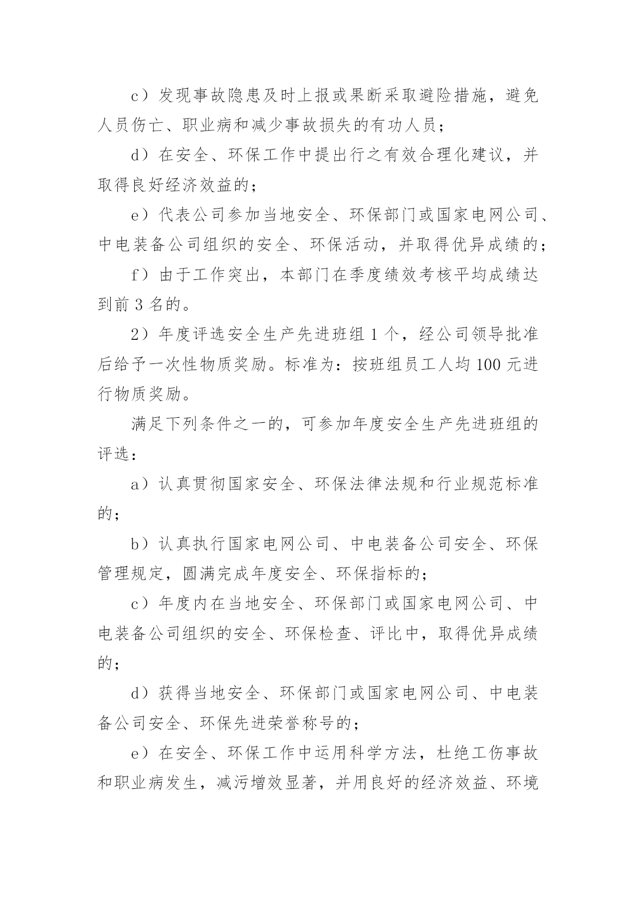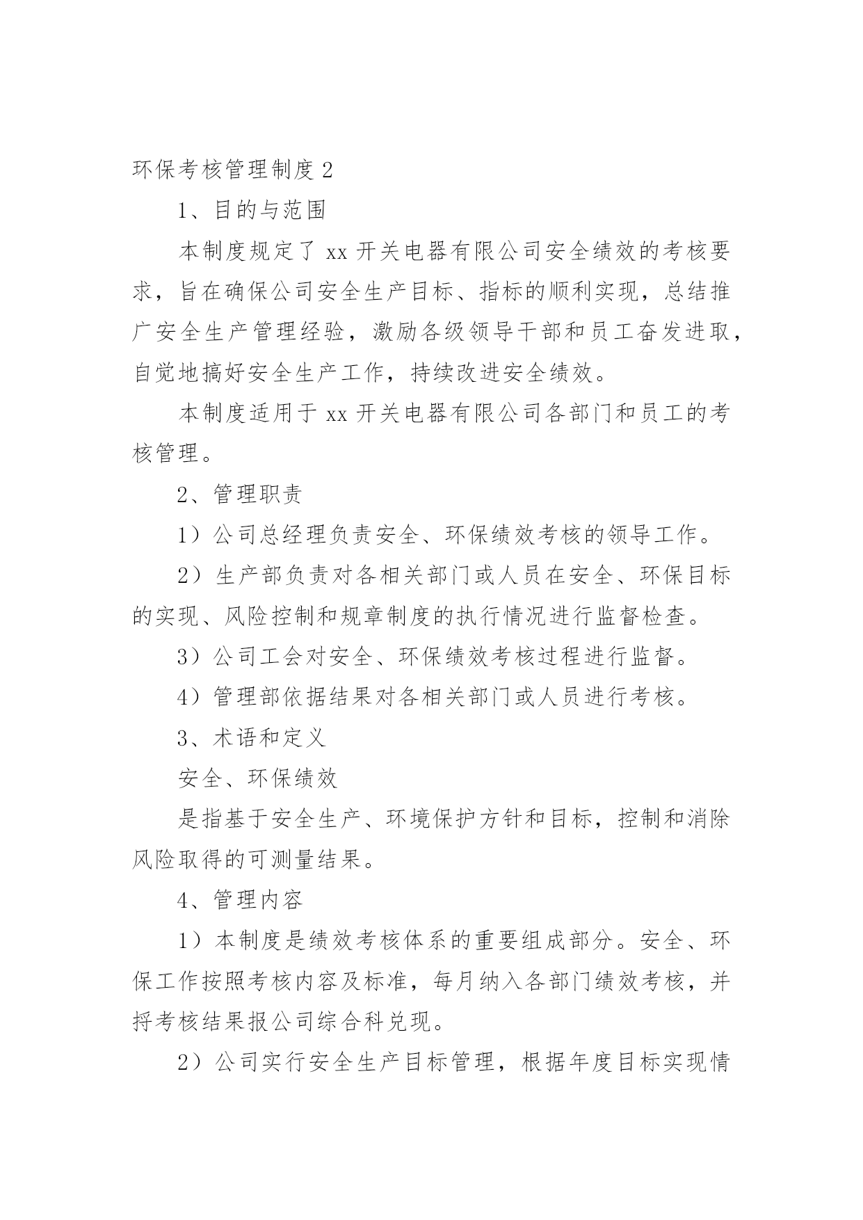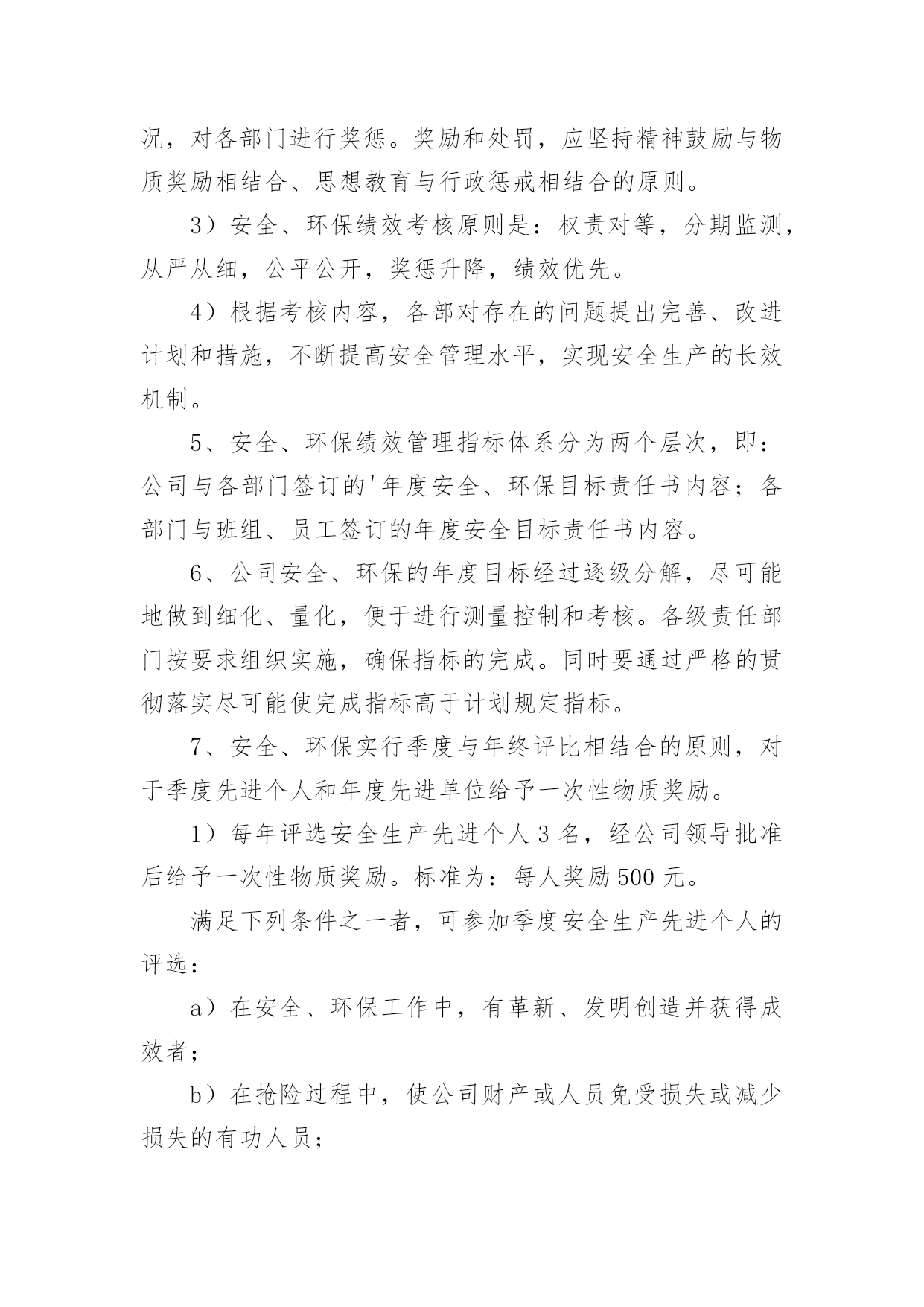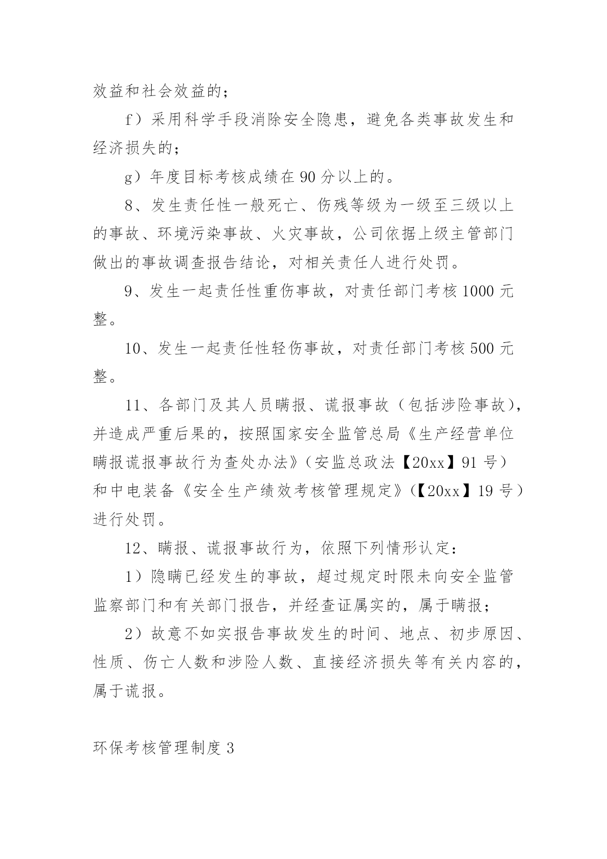环保考核管理制度在日新月异的现代社会中,大家逐渐认识到制度的重要性,制度是维护公平、公正的有效手段,是我们做事的底线要求。制度到底怎么拟定才合适呢?下面是小编帮大家整理的环保考核管理制度,仅供参考,欢迎大家阅读。环保考核管理制度1一、环保政策与法规遵守二、节能减排目标设定与实施三、资源循环利用与废弃物管理四、环保技术应用与创新五、员工环保意识培养与参与六、环保绩效评估与改进内容概述:1.环保政策:确保企业活动符合国家及地方的`环保法律法规,定期进行法规更新学习。2.节能减排:制定并执行节能措施,减少碳排放,提高能源效率。3.废物处理:建立废弃物分类、储存、运输和处理的规章制度,降低环境污染。4.技术应用:引进和研发环保技术,优化生产流程,减少污染产生。5.员工教育:通过培训和宣传,提升员工的环保意识和行动力。6.绩效评估:设立环保指标,定期评估企业环保工作的成效,并据此调整策略。环保考核管理制度21、目的与范围本制度规定了xx开关电器有限公司安全绩效的考核要求,旨在确保公司安全生产目标、指标的顺利实现,总结推广安全生产管理经验,激励各级领导干部和员工奋发进取,自觉地搞好安全生产工作,持续改进安全绩效。本制度适用于xx开关电器有限公司各部门和员工的考核管理。2、管理职责1)公司总经理负责安全、环保绩效考核的领导工作。2)生产部负责对各相关部门或人员在安全、环保目标的实现、风险控制和规章制度的执行情况进行监督检查。3)公司工会对安全、环保绩效考核过程进行监督。4)管理部依据结果对各相关部门或人员进行考核。3、术语和定义安全、环保绩效是指基于安全生产、环境保护方针和目标,控制和消除风险取得的可测量结果。4、管理内容1)本制度是绩效考核体系的重要组成部分。安全、环保工作按照考核内容及标准,每月纳入各部门绩效考核,并捋考核结果报公司综合科兑现。2)公司实行安全生产目标管理,根据年度目标实现情况,对各部门进行奖惩。奖励和处罚,应坚持精神鼓励与物质奖励相结合、思想教育与行政惩戒相结合的原则。3)安全、环保绩效考核原则是:权责对等,分期监测,从严从细,公平公开,奖惩升降,绩效优先。4)根据考核内容,各部对存在的问题提出完善、改进计划和措施,不断提高安全管理水平,实现安全生产的长效机制。5、安全、环保绩效管理指标体系分为两个层次,即:公司与各部门签订的'年度安全、环保目标责任书内容;各部门与班组、员工签订的年度安全目标责任书内容。6、公司安全、环保的年度目标经过逐级分解,尽可能地做到细化、量化,便于进行测量控制和考核。各级责任部门按要求组织实施,确保指标的完成。同时要通过严格的贯彻落实尽可能使完成指标高于计划规定指标。7、安全、环保实行季度与年终评比相结合的原则,对于季度先进个人和年度先进单位给予一次性物质奖励。1)每年评选安全生产先进个人3名,经公司领导批准后给予一次性物质奖励。标准为:每人奖励500元。满足下列条件之一者,可参加季度安全生产先进个人的评选:a)在安全、环保工作中,有革新、发明创造并获得成效者;b)在抢险过程中,使公司财产或人员免受损失或减少损失的有功人员;c)发现事故隐患及时上报或果断采取避险措施,避免人员伤亡、职业病和减少事故损失的有功人员;d)在安全、环保工作中提出行之有效合理化建议,并取得良好经济效益的;e)代表公司参加当地安全、环保部门或国家电网公司、中电装备公司组织的安全、环保活动,并取得优异成绩的;f)由于工作突出,本部门在季度绩效考核平均成绩达到前3名的。2)年度评选安全生产先进班组1个,经公司领导批准后给予一次性物质奖励。标准为:按班组员工人均100元进行物质奖励。满足下列条件之一的,可参加年度安全生产先进班组的评选:a)认真贯彻国家安全、环保法律法规和行业规范标准的;b)认真执行国家电网公司、中电装备公司安全、环保管理规定,圆满完成年度安全、环保指标的;c)年度内在当地安全、环保部门或国家电网公司、中电装备公司组织的安全、环保检查、评比中,取得优异成绩的;d)获得当地安全、环保部门或国家电网公司、中电装备公司安全、环保先进荣誉称号的;e)在安全、环保工作中运用科学方法,杜绝工伤事故和职业病发生,减污增效显著,并用良好的经济效益、环境效益和社会效益的;f)采用科学手段消除安全隐患,避免各类事故发生和经济损失的;g)年度目标考核成绩在90分以上的。8、发生责任性一般死亡、伤残等级为一级至三级以上的事故、环境污染事故、火灾事故,公司依据上级主管部门做出的事故调查报告结论,对相关责任人进行处罚。9、发生一起责任性重伤事故,对责任部门考核1000元整。10、发生一起责任性轻伤事故,对责任部门考核500元整。11、各部门及其人员瞒报、谎报事故(包括涉险事故),并造成严重后果的,按照国家安全监管总局《生产经营单位瞒报