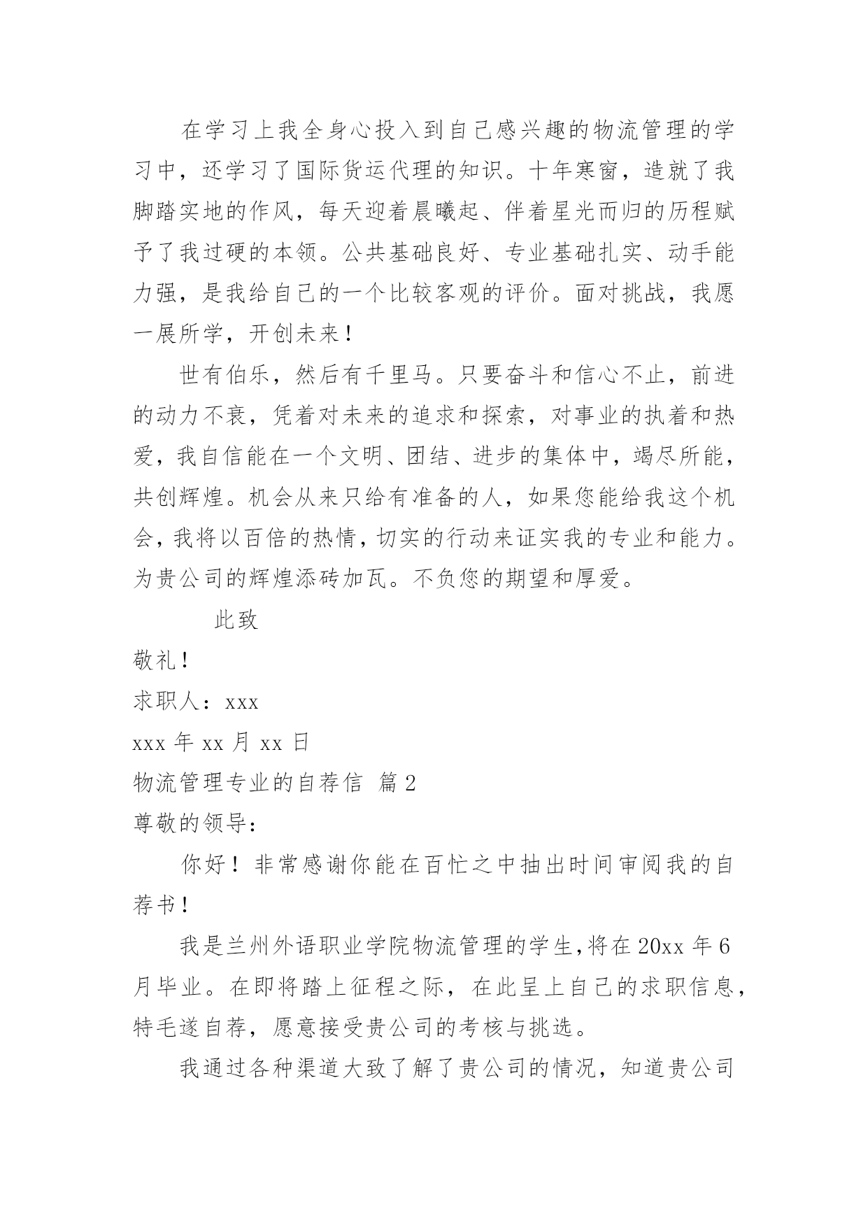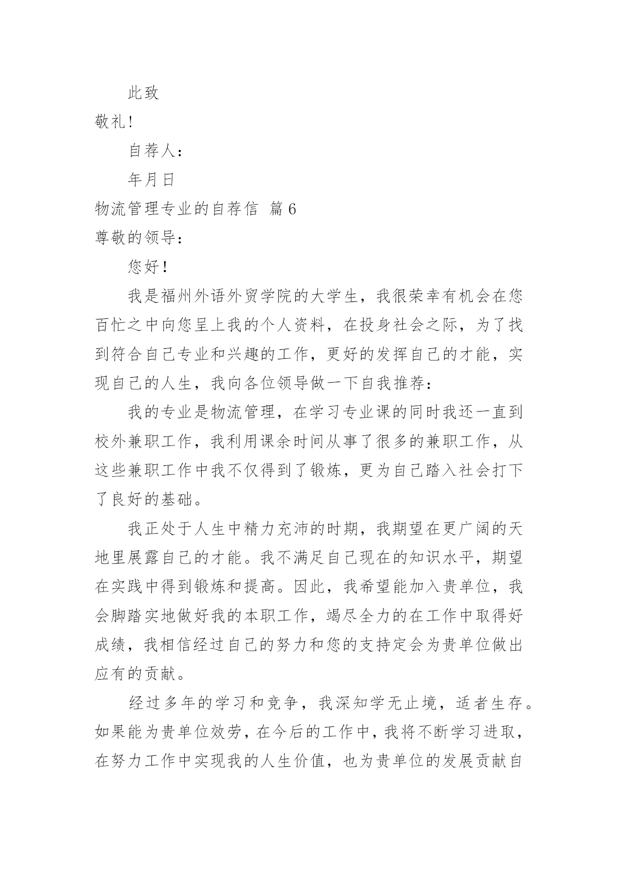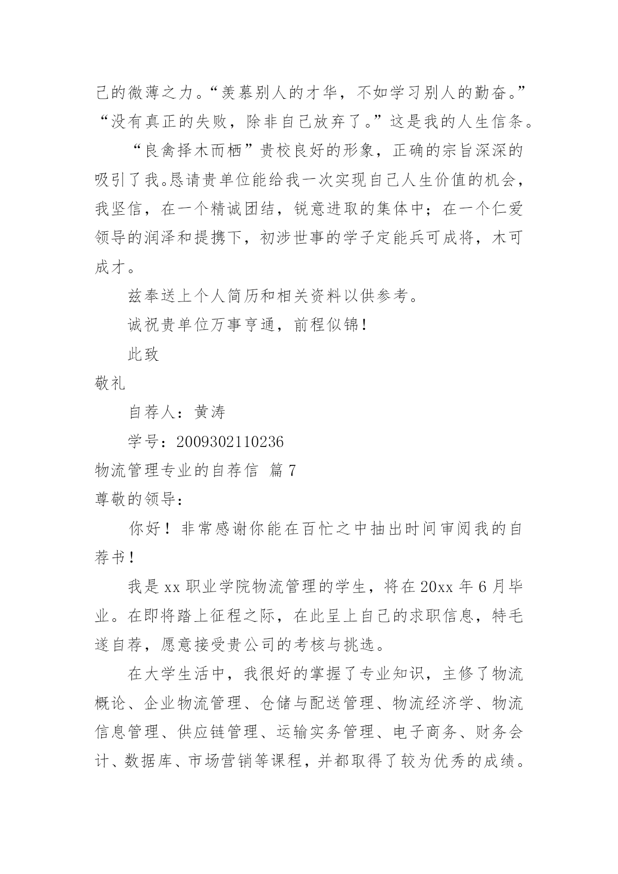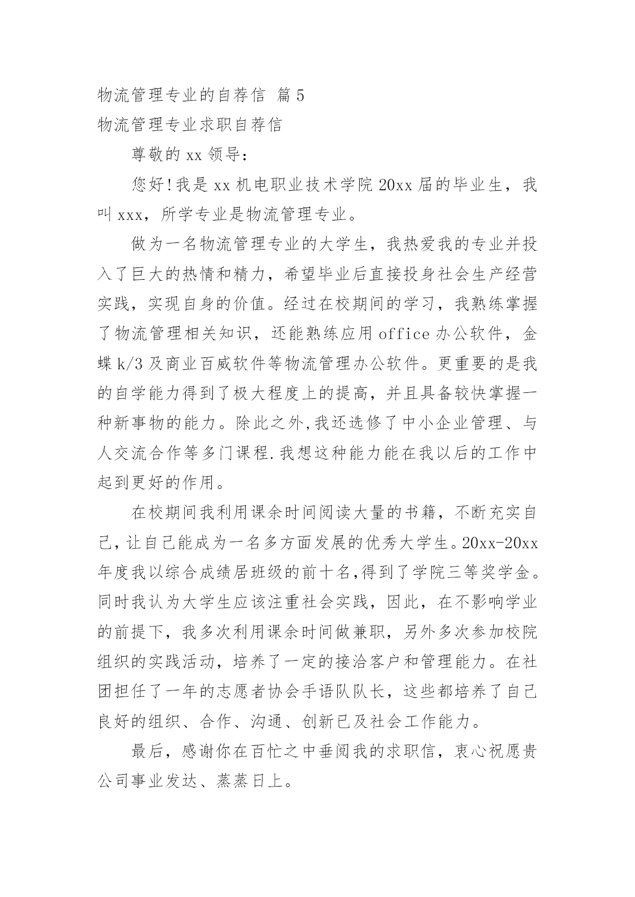 物流管理专业的自荐信物流管理专业的自荐信范文集锦9篇随着社会一步步向前发展,自荐信的使用范围越来越大,我们在写自荐信的时候要注意理由要充分、合理。那么什么样的自荐信才是有效的呢?下面是小编整理的物流管理专业的自荐信9篇,希望对大家有所帮助。物流管理专业的自荐信篇1尊敬的领导:您好!我是XX工业职业技术学院物流管理专业的一名应届毕业生。近期获知贵公司正在招聘人才,我自信能胜任这一职位,所以特意写了这封自荐信。经过三年物流专业的学习。我熟练掌握了现代物流相关的知识。并于XXXX年考取了国家物流师职业资格证书。作为一名物流管理专业的学生,在校期间,我严格要求自己,努力学好专业知识,通过紧张的学习生活,我已经熟悉并掌握了有关法律基础理论、基本法、部门法的相关知识。在学习之余,积极投身法律实践工作中,使自己在丰富理论知识的同时,增加了社会经验。四年中令我欣慰的是:连续两个学年,四次获得奖学金,顺利通过了大学英语四级考试和计算机二级考试。我把这些作为向上的动力,朝着更高的目标奋斗。在学习上我全身心投入到自己感兴趣的物流管理的学习中,还学习了国际货运代理的知识。十年寒窗,造就了我脚踏实地的作风,每天迎着晨曦起、伴着星光而归的历程赋予了我过硬的本领。公共基础良好、专业基础扎实、动手能力强,是我给自己的一个比较客观的评价。面对挑战,我愿一展所学,开创未来!世有伯乐,然后有千里马。只要奋斗和信心不止,前进的动力不衰,凭着对未来的追求和探索,对事业的执着和热爱,我自信能在一个文明、团结、进步的集体中,竭尽所能,共创辉煌。机会从来只给有准备的人,如果您能给我这个机会,我将以百倍的热情,切实的行动来证实我的专业和能力。为贵公司的辉煌添砖加瓦。不负您的期望和厚爱。此致敬礼!求职人:xxxxxx年xx月xx日物流管理专业的自荐信篇2尊敬的领导:你好!非常感谢你能在百忙之中抽出时间审阅我的自荐书!我是兰州外语职业学院物流管理的学生,将在20xx年6月毕业。在即将踏上征程之际,在此呈上自己的求职信息,特毛遂自荐,愿意接受贵公司的考核与挑选。我通过各种渠道大致了解了贵公司的情况,知道贵公司是个很有发展前途的具有现代潮流的公司,具有很大的活力,而我也非常希望能加入这样的企业,尽自己最大努力为公司的发展奉献自己的微薄之力。同时能对自己的发展起到积极的作用,希望能在贵公司的帮助下、在贵公司大发展的环境下促进自己的发展。现谨向你作一下自我推荐:在大学生活中,我很好的掌握了专业知识,主修了物流概论、企业物流管理、仓储与配送管理、物流经济学、物流信息管理、供应链管理、运输实务管理、电子商务、财务会计、数据库、市场营销等课程,并都取得了较为优秀的成绩。21世纪呼唤综合性人才我知道光是有好的理论知识是不够的。所以在学有余力的情况下我一直积极参与社会实践活动积极配合老师的工作,课余时间,在一惟单位兼职,业绩突出受到领导的高度赞扬。伴着青春的激情和求知的欲望,我即将走完三年的求知之旅,美好的大学生活,培养了我科学严谨的思维方法,更造就了我积极乐观的生活态度和开拓进取的创新意识。在不断的学习和工作中我更养成了严谨、踏实的工作作风和团结协作的优秀品质。大学期间,我取得了一定的成绩,然而这已成为过去;面对当今激烈的人才竞争,我很清楚自己知识有限,但我更清楚我有着不甘落后的精神和不断学习、不断提高的愿望。乐于进取、不怕挫折是我的人生信条,给我一次机会,让我去实践、去闯、去干,因为能力要在实践中培养,也终究要在实践中体险辏我深信自己完全可以在岗位上守业、敬业、更能创业!我相信我的能力和知识正是贵单位所需要的,我真诚渴望,我能为单位的明天奉献自己的青春和热血!愿贵单位事业蒸蒸日上,蓬勃发展!静盼你的佳音!此致敬礼!物流管理专业的自荐信篇3尊敬的领导:感谢您抽空垂阅我的自荐信!本人xx,男,1985年生于广东省小榄市,从小就受到良好的家庭教育,而且在父母的熏陶下我很早就树立了正确的人生观和价值观,并懂得了怎样在生活中磨炼自己。20xx年9月,我被广东外语外贸学院录取,并选择了适合自己学习的物流管理专业。一直以来我学习刻苦,勤于钻研,在三年内,学院给了我得智体美全面的教育,科学的安排了;物流概论、物流事务、财务会计、仓储管理、市场营销等课程。三年期间修完全部课程并顺利地通过了中级物流师考试。适应社会和公司对人才的要求。为了锻炼自己、服务大家,在大学期间我积极地加入了学院青年志愿者协会、现代企业管理协会,工商系学生会等学生社团。在社团中,由于我的积极工作、努力学习,为社团做出了一定的贡献,取得了一定的成绩,曾获得学院团委颁发的“优秀共青团员”称号和工商系颁发的“社会活动积极分子称号”。受到学院领导和老师的一致好评。大一、大二暑假期间为了培养自己的'能力,了解社会,我先后两次到沿海城市做过暑期工,