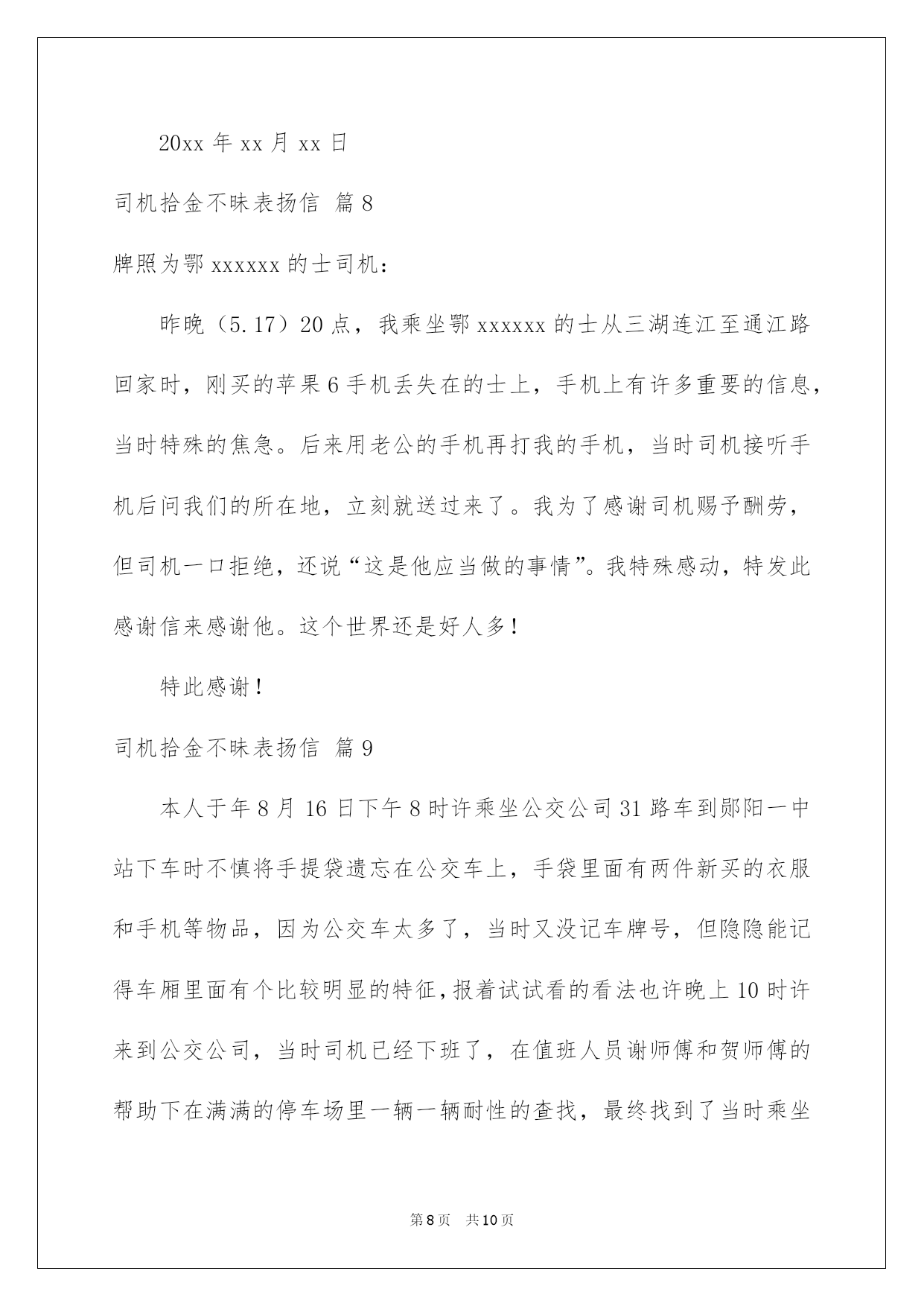 第PAGE\*Arabic\*MERGEFORMAT10页共NUMPAGES\*Arabic\*MERGEFORMAT10页第PAGE\*MERGEFORMAT10页共NUMPAGES\*MERGEFORMAT10页第PAGE\*MERGEFORMAT10页共NUMPAGES\*MERGEFORMAT10页第PAGE\*MERGEFORMAT10页共NUMPAGES\*MERGEFORMAT10页第PAGE\*MERGEFORMAT10页共NUMPAGES\*MERGEFORMAT10页第PAGE\*MERGEFORMAT10页共NUMPAGES\*MERGEFORMAT10页第PAGE\*MERGEFORMAT10页共NUMPAGES\*MERGEFORMAT10页第PAGE\*MERGEFORMAT10页共NUMPAGES\*MERGEFORMAT10页第PAGE\*MERGEFORMAT10页共NUMPAGES\*MERGEFORMAT10页第PAGE\*MERGEFORMAT10页共NUMPAGES\*MERGEFORMAT10页第PAGE\*MERGEFORMAT10页共NUMPAGES\*MERGEFORMAT10页2022司机拾金不昧表扬信司机拾金不昧表扬信汇编十篇在我们平凡的日常里,表扬信不再是罕见的东西,我们通常在对别人表示确定和表扬时会用到表扬信。还是对表扬信一筹莫展吗?下面是我为大家收集的司机拾金不昧表扬信10篇,欢迎大家借鉴与参考,希望对大家有所帮助。司机拾金不昧表扬信篇1的士司机盘继彪师傅:今日上午我在泸县福集县城办事,不当心将手机掉到了的士车上,后来的士师傅特地大老远的开车给我送来,在此特别感谢这位名叫盘继彪的师傅,在此表示特别真挚的感谢,请广阔网友以后多多照看他的生意哦。手机虽然不值多少钱,但是手机内存的手机号码却是特别重要。尽管当时特别想找回手机,但是心里并不抱多大希望,没想到这位盘继彪师傅还亲自帮我送过来。我将恒久牢记,有一个平凡却高尚的人,他叫盘继彪;我恒久牢记,有一种叫诚信的道德,它仍旧在熠熠闪光。请允许我,向可敬可爱的盘继彪师傅表示最真诚的感谢,并致以最崇高的敬意!xxx20xx年xx月xx日司机拾金不昧表扬信篇2本人姓刘,家住安徽阜阳,于年8月5日到芜湖市出差,乘坐本市8路号为:2-0929的公交车,下车后发觉自用笔记本落在车上。因里面有重要数据,特别焦急,就打电话到8路公交终点站,把状况告知了调度员吴景丽,调度员特别耐性的给每个8路公交车司机打电话询问。在这里我首先要感谢公交司机:张玉兵,调度员:吴景丽以及全部在这次善举中出力的贵公司员工,我认为他们体现了一种为他人所想、为他人所急的高尚品德,也为贵公司塑造了一个良好的形象。我还要感谢随另一辆公交车女司机,她告知我如何与贵公司联系,如何更快的找到遗失物品,他们那种真诚为乘客着想的务实看法,让我特别敬佩。我认为这种精神值得社会上全部人学习,值得社会推崇。司机拾金不昧表扬信篇3我是一名在校学生,年11月7日(星期天)下午坐衡阳狮城巴士3路公交车从解放路返回学校,在车上一时疏忽,把钱包落在了车上。钱包里有数百元现金,跟学生证,到学校时,才发觉发觉丢失东西我特别焦急。其次天老师就叫我去办公室,说接到公交车司机(余叔叔)的电话,告知我的钱包在他关窗户时发觉,无意中发觉我的学生证。经电话联系学校后,早上我就收到了我遗失的钱包。本人非常感动!在这里我真诚感谢那位拾金不昧的司机叔叔---3路公交车,车牌号是659的余志勇叔叔,他具有一种为他人所想、急为他人所急的高尚品质,这是现在社会非常须要的一种高尚品质,非常感谢!!!司机拾金不昧表扬信篇4敬重的xxx:我是一名在校学生,20xx年11月7日(星期天)下午坐衡阳狮城巴士3路公交车从解放路返回学校,在车上一时疏忽,把钱包落在了车上。钱包里有数百元现金,跟学生证,到学校时,才发觉发觉丢失东西我特别焦急。其次天老师就叫我去办公室,说接到公交车司机(余叔叔)的电话,告知我的钱包在他关窗户时发觉,无意中发觉我的学生证。经电话联系学校后,早上我就收到了我遗失的钱包。本人非常感动!在这里我真诚感谢那位拾金不昧的司机叔叔———3路公交车,车牌号是659的余志勇叔叔,他具有一种为他人所想、急为他人所急的高尚品质,这是现在社会非常须要的一种高尚品质,非常感谢!!!此致敬礼!写信人:xxx日期:20xx年x月x日司机拾金不昧表扬信篇5公交司机:你好!我是一名在校学生,xx年11月7日(星期天)下午坐衡阳狮城巴士3路公交车从解放路返回学校,在车上一时疏忽,把钱包落在了