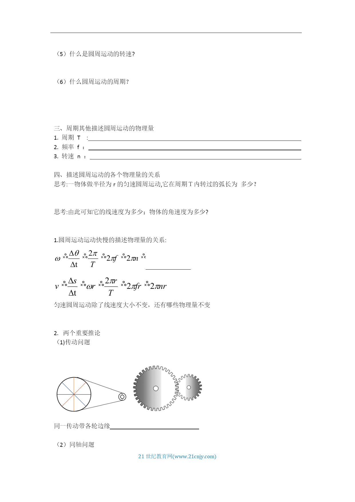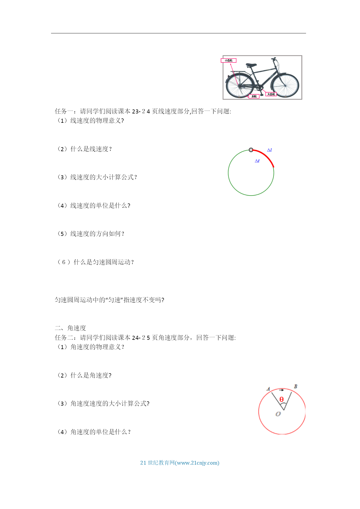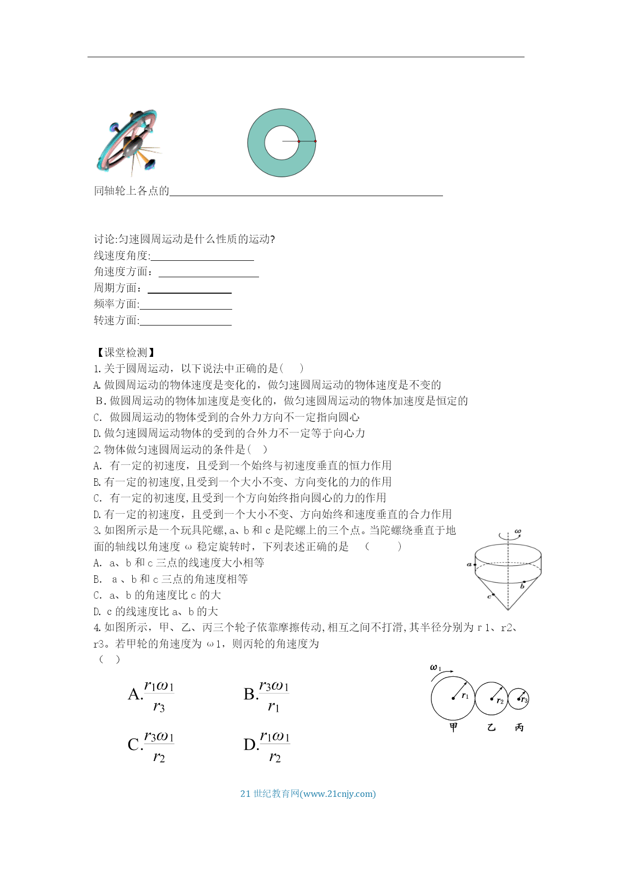 HYPERLINK"http://www.21cnjy.com/"21世纪教育网(www.21cnjy.com)《6.1圆周运动》学案【学习目标】1.认识圆周运动。2.理解线速度、角速度和周期的概念,会用它们的公式进行计算。3.理解线速度、角速度、周期之间的关系4.理解匀速圆周运动是变速运动。【课堂合作探究】变速自行车高速时,使用大齿轮和小齿轮怎样连接?请观看视频,为什么杯子口部比底部跑得快?观看视频,你是否在游乐园玩过,你在上面的运动轨迹是什么?一、线速度1、圆周运动的概念:举举你所知道的圆周运动?自行车的大齿轮、小齿轮、后轮中的质点都在做圆周运动。那些点运动的更快些?我们怎样描述物体运动的快慢呢?任务一:请同学们阅读课本23-24页线速度部分,回答一下问题:线速度的物理意义?什么是线速度?线速度的大小计算公式?线速度的单位是什么?线速度的方向如何?(6)什么是匀速圆周运动?匀速圆周运动中的“匀速”指速度不变吗?角速度任务二:请同学们阅读课本24-25页角速度部分,回答一下问题:角速度的物理意义?什么是角速度?角速度速度的大小计算公式?角速度的单位是什么?什么是圆周运动的转速?什么圆周运动的周期?周期其他描述圆周运动的物理量周期T:频率f:转速n:描述圆周运动的各个物理量的关系思考:一物体做半径为r的匀速圆周运动,它在周期T内转过的弧长为多少?思考:由此可知它的线速度为多少;物体的角速度为多少?1.圆周运动运动快慢的描述物理量的关系:匀速圆周运动除了线速度大小不变,还有哪些物理量不变两个重要推论(1)传动问题同一传动带各轮边缘同轴问题同轴轮上各点的讨论:匀速圆周运动是什么性质的运动?线速度角度:角速度方面:周期方面:频率方面:转速方面:【课堂检测】1.关于圆周运动,以下说法中正确的是()A.做圆周运动的物体速度是变化的,做匀速圆周运动的物体速度是不变的B.做圆周运动的物体加速度是变化的,做匀速圆周运动的物体加速度是恒定的C.做圆周运动的物体受到的合外力方向不一定指向圆心D.做匀速圆周运动物体的受到的合外力不一定等于向心力2.物体做匀速圆周运动的条件是()A.有一定的初速度,且受到一个始终与初速度垂直的恒力作用B.有一定的初速度,且受到一个大小不变、方向变化的力的作用C.有一定的初速度,且受到一个方向始终指向圆心的力的作用D.有一定的初速度,且受到一个大小不变、方向始终和速度垂直的合力作用3.如图所示是一个玩具陀螺,a、b和c是陀螺上的三个点。当陀螺绕垂直于地面的轴线以角速度ω稳定旋转时,下列表述正确的是()A.a、b和c三点的线速度大小相等B.a、b和c三点的角速度相等C.a、b的角速度比c的大D.c的线速度比a、b的大4.如图所示,甲、乙、丙三个轮子依靠摩擦传动,相互之间不打滑,其半径分别为r1、r2、r3。若甲轮的角速度为ω1,则丙轮的角速度为()【达标训练】一、单选题嘉兴某高中开设了糕点制作的选修课,小明同学在体验糕点制作的“裱花”环节时,如下图所示,他在绕中心匀速转动的圆盘上放了一块直径8英寸(20cm)的蛋糕,在蛋糕边缘上每隔4s“点”一次奶油,蛋糕随圆盘转一周后均匀“点”上了15次奶油,则下列说法正确的是( )A.圆盘转动的转速约为2πr/minﻫB.圆盘转动的角速度大小约为π30rad/sC.蛋糕边缘的奶油的线速度大小约为π3m/sﻫD.圆盘转动的周期约为4s变速自行车靠变换齿轮组合来改变行驶速度.如图是某一变速车齿轮传动结构示意图,图中A轮有48齿,B轮有42齿,C轮有18齿,D轮有12齿,则下列选项正确的是( )A.当B轮与C轮组合时,两轮边缘上的点的线速度之比νB:νC=7:3ﻫB.当B轮与C轮组合时,两轮的周期之比TB:TC=3:7ﻫC.当A轮与D轮组合时,两轮的角速度之比ωA:ωB=1:4ﻫD.当A轮与D轮组合时,两轮的角速度之比ωA:ωD=4:1如图所示,一位同学玩飞镖游戏.圆盘最上端有一P点,飞镖抛出时与P等高,且距离P点为L.当飞镖以初速度v0垂直盘面瞄准P点抛出的同时,圆盘以经过盘心O点的水平轴在竖直平面内匀速转动.忽略空气阻力,重力加速度为g,若飞镖恰好击中P点,则()A.飞镖击中P点所需的时间为Lv0ﻫB.圆盘的半径可能为gL22v02C.圆盘转动角速度的最小值为2πv0LﻫD.P点随圆盘转动的线速度不可能为5πgL4v0如下图所示的齿轮传动装置中,主动轮和从动轮的齿大小相