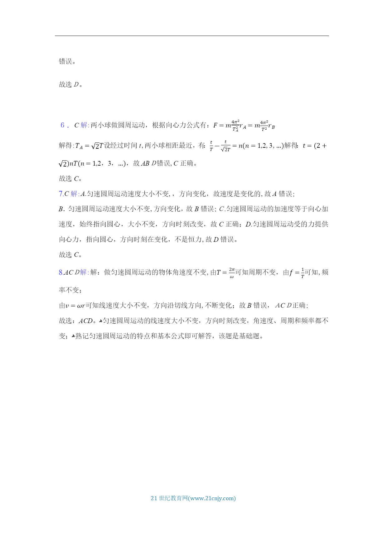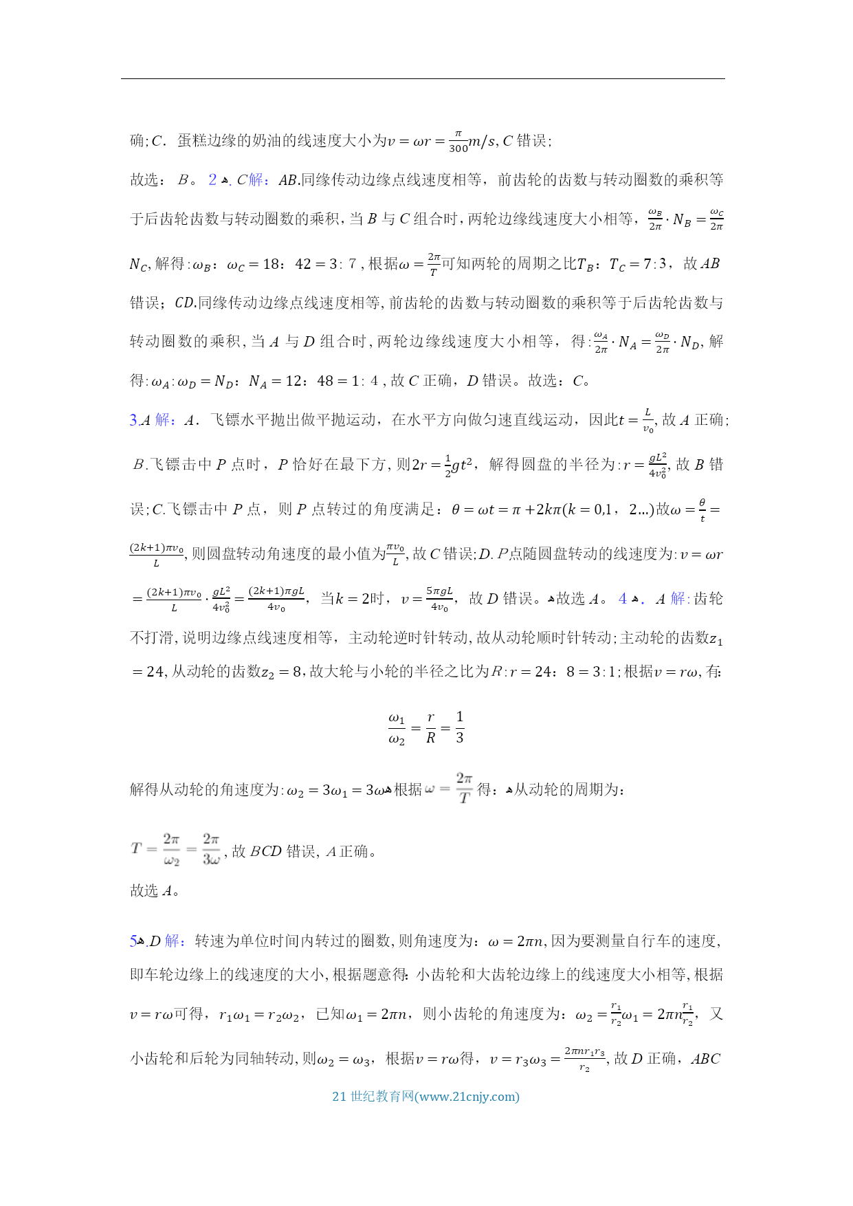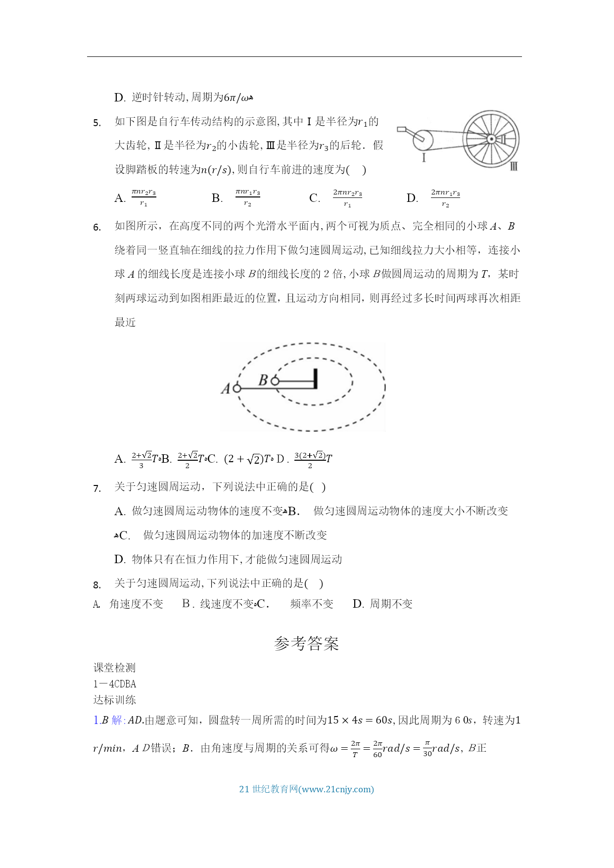 HYPERLINK"http://www.21cnjy.com/"21世纪教育网(www.21cnjy.com)《6.1圆周运动》学案【学习目标】1.认识圆周运动。2.理解线速度、角速度和周期的概念,会用它们的公式进行计算。3.理解线速度、角速度、周期之间的关系4.理解匀速圆周运动是变速运动。【课堂合作探究】变速自行车高速时,使用大齿轮和小齿轮怎样连接?请观看视频,为什么杯子口部比底部跑得快?观看视频,你是否在游乐园玩过,你在上面的运动轨迹是什么?一、线速度1、圆周运动的概念:举举你所知道的圆周运动?自行车的大齿轮、小齿轮、后轮中的质点都在做圆周运动。那些点运动的更快些?我们怎样描述物体运动的快慢呢?任务一:请同学们阅读课本23-24页线速度部分,回答一下问题:线速度的物理意义?什么是线速度?线速度的大小计算公式?线速度的单位是什么?线速度的方向如何?(6)什么是匀速圆周运动?匀速圆周运动中的“匀速”指速度不变吗?角速度任务二:请同学们阅读课本24-25页角速度部分,回答一下问题:角速度的物理意义?什么是角速度?角速度速度的大小计算公式?角速度的单位是什么?什么是圆周运动的转速?什么圆周运动的周期?周期其他描述圆周运动的物理量周期T:频率f:转速n:描述圆周运动的各个物理量的关系思考:一物体做半径为r的匀速圆周运动,它在周期T内转过的弧长为多少?思考:由此可知它的线速度为多少;物体的角速度为多少?1.圆周运动运动快慢的描述物理量的关系:匀速圆周运动除了线速度大小不变,还有哪些物理量不变两个重要推论(1)传动问题同一传动带各轮边缘同轴问题同轴轮上各点的讨论:匀速圆周运动是什么性质的运动?线速度角度:角速度方面:周期方面:频率方面:转速方面:【课堂检测】1.关于圆周运动,以下说法中正确的是()A.做圆周运动的物体速度是变化的,做匀速圆周运动的物体速度是不变的B.做圆周运动的物体加速度是变化的,做匀速圆周运动的物体加速度是恒定的C.做圆周运动的物体受到的合外力方向不一定指向圆心D.做匀速圆周运动物体的受到的合外力不一定等于向心力2.物体做匀速圆周运动的条件是()A.有一定的初速度,且受到一个始终与初速度垂直的恒力作用B.有一定的初速度,且受到一个大小不变、方向变化的力的作用C.有一定的初速度,且受到一个方向始终指向圆心的力的作用D.有一定的初速度,且受到一个大小不变、方向始终和速度垂直的合力作用3.如图所示是一个玩具陀螺,a、b和c是陀螺上的三个点。当陀螺绕垂直于地面的轴线以角速度ω稳定旋转时,下列表述正确的是()A.a、b和c三点的线速度大小相等B.a、b和c三点的角速度相等C.a、b的角速度比c的大D.c的线速度比a、b的大4.如图所示,甲、乙、丙三个轮子依靠摩擦传动,相互之间不打滑,其半径分别为r1、r2、r3。若甲轮的角速度为ω1,则丙轮的角速度为()【达标训练】一、单选题嘉兴某高中开设了糕点制作的选修课,小明同学在体验糕点制作的“裱花”环节时,如下图所示,他在绕中心匀速转动的圆盘上放了一块直径8英寸(20cm)的蛋糕,在蛋糕边缘上每隔4s“点”一次奶油,蛋糕随圆盘转一周后均匀“点”上了15次奶油,则下列说法正确的是( )A.圆盘转动的转速约为2πr/minﻫB.圆盘转动的角速度大小约为π30rad/sC.蛋糕边缘的奶油的线速度大小约为π3m/sﻫD.圆盘转动的周期约为4s变速自行车靠变换齿轮组合来改变行驶速度.如图是某一变速车齿轮传动结构示意图,图中A轮有48齿,B轮有42齿,C轮有18齿,D轮有12齿,则下列选项正确的是( )A.当B轮与C轮组合时,两轮边缘上的点的线速度之比νB:νC=7:3ﻫB.当B轮与C轮组合时,两轮的周期之比TB:TC=3:7ﻫC.当A轮与D轮组合时,两轮的角速度之比ωA:ωB=1:4ﻫD.当A轮与D轮组合时,两轮的角速度之比ωA:ωD=4:1如图所示,一位同学玩飞镖游戏.圆盘最上端有一P点,飞镖抛出时与P等高,且距离P点为L.当飞镖以初速度v0垂直盘面瞄准P点抛出的同时,圆盘以经过盘心O点的水平轴在竖直平面内匀速转动.忽略空气阻力,重力加速度为g,若飞镖恰好击中P点,则()A.飞镖击中P点所需的时间为Lv0ﻫB.圆盘的半径可能为gL22v02C.圆盘转动角速度的最小值为2πv0LﻫD.P点随圆盘转动的线速度不可能为5πgL4v0如下图所示的齿轮传动装置中,主动轮和从动轮的齿大小相