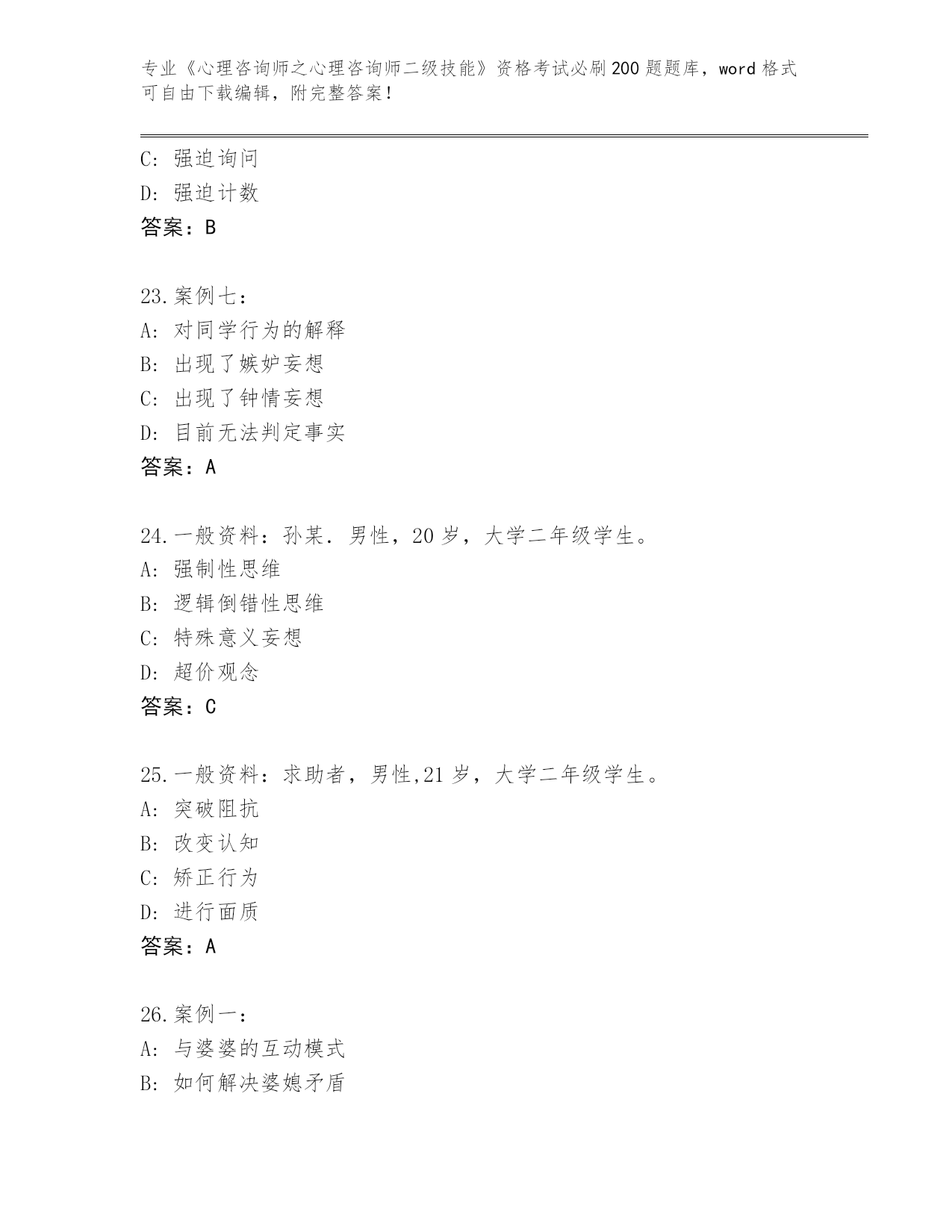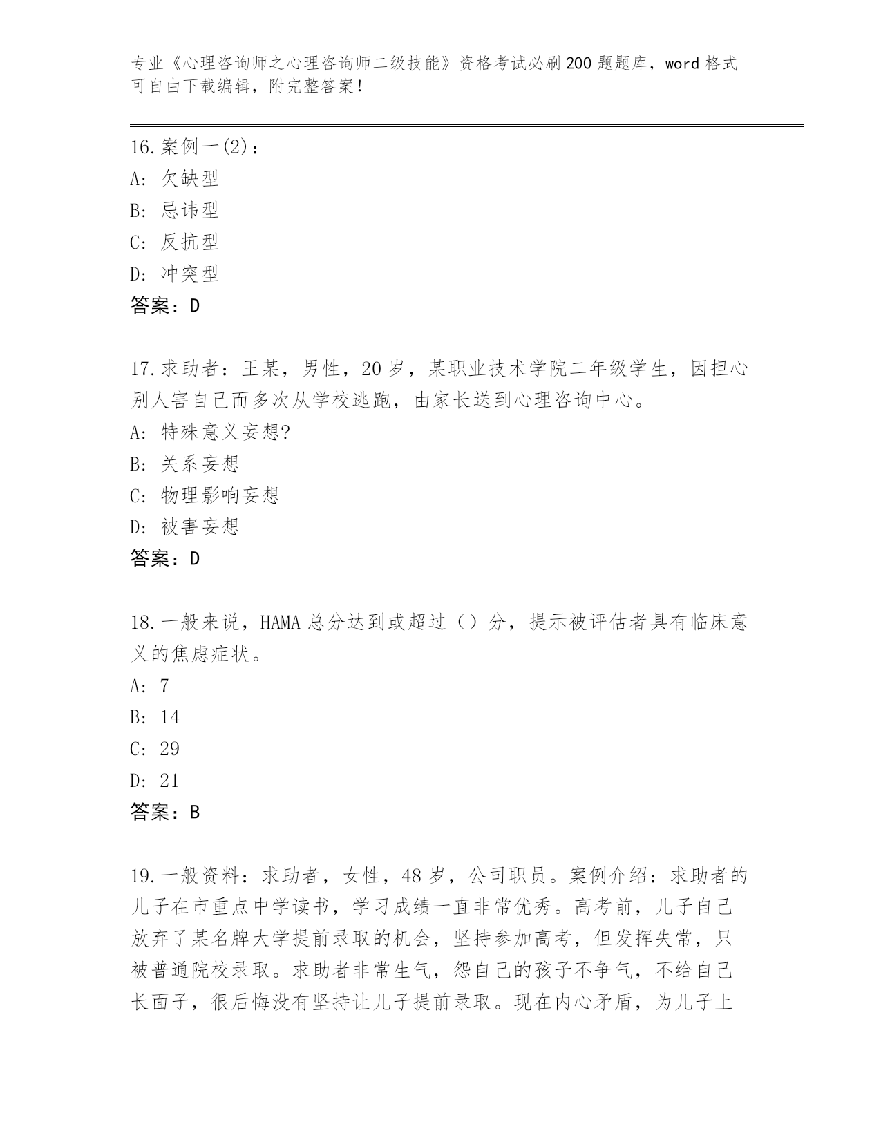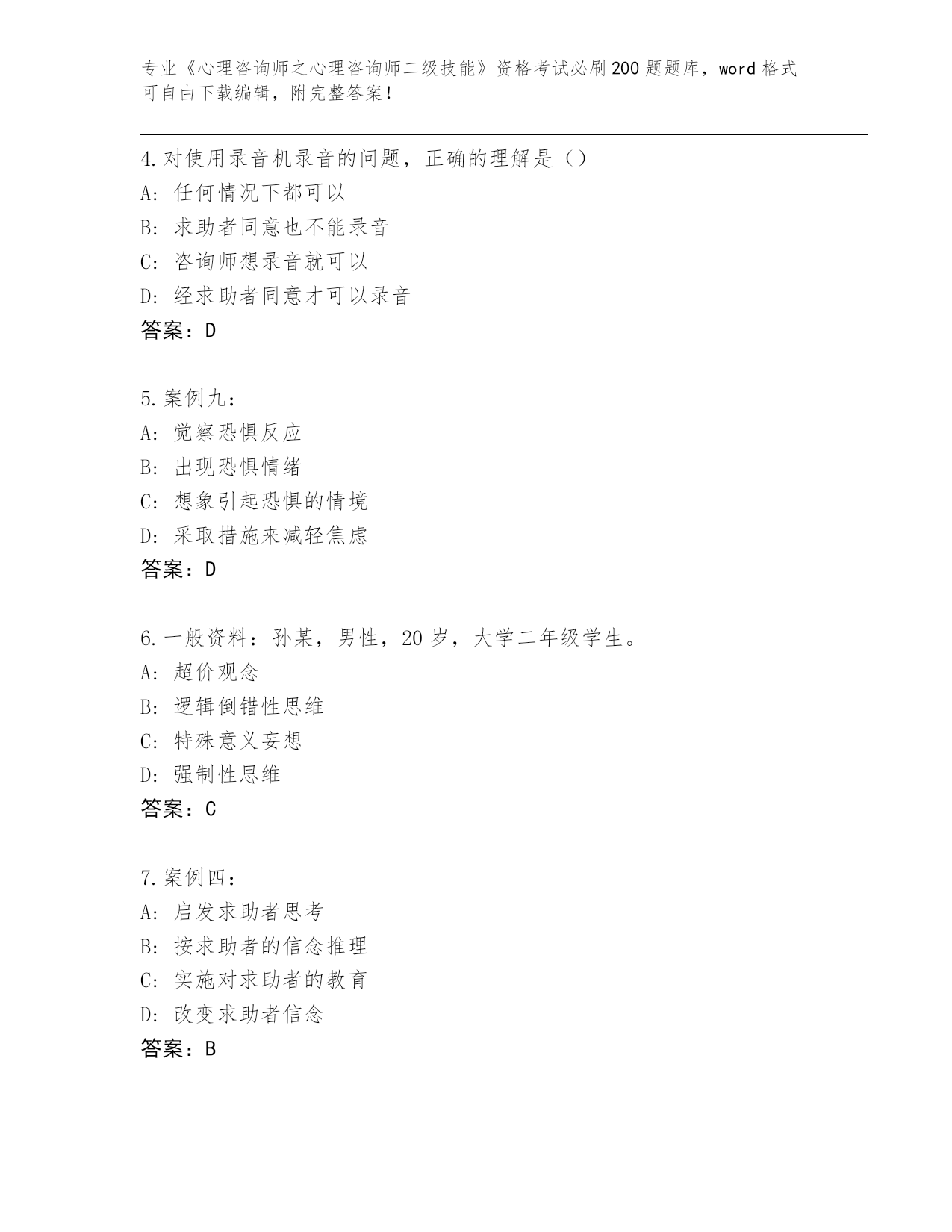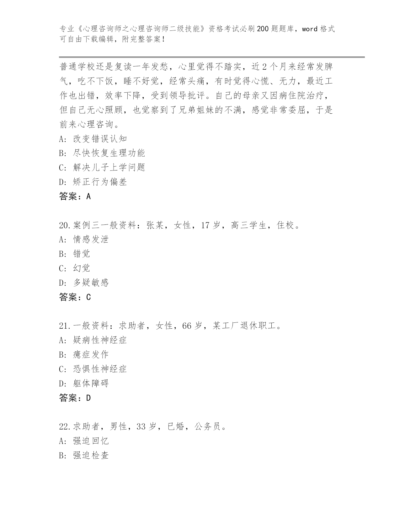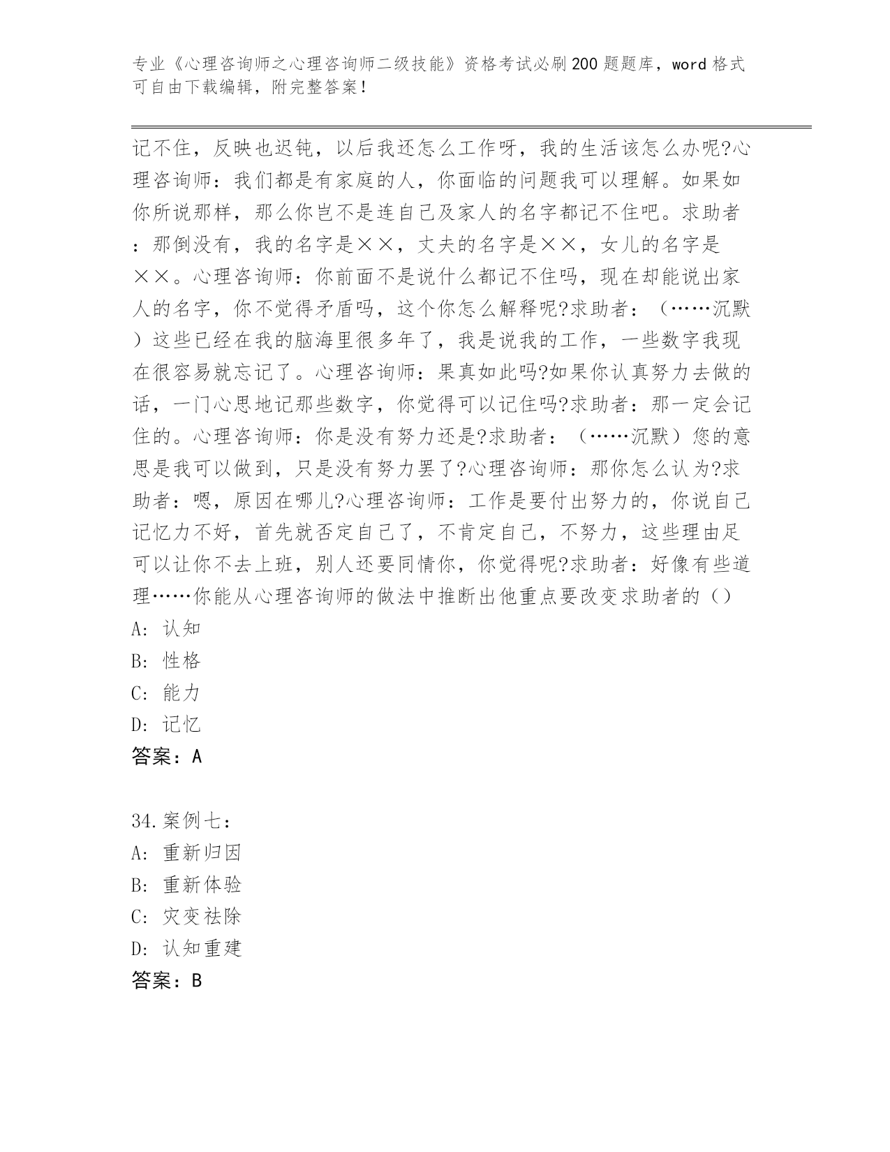 内部使用河南省《心理咨询师之心理咨询师二级技能》资格考试必刷200题真题题库【满分必刷】
