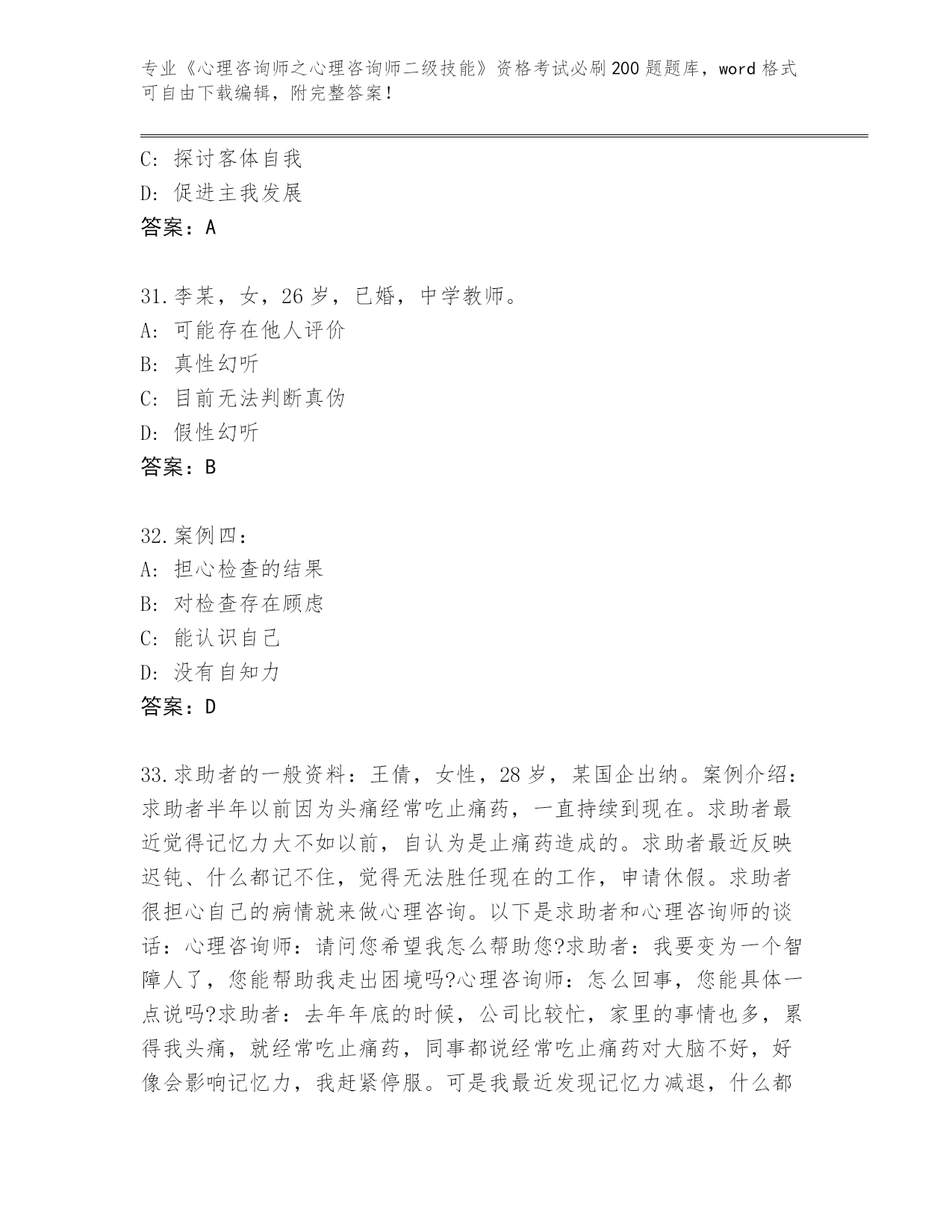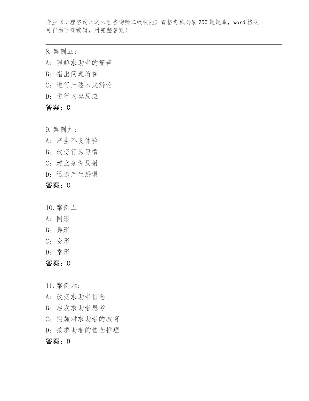 湖北省江夏区内部使用《心理咨询师之心理咨询师二级技能》资格考试必背200题及答案(易错题)