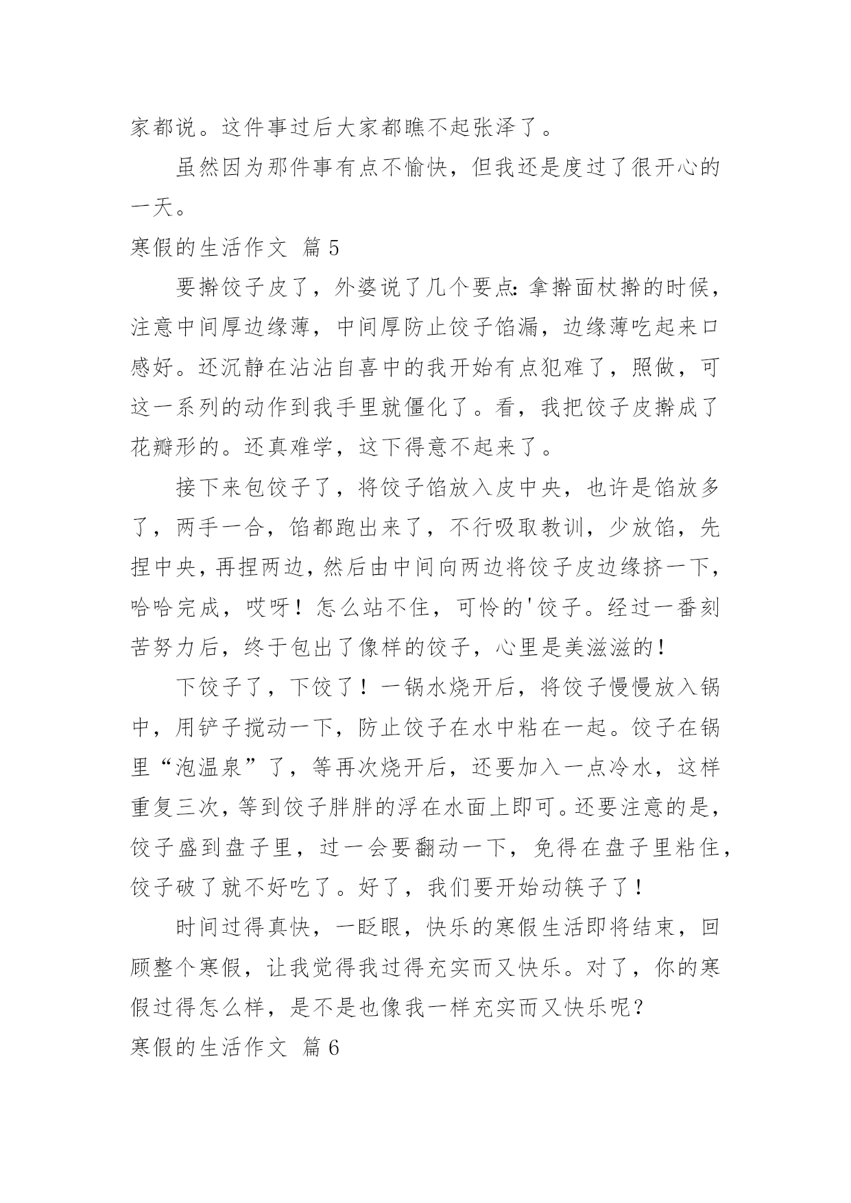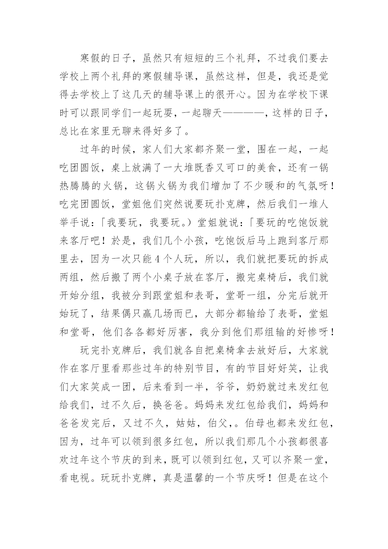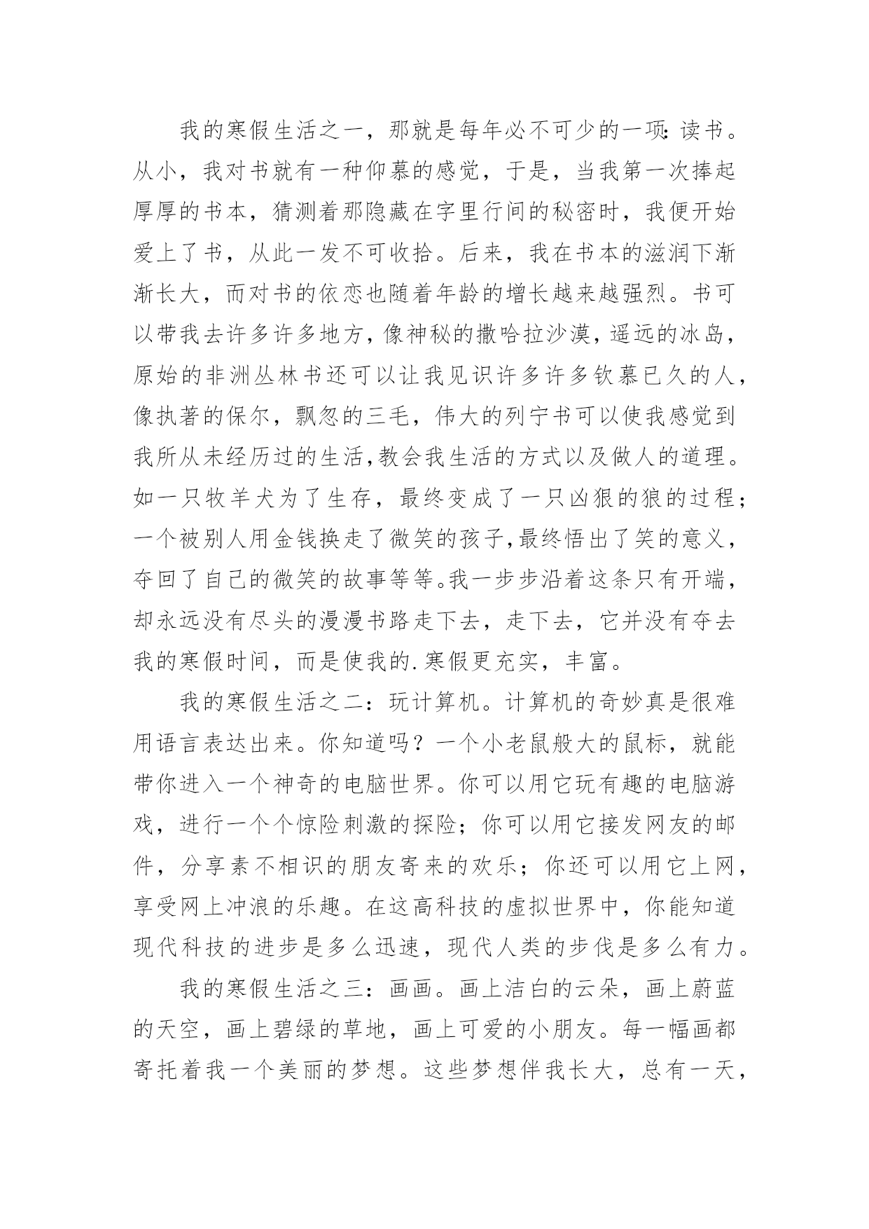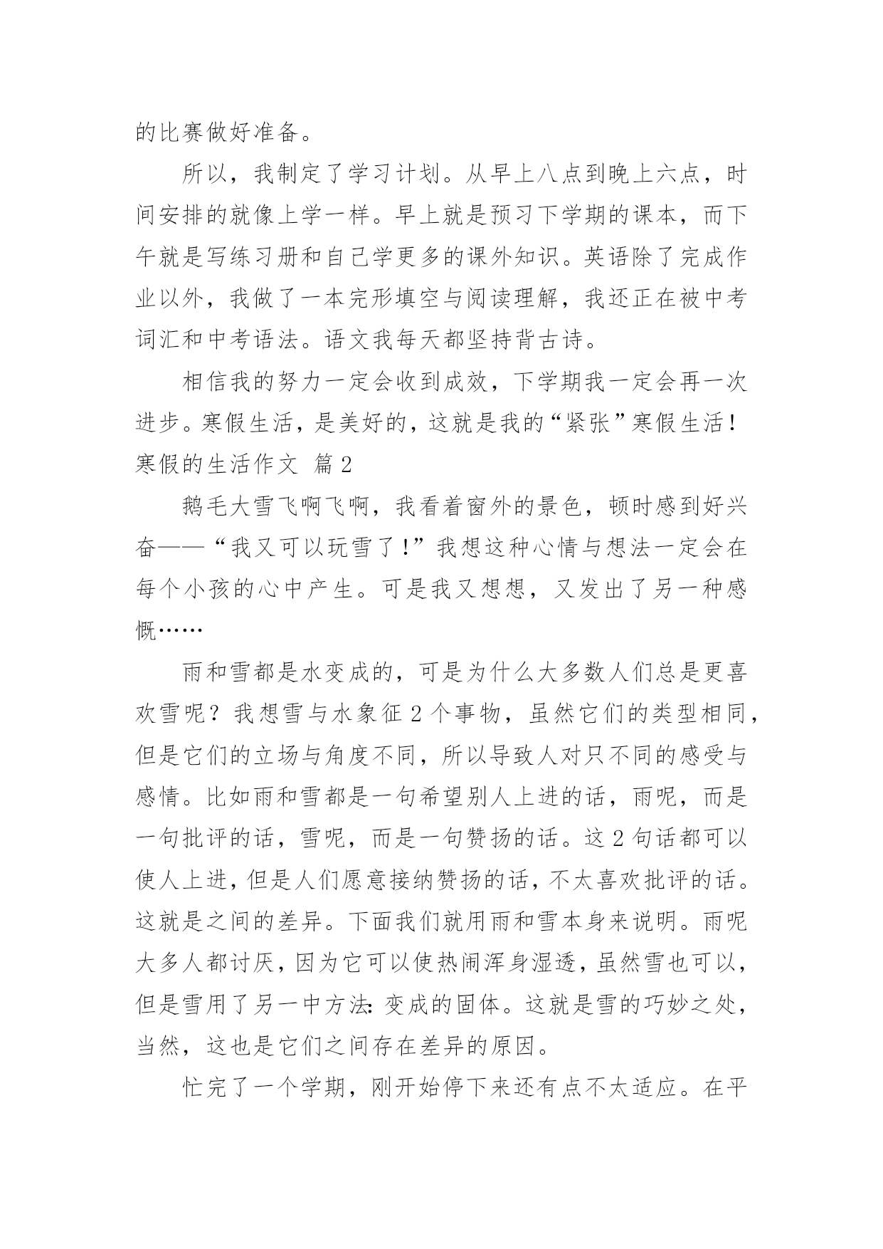寒假的生活作文关于寒假的生活作文汇总八篇无论在学习、工作或是生活中,许多人都写过作文吧,作文是人们以书面形式表情达意的言语活动。相信很多朋友都对写作文感到非常苦恼吧,下面是小编收集整理的寒假的生活作文8篇,欢迎大家分享。寒假的生活作文篇1期末考试结束了,告别了老师,告别了同学。我的假期自由生活开始喽!和同学相比,我的假期是自由的,我不用整天背着小书包,在补课班学这学那,这都是家长的英明教导啊!同学们都羡慕我:“你多好啊!在家闲着!”其实我的生活也早有计划了,丝毫不比你们轻。一学期的学习,我已经清楚了我学习的薄弱环节,这个假期,我一定要努力,把不好的学科提上去!外地的学生到沈阳来在英语方面比较较弱是不可避免的。英语老师的指导,已经让我懂得了怎样去弥补和别人的差距。其实有自学能力的人是完全可以自学英语的。老师给我指出了几点我的不足:第一我的词汇量不够,阅读面不是很广,主要是因为平时缺乏英文文章的阅读。第二就是答题技巧,要做更多的阅读或完形填空题。所以,这假期我要对自己“狠”一点。数学和语文嘛,我自认为学得很好。只是语文的古诗,我背的'太少了,所以我要多多的背,为开学的比赛做好准备。所以,我制定了学习计划。从早上八点到晚上六点,时间安排的就像上学一样。早上就是预习下学期的课本,而下午就是写练习册和自己学更多的课外知识。英语除了完成作业以外,我做了一本完形填空与阅读理解,我还正在被中考词汇和中考语法。语文我每天都坚持背古诗。相信我的努力一定会收到成效,下学期我一定会再一次进步。寒假生活,是美好的,这就是我的“紧张”寒假生活!寒假的生活作文篇2鹅毛大雪飞啊飞啊,我看着窗外的景色,顿时感到好兴奋——“我又可以玩雪了!”我想这种心情与想法一定会在每个小孩的心中产生。可是我又想想,又发出了另一种感慨……雨和雪都是水变成的,可是为什么大多数人们总是更喜欢雪呢?我想雪与水象征2个事物,虽然它们的类型相同,但是它们的立场与角度不同,所以导致人对只不同的感受与感情。比如雨和雪都是一句希望别人上进的话,雨呢,而是一句批评的话,雪呢,而是一句赞扬的话。这2句话都可以使人上进,但是人们愿意接纳赞扬的话,不太喜欢批评的话。这就是之间的差异。下面我们就用雨和雪本身来说明。雨呢大多人都讨厌,因为它可以使热闹浑身湿透,虽然雪也可以,但是雪用了另一中方法:变成的固体。这就是雪的巧妙之处,当然,这也是它们之间存在差异的原因。忙完了一个学期,刚开始停下来还有点不太适应。在平时学习时,每天都和大家相处在一起,虽然我们也会调皮,但离开他们太久,心里还是惦念着他们回家已经有好几天了,在这几天里,我也在想这个寒假我将如何度过了,是向往年那样呆在家里看电视,或是到同学家里串串门子还是做点其他的。但一想起这些,就想起了刚放假时校长给我们布置的寒假作业,可能在别人看来很奇怪吧,校长怎么还会布置寒假作业,其实校长是让我们在寒假里多看书,多学习,为来期做好准备。其实这样也挺好的,让我们以后的工作制定目标,为了将明年的工作做得更好。现在每天在家里看看书,练练字,也感觉自己的寒假生活挺充实的.今天放晴了,看着这样的好天气心里特别高兴,同时还有就是今天是我们初中同学相聚的日子。早上,吃完早餐我早早地就从家里出发了,朝着我们的母校走去。时间不知不觉过去了,终于来到了我们的母校。一走进校园,以前的景象历历在目,顿时心底涌上了一种亲切感,同时也发现我们的母校发生了很大的变化。沿着林荫小道,我来到了我们聚会的地点——以前读书的教室,这时已经有好几个同学到了,我加快脚步,大声地喊着她们的名字,这时自然有一番问候了,而且每个人脸上的惊喜之情都表露无疑。接下来在大家的笑声中同学们陆陆续续地都来了,在一片问候声后我们朝着老师的家走去。我们的班主任依然如当年一样,说话特别幽默,风趣。在接下去的时间就是大家聚餐,娱乐……自从读书以来,我印象最深的事就是几乎我的每个语文老师都要求我们把字写好,要求我们练字,。那时虽然听老师说,但并未坚持下来,只是偶尔练一练,现在看着自己的字还真的有点后悔当初浪费了太多的时间,没有把字练好。正好今年放寒假时学校校长给我们布置寒假作业,我想就利用寒假时间来练一练字吧但是坚持三天后,每天练两页,到了第四天,心就有点痒了,想想还是算了吧,反正一下子字也不会写好的,但另一个声音又在耳边想起,要坚持,不要轻言放弃呀。最后经过矛盾的争扎,我还是坚持了下来。尤其是当我碰到不顺心的事情时,我就拿出纸和笔,安静的练起字来,结果什么烦心事都没了。现在练字已经成为我生活的一种习惯,如里哪天不练倒觉得好像还有一件事情没完成。经过自己的努力,现在我的字有了一定的进步,今后我还将继续坚持下去。一年结束了,在除夕夜是团圆夜,家家户户都张灯结彩的,庆祝一年平安结束,新的一年好的开始。在除夕这天,家家都忙着贴春联