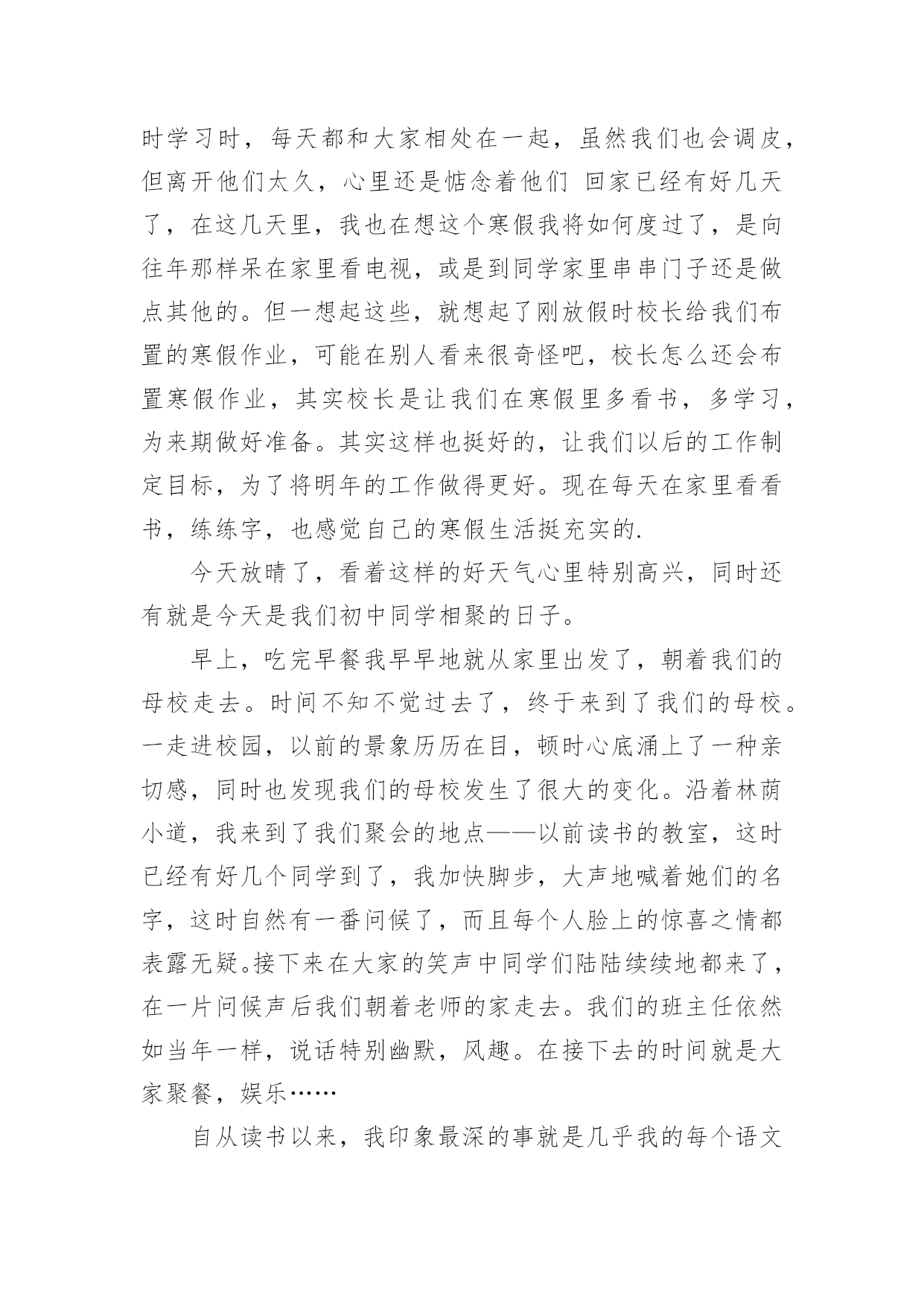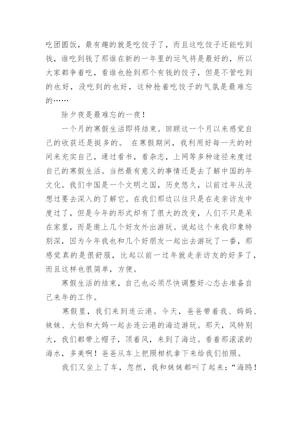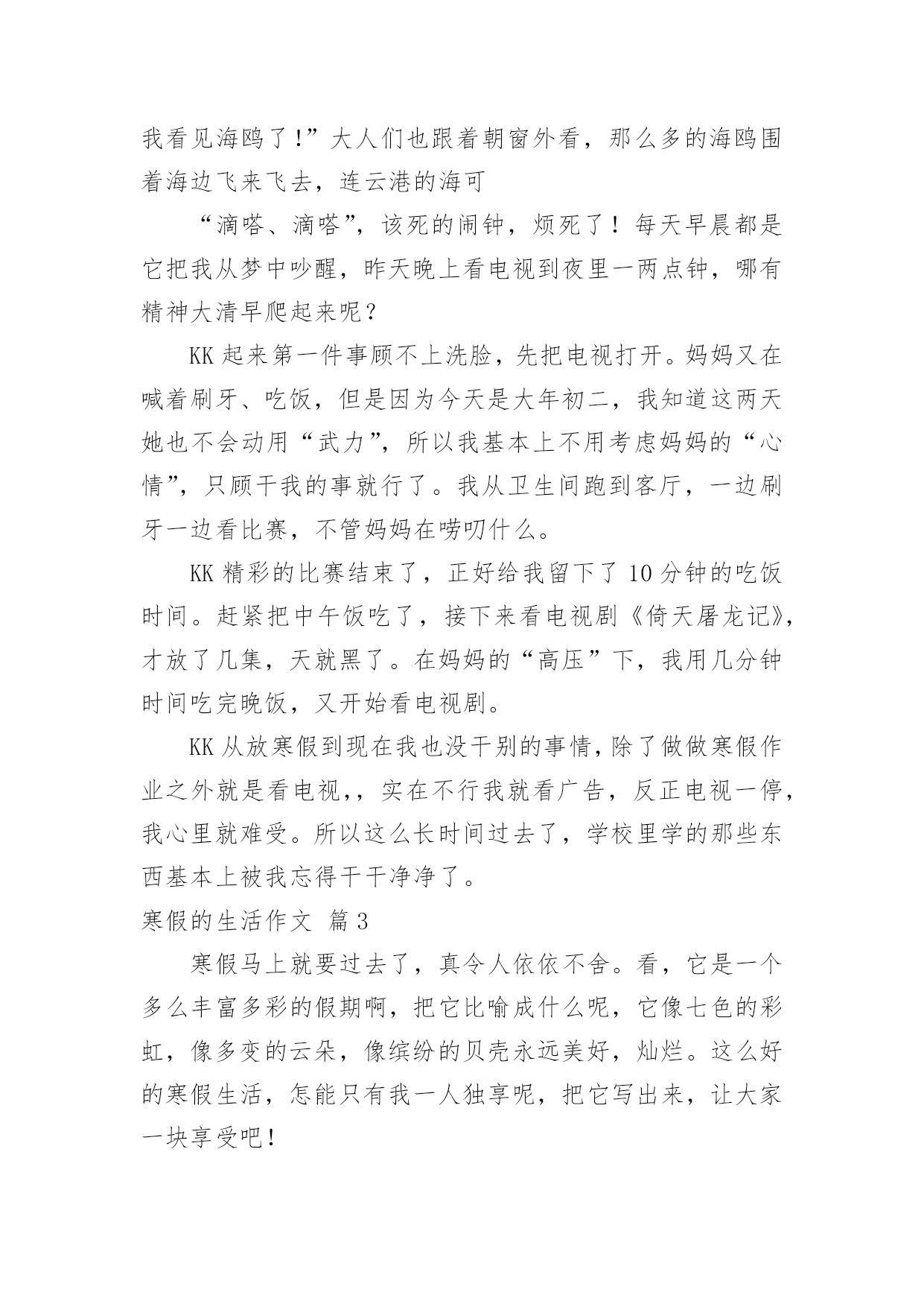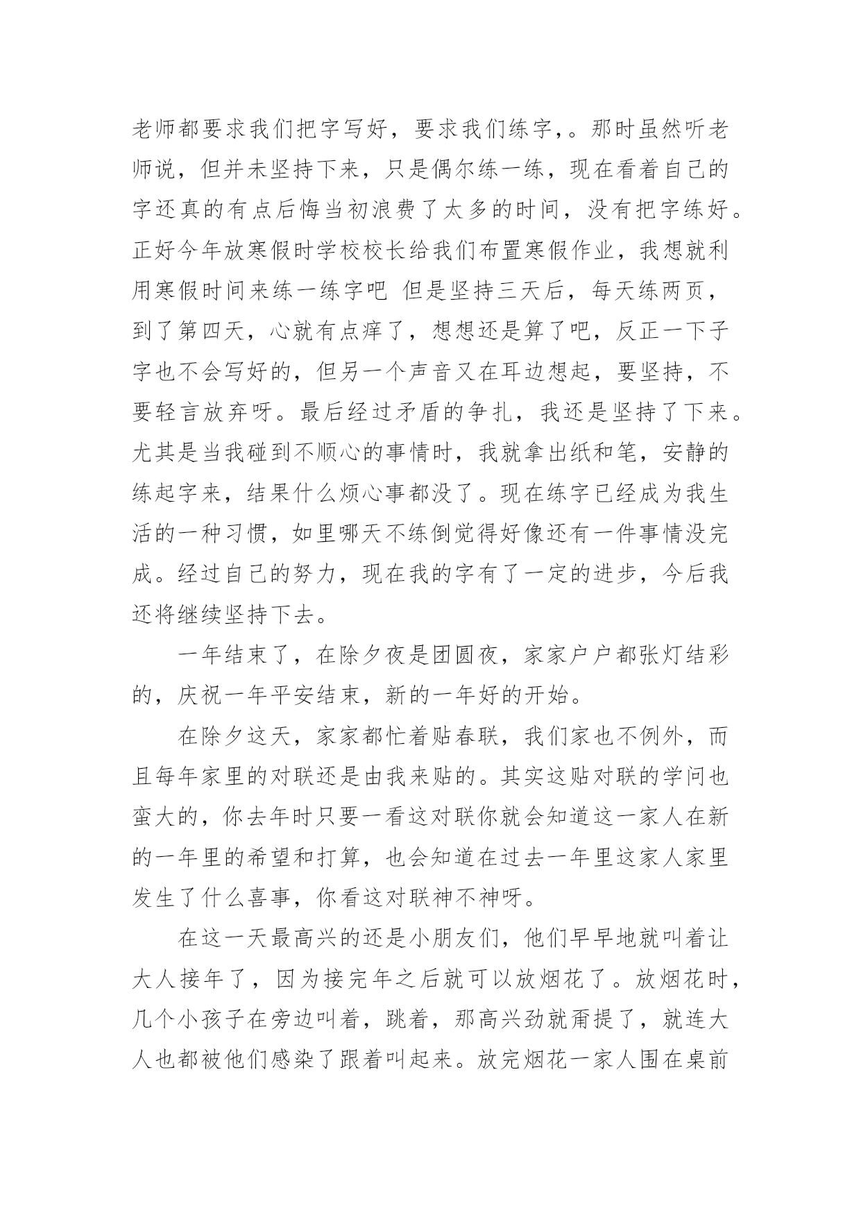 寒假的生活作文关于寒假的生活作文汇总八篇无论在学习、工作或是生活中,许多人都写过作文吧,作文是人们以书面形式表情达意的言语活动。相信很多朋友都对写作文感到非常苦恼吧,下面是小编收集整理的寒假的生活作文8篇,欢迎大家分享。寒假的生活作文篇1期末考试结束了,告别了老师,告别了同学。我的假期自由生活开始喽!和同学相比,我的假期是自由的,我不用整天背着小书包,在补课班学这学那,这都是家长的英明教导啊!同学们都羡慕我:“你多好啊!在家闲着!”其实我的生活也早有计划了,丝毫不比你们轻。一学期的学习,我已经清楚了我学习的薄弱环节,这个假期,我一定要努力,把不好的学科提上去!外地的学生到沈阳来在英语方面比较较弱是不可避免的。英语老师的指导,已经让我懂得了怎样去弥补和别人的差距。其实有自学能力的人是完全可以自学英语的。老师给我指出了几点我的不足:第一我的词汇量不够,阅读面不是很广,主要是因为平时缺乏英文文章的阅读。第二就是答题技巧,要做更多的阅读或完形填空题。所以,这假期我要对自己“狠”一点。数学和语文嘛,我自认为学得很好。只是语文的古诗,我背的'太少了,所以我要多多的背,为开学的比赛做好准备。所以,我制定了学习计划。从早上八点到晚上六点,时间安排的就像上学一样。早上就是预习下学期的课本,而下午就是写练习册和自己学更多的课外知识。英语除了完成作业以外,我做了一本完形填空与阅读理解,我还正在被中考词汇和中考语法。语文我每天都坚持背古诗。相信我的努力一定会收到成效,下学期我一定会再一次进步。寒假生活,是美好的,这就是我的“紧张”寒假生活!寒假的生活作文篇2鹅毛大雪飞啊飞啊,我看着窗外的景色,顿时感到好兴奋——“我又可以玩雪了!”我想这种心情与想法一定会在每个小孩的心中产生。可是我又想想,又发出了另一种感慨……雨和雪都是水变成的,可是为什么大多数人们总是更喜欢雪呢?我想雪与水象征2个事物,虽然它们的类型相同,但是它们的立场与角度不同,所以导致人对只不同的感受与感情。比如雨和雪都是一句希望别人上进的话,雨呢,而是一句批评的话,雪呢,而是一句赞扬的话。这2句话都可以使人上进,但是人们愿意接纳赞扬的话,不太喜欢批评的话。这就是之间的差异。下面我们就用雨和雪本身来说明。雨呢大多人都讨厌,因为它可以使热闹浑身湿透,虽然雪也可以,但是雪用了另一中方法:变成的固体。这就是雪的巧妙之处,当然,这也是它们之间存在差异的原因。忙完了一个学期,刚开始停下来还有点不太适应。在平时学习时,每天都和大家相处在一起,虽然我们也会调皮,但离开他们太久,心里还是惦念着他们回家已经有好几天了,在这几天里,我也在想这个寒假我将如何度过了,是向往年那样呆在家里看电视,或是到同学家里串串门子还是做点其他的。但一想起这些,就想起了刚放假时校长给我们布置的寒假作业,可能在别人看来很奇怪吧,校长怎么还会布置寒假作业,其实校长是让我们在寒假里多看书,多学习,为来期做好准备。其实这样也挺好的,让我们以后的工作制定目标,为了将明年的工作做得更好。现在每天在家里看看书,练练字,也感觉自己的寒假生活挺充实的.今天放晴了,看着这样的好天气心里特别高兴,同时还有就是今天是我们初中同学相聚的日子。早上,吃完早餐我早早地就从家里出发了,朝着我们的母校走去。时间不知不觉过去了,终于来到了我们的母校。一走进校园,以前的景象历历在目,顿时心底涌上了一种亲切感,同时也发现我们的母校发生了很大的变化。沿着林荫小道,我来到了我们聚会的地点——以前读书的教室,这时已经有好几个同学到了,我加快脚步,大声地喊着她们的名字,这时自然有一番问候了,而且每个人脸上的惊喜之情都表露无疑。接下来在大家的笑声中同学们陆陆续续地都来了,在一片问候声后我们朝着老师的家走去。我们的班主任依然如当年一样,说话特别幽默,风趣。在接下去的时间就是大家聚餐,娱乐……自从读书以来,我印象最深的事就是几乎我的每个语文老师都要求我们把字写好,要求我们练字,。那时虽然听老师说,但并未坚持下来,只是偶尔练一练,现在看着自己的字还真的有点后悔当初浪费了太多的时间,没有把字练好。正好今年放寒假时学校校长给我们布置寒假作业,我想就利用寒假时间来练一练字吧但是坚持三天后,每天练两页,到了第四天,心就有点痒了,想想还是算了吧,反正一下子字也不会写好的,但另一个声音又在耳边想起,要坚持,不要轻言放弃呀。最后经过矛盾的争扎,我还是坚持了下来。尤其是当我碰到不顺心的事情时,我就拿出纸和笔,安静的练起字来,结果什么烦心事都没了。现在练字已经成为我生活的一种习惯,如里哪天不练倒觉得好像还有一件事情没完成。经过自己的努力,现在我的字有了一定的进步,今后我还将继续坚持下去。一年结束了,在除夕夜是团圆夜,家家户户都张灯结彩的,庆祝一年平安结束,新的一年好的开始。在除夕这天,家家都忙着贴春联