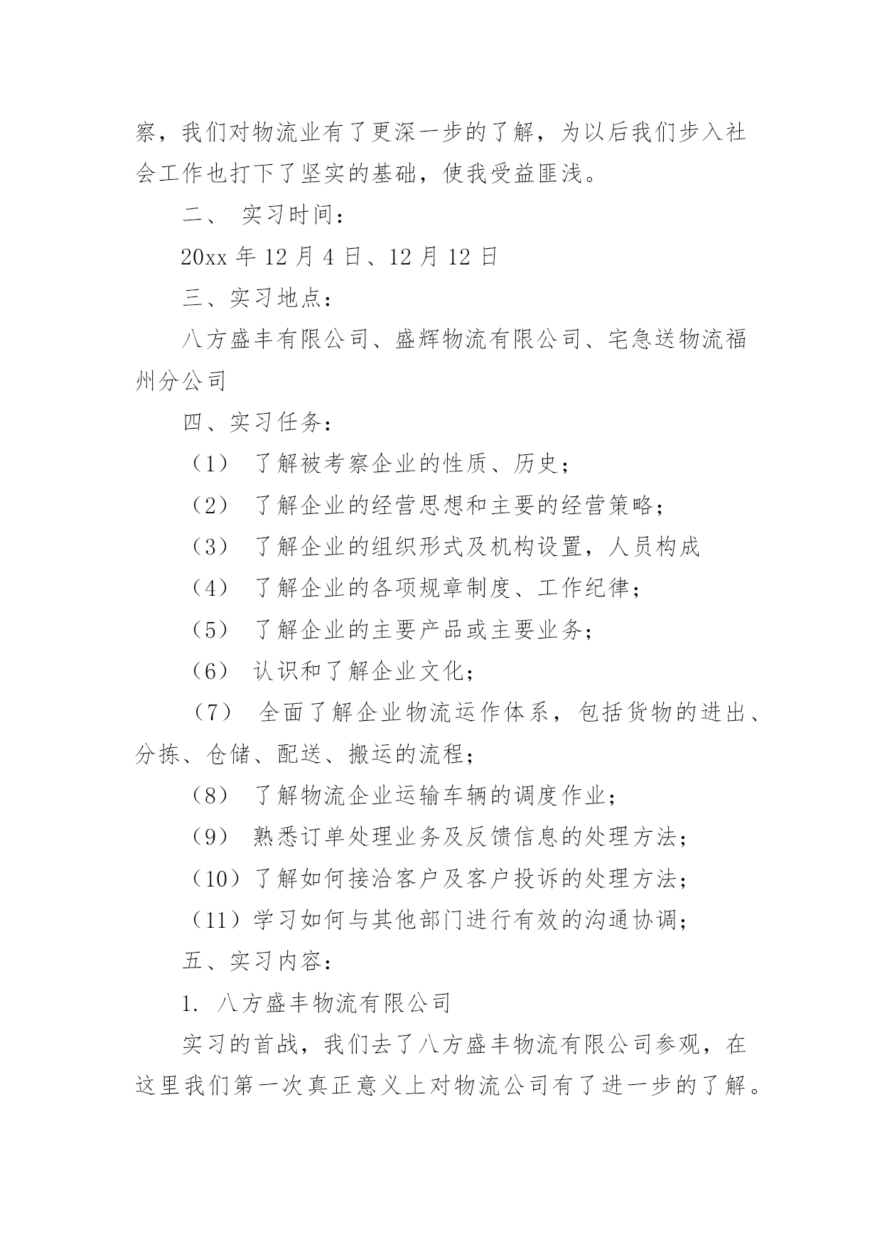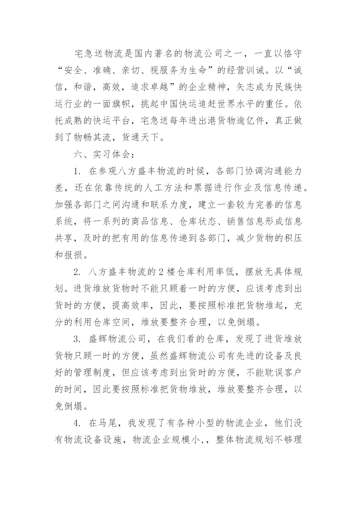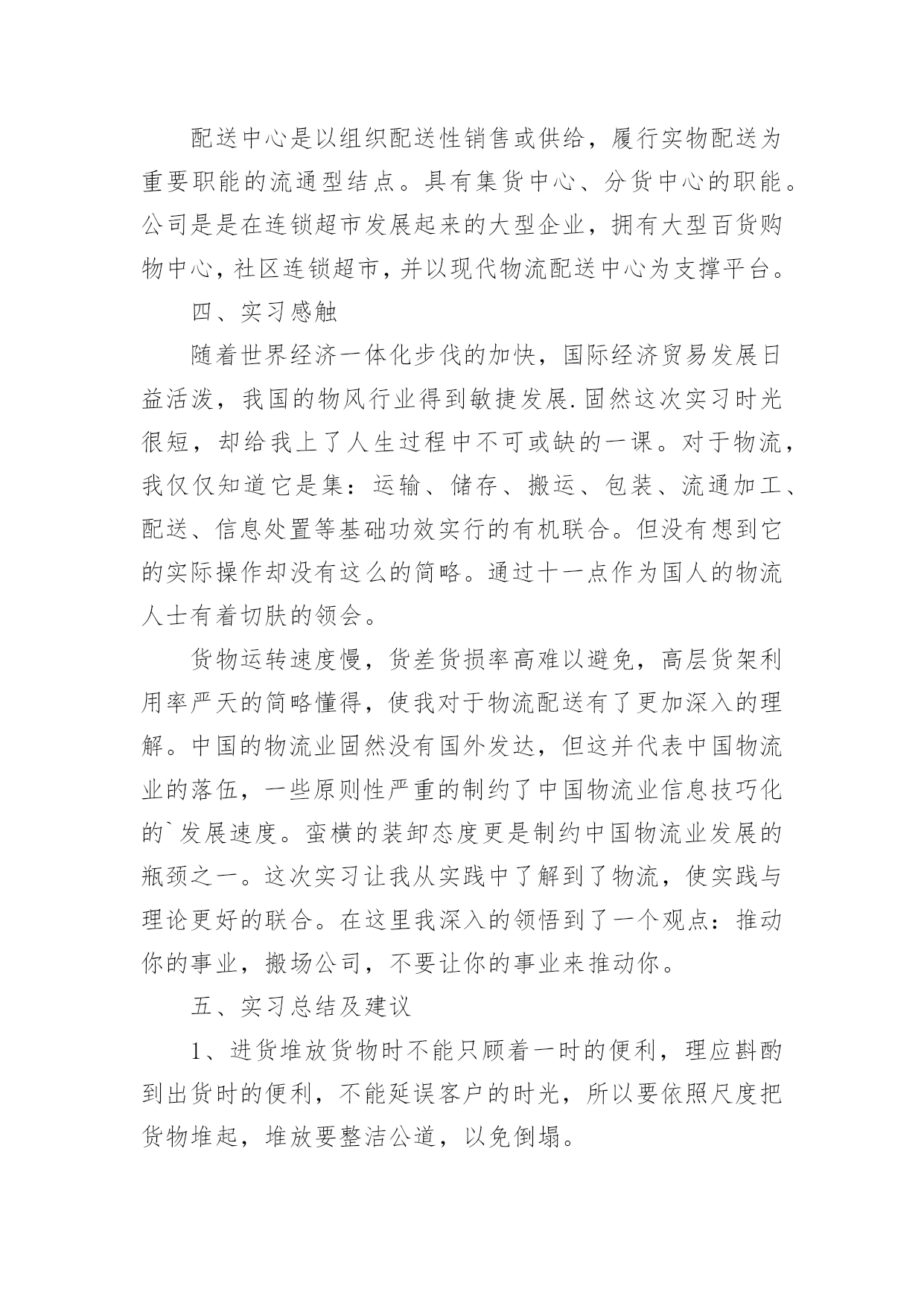 物流实习报告在生活中,我们使用报告的情况越来越多,报告中提到的所有信息应该是准确无误的。一听到写报告就拖延症懒癌齐复发?以下是小编为大家整理的物流实习报告,供大家参考借鉴,希望可以帮助到有需要的朋友。物流实习报告1本人是物流专业的学生,这段时间来在物流公司实习,了解了很多也学习到了很多,下头是我实习时候的一些心得和报告!一、实习目标为了以后能更好的适应工作和学习,学校组织到xx物流配送中心进行动期十天的实习。重要是为了懂得物流的作业流程,以便对我国的物流业能有更深的懂得。二、实习请求了解物流的特色,佳吉货运,主要装备和作业流程,对其进行剖析,并根据学习的理论提出自我的看法。三、实习单位简介配送中心是以组织配送性销售或供给,履行实物配送为重要职能的流通型结点。具有集货中心、分货中心的职能。xx公司是在xx连锁超市基本了发展起来的大型企业,拥有大型百货购物中心,社区连锁超市,中心城市方便岛为支柱的三大贸易,并以现代物流配送中心为支撑平台。xx物流配送中心是一个中等范围的物流配送基地,是综合性的物流配送中心。兼有转运和集散功效,也能够扩大至配送和流通加工的功效,所以在计划与设计方面可操作性更高。xxx物流配送中心重要分为:收货、分货、验货、退货四大部门,各个部分之间相互和谐和相互配合,密不可分。xx公司正逐步实现"以中心城市的中型百货购物中心和专业化超市为核心,以中小城市的大型综合超市和海方便岛为两翼,以现代化的大型物流配送中心为基本平台"的发展格式。诣在以多业态连锁发展、范围经营和方便服务为企业核心价值的西北地域最大的零售贸易平台。四、实习感触货物运转速度慢,货差货损率高难以避免,高层货架利用率严天的简略懂得,使我对于物流配送有了更加深入的认识。中国的物流业固然没有国外发达,但这并代表中国物流业的落伍,一些原则性[譬如中国劳动力便宜的国情]严重的制约了中国物流业信息技巧化的发展速度。蛮横的装卸态度更是制约中国物流业发展的'瓶颈之一。这次实习让我从实践中了解到了物流,使实践与理论更好的联合,在那里我深入的领悟到了一个观点:推进你的事业,搬场公司,不要让你的事业来推进你。五、实习结论及提议1、进货堆放货物时不能只顾着一时的便利,应当斟酌到出货时的便利,不能延误客户的时光,所以要依照尺度把货物堆起,堆放要整洁公道,以免倒塌。2、要严厉依照仓储治理的请求,对于过期的货物要及时与厂家接洽,并得到应允后及时烧毁,佳吉快运,不要堆积在仓库中,挥霍仓库容积,更不要和正常的商品同放一齐,带给人一种混乱无章的感到,应当另外筹备一间仓库,使那些一时无法烧毁的商品有处所储存。3、目前物流中心正面临很多问题,批次越来越多而批量却越来越小,造成物流治理上的一个难点,产前物流,企业内部物流,销售物流,在供给链的治理上如何把握住这三块之间的关系,国内的物流畅润太低,仅占5%,如何把利润搞上往,面临一系列的困难,物流中心还得多鉴戒国外的物流策略,提高自我企业的效益。实践是检验真理的唯一方法,仅有到实际中去,才能真正认识理论其中的意义。十分感激xx物流配送中心能给我这个难得的机会,让我受益匪浅。也十分感激学校给了我这个机会,为我的工作积累了经验,奠定了基础。物流实习报告2一、序言为了以后能更好的适应我们物流专业的学习,所以需要通过实习将我们学过的相关知识与具体的实践相结合,主要是了解物流的特点,仓储,装卸,搬运等基本的物流作业功能,熟悉物流的基本设备,运营管理,初步了解福建物流当前发展的现状。此次行业调研,虽然没有深入到物流公司的内部运作中去,但通过有关人员较全面深刻的讲解和实地考察,我们对物流业有了更深一步的了解,为以后我们步入社会工作也打下了坚实的基础,使我受益匪浅。二、实习时间:20xx年12月4日、12月12日三、实习地点:八方盛丰有限公司、盛辉物流有限公司、宅急送物流福州分公司四、实习任务:(1)了解被考察企业的性质、历史;(2)了解企业的经营思想和主要的经营策略;(3)了解企业的组织形式及机构设置,人员构成(4)了解企业的各项规章制度、工作纪律;(5)了解企业的主要产品或主要业务;(6)认识和了解企业文化;(7)全面了解企业物流运作体系,包括货物的进出、分拣、仓储、配送、搬运的流程;(8)了解物流企业运输车辆的调度作业;(9)熟悉订单处理业务及反馈信息的处理方法;(10)了解如何接洽客户及客户投诉的处理方法;(11)学习如何与其他部门进行有效的沟通协调;五、实习内容:1.八方盛丰物流有限公司实习的首战,我们去了八方盛丰物流有限公司参观,在这里我们第一次真正意义上对物流公司有了进一步的了解。在这次的参观过程中我们看到了一些物流公司所配备的工具、了解了出货与进货的具体流程、看见了公司成员的工作环境。参观期间,盛丰物流有限公司总经理助理,快安仓储中心陈经理