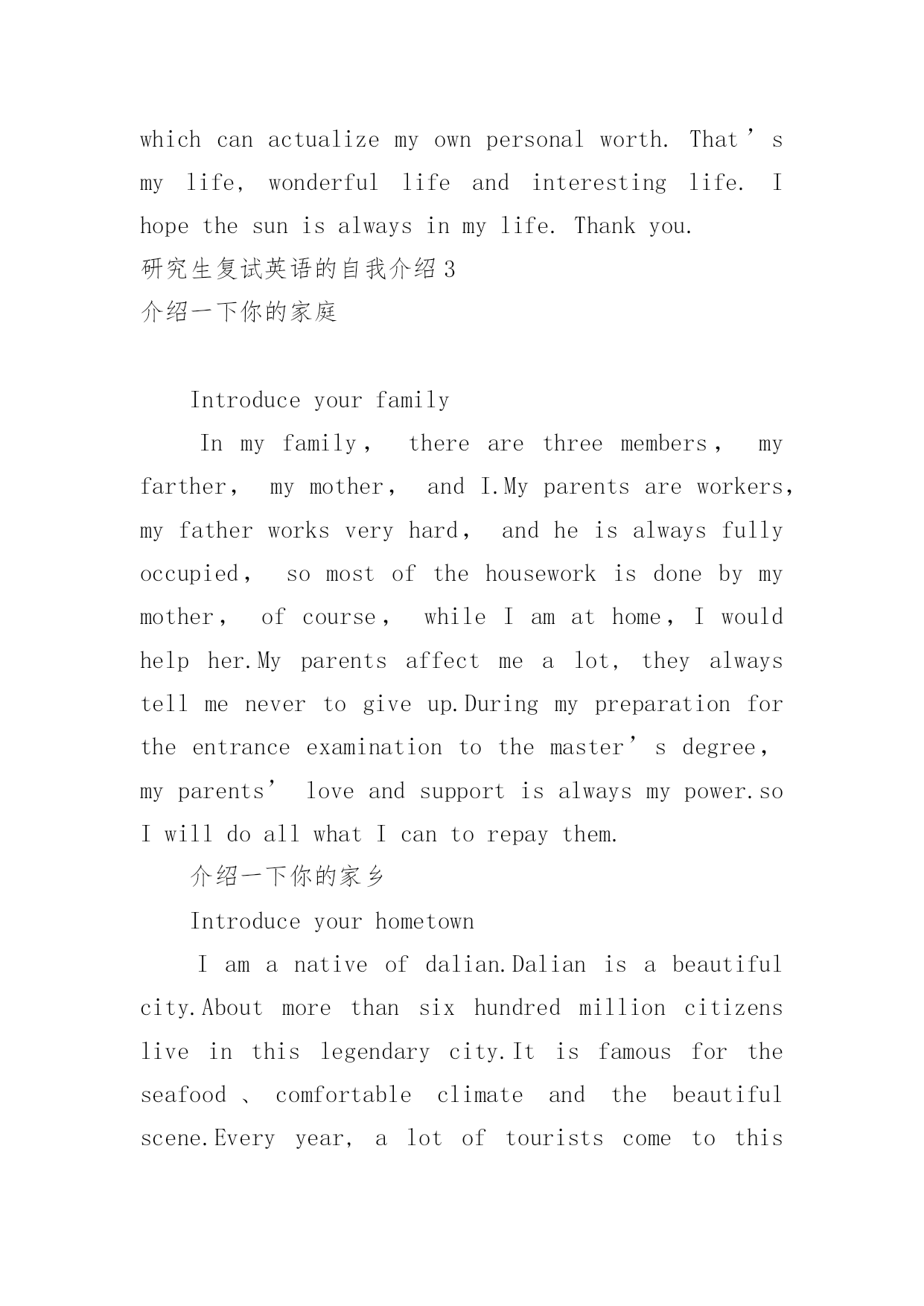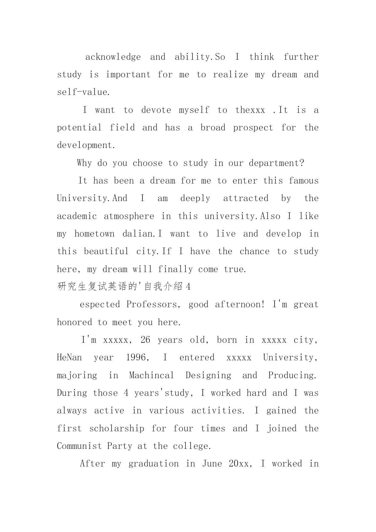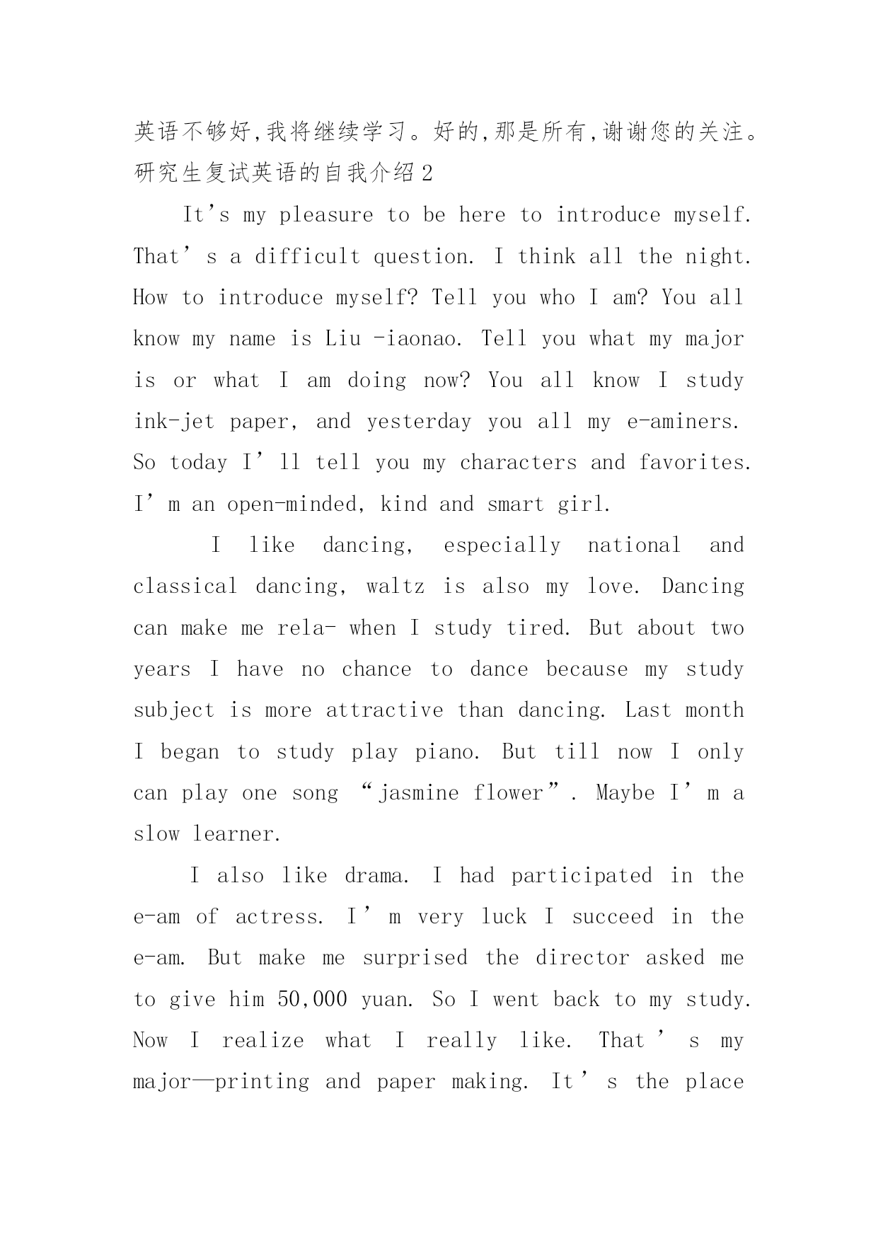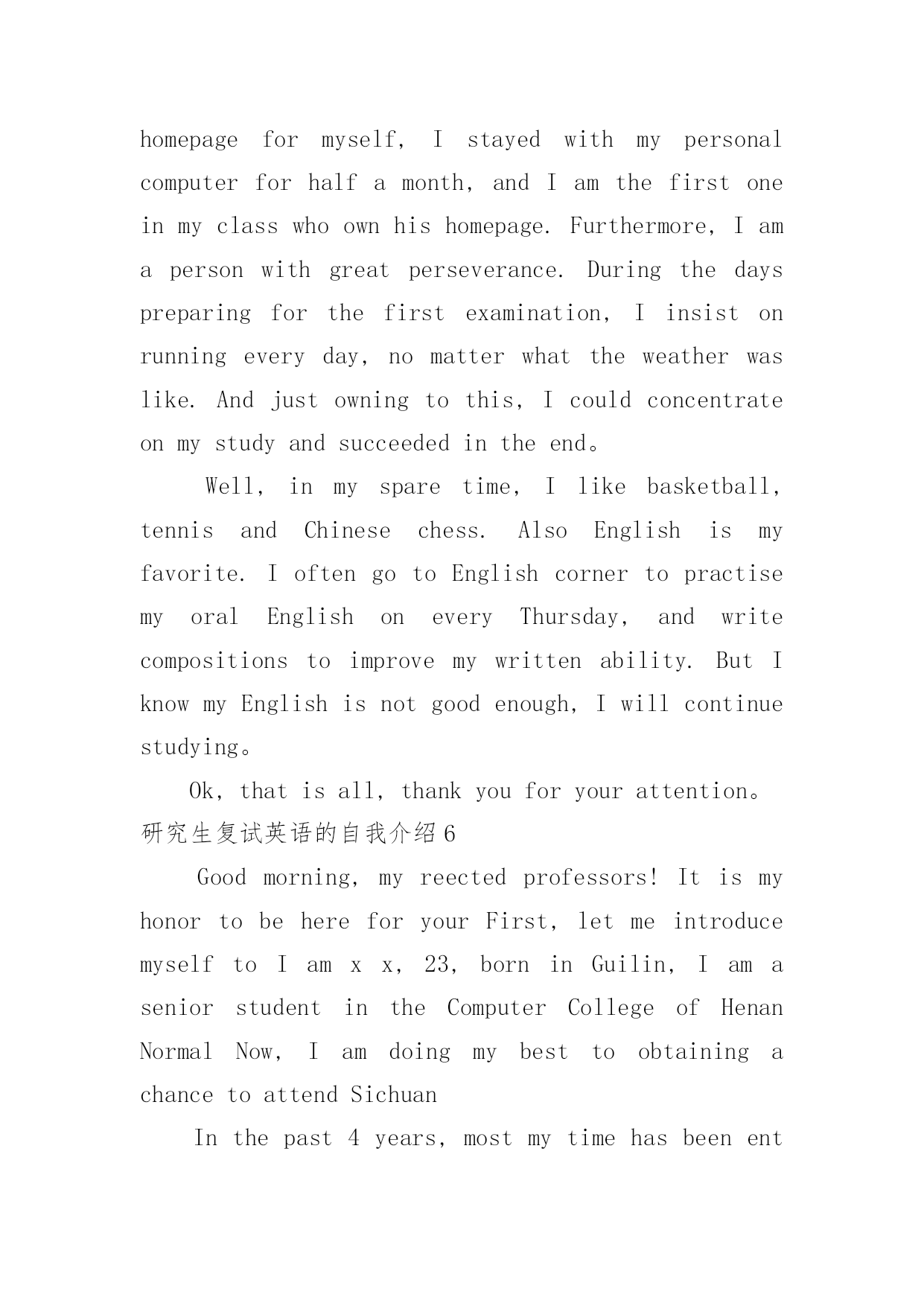 研究生复试英语的自我介绍研究生复试英语的自我介绍集锦15篇当碰到陌生人时候,可能需要我们进行自我介绍,自我介绍是认识自我的手段。相信许多人会觉得自我介绍很难写吧,以下是小编为大家收集的研究生复试英语的自我介绍,欢迎阅读与收藏。研究生复试英语的自我介绍1Goodmorning/afternoon,mydearteachers。Iamverygladtobehereforyourinterview.MynameisamXXXyearsold.IcomefromXXXXXXX,averybeautifulcity.MyundergraduateperiodwillbeaccomplishedinXXXXXXXuniversityinJuly,20xx.Andnow,IamtryingmybestforobtainingakeytoXXXXXXXXUniversity.Generallyspeaking,Iamahard-workingstudent.Iwilltrymybesttofinishitnomatterhowdifficultitis.WhenIwassophomore,Ifoundwebdesignveryinteresting,soIlearneditveryhard.Toweaveahomepageformyself,Istayedwithmypersonalcomputerforhalfamonth,andIamthefirstoneinmyclasswhoownhishomepage.Furthermore,Iamapersonwithgreatperseverance.Duringthedayspreparingforthefirstexamination,Iinsistonrunningeveryday,nomatterwhattheweatherwaslike.Andjustowningtothis,Icouldconcentrateonmystudyandsucceededintheend.Well,inmysparetime,Ilikebasketball,tennisandChinesechess.Also,Englishismyfavorite.IoftengotoEnglishcornertopracticemyoralEnglishoneveryThursday,andwritecompositionstoimprovemywrittenability.ButIknowmyEnglishisnotgoodenough,Iwillcontinuestudying.Ok,that‘sall,thankyouforyourattention.上午好/下午好,我亲爱的老师。我很高兴在这里为你的面试。我的名字叫XXX。我已经年了。我来自XXXX,一个非常美丽的城市。我的本科阶段将完成XXXXXXXuniversity7月,20xx年。现在,我在我最好的获取的关键在大学。一般来说,我是一个刻苦的学生。不管有多难,我都要尽力去完成它。我大二的时候,我发现网页设计很有趣,所以我学到的是非常困难的。为自己编织一个主页,我和我的个人电脑呆了半个月,我是第一个在我的课上他自己的`主页。此外,我是一个有毅力的人。第一天准备考试期间,我坚持每天跑步,不管天气是什么样子。就拥有,我可以专注于我的学习和成功。嗯,在我的业余时间,我喜欢篮球、网球和中国象棋。此外,英语是我的最爱。我经常去英语角练习我的英语口语在每个星期四,和写作文要提高我的书写能力。但我知道我的英语不够好,我将继续学习。好的,那是所有,谢谢您的关注。研究生复试英语的自我介绍2It’smypleasuretobeheretointroducemyself.That’sadifficultquestion.Ithinkallthenight.Howtointroducemyself?TellyouwhoIam?YouallknowmynameisLiu-iaonao.TellyouwhatmymajorisorwhatIamdoingnow?YouallknowIstudyink-jetpaper,andyesterdayyouallmye-aminers.SotodayI’lltellyoumycharactersandfavorites.I’manopen-minded,kindandsmartgirl.Ilikedancing,especiallynationalandclassicaldancing,waltzisalsomylove.Dancingcanmakemerela-whenIstudytired.ButabouttwoyearsIhaven