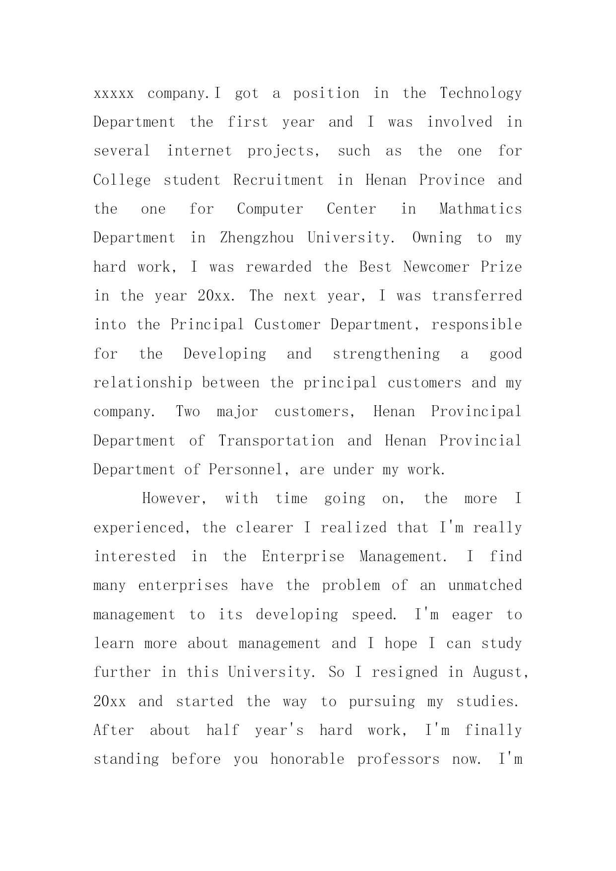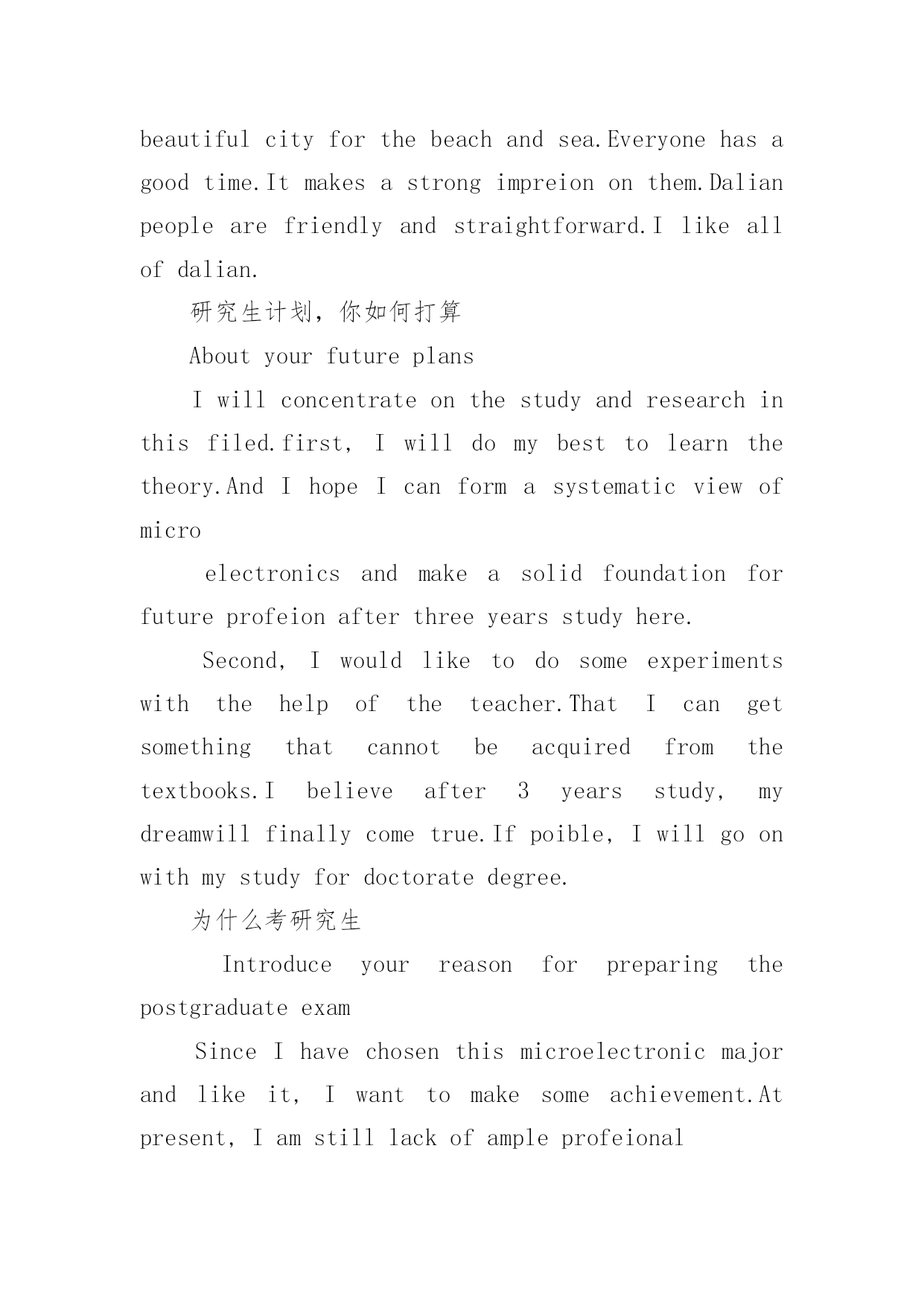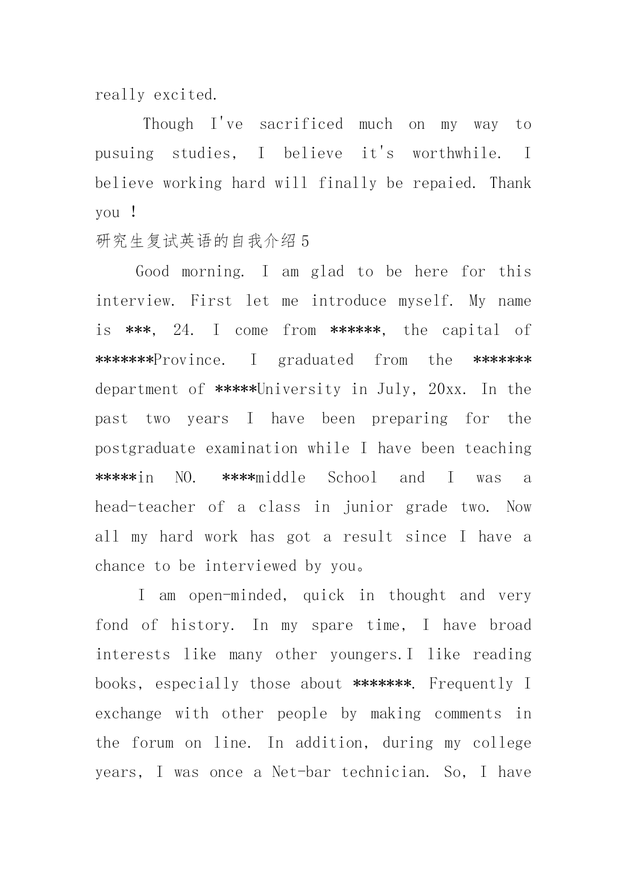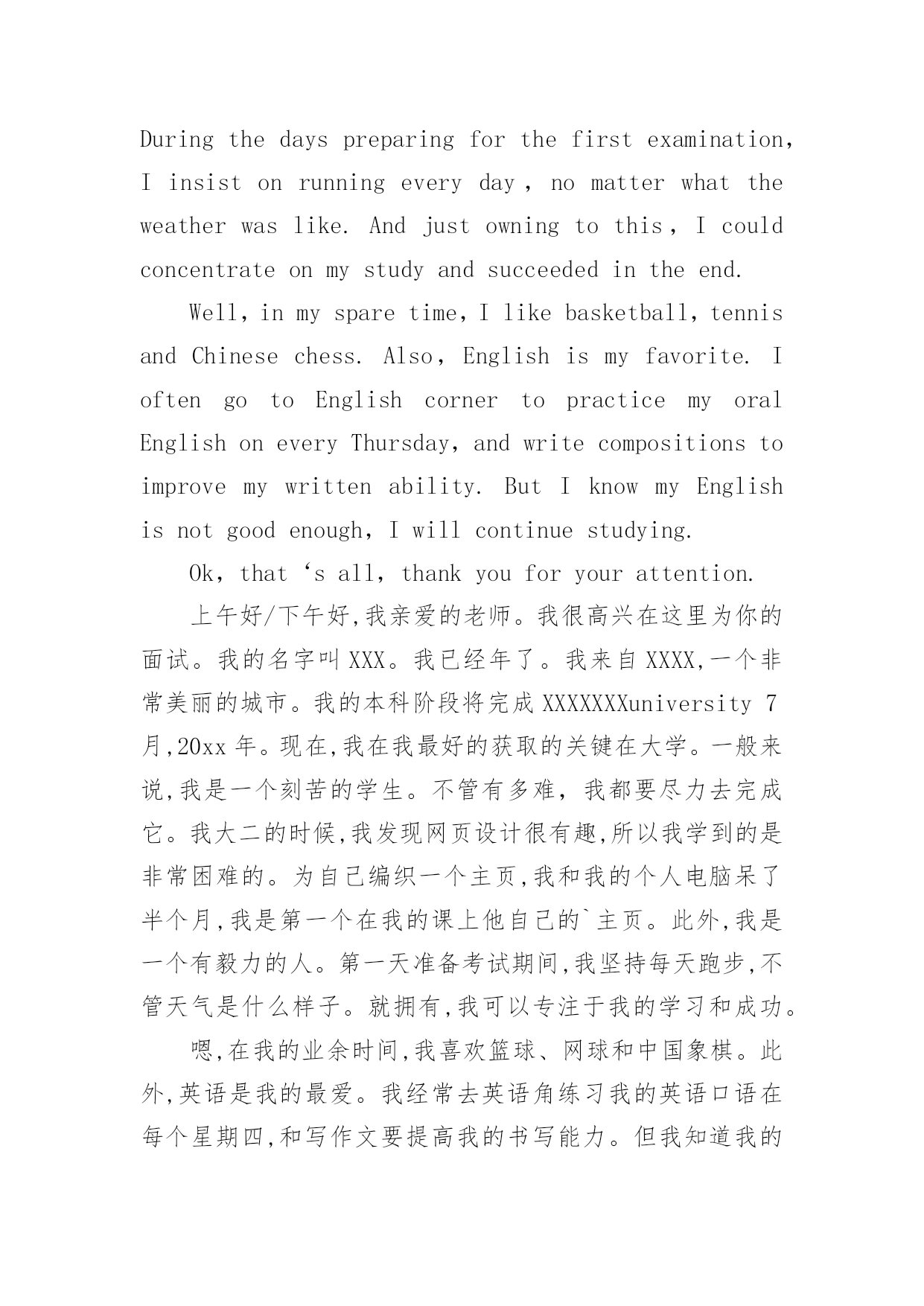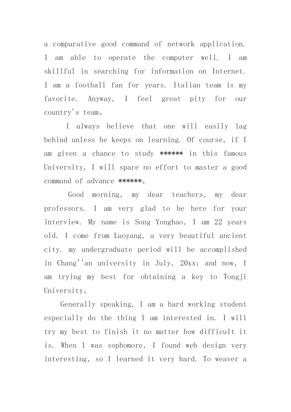 研究生复试英语的自我介绍研究生复试英语的自我介绍集锦15篇当碰到陌生人时候,可能需要我们进行自我介绍,自我介绍是认识自我的手段。相信许多人会觉得自我介绍很难写吧,以下是小编为大家收集的研究生复试英语的自我介绍,欢迎阅读与收藏。研究生复试英语的自我介绍1Goodmorning/afternoon,mydearteachers。Iamverygladtobehereforyourinterview.MynameisamXXXyearsold.IcomefromXXXXXXX,averybeautifulcity.MyundergraduateperiodwillbeaccomplishedinXXXXXXXuniversityinJuly,20xx.Andnow,IamtryingmybestforobtainingakeytoXXXXXXXXUniversity.Generallyspeaking,Iamahard-workingstudent.Iwilltrymybesttofinishitnomatterhowdifficultitis.WhenIwassophomore,Ifoundwebdesignveryinteresting,soIlearneditveryhard.Toweaveahomepageformyself,Istayedwithmypersonalcomputerforhalfamonth,andIamthefirstoneinmyclasswhoownhishomepage.Furthermore,Iamapersonwithgreatperseverance.Duringthedayspreparingforthefirstexamination,Iinsistonrunningeveryday,nomatterwhattheweatherwaslike.Andjustowningtothis,Icouldconcentrateonmystudyandsucceededintheend.Well,inmysparetime,Ilikebasketball,tennisandChinesechess.Also,Englishismyfavorite.IoftengotoEnglishcornertopracticemyoralEnglishoneveryThursday,andwritecompositionstoimprovemywrittenability.ButIknowmyEnglishisnotgoodenough,Iwillcontinuestudying.Ok,that‘sall,thankyouforyourattention.上午好/下午好,我亲爱的老师。我很高兴在这里为你的面试。我的名字叫XXX。我已经年了。我来自XXXX,一个非常美丽的城市。我的本科阶段将完成XXXXXXXuniversity7月,20xx年。现在,我在我最好的获取的关键在大学。一般来说,我是一个刻苦的学生。不管有多难,我都要尽力去完成它。我大二的时候,我发现网页设计很有趣,所以我学到的是非常困难的。为自己编织一个主页,我和我的个人电脑呆了半个月,我是第一个在我的课上他自己的`主页。此外,我是一个有毅力的人。第一天准备考试期间,我坚持每天跑步,不管天气是什么样子。就拥有,我可以专注于我的学习和成功。嗯,在我的业余时间,我喜欢篮球、网球和中国象棋。此外,英语是我的最爱。我经常去英语角练习我的英语口语在每个星期四,和写作文要提高我的书写能力。但我知道我的英语不够好,我将继续学习。好的,那是所有,谢谢您的关注。研究生复试英语的自我介绍2It’smypleasuretobeheretointroducemyself.That’sadifficultquestion.Ithinkallthenight.Howtointroducemyself?TellyouwhoIam?YouallknowmynameisLiu-iaonao.TellyouwhatmymajorisorwhatIamdoingnow?YouallknowIstudyink-jetpaper,andyesterdayyouallmye-aminers.SotodayI’lltellyoumycharactersandfavorites.I’manopen-minded,kindandsmartgirl.Ilikedancing,especiallynationalandclassicaldancing,waltzisalsomylove.Dancingcanmakemerela-whenIstudytired.ButabouttwoyearsIhaven