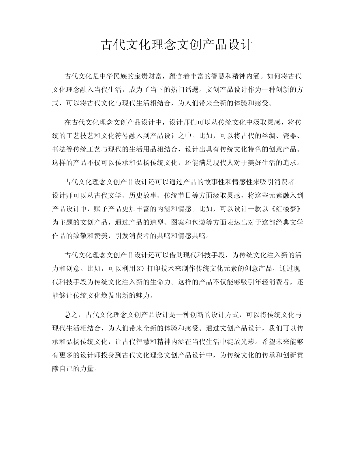 古代文化理念文创产品设计古代文化是中华民族的宝贵财富,蕴含着丰富的智慧和精神内涵。如何将古代文化理念融入当代生活,成为了当下的热门话题。文创产品设计作为一种创新的方式,可以将古代文化与现代生活相结合,为人们带来全新的体验和感受。在古代文化理念文创产品设计中,设计师们可以从传统文化中汲取灵感,将传统的工艺技艺和文化符号融入到产品设计之中。比如,可以将古代的丝绸、瓷器、书法等传统工艺与现代的生活用品相结合,设计出具有传统文化特色的创意产品。这样的产品不仅可以传承和弘扬传统文化,还能满足现代人对于美好生活的追求。古代文化理念文创产品设计还可以通过产品的故事性和情感性来吸引消费者。设计师可以从古代文学、历史故事、传统节日等方面汲取灵感,将这些元素融入到产品设计中,赋予产品更加丰富的内涵和情感。比如,可以设计一款以《红楼梦》为主题的文创产品,通过产品的造型、图案和包装等方面表达出对于这部经典文学作品的致敬和赞美,引发消费者的共鸣和情感共鸣。古代文化理念文创产品设计还可以借助现代科技手段,为传统文化注入新的活力和创意。比如,可以利用3D打印技术来制作传统文化元素的创意产品,通过现代科技手段为传统文化注入新的生命力。这样的产品不仅能够吸引年轻消费者,还能够让传统文化焕发出新的魅力。总之,古代文化理念文创产品设计是一种创新的设计方式,可以将传统文化与现代生活相结合,为人们带来全新的体验和感受。通过文创产品设计,我们可以传承和弘扬传统文化,让古代智慧和精神内涵在当代生活中绽放光彩。希望未来能够有更多的设计师投身到古代文化理念文创产品设计中,为传统文化的传承和创新贡献自己的力量。