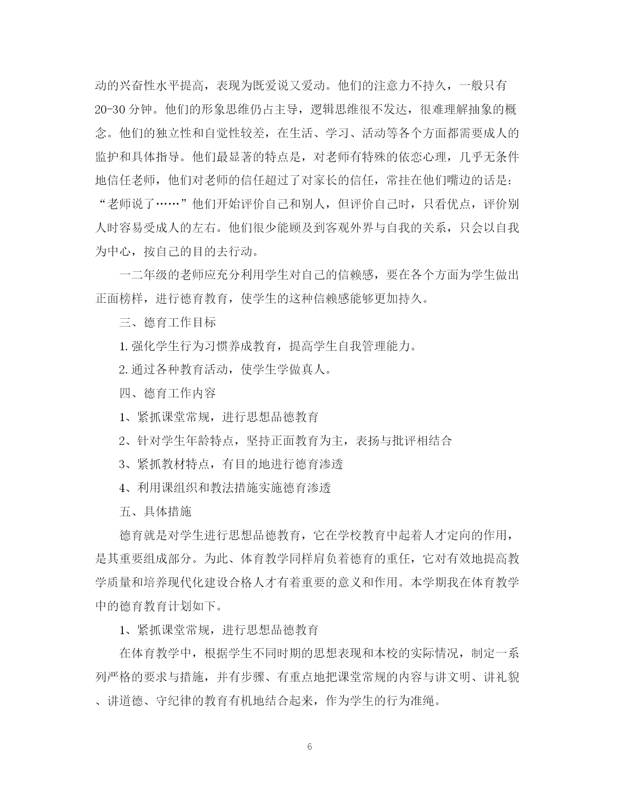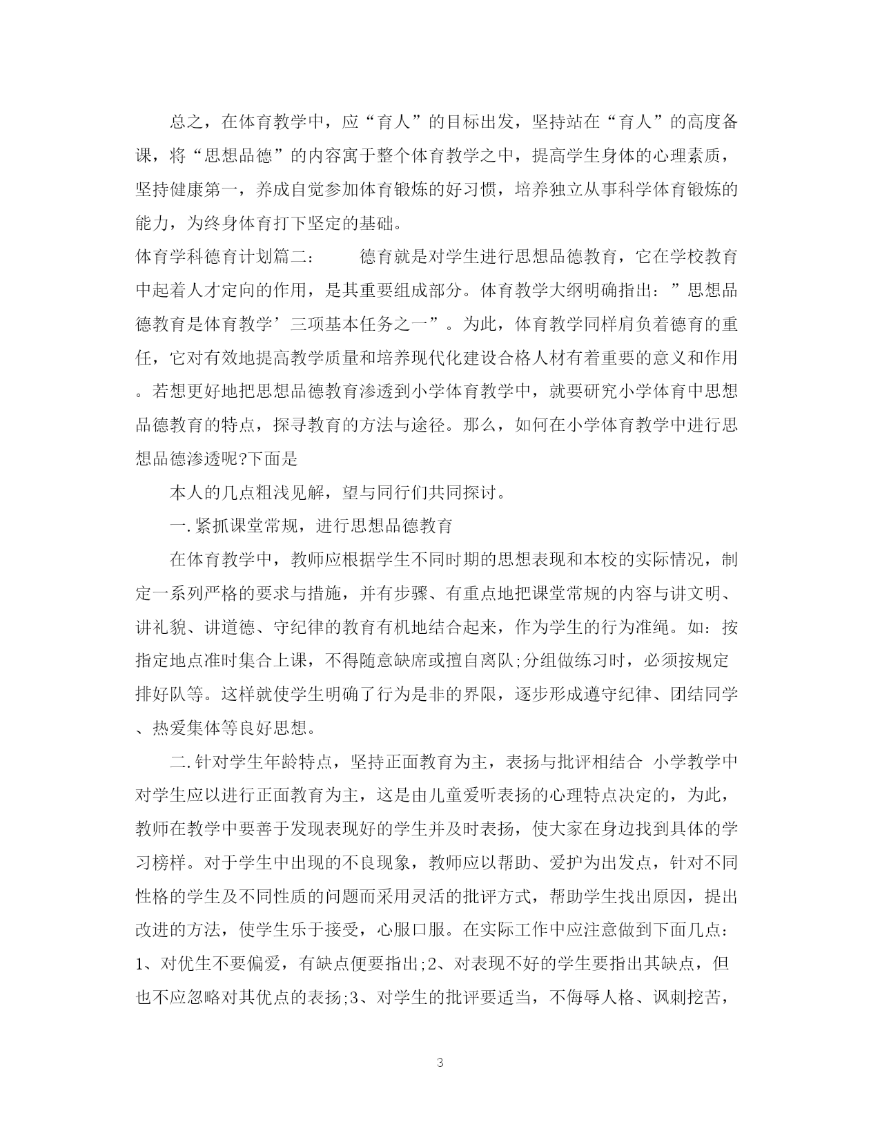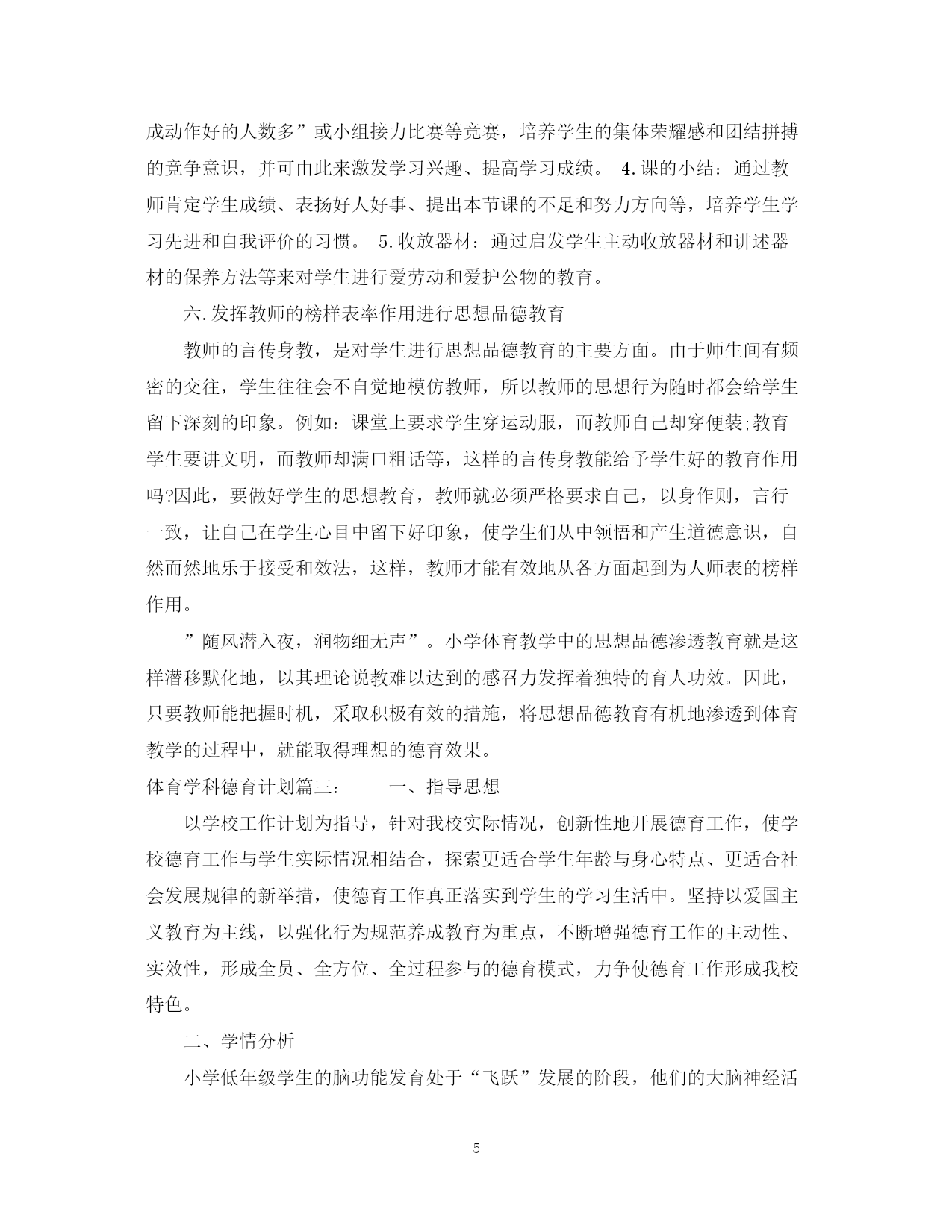 此资料由网络收集而来,如有侵权请告知上传者立即删除。资料共分享,我们负责传递知识。PAGEPAGE7体育学科德育计划3篇德育为先,是新形势对教育工作提出的新要求,是决定教育成败的胜负手。本文是范文网小编为大家整理的体育学科德育计划,仅供参考。体育学科德育计划篇一:体育与德育各有其特殊性,各自所要求的教育任务自不相同,但二者在某些方面,有很多的结合点。毛泽东早年在《体育之研究》一文中就曾指出:“体育一道,配德育与智育,而德智皆寄于体,无体是无德智也”。“体者,载知识之车而寓道德之舍也”。由此看来,体育与德育从来都是在教育活动中相互渗透,相互影响的。从这个意义上说,体育和德育似乎又是一个“整体”,不可分割。以上所说更符合辩证唯物主义观点。根据体育课的特点和学生的实际情况特制定计划如下:1、爱国主义与国际主义教育。体育是爱国主义与国际主义教育最具体、最生动的教材。体育基础知识教材中的体育目的、任务、亚运会、奥运会简介,我国体育事业的巨大成就和体育发展史,尤其是通过讲述我国体育事业的繁荣兴旺,五十年代我们中国人摘掉了“东亚病夫”的帽子;六十年代开始在世界体坛崭露头角;七十年代我国体育进入“冲出亚洲,走向世界”的新的发展时期;八十年代我国已成为世界体育强国等生动、具体、激动人心的事例,能激发学生的爱国热情和民族自豪感。2、集体主义和社会主义精神文明教育。体育课思想品德教育最基本的内容是进行集体主义和精神文明礼貌教育。队列队形、接力跑、拔河游戏、各种集体球赛以及体育教学常规的实施等均与集体主义和文明礼貌紧紧连在一起。通过这些教材的教学和练习,团结、协作、配合的集体主义精神和讲文明、讲礼貌的优良品德,生动自然地在青少年的思想中得到了培养,受到了熏陶。3、意志品质与道德观念的教育培养学生吃苦耐劳、勇敢、果断、顽强、坚忍不拔等意志品质,是体育德育渗透的主要内容,这方面的教材多、范围广,一般以田径教材中的快速跑、障碍跑、跳高、跳远;器械体操中的单、双杠、支撑跳跃;篮球、足球、武术等教材最为典型,这些教材内容与培养青少年优良的意志品质和助人为乐、互相爱护、互相关心等高尚的道德行为,有着直接的联系。4、组织纪律与法制观念教育。对学生进行社会主义法制与纪律教育,了解自由与纪律的关系,增强学生的组织纪律性和法制观念,既是体育课德育渗透的重要内容,也是学校体育工作目标的重要组成部分。严格的队列训练、课堂常规的纪律要求、各种体育竞赛规则的执行等,与组织纪律、法制观念教育等自然结合在一起。5、身心卫生与个性发展教育。对学生进行青春期心理卫生教育,男、女同学真诚友谊的教育,发展学生个性、陶冶美的情操、培养学生正确、健康的审美观及乐观活泼的性格,在体育课德育渗透中占有重要的位置。生理卫生“青春期与体育”、舞蹈与韵律操、技巧等,是体现身心卫生与个性发展教育的主要教材。6、辩证唯物主义教育。体育课教材中球类竞赛战术的运用与安排,以及学习球类竞赛的编排等,体现着马列主义的哲学理论观点及毛泽东同志的军事思想的丰富内容,教育学生运用这些观点,解决处理战术中的实际问题,是对学生进行基本的辩证唯物主义教育的最好的教材。7、国防观念及劳动教育。教育学生把积极参加体育锻炼,同保卫祖国、增强国防意识联系起来。根据教学的需要,有目的地组织学生布置运动场地和收还器材,对学生进行热爱劳动、养成劳动习惯和爱护公共财产的教育。以及在练习中,组织学生相互保护和帮助,培养学生互相关心、互相爱护的高尚品质,这是进行德育渗透不可忽视的重要方面。总之,在体育教学中,应“育人”的目标出发,坚持站在“育人”的高度备课,将“思想品德”的内容寓于整个体育教学之中,提高学生身体的心理素质,坚持健康第一,养成自觉参加体育锻炼的好习惯,培养独立从事科学体育锻炼的能力,为终身体育打下坚定的基础。体育学科德育计划篇二:德育就是对学生进行思想品德教育,它在学校教育中起着人才定向的作用,是其重要组成部分。体育教学大纲明确指出:”思想品德教育是体育教学’三项基本任务之一”。为此,体育教学同样肩负着德育的重任,它对有效地提高教学质量和培养现代化建设合格人材有着重要的意义和作用。若想更好地把思想品德教育渗透到小学体育教学中,就要研究小学体育中思想品德教育的特点,探寻教育的方法与途径。那么,如何在小学体育教学中进行思想品德渗透呢?下面是本人的几点粗浅见解,望与同行们共同探讨。一.紧抓课堂常规,进行思想品德教育在体育教学中,教师应根据学生不同时期的思想表现和本校的实际情况,制定一系列严格的要求与措施,并有步骤、有重点地把课堂常规的内容与讲文明、讲礼貌、讲道德、守纪律的教育有机地结合起来,作为学生的行为准绳。如:按指定地点准时集合上课,不得随意缺席或擅自离队;分