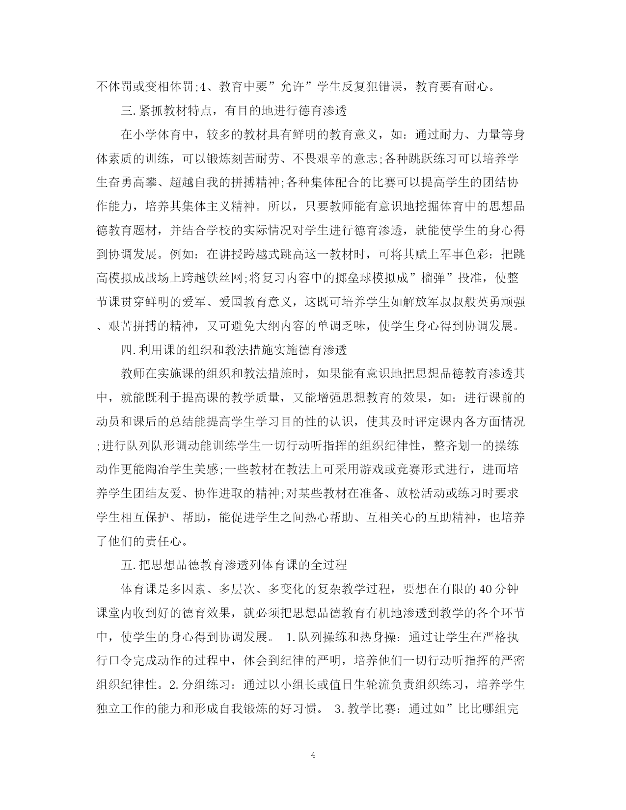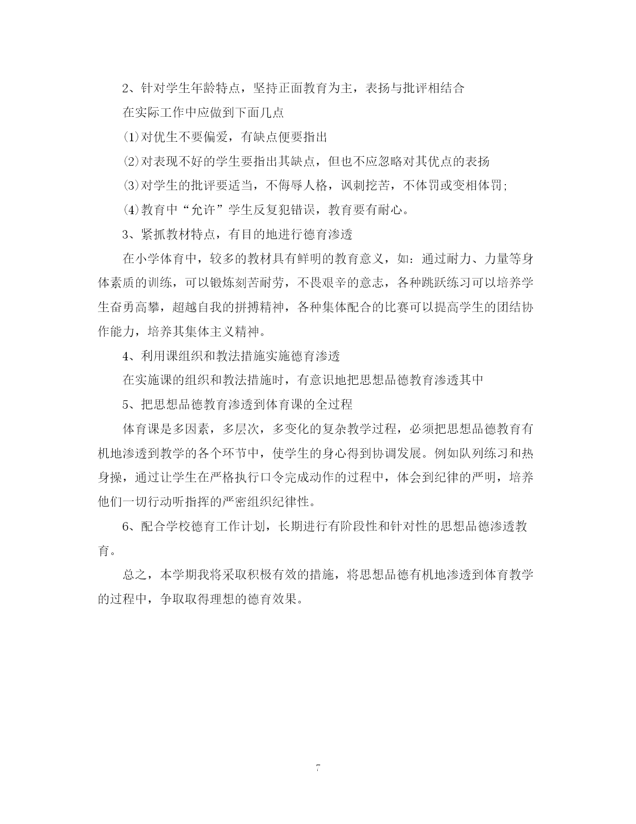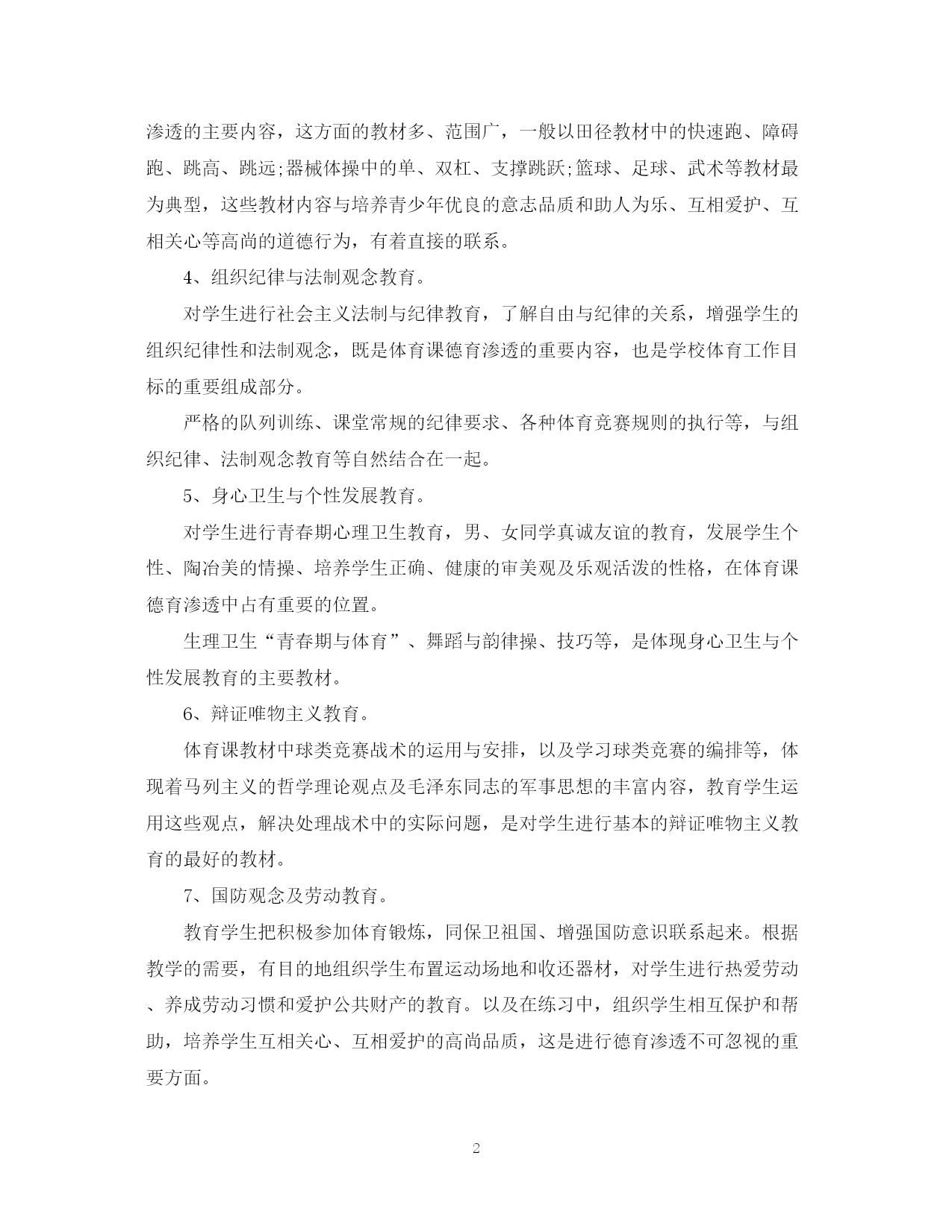 此资料由网络收集而来,如有侵权请告知上传者立即删除。资料共分享,我们负责传递知识。PAGEPAGE7体育学科德育计划3篇德育为先,是新形势对教育工作提出的新要求,是决定教育成败的胜负手。本文是范文网小编为大家整理的体育学科德育计划,仅供参考。体育学科德育计划篇一:体育与德育各有其特殊性,各自所要求的教育任务自不相同,但二者在某些方面,有很多的结合点。毛泽东早年在《体育之研究》一文中就曾指出:“体育一道,配德育与智育,而德智皆寄于体,无体是无德智也”。“体者,载知识之车而寓道德之舍也”。由此看来,体育与德育从来都是在教育活动中相互渗透,相互影响的。从这个意义上说,体育和德育似乎又是一个“整体”,不可分割。以上所说更符合辩证唯物主义观点。根据体育课的特点和学生的实际情况特制定计划如下:1、爱国主义与国际主义教育。体育是爱国主义与国际主义教育最具体、最生动的教材。体育基础知识教材中的体育目的、任务、亚运会、奥运会简介,我国体育事业的巨大成就和体育发展史,尤其是通过讲述我国体育事业的繁荣兴旺,五十年代我们中国人摘掉了“东亚病夫”的帽子;六十年代开始在世界体坛崭露头角;七十年代我国体育进入“冲出亚洲,走向世界”的新的发展时期;八十年代我国已成为世界体育强国等生动、具体、激动人心的事例,能激发学生的爱国热情和民族自豪感。2、集体主义和社会主义精神文明教育。体育课思想品德教育最基本的内容是进行集体主义和精神文明礼貌教育。队列队形、接力跑、拔河游戏、各种集体球赛以及体育教学常规的实施等均与集体主义和文明礼貌紧紧连在一起。通过这些教材的教学和练习,团结、协作、配合的集体主义精神和讲文明、讲礼貌的优良品德,生动自然地在青少年的思想中得到了培养,受到了熏陶。3、意志品质与道德观念的教育培养学生吃苦耐劳、勇敢、果断、顽强、坚忍不拔等意志品质,是体育德育渗透的主要内容,这方面的教材多、范围广,一般以田径教材中的快速跑、障碍跑、跳高、跳远;器械体操中的单、双杠、支撑跳跃;篮球、足球、武术等教材最为典型,这些教材内容与培养青少年优良的意志品质和助人为乐、互相爱护、互相关心等高尚的道德行为,有着直接的联系。4、组织纪律与法制观念教育。对学生进行社会主义法制与纪律教育,了解自由与纪律的关系,增强学生的组织纪律性和法制观念,既是体育课德育渗透的重要内容,也是学校体育工作目标的重要组成部分。严格的队列训练、课堂常规的纪律要求、各种体育竞赛规则的执行等,与组织纪律、法制观念教育等自然结合在一起。5、身心卫生与个性发展教育。对学生进行青春期心理卫生教育,男、女同学真诚友谊的教育,发展学生个性、陶冶美的情操、培养学生正确、健康的审美观及乐观活泼的性格,在体育课德育渗透中占有重要的位置。生理卫生“青春期与体育”、舞蹈与韵律操、技巧等,是体现身心卫生与个性发展教育的主要教材。6、辩证唯物主义教育。体育课教材中球类竞赛战术的运用与安排,以及学习球类竞赛的编排等,体现着马列主义的哲学理论观点及毛泽东同志的军事思想的丰富内容,教育学生运用这些观点,解决处理战术中的实际问题,是对学生进行基本的辩证唯物主义教育的最好的教材。7、国防观念及劳动教育。教育学生把积极参加体育锻炼,同保卫祖国、增强国防意识联系起来。根据教学的需要,有目的地组织学生布置运动场地和收还器材,对学生进行热爱劳动、养成劳动习惯和爱护公共财产的教育。以及在练习中,组织学生相互保护和帮助,培养学生互相关心、互相爱护的高尚品质,这是进行德育渗透不可忽视的重要方面。总之,在体育教学中,应“育人”的目标出发,坚持站在“育人”的高度备课,将“思想品德”的内容寓于整个体育教学之中,提高学生身体的心理素质,坚持健康第一,养成自觉参加体育锻炼的好习惯,培养独立从事科学体育锻炼的能力,为终身体育打下坚定的基础。体育学科德育计划篇二:德育就是对学生进行思想品德教育,它在学校教育中起着人才定向的作用,是其重要组成部分。体育教学大纲明确指出:”思想品德教育是体育教学’三项基本任务之一”。为此,体育教学同样肩负着德育的重任,它对有效地提高教学质量和培养现代化建设合格人材有着重要的意义和作用。若想更好地把思想品德教育渗透到小学体育教学中,就要研究小学体育中思想品德教育的特点,探寻教育的方法与途径。那么,如何在小学体育教学中进行思想品德渗透呢?下面是本人的几点粗浅见解,望与同行们共同探讨。一.紧抓课堂常规,进行思想品德教育在体育教学中,教师应根据学生不同时期的思想表现和本校的实际情况,制定一系列严格的要求与措施,并有步骤、有重点地把课堂常规的内容与讲文明、讲礼貌、讲道德、守纪律的教育有机地结合起来,作为学生的行为准绳。如:按指定地点准时集合上课,不得随意缺席或擅自离队;分