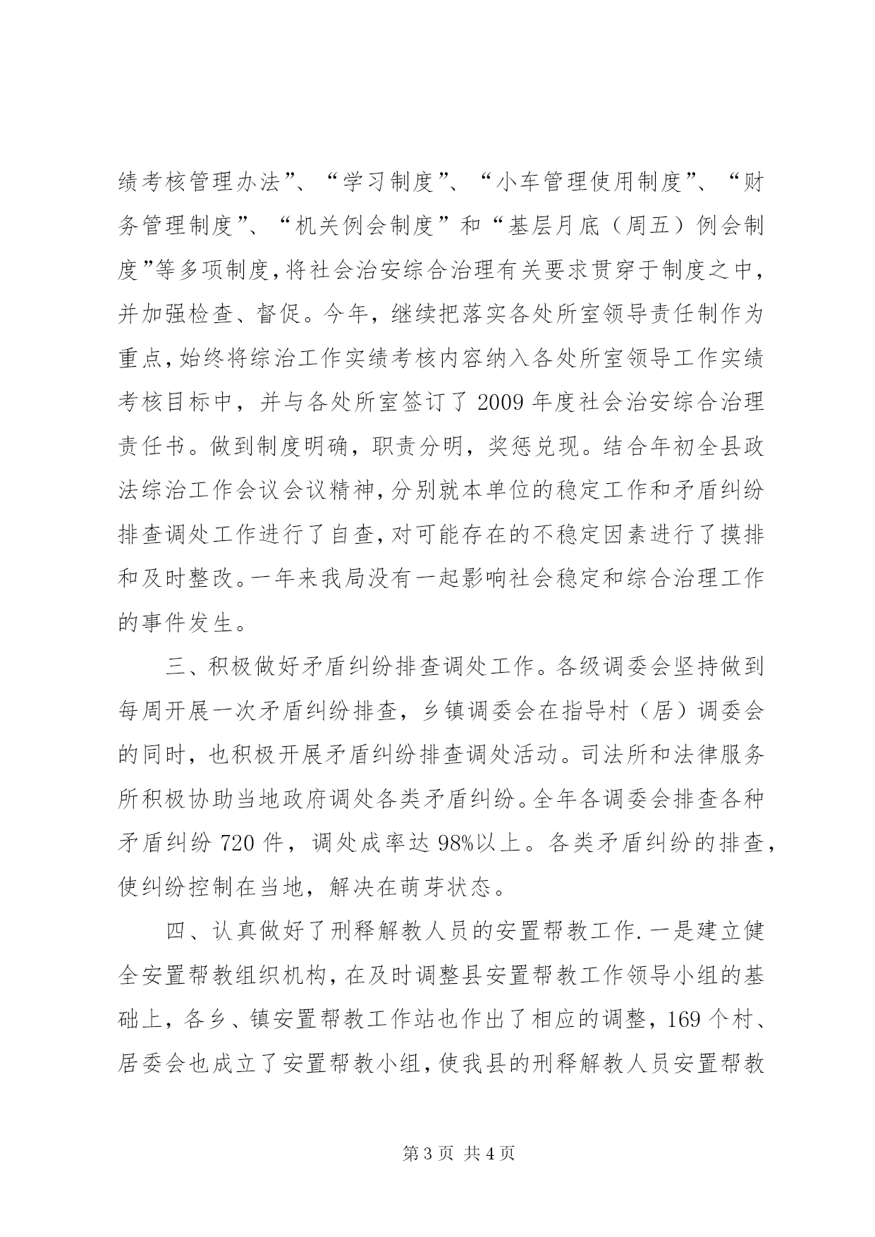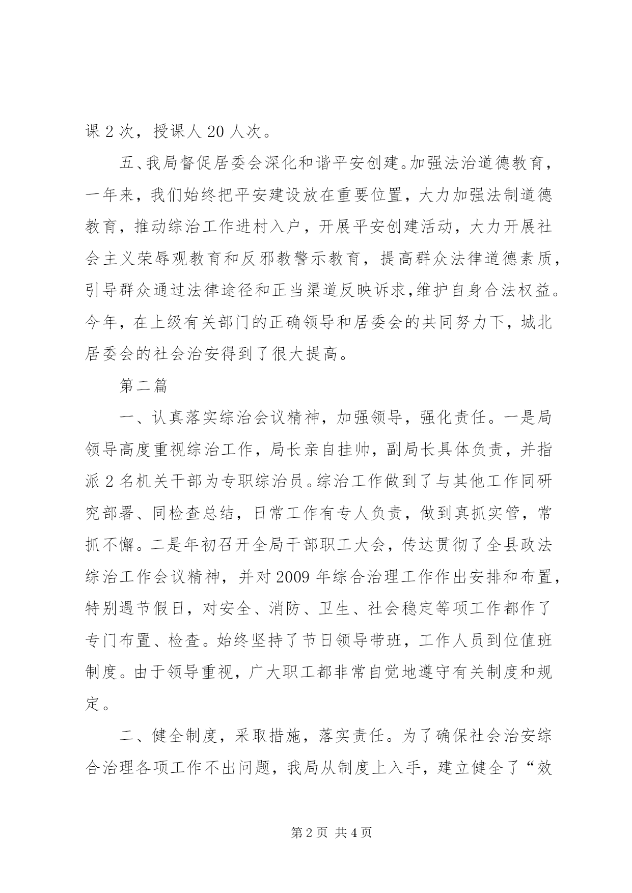 第PAGE\*Arabic\*MERGEFORMAT4页共NUMPAGES\*MERGEFORMAT4页司法局综治挂点总结2篇第一篇今年我局综治工作挂点帮扶对象是镇城北居委会,在帮助居委会大力发展经济,提高居委会经济收入的同时,我们也在为当地百姓创造一个安定详和的居住环境而努力。从夯实基层基础工作,加强地方治保,调解组织的规范化、制度化建设两方面出发,使城北居委会社会综合治理工作上了一个新的台阶,得到上级部门的充分肯定。一、抓好组织落实,建立完善综治工作室。健全了居委会治保调解组织,责任到人。特别对综治工作室的内部规范一一做了落实,加强了群防群治队伍建设。二、加强科学宣传,防止迷信泛滥。在居委会门口和人员较集中的地方设置黑板,既可进行政务公开,又可宣传科技、科学。并充分发挥“五好家庭户”、“双文明户”的榜样作用,增强广大居民的科学观,同时激发他们发展经济,提高居民生活水平。三、为彻底解决“赌博”、“斗殴”等地方瘤疾。我们协助居委会办好居民活动中心,使居民在节日或闲时在活动中心健康娱乐,杜绝赌博现象发生。四、充分发挥调委会的作用。今年来,我局5次深入居委会及居民家中,协助居委会调解各类矛盾纠纷。调解纠纷3起,最终使得矛盾双方握手言和。同时,为居委会调解组织上业务理论课2次,授课人20人次。五、我局督促居委会深化和谐平安创建。加强法治道德教育,一年来,我们始终把平安建设放在重要位置,大力加强法制道德教育,推动综治工作进村入户,开展平安创建活动,大力开展社会主义荣辱观教育和反邪教警示教育,提高群众法律道德素质,引导群众通过法律途径和正当渠道反映诉求,维护自身合法权益。今年,在上级有关部门的正确领导和居委会的共同努力下,城北居委会的社会治安得到了很大提高。第二篇一、认真落实综治会议精神,加强领导,强化责任。一是局领导高度重视综治工作,局长亲自挂帅,副局长具体负责,并指派2名机关干部为专职综治员。综治工作做到了与其他工作同研究部署、同检查总结,日常工作有专人负责,做到真抓实管,常抓不懈。二是年初召开全局干部职工大会,传达贯彻了全县政法综治工作会议精神,并对2009年综合治理工作作出安排和布置,特别遇节假日,对安全、消防、卫生、社会稳定等项工作都作了专门布置、检查。始终坚持了节日领导带班,工作人员到位值班制度。由于领导重视,广大职工都非常自觉地遵守有关制度和规定。二、健全制度,采取措施,落实责任。为了确保社会治安综合治理各项工作不出问题,我局从制度上入手,建立健全了“效绩考核管理办法”、“学习制度”、“小车管理使用制度”、“财务管理制度”、“机关例会制度”和“基层月底(周五)例会制度”等多项制度,将社会治安综合治理有关要求贯穿于制度之中,并加强检查、督促。今年,继续把落实各处所室领导责任制作为重点,始终将综治工作实绩考核内容纳入各处所室领导工作实绩考核目标中,并与各处所室签订了2009年度社会治安综合治理责任书。做到制度明确,职责分明,奖惩兑现。结合年初全县政法综治工作会议会议精神,分别就本单位的稳定工作和矛盾纠纷排查调处工作进行了自查,对可能存在的不稳定因素进行了摸排和及时整改。一年来我局没有一起影响社会稳定和综合治理工作的事件发生。三、积极做好矛盾纠纷排查调处工作。各级调委会坚持做到每周开展一次矛盾纠纷排查,乡镇调委会在指导村(居)调委会的同时,也积极开展矛盾纠纷排查调处活动。司法所和法律服务所积极协助当地政府调处各类矛盾纠纷。全年各调委会排查各种矛盾纠纷720件,调处成率达98%以上。各类矛盾纠纷的排查,使纠纷控制在当地,解决在萌芽状态。四、认真做好了刑释解教人员的安置帮教工作.一是建立健全安置帮教组织机构,在及时调整县安置帮教工作领导小组的基础上,各乡、镇安置帮教工作站也作出了相应的调整,169个村、居委会也成立了安置帮教小组,使我县的刑释解教人员安置帮教工作纵横联合,形成了统一的工作网络。二是加强了各项规章制度的落实。根据我县实际,特此制定了县乡两级安置帮教工作制度和工作职责,印制了500多份刑释解教人员档案。实行了“一人一档”、“一帮一结对”等管理制度。管理制度一并上墙,使管理责任一目了然,有效地促进了安置帮教工作向规范化发展。三是积极开展刑释解教人员摸底排查工作。今年我们在6月和10月两次对刑释解教人员进行了摸底排查,基本摸清了他们的具体情况和基本去向,做到了底数清、情况明。为我县科级以上领导干部“一对一”帮扶结对工作打下了扎实的基础。五、积极做好预防青少年违法犯罪工作。我局与县委宣传部、关工委等五家单位联合组建了关心下一代“五老”(即:老干部、老战士、老专家、老教师、老劳模)宣讲报告团,在全县所有中小学和青年职工中进行巡回宣讲,取得了良好的效果。通过宣讲使广大青少年更加懂得了如何做一名合格的守法青