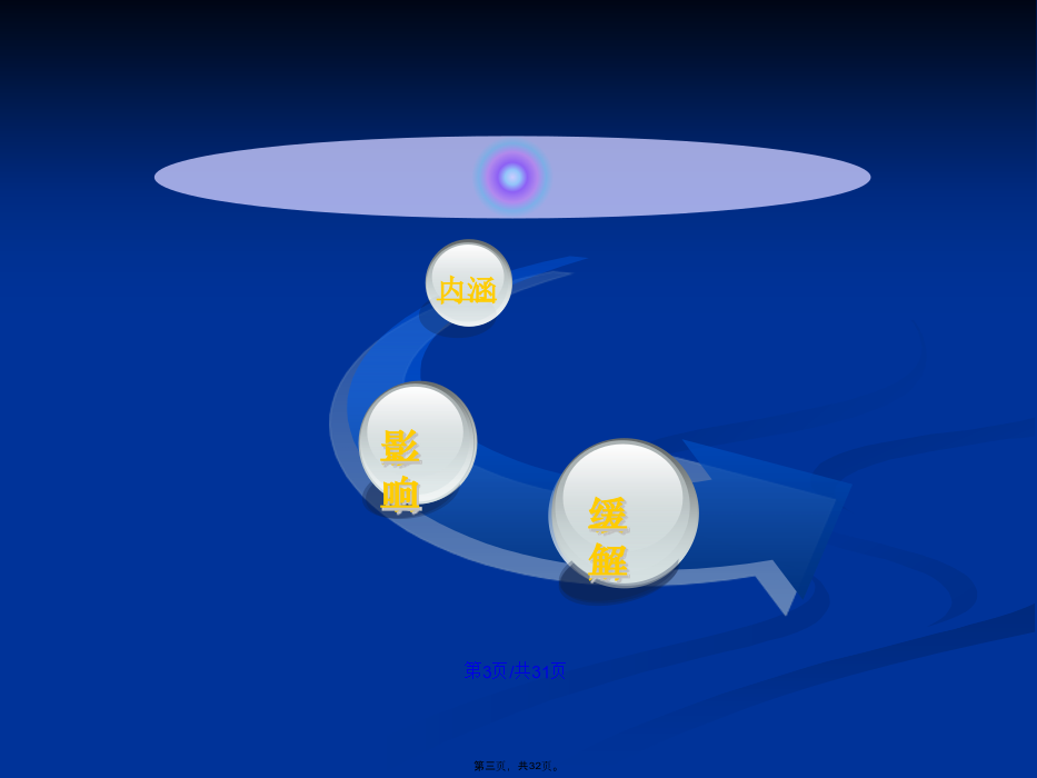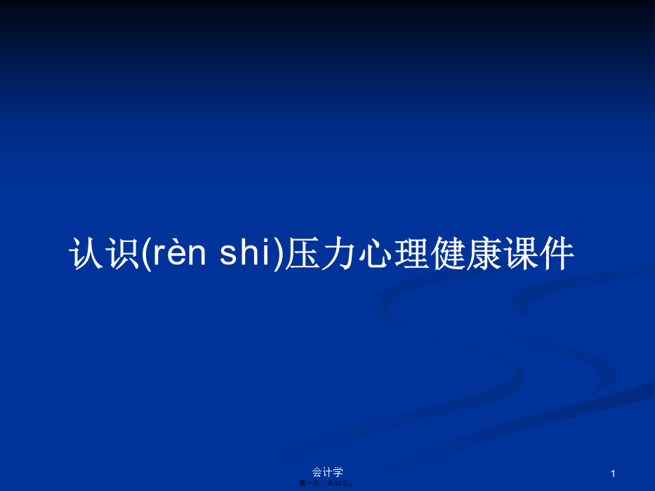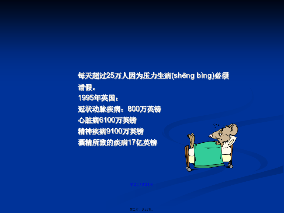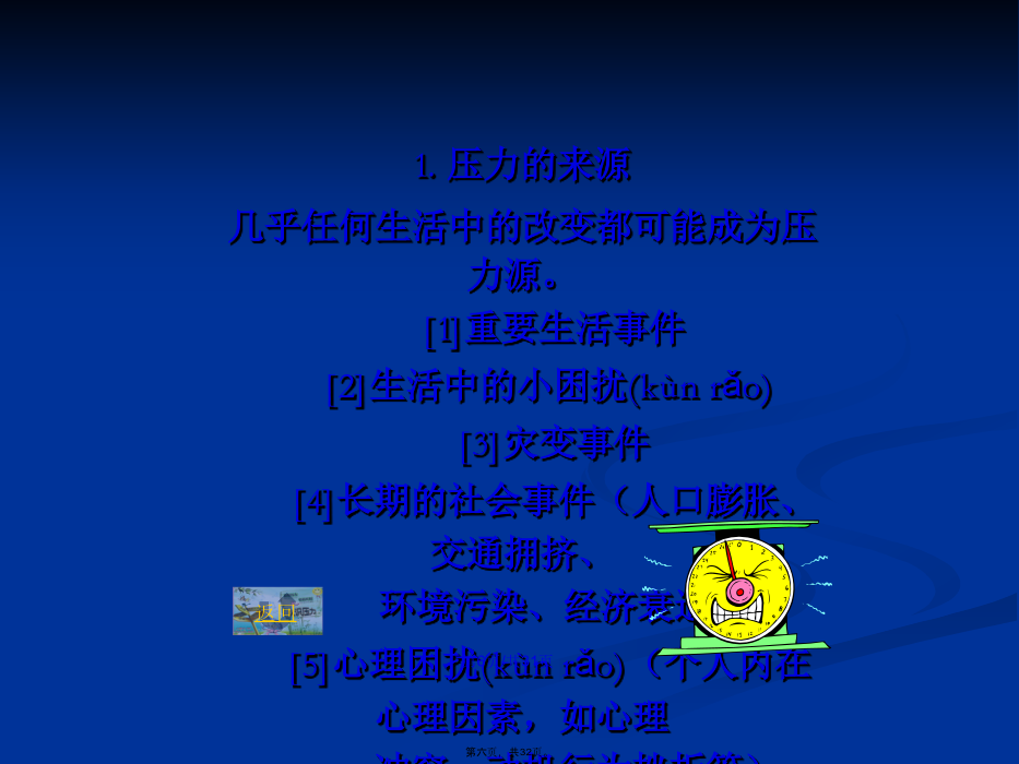 会计学每天超过25万人因为压力生病(shēngbìng)必须请假。1995年英国:冠状动脉疾病:800万英镑心脏病6100万英镑精神疾病9100万英镑酒精所致的疾病17亿英镑一、什么(shénme)是心理压力(二)压力的三大(sāndà)成分:1.压力的来源几乎任何生活中的改变都可能成为压力源。[1]重要生活事件[2]生活中的小困扰(kùnrǎo)[3]灾变事件[4]长期的社会事件(人口膨胀、交通拥挤、环境污染、经济衰退等)[5]心理困扰(kùnrǎo)(个人内在心理因素,如心理冲突、动机行为挫折等)2.认知(rènzhī)的评估3.压力(yālì)反应(1)生理反应(2)心理(xīnlǐ)反应(3)行为(xíngwéi)反应二、压力(yālì)的影响过度压力给我们(wǒmen)带来的影响……缓解(huǎnjiě)方法压力(yālì)的预防与缓解生活压力的预防(yùfáng)与缓解生理(shēnglǐ)压力的防御与缓解三大(sāndà)策略:直面问题vs转换观念vs自我训练转换观念(guānniàn):换个角度看问题哈哈(hāha),还有半瓶酒呢运动幸福(xìngfú)清单谢谢(xièxie)观看感谢您的观看(guānkàn)!内容(nèiróng)总结