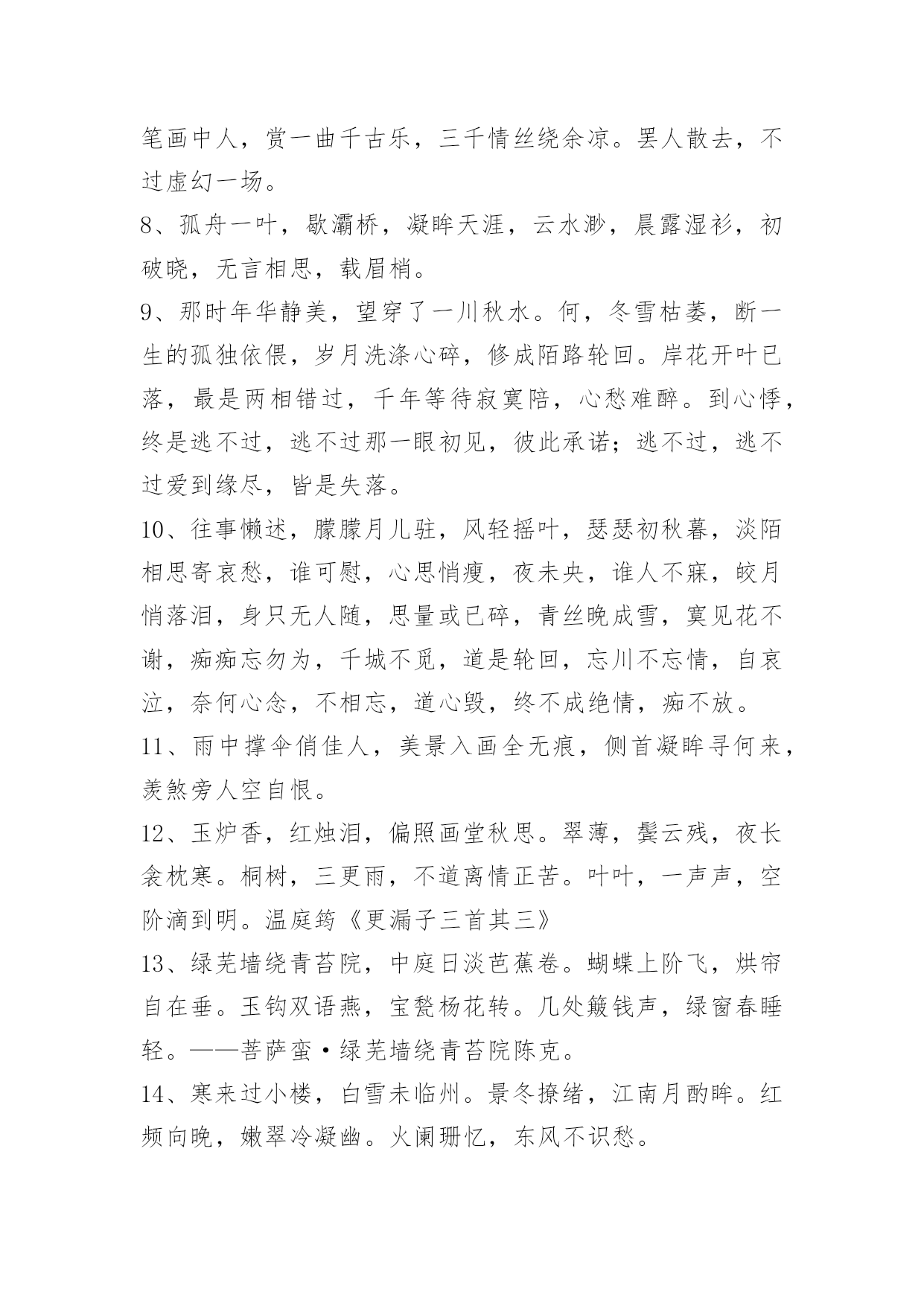 优美古风句子69条2021年优美古风句子69条千言万语都表达不出我的心痛,最后,在你的面前还是逞强说"没事"。下面是小编搜索整理的优美古风句子69条,供大家参考借鉴,希望可以帮助到有需要的朋友。1、长街长,烟花繁,你挑灯回看;短亭短,红尘辗,我把萧再叹。2、清霜满地玉琼楼,皎婉芳姿映水流。谁解红颜乡思意?青丝入雪变白头。3、雨天,君可以试着一个人走在家乡的路上,记得,一个人,一首歌,还有一点点对爱人的思念。晴天,君要试着两个人走在家乡的路上,记得,两个人,两个包,还有一场说走就走的旅行。4、期许着,在一盏灯花下用深情的线儿织一件仙月飘飘的蝶衣,趁着思念的帆儿飞抵你的画卷,与你琴瑟笙歌,对饮潇湘。陌上黄昏,红笺枕轻云,我请君入梦,让相思泛滥,痴缠天地。5、深院静,小庭空,断续寒砧断续风。奈夜长人不寐,数声与月到帘栊。煜《捣练子令·深院静》6、不识君花容,谁为悦己容;愿君共担天下罪,惜君长伴暮暮情。7、夜微凉,琴飞扬。月皎洁透书窗,淡淡音符化愁肠。一笔画中人,赏一曲千古乐,三千情丝绕余凉。罢人散去,不过虚幻一场。8、孤舟一叶,歇灞桥,凝眸天涯,云水渺,晨露湿衫,初破晓,无言相思,载眉梢。9、那时年华静美,望穿了一川秋水。何,冬雪枯萎,断一生的孤独依偎,岁月洗涤心碎,修成陌路轮回。岸花开叶已落,最是两相错过,千年等待寂寞陪,心愁难醉。到心悸,终是逃不过,逃不过那一眼初见,彼此承诺;逃不过,逃不过爱到缘尽,皆是失落。10、往事懒述,朦朦月儿驻,风轻摇叶,瑟瑟初秋暮,淡陌相思寄哀愁,谁可慰,心思悄瘦,夜未央,谁人不寐,皎月悄落泪,身只无人随,思量或已碎,青丝晚成雪,寞见花不谢,痴痴忘勿为,千城不觅,道是轮回,忘川不忘情,自哀泣,奈何心念,不相忘,道心毁,终不成绝情,痴不放。11、雨中撑伞俏佳人,美景入画全无痕,侧首凝眸寻何来,羡煞旁人空自恨。12、玉炉香,红烛泪,偏照画堂秋思。翠薄,鬓云残,夜长衾枕寒。桐树,三更雨,不道离情正苦。叶叶,一声声,空阶滴到明。温庭筠《更漏子三首其三》13、绿芜墙绕青苔院,中庭日淡芭蕉卷。蝴蝶上阶飞,烘帘自在垂。玉钩双语燕,宝甃杨花转。几处簸钱声,绿窗春睡轻。——菩萨蛮·绿芜墙绕青苔院陈克。14、寒来过小楼,白雪未临州。景冬撩绪,江南月酌眸。红频向晚,嫩翠冷凝幽。火阑珊忆,东风不识愁。15、有节骨乃坚,无心品自端。经狂风骤雨,宁折不易弯。旧四季翠绿,不与群芳争艳。16、岁月如一指流沙,缓缓的在指尖流淌。静坐在流年里。一抹心香,执一盏清茗,携一抹阳光,笑看红尘过往。17、似花还似非花,也无人惜从教坠。家傍路,思量却是,无情有思。损柔肠,困酣妖眼,欲开还闭。随风万里,寻郎去处,又还被,莺呼起。恨此花飞尽,恨西园,落红难缀。来雨过,遗踪何在?一池萍碎。色三分,二分尘土,一分流水。看来,不是杨花,点点是离人泪。18、夕阳谁唤下楼梯,一握香荑。头忍笑阶前立,总无语,也依依。书直恁无凭据,休说相思。伊好向红窗醉,须莫及,落花时。19、爱有着一段不可告人的秘密,只能与臣妾相随。20、管臣妾有多差。在这个世界上。就一个臣妾。21、后来臣妾终于明白了办不到的承诺就成了枷锁。22、对她说,臣妾过的很好,君也要过的好。23、孤单的君,孤单的臣妾,孤单的灵魂,流离失所。24、臣妾的脑子好似一片空白,没有任何思绪,从自己决定放弃那一刻,不会再想任何关于君的一切。25、行善度流年,万事皆安然。……26、真个别离难,不似相逢好。27、狂随柳絮有时见,舞入梨花何处寻。28、孤灯寒照雨,湿竹暗浮烟。29、花瓣的馨香,默默地流走,奈何妩媚笑红颜。30、紫檀未灭,我亦未去。31、相思本是无凭语,莫向花笺费泪行。32、旧河长渡,失了酒,识了友。古楼新登,得了情,德了心。33、曾许天荒地老意,却忘似水浮萍根。34、红颜一误,终生仕途不顾。35、记住的是一季秋凉,记不住的才是一抹流光。36、你眉眼如画我怎堪破三生痴愿,仗剑天涯爱你痴念有增无减。37、红颜泪滴点朱唇,半世痴情终离殇。38、青春路口,我们不期而遇。撞倒了年华,漏过了离殇。39、明知自己是花,却要追求花开不败。40、你在,我在,岁月在,我还要怎样美好的世界。41、杯酒失意何语狂,苦吟且称展愁殇。鱼逢浅岸难知命,雁落他乡易断肠。葛衣强作霓裳舞,枯树聊扬蕙芷香。落魄北来归蓬径,凭轩南望月似霜。42、身躯凛凛,相貌堂堂。一双眼光射寒星,两弯眉浑如刷漆。43、远山眉黛长,细柳腰肢袅。妆罢立春风,一笑千金少。44、小女不才,妄自将心托付于卿,耽误了公子的大好前程,他日若寻得娇妻良配,请公子指点一言,定当不会再此纠缠,愿君如同梁上燕,岁岁常能得相见。45、雾失楼台,月迷津渡,桃源望断无寻处。46、寄旅江湖舍旧亭,伶人玉水瓶,春老赠花明。47、曾为谁执着,也曾为谁失落,但最终谁也不能画出谁生命的轮廓。