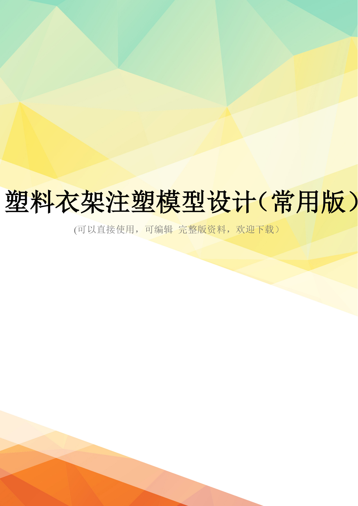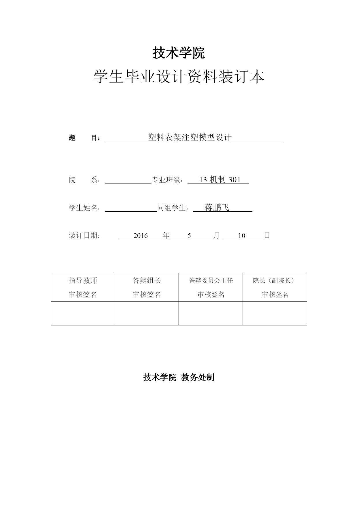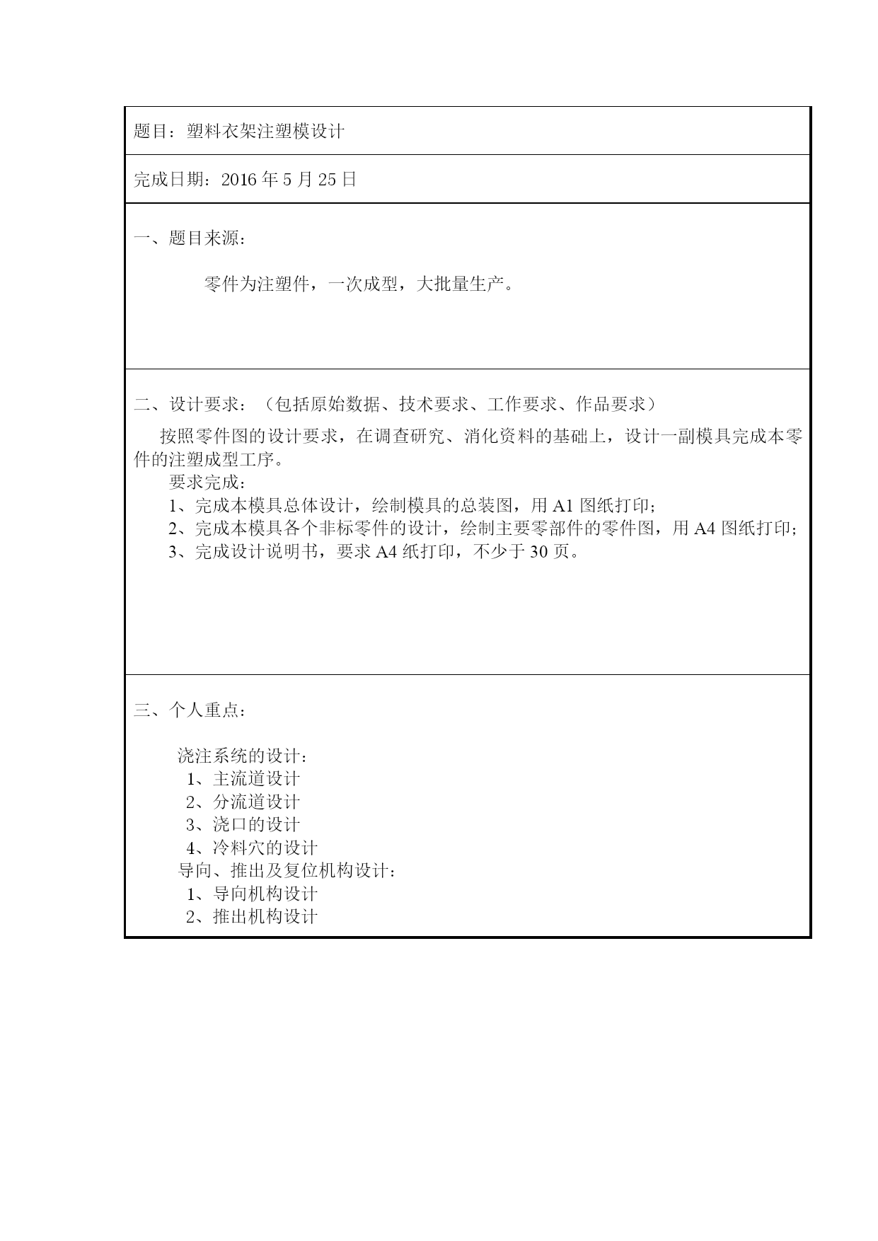 塑料衣架注塑模型设计(常用版)(可以直接使用,可编辑完整版资料,欢迎下载)技术学院学生毕业设计资料装订本题目:塑料衣架注塑模型设计院系:专业班级:13机制301学生姓名:同组学生:蒋鹏飞装订日期:2016年5月10日指导教师审核签名答辩组长审核签名答辩委员会主任审核签名院长(副院长)审核签名技术学院教务处制装订目录技术学院学生毕业设计总成绩评定表技术学院学生毕业设计评价技术学院学生毕业设计评价技术学院学生毕业设计评价毕业设计任务书毕业设计开题报告毕业设计说明书技术学院学生毕业设计总成绩评定表学生姓名专业班级机制13301总评成绩课题名称塑料衣架注塑模设计课题性质□产品设计□工艺流程设计□方案设计□其他题目来源□教师下达□社会生产实践□学生自选指导教师姓名职称□校内□校外职称□校内□校外指导教师评阅成绩指导教师签名:年月日答辩小组评阅成绩答辩小组组长签名:年月日答辩成绩答辩小组组长签名:年月日答辩委员会审核意见:答辩委员会主任签字:年月日学生所在院(部)审核意见:院长(副院长)签名:综合成绩年月日注:1、指导教师评阅成绩、答辩小组评阅成绩、答辩成绩,每项评分均按百分制。2、学生毕业设计成绩根据上述三项评分,总评成绩=指导教师评阅成绩*40%+答辩小组评阅成绩*40%+答辩成绩*40%,总评成绩按五级记分制技术学院学生毕业设计评价(一)指导教师评价用表毕业设计评价评分内容具体要求权重评分加权分学习态度努力学习,遵守记律,作风严谨务实,按期圆满完成规定的任务0.1创新工作中有创新意识,有重大改进或独特见解,有一定实用价值0.1调研论证能独立查阅文献资料及从事其他形式的调研,能较好地理解课题任务并提出实施方案,有分析整理各类信息并从中获取新知识的能力0.2综合能力能综合运用所学知识和技能,发现解决实际问题0.2质量论证、分析、设计、计算、结构、建模、实验正确合理,绘图(表)符合要求0.2外文翻译摘要及外文资料翻译准确,文字流畅,符合规定内容及字数要求0.1撰写质量结构严谨、文字通顺、用语符合技术规范,图表清楚,字迹工整、书写格式规范,符合规定字数要求0.1成绩合计指导教师评语指导教师签名:年月日说明:评分内容、具体要求、权重为参考,具体由专业教研室根据专业特点设计技术学院学生毕业设计评价(二)答辩小组评价及答辩资格审核用表毕业设计评价评分内容具体要求权重评分加权分任务量毕业设计(论文)任务量饱满,难度较大0.2创新工作中有创新意识,有重大改进或独特见解,有一定实用价值0.1质量论证、分析、设计、计算、结构、建模、实验正确合理,绘图(表)符合要求0.5外文翻译摘要及外文资料翻译准确,文字流畅,符合规定内容及字数要求0.1撰写质量结构严谨、文字通顺、用语符合技术规范,图表清楚,字迹工整、书写格式规范,符合规定字数要求0.1成绩合计毕业设计答辩资格审查毕业设计完成情况任务书□有□无开题报告□有□无设计说明书□完成□未完成字数设计作品□完成□未完成答辩资格审查结论:(说明是否可进行答辩,并根据学生毕业设计质量说明可答辩的依据):答辩小组成员签名:、、、组长签名:年月日说明:评分内容、具体要求、权重为参考,具体由专业教研室根据专业特点和教育厅有关评价指标设计技术学院学生毕业设计评价(三)答辩小组答辩评价用表毕业设计答辩评分评分内容具体要求权重评分加权分自述总结思路清晰,语言表达准确,概念清楚,论点正确,分析归纳合理0.3创新工作中有创新意识,有重大改进或独特见解,有一定实用价值0.1答辩能够正确回答所提出的问题,基本概念清楚,有理论根据0.5资料资料齐全,符合《技术学院毕业设计(论文)基本规范要求》0.1成绩合计答辩记录答辩地点答辩日期记录内容:1、阐述毕业论文要点2、提问与回答内容记录人签名:年月日答辩结论答辩委员会(小组)成员签名姓名职称姓名职称姓名职称说明:评分内容、具体要求、权重为参考,具体由专业教研室根据专业特点和教育厅有关评价指标设计技术学院毕业设计任务书院系:专业:机械设计与制造班级:13机制301班学生姓名:同组学生:蒋鹏飞指导教师:彭福人下发日期:2021年12月15日任务书填写须知《毕业设计任务书》由指导老师认真填写,并由教研室主任签名,任务书是决定学生毕业设计工作能否正常开展的最重要的指导性文件,在培育学生严谨的工作作风和文字表达能力方面有示范作用,因此指导老师在填写时必须字斟句酌,要做到叙述清楚、要求明确