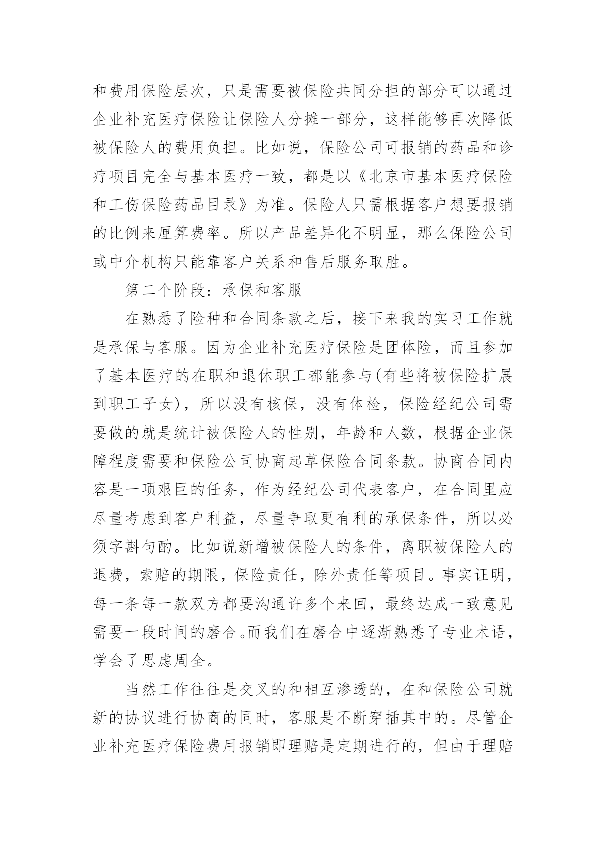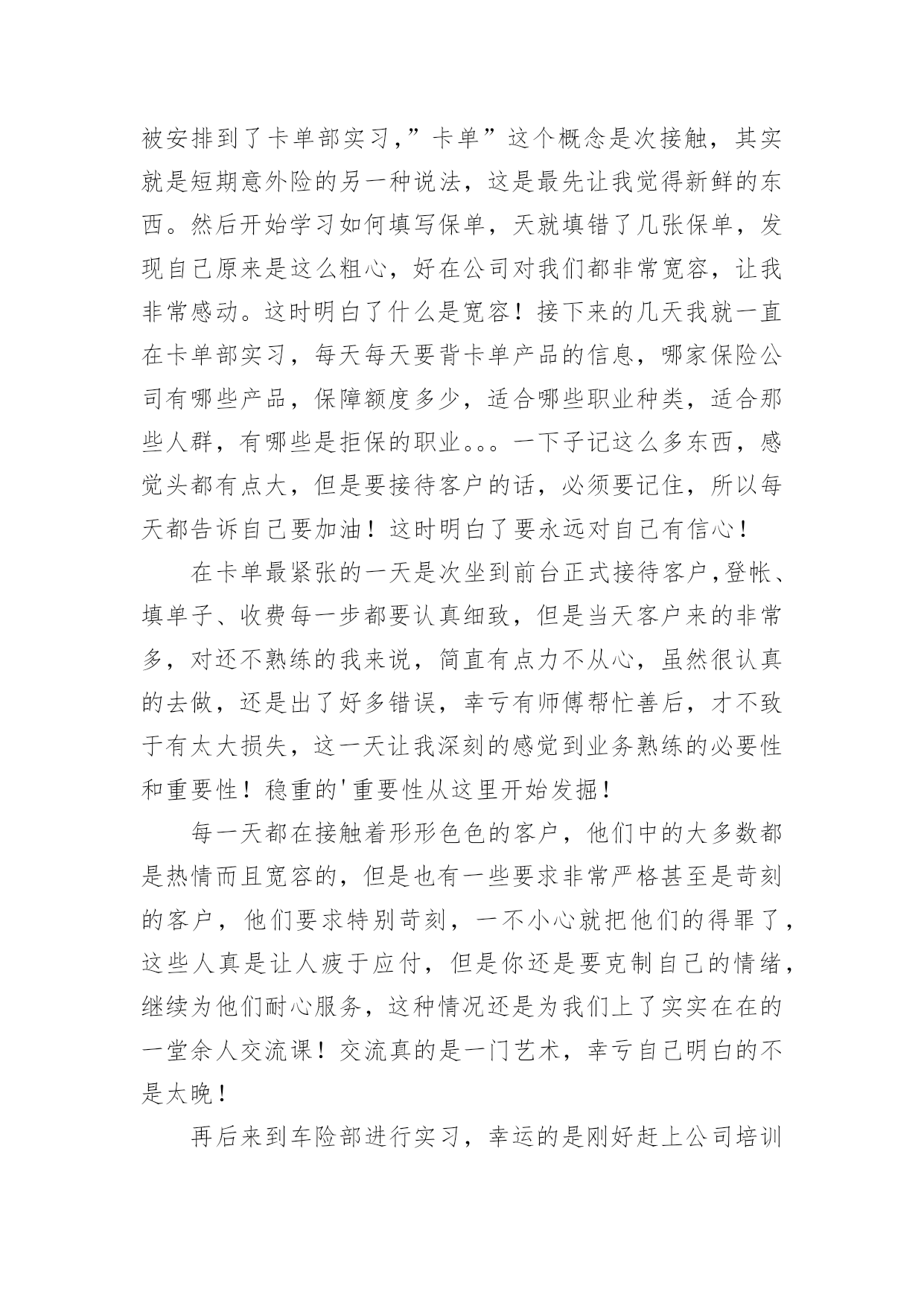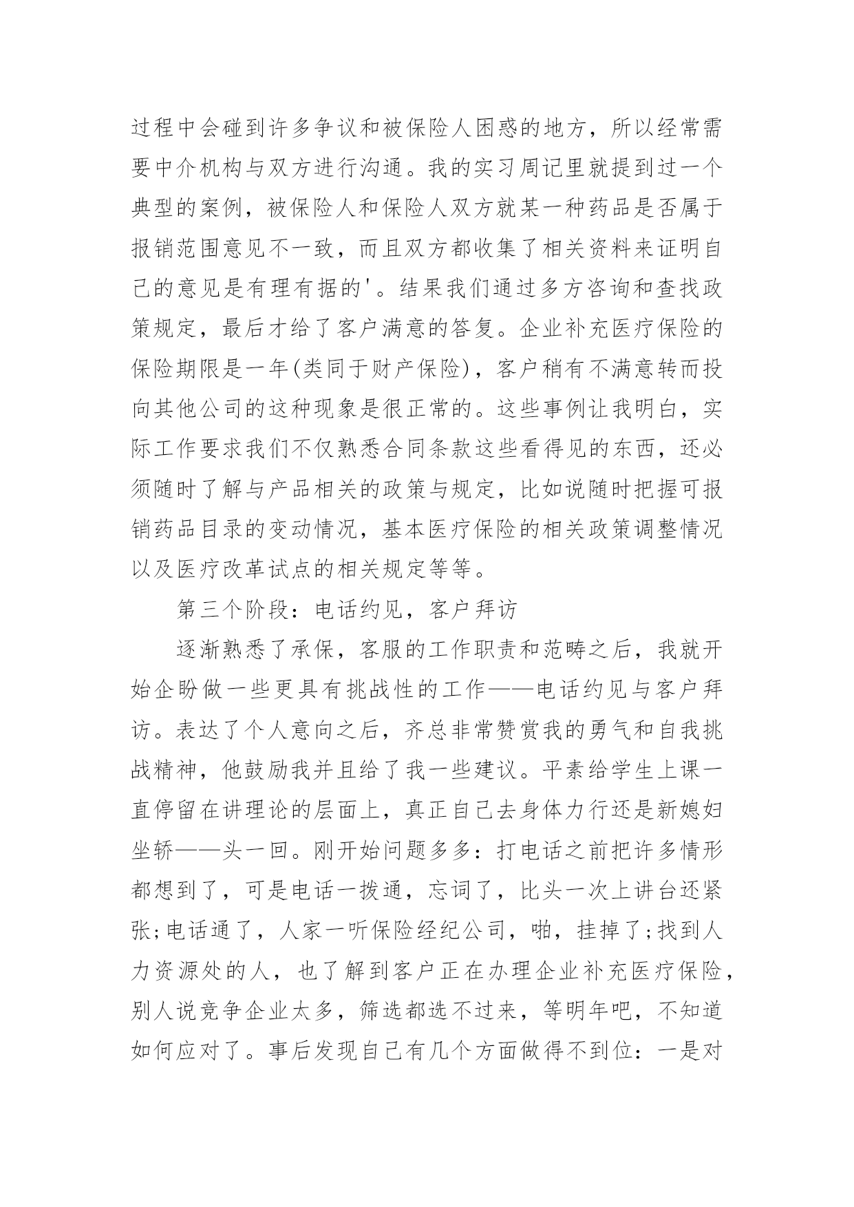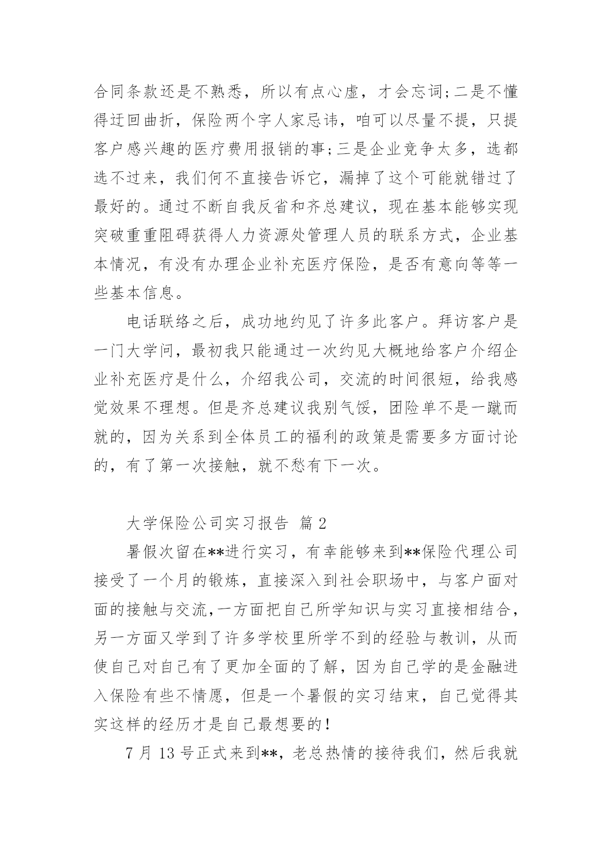 大学保险公司实习报告在不断进步的时代,报告的适用范围越来越广泛,不同种类的报告具有不同的用途。你还在对写报告感到一筹莫展吗?以下是小编为大家整理的大学保险公司实习报告,仅供参考,希望能够帮助到大家。大学保险公司实习报告篇1第一个阶段:熟悉公司运作,管理流程和合同条款天和是于20xx年成立的保险经纪机构,公司董事长和产寿险部总经理都是保险营销精英出身,目前在上海有一家分公司。产险方面以与中石化合作为基础不断拓展新业务,寿险以企业补充医疗保险为主逐步推广企业年金,客户有北京市卷烟厂等一些大型企业。公司规模不大,人事结构简单,内勤人员每个人既负责承保也负责客服,各自按客户划分工作范围和职责。秘书,出纳,人事由助理一肩挑。外勤人员负责业务联系,底薪加提成,激励机制简单易行。我选择天和实习,因为它小而员工分工不细,我可以在两个半月的时间里接触参与到每一个工作环节而不会因为是实习生受到排斥。承保,客服也好,外勤业务洽谈也好,都需要了解险种和合同条款。所以我首先是学习企业补充医疗保险的合同条款。通过一段时间的学习,我感觉各个公司的合同条款相差无几,都是直接在基本医疗保险的基础上确定费用保险项目和费用保险层次,只是需要被保险共同分担的部分可以通过企业补充医疗保险让保险人分摊一部分,这样能够再次降低被保险人的费用负担。比如说,保险公司可报销的药品和诊疗项目完全与基本医疗一致,都是以《北京市基本医疗保险和工伤保险药品目录》为准。保险人只需根据客户想要报销的比例来厘算费率。所以产品差异化不明显,那么保险公司或中介机构只能靠客户关系和售后服务取胜。第二个阶段:承保和客服在熟悉了险种和合同条款之后,接下来我的实习工作就是承保与客服。因为企业补充医疗保险是团体险,而且参加了基本医疗的在职和退休职工都能参与(有些将被保险扩展到职工子女),所以没有核保,没有体检,保险经纪公司需要做的就是统计被保险人的性别,年龄和人数,根据企业保障程度需要和保险公司协商起草保险合同条款。协商合同内容是一项艰巨的任务,作为经纪公司代表客户,在合同里应尽量考虑到客户利益,尽量争取更有利的承保条件,所以必须字斟句酌。比如说新增被保险人的条件,离职被保险人的退费,索赔的期限,保险责任,除外责任等项目。事实证明,每一条每一款双方都要沟通许多个来回,最终达成一致意见需要一段时间的磨合。而我们在磨合中逐渐熟悉了专业术语,学会了思虑周全。当然工作往往是交叉的和相互渗透的,在和保险公司就新的协议进行协商的同时,客服是不断穿插其中的。尽管企业补充医疗保险费用报销即理赔是定期进行的,但由于理赔过程中会碰到许多争议和被保险人困惑的地方,所以经常需要中介机构与双方进行沟通。我的实习周记里就提到过一个典型的案例,被保险人和保险人双方就某一种药品是否属于报销范围意见不一致,而且双方都收集了相关资料来证明自己的意见是有理有据的'。结果我们通过多方咨询和查找政策规定,最后才给了客户满意的答复。企业补充医疗保险的保险期限是一年(类同于财产保险),客户稍有不满意转而投向其他公司的这种现象是很正常的。这些事例让我明白,实际工作要求我们不仅熟悉合同条款这些看得见的东西,还必须随时了解与产品相关的政策与规定,比如说随时把握可报销药品目录的变动情况,基本医疗保险的相关政策调整情况以及医疗改革试点的相关规定等等。第三个阶段:电话约见,客户拜访逐渐熟悉了承保,客服的工作职责和范畴之后,我就开始企盼做一些更具有挑战性的工作——电话约见与客户拜访。表达了个人意向之后,齐总非常赞赏我的勇气和自我挑战精神,他鼓励我并且给了我一些建议。平素给学生上课一直停留在讲理论的层面上,真正自己去身体力行还是新媳妇坐轿——头一回。刚开始问题多多:打电话之前把许多情形都想到了,可是电话一拨通,忘词了,比头一次上讲台还紧张;电话通了,人家一听保险经纪公司,啪,挂掉了;找到人力资源处的人,也了解到客户正在办理企业补充医疗保险,别人说竞争企业太多,筛选都选不过来,等明年吧,不知道如何应对了。事后发现自己有几个方面做得不到位:一是对合同条款还是不熟悉,所以有点心虚,才会忘词;二是不懂得迂回曲折,保险两个字人家忌讳,咱可以尽量不提,只提客户感兴趣的医疗费用报销的事;三是企业竞争太多,选都选不过来,我们何不直接告诉它,漏掉了这个可能就错过了最好的。通过不断自我反省和齐总建议,现在基本能够实现突破重重阻碍获得人力资源处管理人员的联系方式,企业基本情况,有没有办理企业补充医疗保险,是否有意向等等一些基本信息。电话联络之后,成功地约见了许多此客户。拜访客户是一门大学问,最初我只能通过一次约见大概地给客户介绍企业补充医疗是什么,介绍我公司,交流的时间很短,给我感觉效果不理想。但是齐总建议我别气馁,团险单不是一蹴而就的,因为关系到全体员工的福利的政策是需要多方面讨论