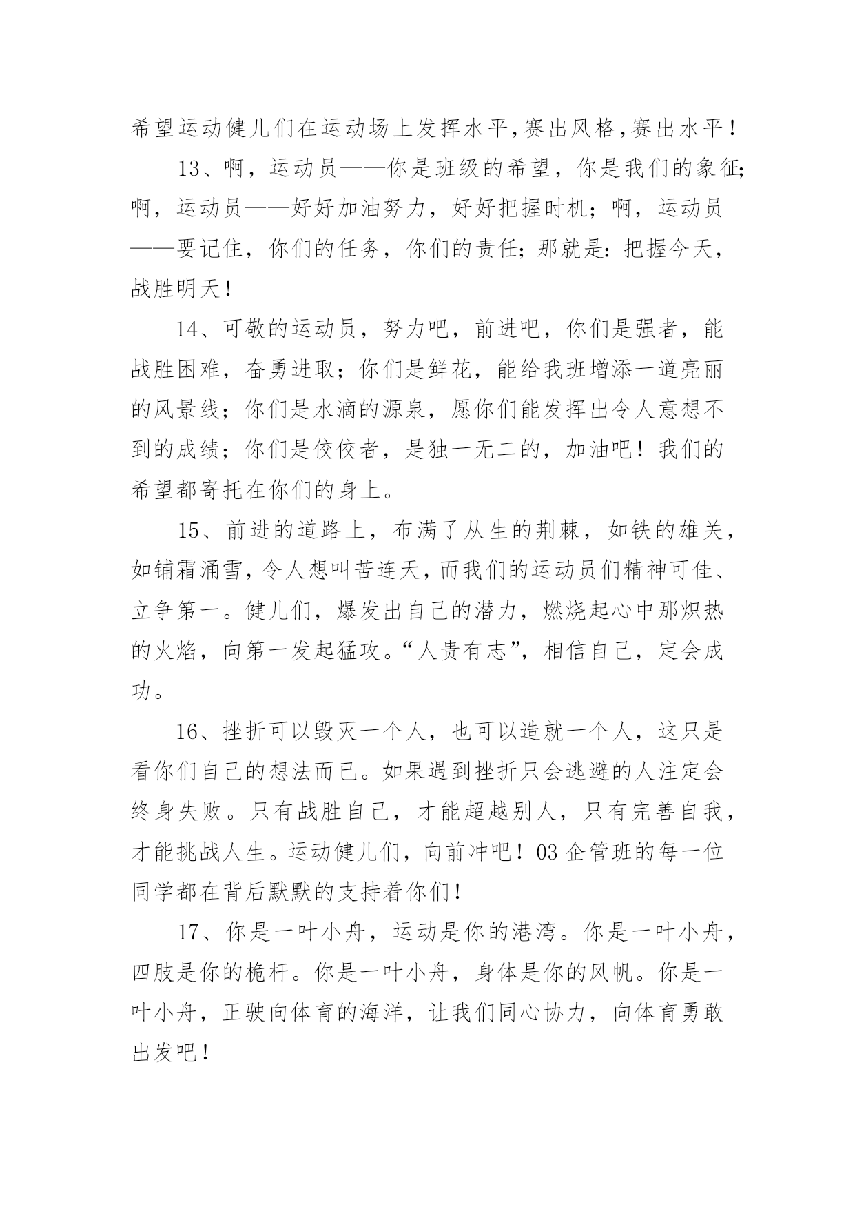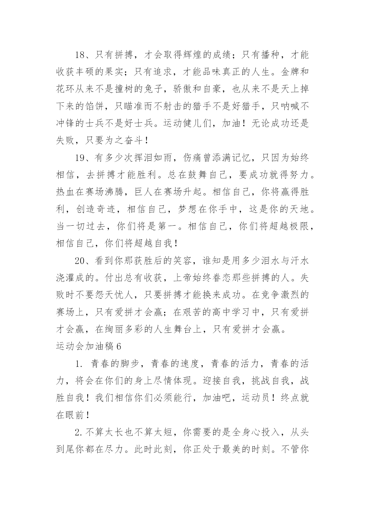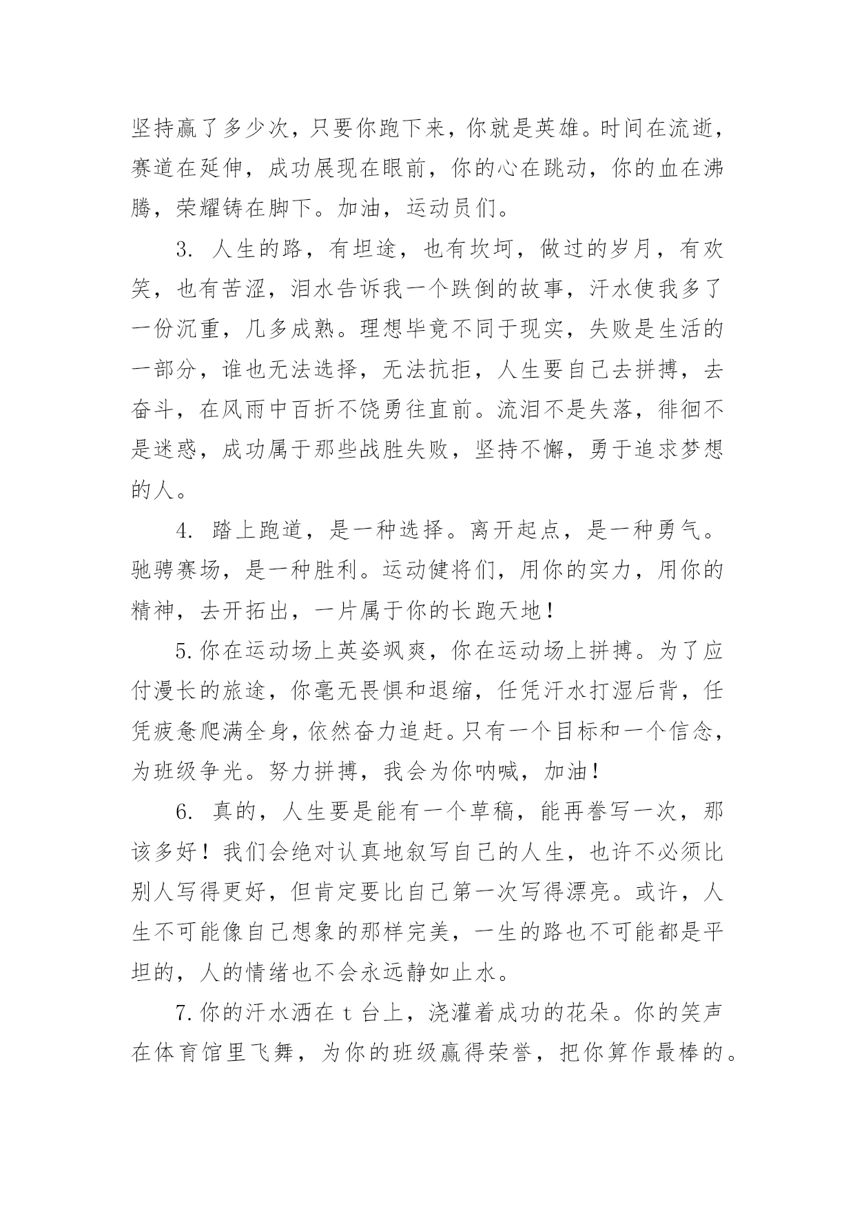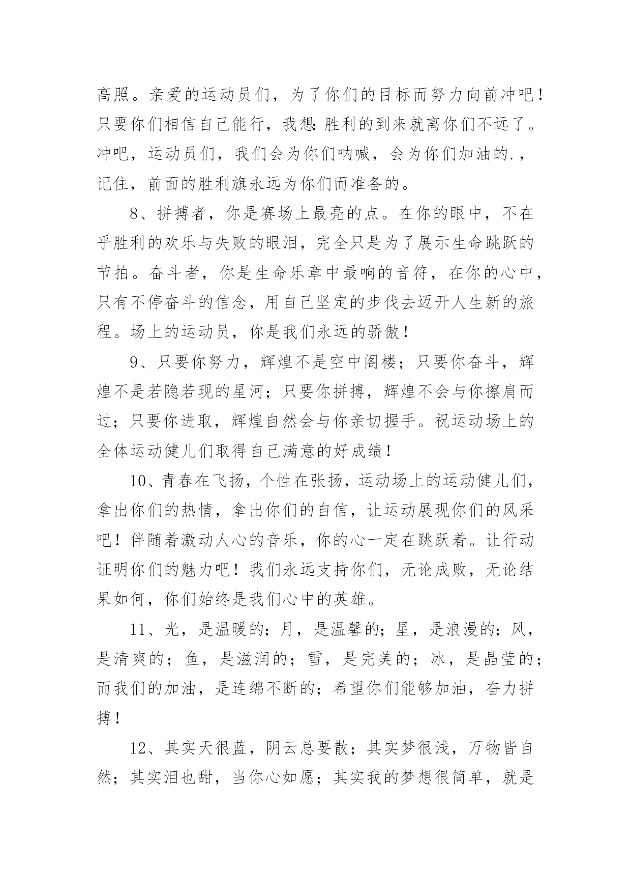 运动会加油稿运动会加油稿随着社会不断地进步,越来越多人会去使用加油稿,借助加油稿可以表达对对方的鼓励和支持。那么问题来了,到底应如何写好一份加油稿呢?下面是小编为大家整理的运动会加油稿,仅供参考,希望能够帮助到大家。运动会加油稿11、步子迈开,让我们飞驰在红色跑道上,用我们的泪水和热血,更改历史的记录,起立吧,歌唱吧!为我们的勇士加油!2、看!那一面面迎风飘舞的彩旗,是一朵朵盛开的鲜花;听!那一阵阵惊天动地的欢呼,是回响在耳边胜利的风声。运动场上的你们,是胜利的标志。3、不为掌声的诠释,不为刻意的征服,只有辛勤的汗水化作追求的脚步,心中坚定的信念,脚下沉稳的步伐。4、漫漫长路,你愿一人独撑,忍受着孤独与寂寞,承受着体力与精神的压迫,只任汗水溶于泪水,可脚步却从不停歇。好样的,纵然得不了桂冠。5、场上英姿显自豪,脚下步伐在飞奔。你们是骄傲。你们是自豪,跑道因你幻彩,面对红色跑道,你们挥洒自如,不惧一切冲向终点。6、真心祝愿——机会是什么?是不可错过的刹那间。呐喊是什么?是为那刹那间的真心祝愿。加油加油你肯定听到了,那一声声呐喊你肯定看到了。7、不为掌声的诠释,不为刻意的征服,只有辛勤的汗水化作追求的脚步,心中坚定的信念,脚下沉稳的步伐,你用行动诉说着一个不变的真理。8、时间在流逝,赛道在延伸,成功在你面前展现。心脏在跳动,热血在沸腾,辉煌在你脚下铸就。加油吧,健儿们。9、致失败者——倒下的时候,生命又怎能屹立!歪歪斜斜的身影,又怎耐的'住风雨的洗礼。你若有一个不屈的灵魂,脚下才会有一方坚实的土地。10、加油吧,运动健儿们!阵阵有力的步伐,声声有劲的呐喊,运动场上洒下我们青春的点点滴滴。旗摇摇,鼓声声,那里挡不助的是青春活力!运动会加油稿21、理想毕竟不同于现实,失败是生活的一部分。轻轻的抬起头,不需要任何的话语,让自信在脸上荡漾,不要为失利而苦恼,只需告诉自己,我曾努力过,我无怨无悔2、致运动员生活中,我们每天都在尝试,尝试中,我们走向成功品味失败,走过心灵的阴雨晴空运动员们,不要放弃尝试假如你成功了这就是下一次尝试的动力假如你失败了就总结经验,吸取教训,继续努力超越极限,超越自我,向梦的'方向起飞吧3、高三七班有勇女,巾帼岂将须眉让。古有木兰冲杀场,今有郎萍跑百米。4、萧瑟的秋风,挡不住你们破竹的锐气,广阔的绿茵场,是为你们搭建的舞台。张扬吧,年轻的心,我们将为你永远喝彩!运动会加油稿3今天阳光明媚,微风轻拂,在翘首以盼中,我们迎来了一年一度校运动会的第二天。当清晨的第一抹阳光洒在崭新的、多彩的操场上时,比赛早已热血沸腾了。新建的操场比原来的操场面积更宽阔,颜色更鲜艳,更富有一种强有力的精神动力。操场的主色调是艳丽的红色,中间的足球场是墨绿色的,由草绿相间的假草坪和其他塑胶制成,六条跑道上是由不同颜色进行划分,无毒无害,软硬适宜,安全性能极好,同学们可以在操场上尽情的奔跑、嬉戏。加油吧,运动员们!你们是班级的希望,班级的骄傲,等待你们的是艰难的400米长跑,同学们相信你们,胜利的一切属于你们,需要你们用勇敢、坚强的心去面对。比赛就要开始了,情绪高涨的运动员们,有的在做热身运动,甩胳膊,踢踢腿;有的`在摩拳擦掌,像经过严格受训的士兵;有的表情严肃,已经做好了起跑姿势,准备飞奔而出。随着裁判员“砰”的一声发令枪响,运动员们像一支支离弦的箭一样飞向终点——健步如飞,汗流浃背。我们正在为你们加油助威,你们是否听到了我们发自内心的呐喊,困难和胜利都在向你们招手,快冲啊!顿时,人声鼎沸,喝彩声响彻云霄。不要犹豫,快去击败困难,迎接宝贵的胜利吧!胜利的喜讯在你们手中传递着集体的凝聚力,释放着无穷的动力,一股强劲的正能量牵引着你们为班级荣誉而奋勇前进,赢来的是一张张被汗水打湿的微笑和一张张珍贵的奖状。运动会加油稿4年轻的心年轻的心微笑着走上跑道,心中充满对胜利的渴望。年轻的心舒展得将信念转化为动力,年轻的心奔腾着要让风放飞自己的梦,行到梦实现的地方。年轻的心永不畏惧无论是敌人还是自己,年轻的心永不言败拼搏了便再没遗憾,年轻的心拥有的只有自信,相信自己必胜的信念永不改变,年轻的心永远前进永不改变!目标你是否有这种感觉:目标越接近,困难越增加。征服困难的`条件是简单的,只要艰苦一时,忍耐一时,抱着信念,永不回头。为了你心中永恒的目标,为了你夺取胜利后的微笑,不要拒绝眼泪和汗水。向着理想飞翔。运动会加油稿51、奥林匹克精神佳,运动健将拼搏强。在运动场上的运动健儿们,发挥你们的特长,展示你们的风采,让你们的身影在运动场上留下优美的风景线,让你们的雄心壮志在运动场上发挥的淋漓尽致。2、青春是不老的誓言,飞扬是年轻的梦想,金色的十月,让我们在这长长的跑道上青春飞扬,现出飒爽的风姿,亮出真我的风采,带上同学们的热情,载着同伴们的希望,背负老师的嘱托,在