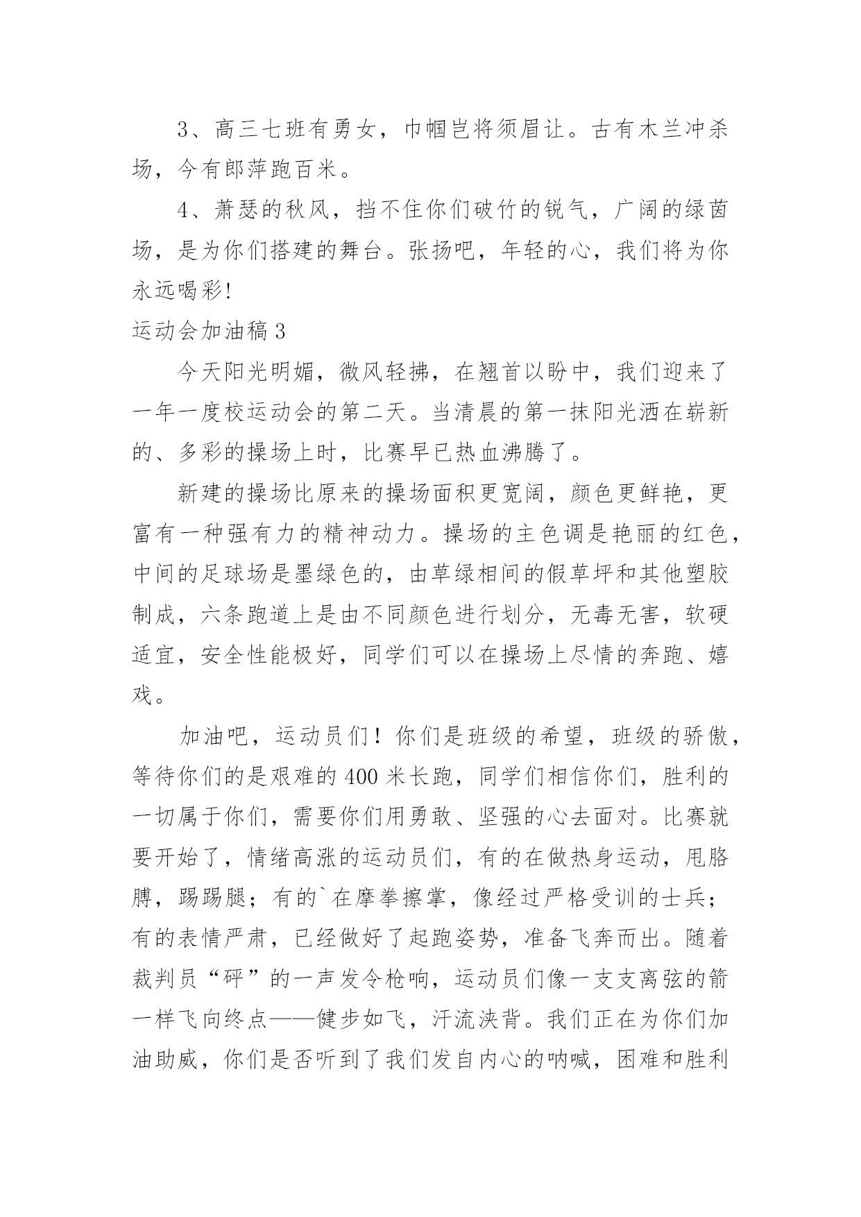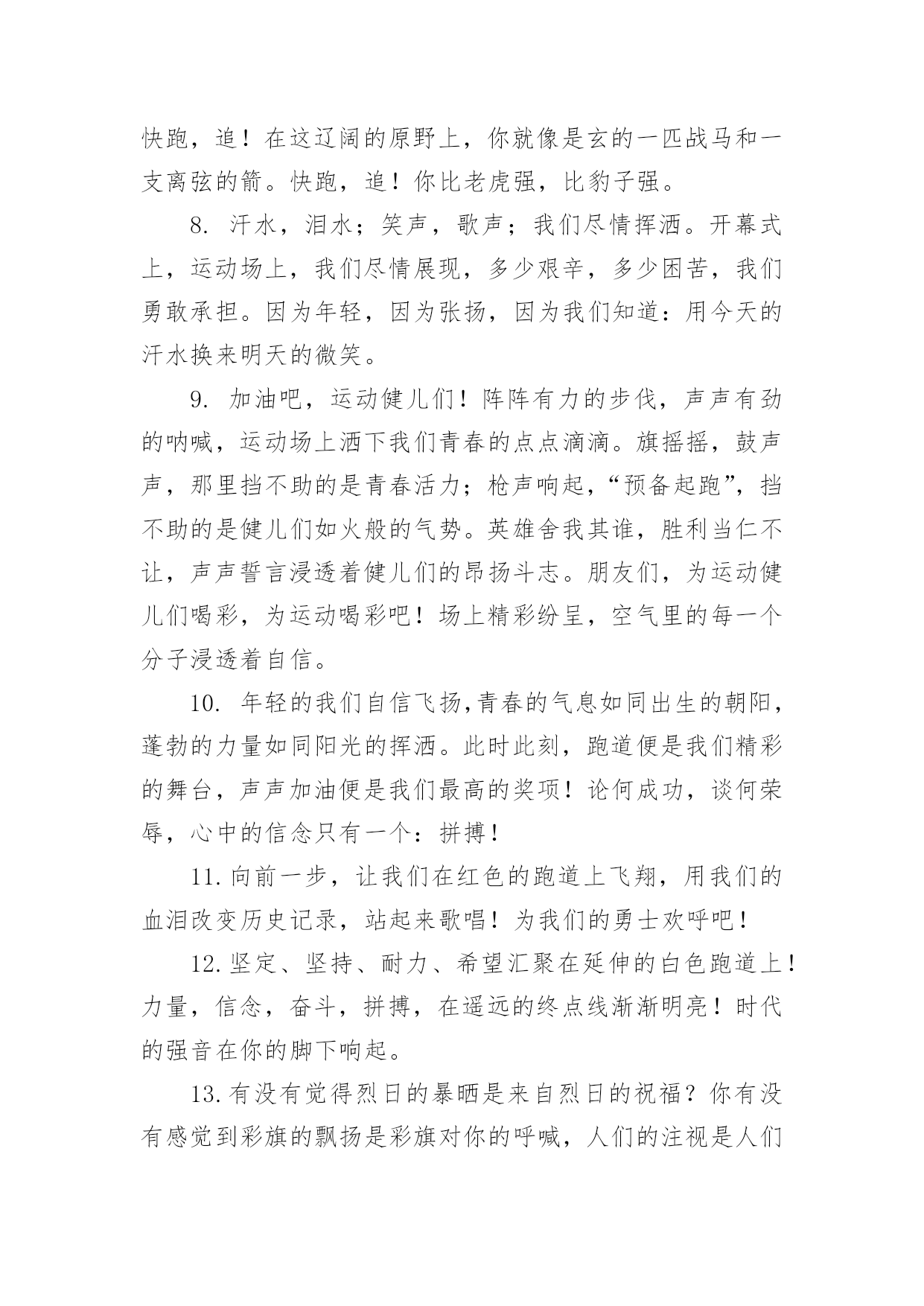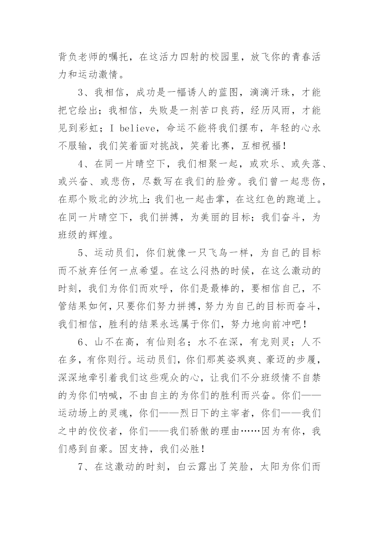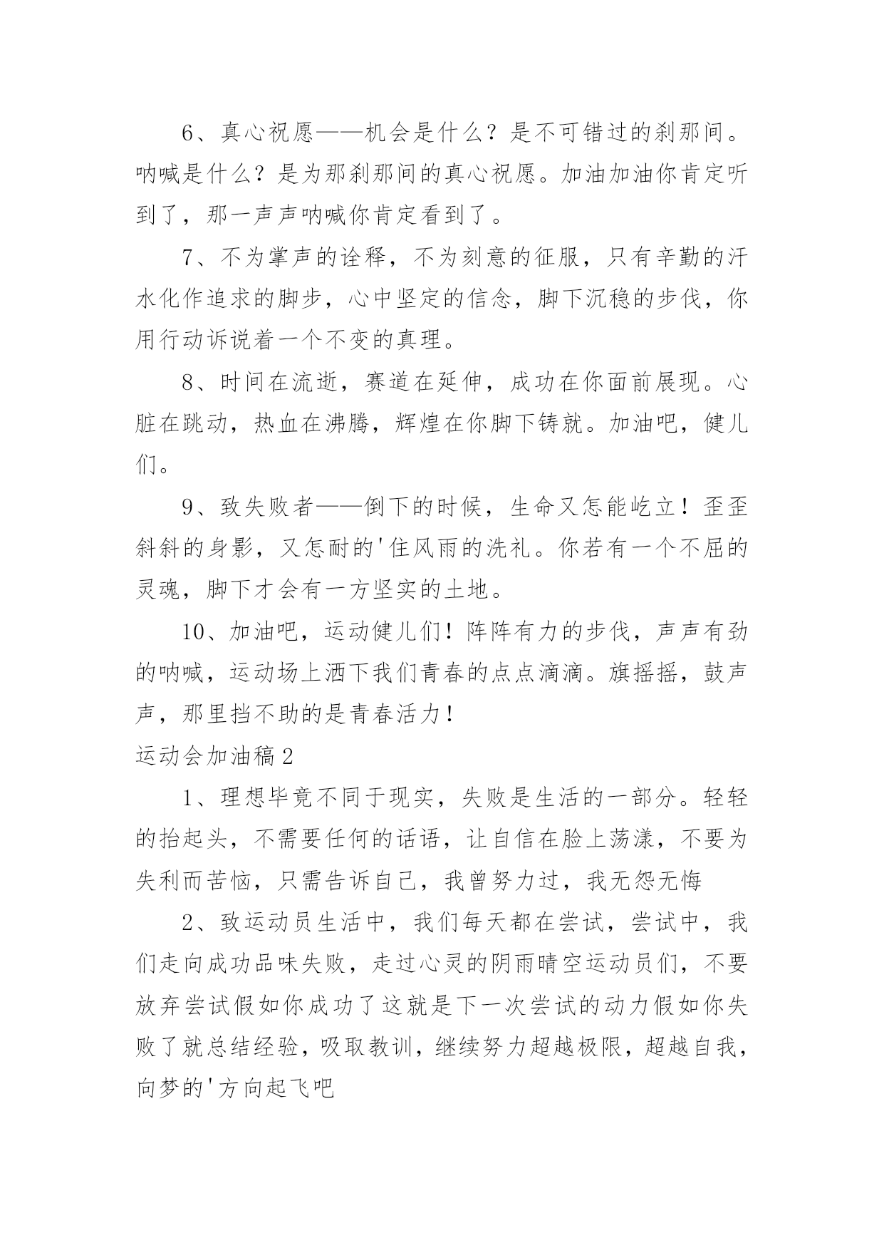 运动会加油稿运动会加油稿随着社会不断地进步,越来越多人会去使用加油稿,借助加油稿可以表达对对方的鼓励和支持。那么问题来了,到底应如何写好一份加油稿呢?下面是小编为大家整理的运动会加油稿,仅供参考,希望能够帮助到大家。运动会加油稿11、步子迈开,让我们飞驰在红色跑道上,用我们的泪水和热血,更改历史的记录,起立吧,歌唱吧!为我们的勇士加油!2、看!那一面面迎风飘舞的彩旗,是一朵朵盛开的鲜花;听!那一阵阵惊天动地的欢呼,是回响在耳边胜利的风声。运动场上的你们,是胜利的标志。3、不为掌声的诠释,不为刻意的征服,只有辛勤的汗水化作追求的脚步,心中坚定的信念,脚下沉稳的步伐。4、漫漫长路,你愿一人独撑,忍受着孤独与寂寞,承受着体力与精神的压迫,只任汗水溶于泪水,可脚步却从不停歇。好样的,纵然得不了桂冠。5、场上英姿显自豪,脚下步伐在飞奔。你们是骄傲。你们是自豪,跑道因你幻彩,面对红色跑道,你们挥洒自如,不惧一切冲向终点。6、真心祝愿——机会是什么?是不可错过的刹那间。呐喊是什么?是为那刹那间的真心祝愿。加油加油你肯定听到了,那一声声呐喊你肯定看到了。7、不为掌声的诠释,不为刻意的征服,只有辛勤的汗水化作追求的脚步,心中坚定的信念,脚下沉稳的步伐,你用行动诉说着一个不变的真理。8、时间在流逝,赛道在延伸,成功在你面前展现。心脏在跳动,热血在沸腾,辉煌在你脚下铸就。加油吧,健儿们。9、致失败者——倒下的时候,生命又怎能屹立!歪歪斜斜的身影,又怎耐的'住风雨的洗礼。你若有一个不屈的灵魂,脚下才会有一方坚实的土地。10、加油吧,运动健儿们!阵阵有力的步伐,声声有劲的呐喊,运动场上洒下我们青春的点点滴滴。旗摇摇,鼓声声,那里挡不助的是青春活力!运动会加油稿21、理想毕竟不同于现实,失败是生活的一部分。轻轻的抬起头,不需要任何的话语,让自信在脸上荡漾,不要为失利而苦恼,只需告诉自己,我曾努力过,我无怨无悔2、致运动员生活中,我们每天都在尝试,尝试中,我们走向成功品味失败,走过心灵的阴雨晴空运动员们,不要放弃尝试假如你成功了这就是下一次尝试的动力假如你失败了就总结经验,吸取教训,继续努力超越极限,超越自我,向梦的'方向起飞吧3、高三七班有勇女,巾帼岂将须眉让。古有木兰冲杀场,今有郎萍跑百米。4、萧瑟的秋风,挡不住你们破竹的锐气,广阔的绿茵场,是为你们搭建的舞台。张扬吧,年轻的心,我们将为你永远喝彩!运动会加油稿3今天阳光明媚,微风轻拂,在翘首以盼中,我们迎来了一年一度校运动会的第二天。当清晨的第一抹阳光洒在崭新的、多彩的操场上时,比赛早已热血沸腾了。新建的操场比原来的操场面积更宽阔,颜色更鲜艳,更富有一种强有力的精神动力。操场的主色调是艳丽的红色,中间的足球场是墨绿色的,由草绿相间的假草坪和其他塑胶制成,六条跑道上是由不同颜色进行划分,无毒无害,软硬适宜,安全性能极好,同学们可以在操场上尽情的奔跑、嬉戏。加油吧,运动员们!你们是班级的希望,班级的骄傲,等待你们的是艰难的400米长跑,同学们相信你们,胜利的一切属于你们,需要你们用勇敢、坚强的心去面对。比赛就要开始了,情绪高涨的运动员们,有的在做热身运动,甩胳膊,踢踢腿;有的`在摩拳擦掌,像经过严格受训的士兵;有的表情严肃,已经做好了起跑姿势,准备飞奔而出。随着裁判员“砰”的一声发令枪响,运动员们像一支支离弦的箭一样飞向终点——健步如飞,汗流浃背。我们正在为你们加油助威,你们是否听到了我们发自内心的呐喊,困难和胜利都在向你们招手,快冲啊!顿时,人声鼎沸,喝彩声响彻云霄。不要犹豫,快去击败困难,迎接宝贵的胜利吧!胜利的喜讯在你们手中传递着集体的凝聚力,释放着无穷的动力,一股强劲的正能量牵引着你们为班级荣誉而奋勇前进,赢来的是一张张被汗水打湿的微笑和一张张珍贵的奖状。运动会加油稿4年轻的心年轻的心微笑着走上跑道,心中充满对胜利的渴望。年轻的心舒展得将信念转化为动力,年轻的心奔腾着要让风放飞自己的梦,行到梦实现的地方。年轻的心永不畏惧无论是敌人还是自己,年轻的心永不言败拼搏了便再没遗憾,年轻的心拥有的只有自信,相信自己必胜的信念永不改变,年轻的心永远前进永不改变!目标你是否有这种感觉:目标越接近,困难越增加。征服困难的`条件是简单的,只要艰苦一时,忍耐一时,抱着信念,永不回头。为了你心中永恒的目标,为了你夺取胜利后的微笑,不要拒绝眼泪和汗水。向着理想飞翔。运动会加油稿51、奥林匹克精神佳,运动健将拼搏强。在运动场上的运动健儿们,发挥你们的特长,展示你们的风采,让你们的身影在运动场上留下优美的风景线,让你们的雄心壮志在运动场上发挥的淋漓尽致。2、青春是不老的誓言,飞扬是年轻的梦想,金色的十月,让我们在这长长的跑道上青春飞扬,现出飒爽的风姿,亮出真我的风采,带上同学们的热情,载着同伴们的希望,背负老师的嘱托,在