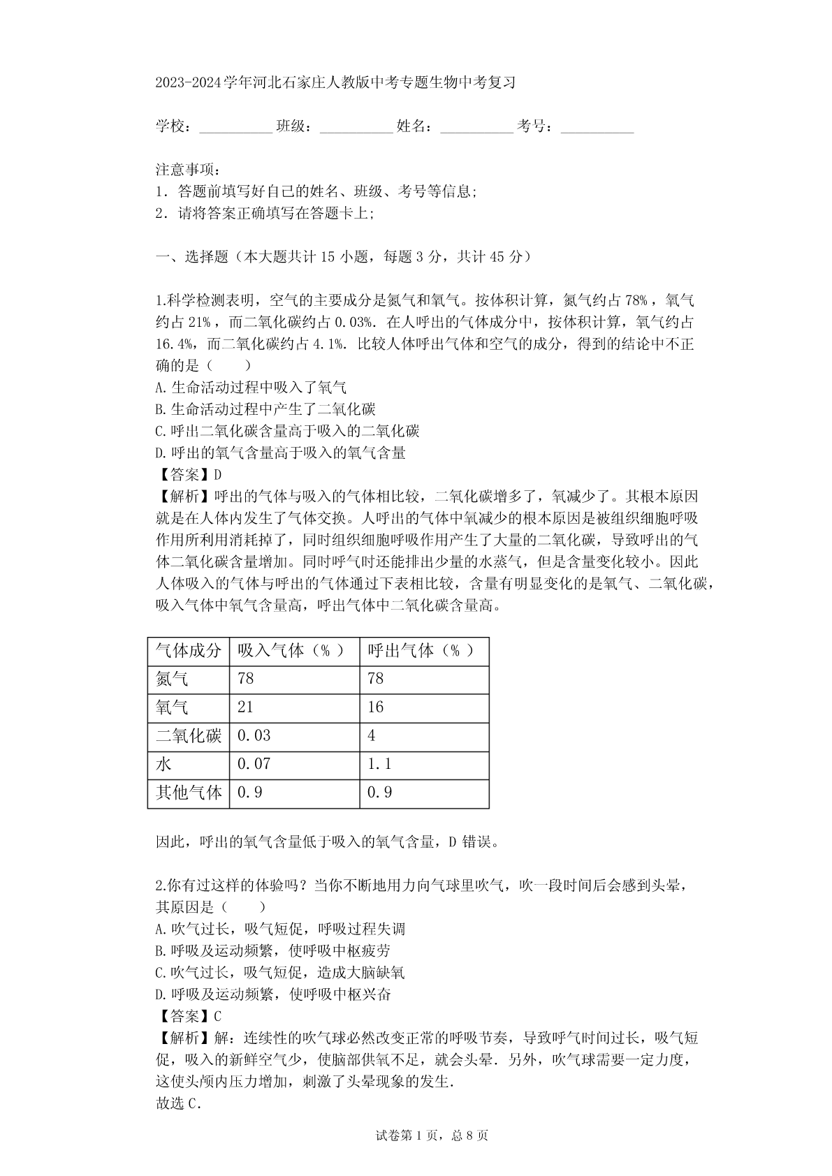2023-2024学年河北石家庄人教版中考专题生物中考复习(真题及答案).pdf