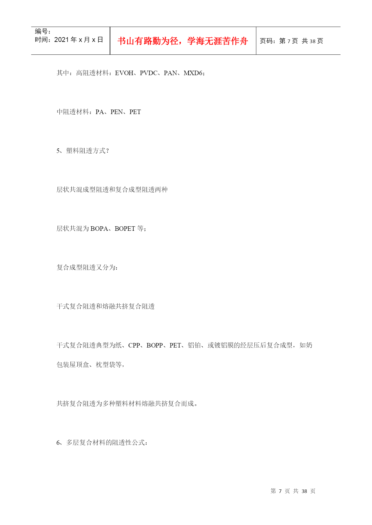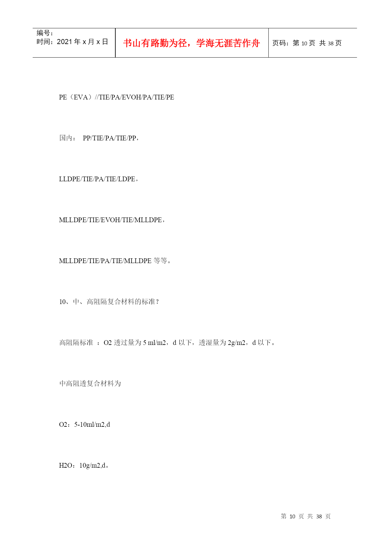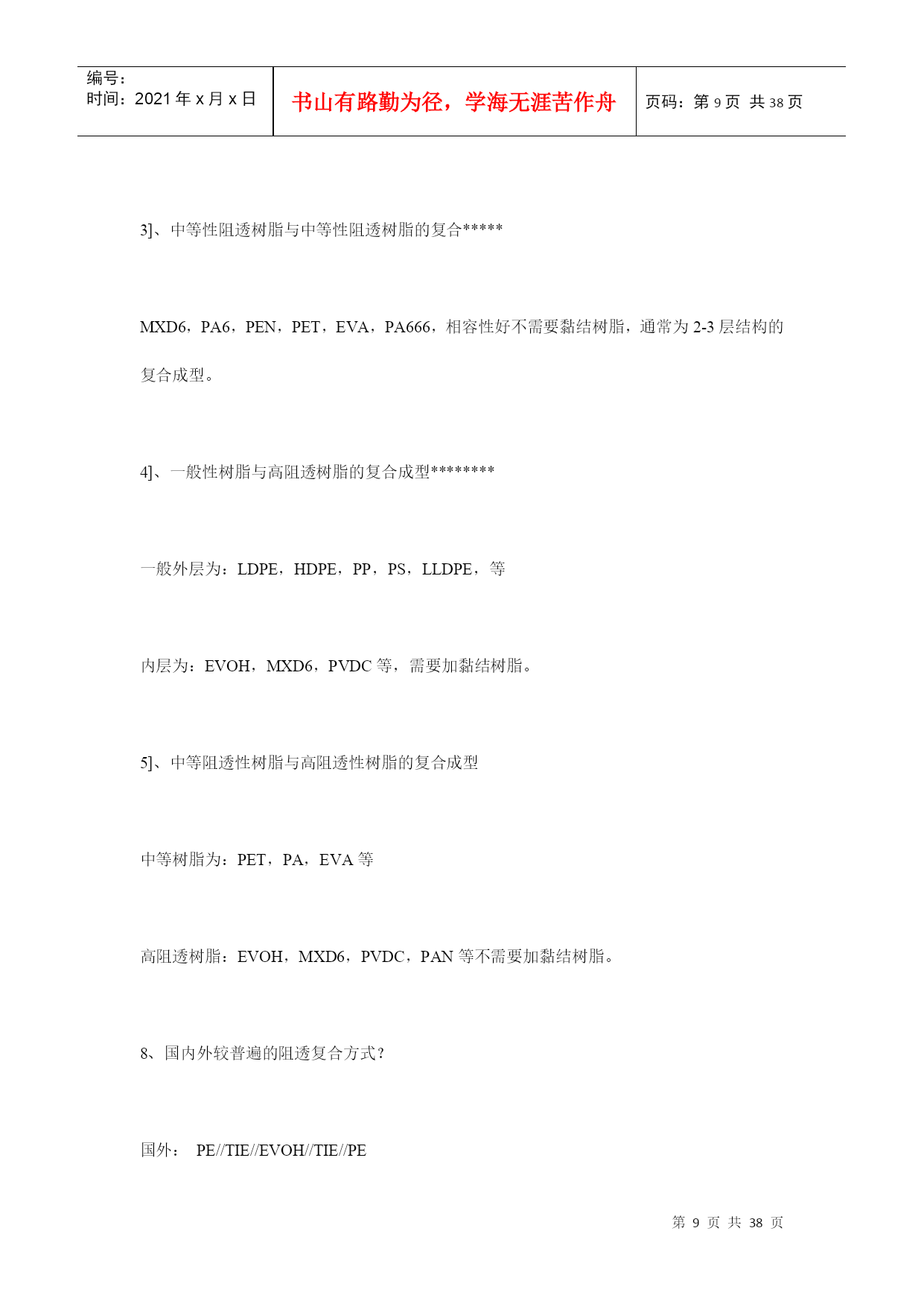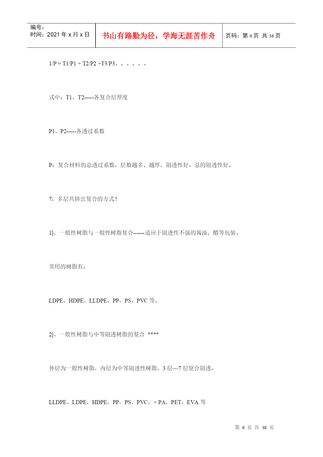 编号:时间:2021年x月x日书山有路勤为径,学海无涯苦作舟页码:第PAGE38页共NUMPAGES38页第PAGE\*MERGEFORMAT38页共NUMPAGES\*MERGEFORMAT38页塑料薄膜基本常识第一部分软包装材料之---塑料薄膜基本知识一、软包装之薄膜的定义在国家包装通用术语(GB4122—83)中,软包装的定义为:软包装是指在充填或取出内装物后,容器形状可发生变化的包装。用纸、铝箔、纤维、塑料薄膜以及它们的复合物所制成的各种袋、盒、套、包封等均为软包装。一般将厚度在0.25mm以下的片状塑料称为薄膜。塑料薄膜透明、柔韧,具有良好的耐水性、防潮性和阻气性、机械强度较好,化学性质稳定,耐油脂,易于印刷精美图文,可以热封制袋。它能满足各种物品的包装要求,是用于包装易存、易放的方便食品,生活用品,超级市场的小包装商品的理想材料。以塑料薄膜为主的软包装印刷在包装印刷中占有重要地位。据统计,从1980年以来,世界上一些先进国家的塑料包装占整个包装印刷的32.5%~44%。一般来说,因为单一薄膜材料对内装物的保护性不够理想,所以多采用将两种以上的薄膜复合为一层的复合薄膜,以满足食品保鲜、无菌包装技术的要求。复合薄膜的外层材料多选用不易划伤、磨毛,光学性能优良,印刷性能良好的材科,如:纸、玻璃纸、拉伸聚丙烯、聚酯等;中间层是阻隔性聚合物,如:铝箔、蒸镀铝、聚俯二氮乙烯电里层材料多选用无毒、无味的聚乙烯等热塑性树脂。二、塑料阻透性技术介绍1、塑料的阻透性?塑料制品(容器、薄膜)对小分子气体、液体、水蒸汽及气味的屏蔽能力。2、透过系数?塑料阻透能力大小的指标。定义:一定厚度(1mm)的塑料制品,在一定的压力(1Mpa),一定的温度(23度),一定的湿度(65%)下,单位时间(1day=24小时),单位面积(1m2),通过小分子物质(O2、CO2、H2O)的体积或重量。表示为(cm3)、(g)对于气体:单位为cm3,mm/m2,d,mpa;对于液体:单位为g,mm/m2,d,mpa;3、常用中高阻透性塑料的透过系数塑料品种/系数O2CO2H2OEVOH(PE29%)0.11.520-25EVOH(PE38%)0.4640-70PVDC0.5-41.-20.2-6MXD62-52815-30PAN81650PEN12-22505-9PA66615-3050-70100PA625-40150-200150PET49-90180180-300HDPE2500PP3000LDPE10000EVA180004、名词解释EVOH:(EVAL)乙烯-乙烯醇共聚物PA6—666:聚酰胺(尼龙)MXD6:芳香尼龙,间苯二甲胺和己二酸的偏聚物PVDC:聚偏二氯乙烯PAN:聚丙烯晴PEN:聚萘二甲酸乙二醇脂PET:聚对苯二甲酸乙二醇脂PP:聚丙烯PE:聚乙烯PS:苯乙烯HDPE:高密度聚乙烯LDPE低密度聚乙烯LLDPE线性低密度聚乙烯MLLDPE:茂金属线性低密度聚乙烯IONOMER:离子键聚合物EVA:乙烯-乙酸乙烯脂共聚物TIE:钛,树脂粘合剂AC:聚乙烯亚胺AC:乙醇:水=1:6:3PU:聚氨脂PU:固化剂:丙酮=7:1:45PVA:聚乙烯醇其中:高阻透材料:EVOH、PVDC、PAN、MXD6;中阻透材料:PA、PEN、PET5、塑料阻透方式?层状共混成型阻透和复合成型阻透两种层状共混为BOPA、BOPET等;复合成型阻透又分为:干式复合阻透和熔融共挤复合阻透干式复合阻透典型为纸、CPP、BOPP、PET、铝铂、或镀铝膜的经层压后复合成型,如奶包装屋顶盒、枕型袋等,共挤复合阻透为多种塑料材料熔融共挤复合而成。6、多层复合材料的阻透性公式:1/P=T1/P1+T2/P2+T3/P3。。。。。。式中:T1、T2-----各复合层厚度P1、P2-----各透过系数P:复合材料的总透过系数,层数越多、越厚,阻透性好,总的阻透性好。7、多层共挤出复合的方式?1]、一般性树脂与一般性树脂复合------适应于阻透性不强的酱油、醋等包装。常用的树脂有:LDPE、HDPE、LLDPE、PP、PS、PVC等。2]、一般性树脂与中等阻透树脂的复合****外层为一般性树脂,内层为中等阻透性树脂,3层—7层复合阻透。LLDPE,LDPE,HDPE,PP,PS,PVC,+PA,PET、EVA等3]、中等性阻透树脂与中等性阻透树脂的复合*****MXD6,PA6,PEN,PET,EVA,PA666,相容性好不需要黏结树脂,通常为2-3层结构的复合成型。4]、一般性树脂与高阻透树脂的复合成型********一般外层为:LDPE,HDPE,PP,PS,LLDPE,等内层为:EVOH,MXD6,PVDC等,需要加黏结树脂。5]、中等阻