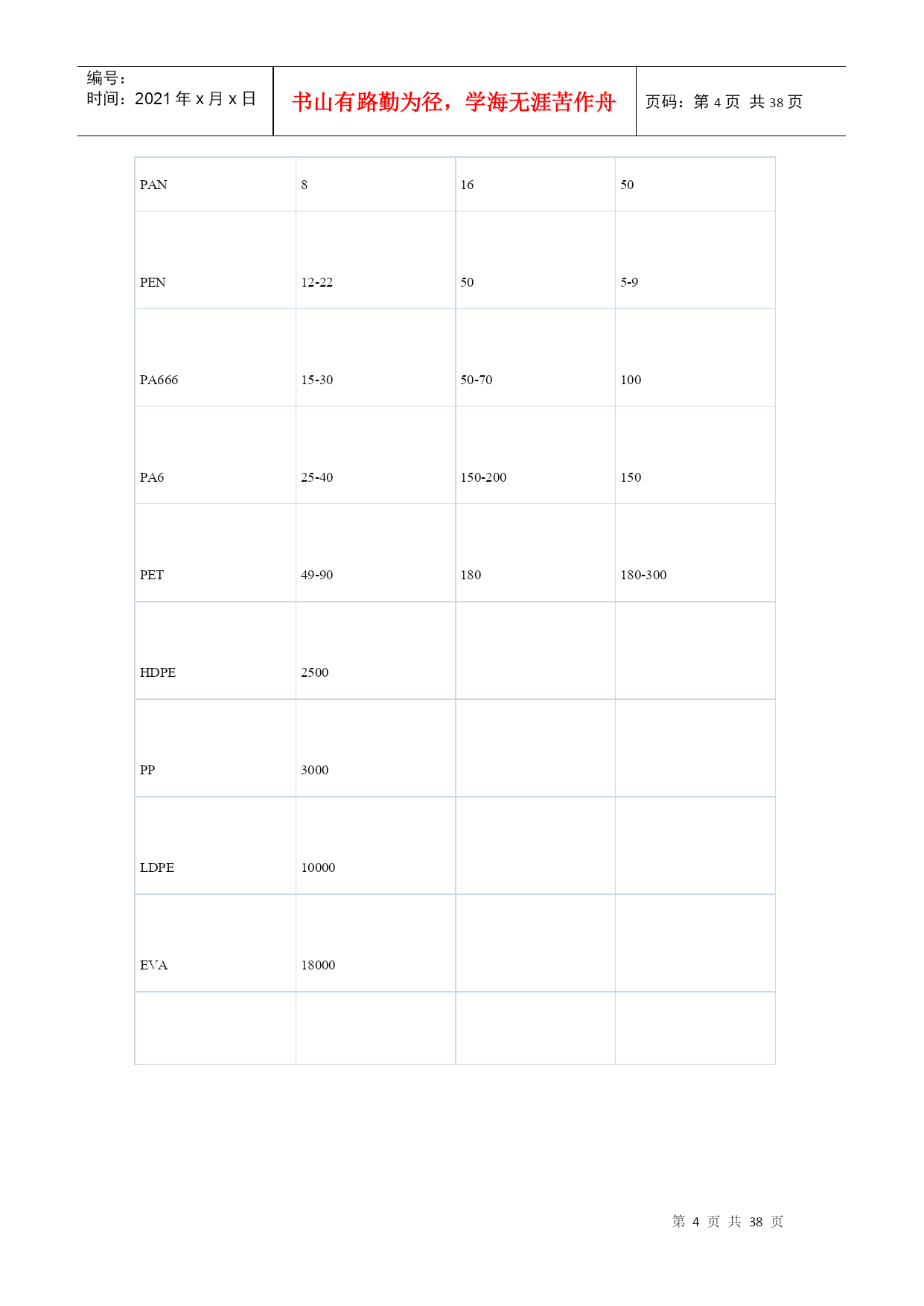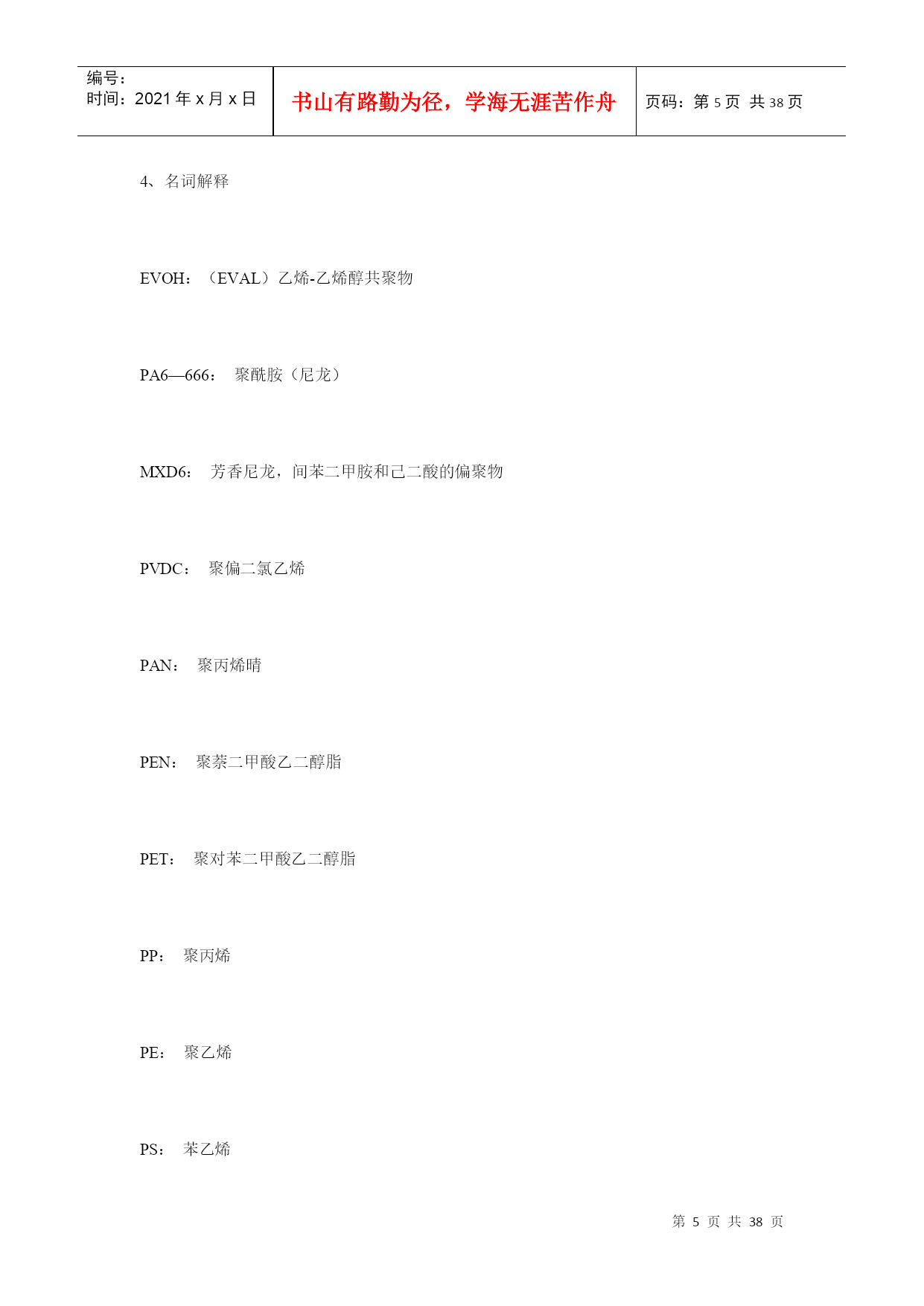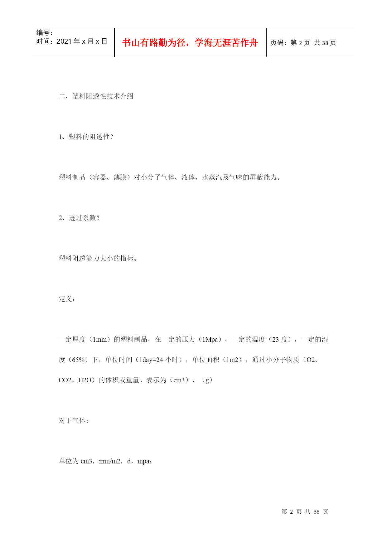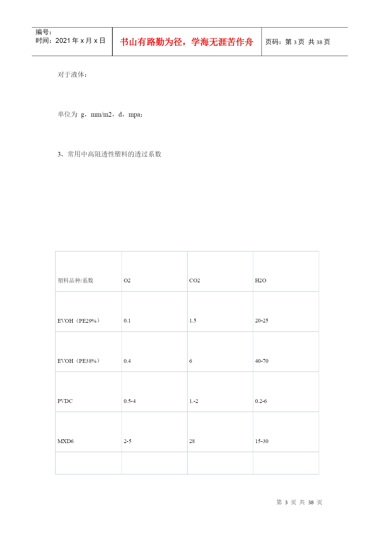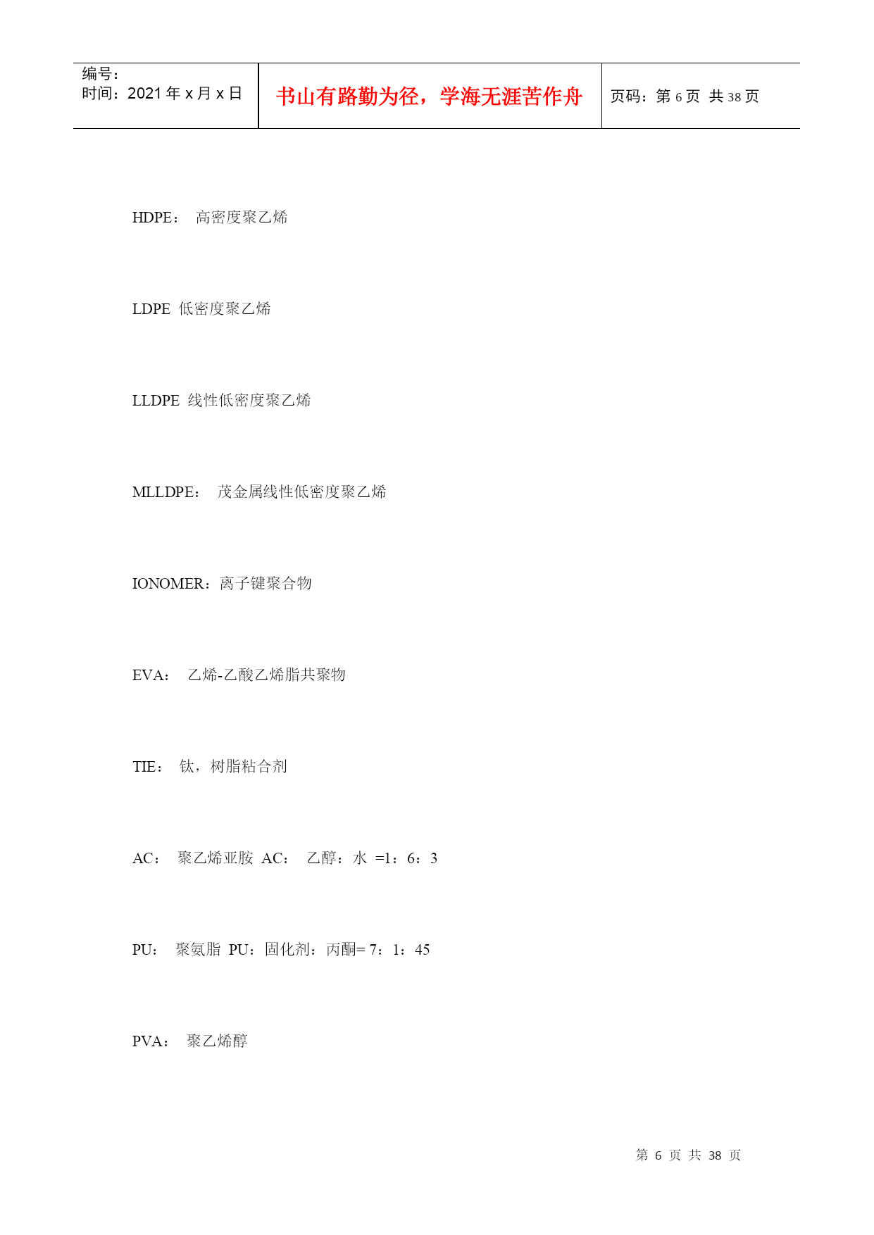 编号:时间:2021年x月x日书山有路勤为径,学海无涯苦作舟页码:第PAGE38页共NUMPAGES38页第PAGE\*MERGEFORMAT38页共NUMPAGES\*MERGEFORMAT38页塑料薄膜基本常识第一部分软包装材料之---塑料薄膜基本知识一、软包装之薄膜的定义在国家包装通用术语(GB4122—83)中,软包装的定义为:软包装是指在充填或取出内装物后,容器形状可发生变化的包装。用纸、铝箔、纤维、塑料薄膜以及它们的复合物所制成的各种袋、盒、套、包封等均为软包装。一般将厚度在0.25mm以下的片状塑料称为薄膜。塑料薄膜透明、柔韧,具有良好的耐水性、防潮性和阻气性、机械强度较好,化学性质稳定,耐油脂,易于印刷精美图文,可以热封制袋。它能满足各种物品的包装要求,是用于包装易存、易放的方便食品,生活用品,超级市场的小包装商品的理想材料。以塑料薄膜为主的软包装印刷在包装印刷中占有重要地位。据统计,从1980年以来,世界上一些先进国家的塑料包装占整个包装印刷的32.5%~44%。一般来说,因为单一薄膜材料对内装物的保护性不够理想,所以多采用将两种以上的薄膜复合为一层的复合薄膜,以满足食品保鲜、无菌包装技术的要求。复合薄膜的外层材料多选用不易划伤、磨毛,光学性能优良,印刷性能良好的材科,如:纸、玻璃纸、拉伸聚丙烯、聚酯等;中间层是阻隔性聚合物,如:铝箔、蒸镀铝、聚俯二氮乙烯电里层材料多选用无毒、无味的聚乙烯等热塑性树脂。二、塑料阻透性技术介绍1、塑料的阻透性?塑料制品(容器、薄膜)对小分子气体、液体、水蒸汽及气味的屏蔽能力。2、透过系数?塑料阻透能力大小的指标。定义:一定厚度(1mm)的塑料制品,在一定的压力(1Mpa),一定的温度(23度),一定的湿度(65%)下,单位时间(1day=24小时),单位面积(1m2),通过小分子物质(O2、CO2、H2O)的体积或重量。表示为(cm3)、(g)对于气体:单位为cm3,mm/m2,d,mpa;对于液体:单位为g,mm/m2,d,mpa;3、常用中高阻透性塑料的透过系数塑料品种/系数O2CO2H2OEVOH(PE29%)0.11.520-25EVOH(PE38%)0.4640-70PVDC0.5-41.-20.2-6MXD62-52815-30PAN81650PEN12-22505-9PA66615-3050-70100PA625-40150-200150PET49-90180180-300HDPE2500PP3000LDPE10000EVA180004、名词解释EVOH:(EVAL)乙烯-乙烯醇共聚物PA6—666:聚酰胺(尼龙)MXD6:芳香尼龙,间苯二甲胺和己二酸的偏聚物PVDC:聚偏二氯乙烯PAN:聚丙烯晴PEN:聚萘二甲酸乙二醇脂PET:聚对苯二甲酸乙二醇脂PP:聚丙烯PE:聚乙烯PS:苯乙烯HDPE:高密度聚乙烯LDPE低密度聚乙烯LLDPE线性低密度聚乙烯MLLDPE:茂金属线性低密度聚乙烯IONOMER:离子键聚合物EVA:乙烯-乙酸乙烯脂共聚物TIE:钛,树脂粘合剂AC:聚乙烯亚胺AC:乙醇:水=1:6:3PU:聚氨脂PU:固化剂:丙酮=7:1:45PVA:聚乙烯醇其中:高阻透材料:EVOH、PVDC、PAN、MXD6;中阻透材料:PA、PEN、PET5、塑料阻透方式?层状共混成型阻透和复合成型阻透两种层状共混为BOPA、BOPET等;复合成型阻透又分为:干式复合阻透和熔融共挤复合阻透干式复合阻透典型为纸、CPP、BOPP、PET、铝铂、或镀铝膜的经层压后复合成型,如奶包装屋顶盒、枕型袋等,共挤复合阻透为多种塑料材料熔融共挤复合而成。6、多层复合材料的阻透性公式:1/P=T1/P1+T2/P2+T3/P3。。。。。。式中:T1、T2-----各复合层厚度P1、P2-----各透过系数P:复合材料的总透过系数,层数越多、越厚,阻透性好,总的阻透性好。7、多层共挤出复合的方式?1]、一般性树脂与一般性树脂复合------适应于阻透性不强的酱油、醋等包装。常用的树脂有:LDPE、HDPE、LLDPE、PP、PS、PVC等。2]、一般性树脂与中等阻透树脂的复合****外层为一般性树脂,内层为中等阻透性树脂,3层—7层复合阻透。LLDPE,LDPE,HDPE,PP,PS,PVC,+PA,PET、EVA等3]、中等性阻透树脂与中等性阻透树脂的复合*****MXD6,PA6,PEN,PET,EVA,PA666,相容性好不需要黏结树脂,通常为2-3层结构的复合成型。4]、一般性树脂与高阻透树脂的复合成型********一般外层为:LDPE,HDPE,PP,PS,LLDPE,等内层为:EVOH,MXD6,PVDC等,需要加黏结树脂。5]、中等阻