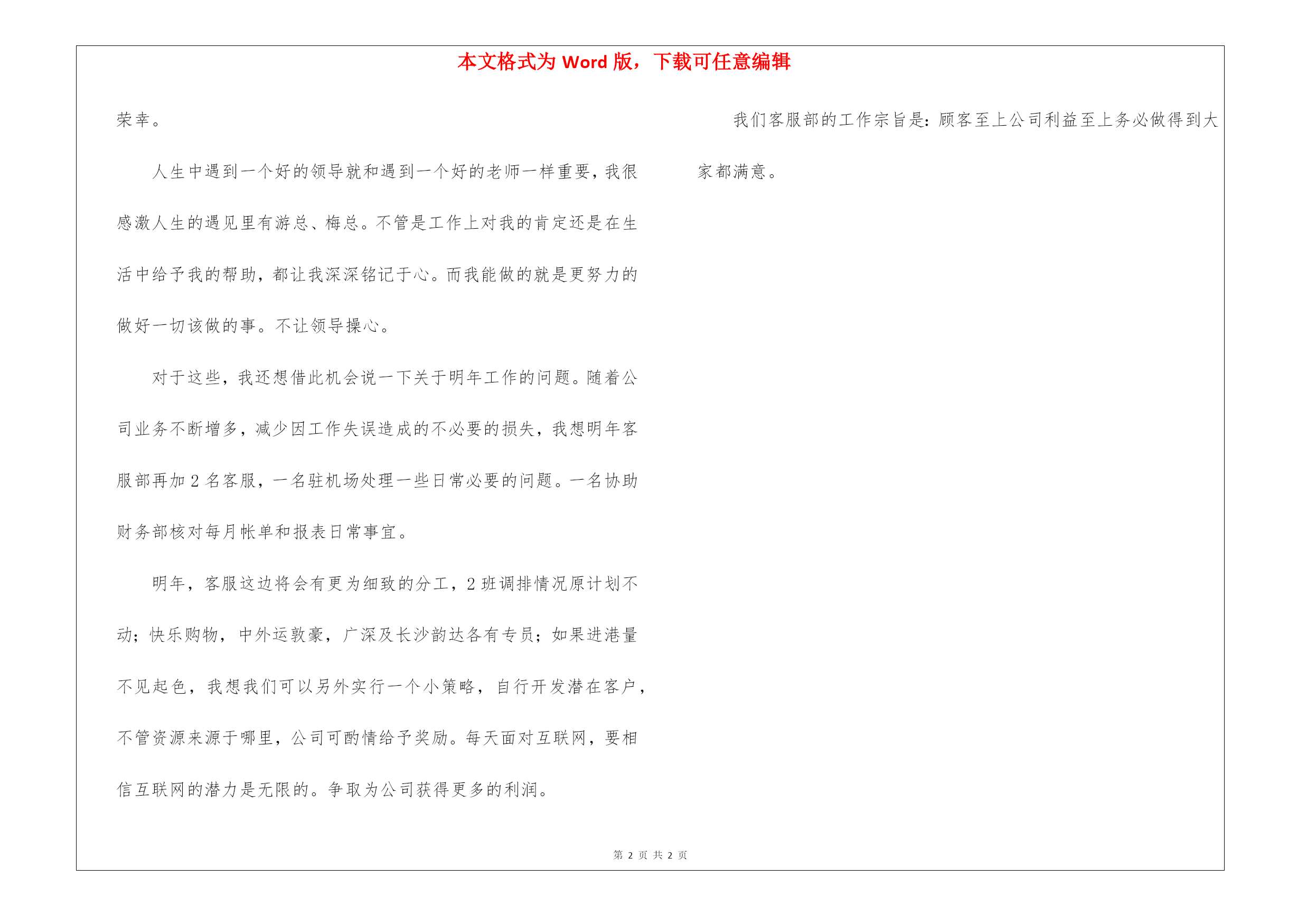 本文格式为Word版,下载可任意编辑第PAGE\*MERGEFORMAT2页共NUMPAGES\*MERGEFORMAT2页物流秘书工作总结物流秘书工作总结总结就是对一个时期的学习、工作或其完成情况进行一次全面系统的回顾和分析的书面材料,它在我们的学习、工作中起到呈上启下的作用,不如我们来制定一份总结吧。我们该怎么去写总结呢?下面是我为大家编写的物流秘书工作总结,仅供参考,希望能够帮助到大家。大家好!现在由我向报告大家这一年工作总结。为了方便大家的时间,我把报告分为三大类。对于这些,感谢一直以来和我甘苦与共的姐妹们,因为有你们各位,才使我有勇气,有毅力,有能力走到现在。感谢你们对这份工作的认真,负责以及对领导下达各项指令的积极配合与执行,为后续工作的顺利进行减少了很多不必要的麻烦。这是我们客服部门值得骄傲的地方——执行力相对较强。当然,我们也有过小的失误和过错,非常感谢各部门同志的查漏补缺,才及时遏制了事故发生的可能性,也为公司减少了不必要的损失。及时了解货物的安全性和时效性,做到了掌握每一件货物的动向,防患于未然;感谢谢帆把所有进港货物处理得井井有条,做到了派送时效零投诉,真正的是急客户之所寄,寄客户之所急。并在各网络单位中树立起了良好口碑;感谢戴静的.不断努力,虽然进公司不久,却也努力学习,努力调整自己前进的步伐,事无巨细,尽力分担的奉献。这一年,我们的办公室变了,变得更规范了,人员也增加了,而且也预计了明年还会继续改变和增加,我想不只我们部门,其他部门也是一样。感谢老游总给了我们这样一份工作的舞台;感谢梅总教导我们如何在这舞台上表演。让我有机会与大家一起分享我的工作心得,我很荣幸。人生中遇到一个好的领导就和遇到一个好的老师一样重要,我很感激人生的遇见里有游总、梅总。不管是工作上对我的肯定还是在生活中给予我的帮助,都让我深深铭记于心。而我能做的就是更努力的做好一切该做的事。不让领导操心。对于这些,我还想借此机会说一下关于明年工作的问题。随着公司业务不断增多,减少因工作失误造成的不必要的损失,我想明年客服部再加2名客服,一名驻机场处理一些日常必要的问题。一名协助财务部核对每月帐单和报表日常事宜。明年,客服这边将会有更为细致的分工,2班调排情况原计划不动;快乐购物,中外运敦豪,广深及长沙韵达各有专员;如果进港量不见起色,我想我们可以另外实行一个小策略,自行开发潜在客户,不管资源来源于哪里,公司可酌情给予奖励。每天面对互联网,要相信互联网的潜力是无限的。争取为公司获得更多的利润。我们客服部的工作宗旨是:顾客至上公司利益至上务必做得到大家都满意。