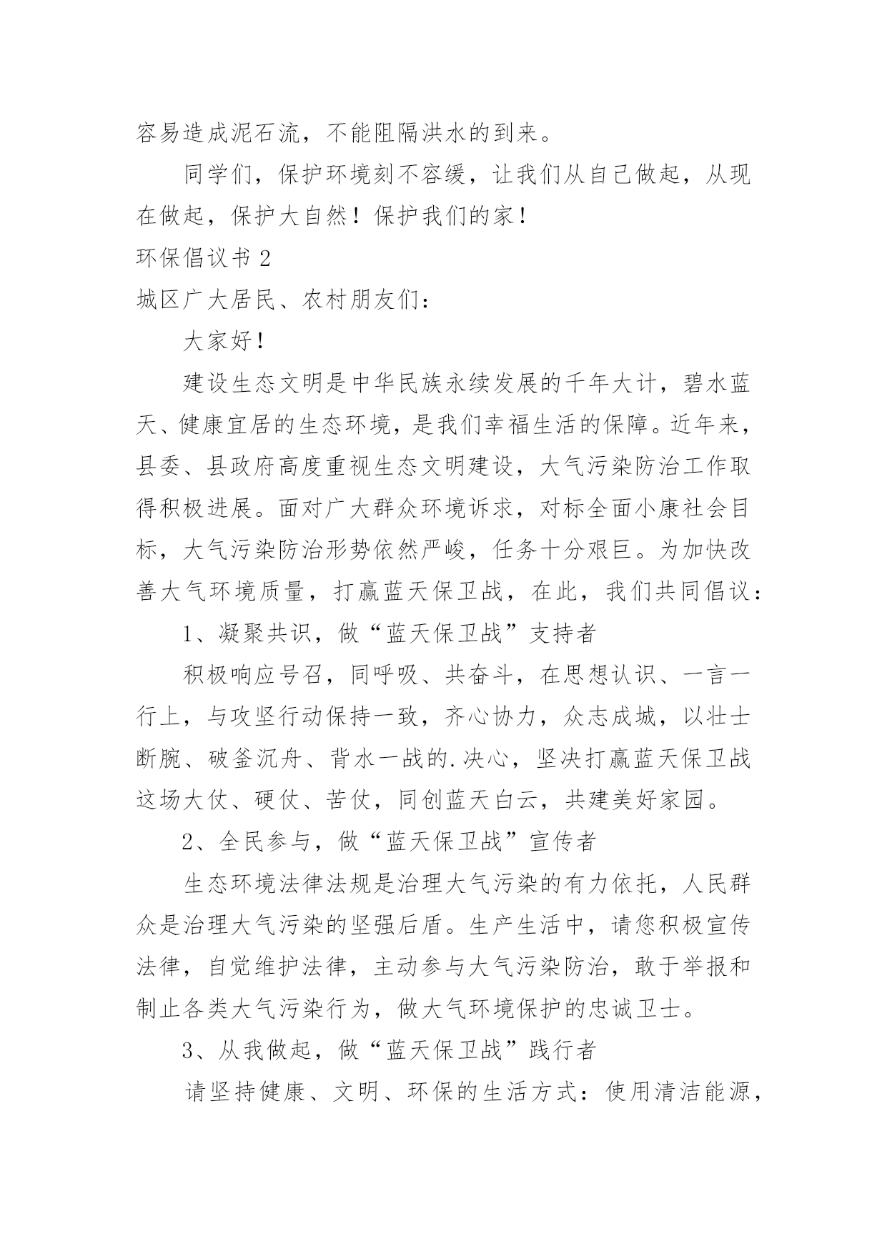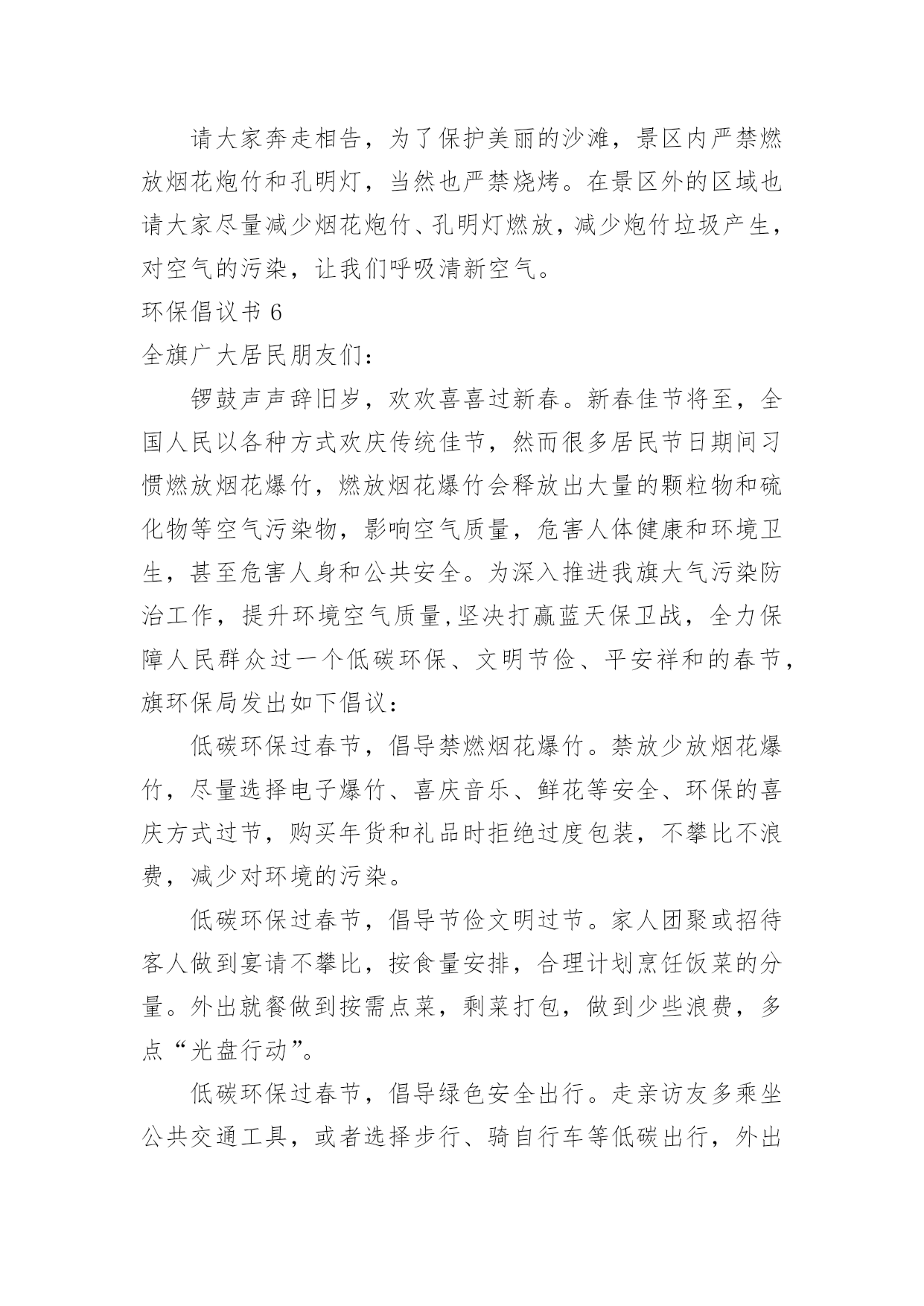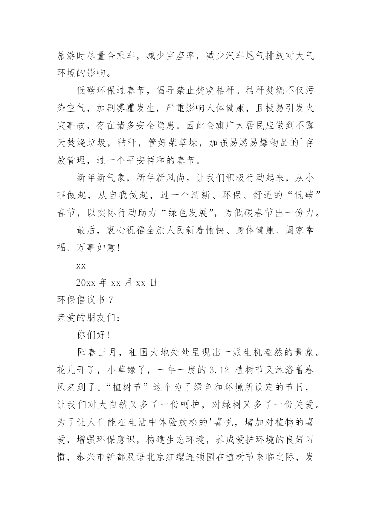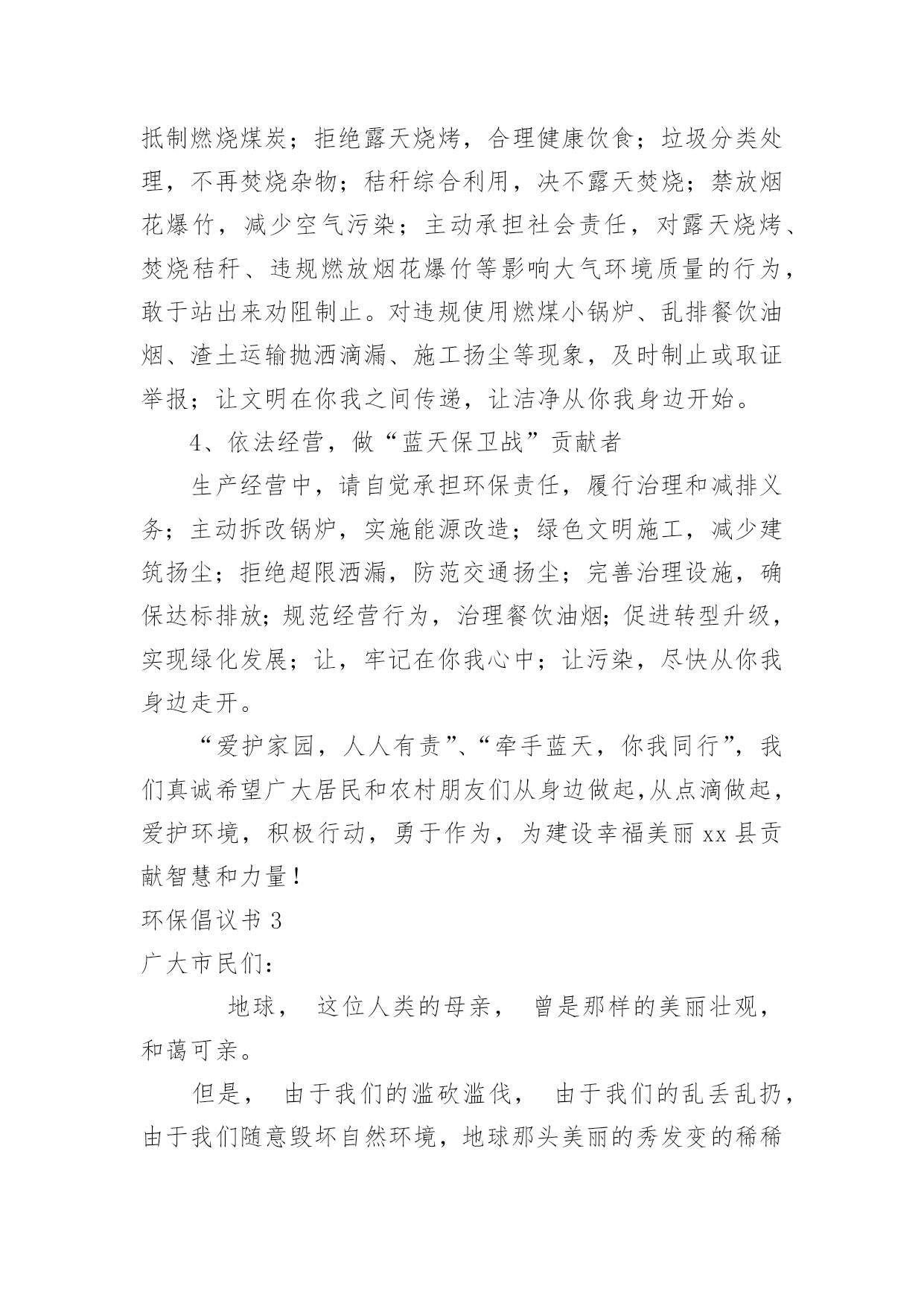 环保倡议书环保倡议书[通用15篇]在现在的社会生活中,能够利用到倡议书的场合越来越多,倡议书有利于倡议者交代清楚倡议活动的原因,以及当时的各种背景事实。倡议书的注意事项有许多,你确定会写吗?下面是小编整理的环保倡议书,欢迎大家分享。环保倡议书1亲爱的朋友们:我们的地球本应该是一个鸟语花香,充满生机的大星球。可正是这样一个美丽的星球却被我们这些不懂欣赏的.人毁灭了。现在沙漠地区风沙很大,风力最大可达到十二级,强大的风卷起大量浮沙行成凶猛的风沙流,不断吹蚀着地面,使地面发生急剧变化。一、禁止乱扔垃圾,这是保护地球的第一点,这样减少了世上的垃圾,也减少对地球的伤害。二、不浪费水,我们一点一滴的水都是从大河海中来的,我们用完水时把水龙头关紧,这样就能节约一些水。三、不浪费纸张,纸张可以通过加工循环利用,也可以节约树木资源。四、不浪费电,电是我们日常生活中必不可少的,没有了电,电灯就亮不起来,我们的夜晚就会陷入黑暗之中。五、不砍伐树木,如果没有了树木,土壤就会变松软,容易造成泥石流,不能阻隔洪水的到来。同学们,保护环境刻不容缓,让我们从自己做起,从现在做起,保护大自然!保护我们的家!环保倡议书2城区广大居民、农村朋友们:大家好!建设生态文明是中华民族永续发展的千年大计,碧水蓝天、健康宜居的生态环境,是我们幸福生活的保障。近年来,县委、县政府高度重视生态文明建设,大气污染防治工作取得积极进展。面对广大群众环境诉求,对标全面小康社会目标,大气污染防治形势依然严峻,任务十分艰巨。为加快改善大气环境质量,打赢蓝天保卫战,在此,我们共同倡议:1、凝聚共识,做“蓝天保卫战”支持者积极响应号召,同呼吸、共奋斗,在思想认识、一言一行上,与攻坚行动保持一致,齐心协力,众志成城,以壮士断腕、破釜沉舟、背水一战的.决心,坚决打赢蓝天保卫战这场大仗、硬仗、苦仗,同创蓝天白云,共建美好家园。2、全民参与,做“蓝天保卫战”宣传者生态环境法律法规是治理大气污染的有力依托,人民群众是治理大气污染的坚强后盾。生产生活中,请您积极宣传法律,自觉维护法律,主动参与大气污染防治,敢于举报和制止各类大气污染行为,做大气环境保护的忠诚卫士。3、从我做起,做“蓝天保卫战”践行者请坚持健康、文明、环保的生活方式:使用清洁能源,抵制燃烧煤炭;拒绝露天烧烤,合理健康饮食;垃圾分类处理,不再焚烧杂物;秸秆综合利用,决不露天焚烧;禁放烟花爆竹,减少空气污染;主动承担社会责任,对露天烧烤、焚烧秸秆、违规燃放烟花爆竹等影响大气环境质量的行为,敢于站出来劝阻制止。对违规使用燃煤小锅炉、乱排餐饮油烟、渣土运输抛洒滴漏、施工扬尘等现象,及时制止或取证举报;让文明在你我之间传递,让洁净从你我身边开始。4、依法经营,做“蓝天保卫战”贡献者生产经营中,请自觉承担环保责任,履行治理和减排义务;主动拆改锅炉,实施能源改造;绿色文明施工,减少建筑扬尘;拒绝超限洒漏,防范交通扬尘;完善治理设施,确保达标排放;规范经营行为,治理餐饮油烟;促进转型升级,实现绿化发展;让,牢记在你我心中;让污染,尽快从你我身边走开。“爱护家园,人人有责”、“牵手蓝天,你我同行”,我们真诚希望广大居民和农村朋友们从身边做起,从点滴做起,爱护环境,积极行动,勇于作为,为建设幸福美丽xx县贡献智慧和力量!环保倡议书3广大市民们:地球,这位人类的母亲,曾是那样的美丽壮观,和蔼可亲。但是,由于我们的滥砍滥伐,由于我们的乱丢乱扔,由于我们随意毁坏自然环境,地球那头美丽的秀发变的稀稀疏疏,地球那饱满的身躯变的骨瘦如柴,地球那容光焕发的面孔变的皱皱巴巴,一条条“皱纹”刻在了“母亲”的脸上!为了让地球母亲展开那久违的笑容,我们应该注意我们身边的一些小毛病,一些大问题!为此,我想向大家发出一些保护环境的建议:1、不乱丢乱扔,不随地吐痰,不在公共场所吸烟。2、节约水电,出门时不要忘记关灯,洗完手请立即关水龙头。3,不要随便砍伐绿色树木,践踏草地。4、不要使用塑料袋,减少白色污染。我们这个城市如果每天每人使用一个塑料袋,每天将产生5吨塑料垃圾!5、不使用一次性筷子。或许你不曾想过,哪怕我们每一个人这辈子只用一双一次性筷子,全国也得砍掉15万棵生长了20年的大树。我国每年因生产一次性筷子消耗的林料就达200万立方米,这足以引发长江洪水泛滥!以上是我提出的.不大成熟的建议,这仅仅是我对保护环境尽一份微薄的力量。但是,如果我们大家每个人都为环保尽自己所能尽一份微薄之力,那么,世界将是多么的美好!行动起来吧,从我做起,从身边小事做起,让我们为建设一个环境优美的家园而共同努力!环保倡议书4近几年来,我国污染非常严重,幸好今年有所好转。但是,现在提倡低碳生活,所以我希望大家要注意环保。环保可以说是现代生活中人类面临的最大问题,然而,要解决这一问题必须从基础做起。首先,