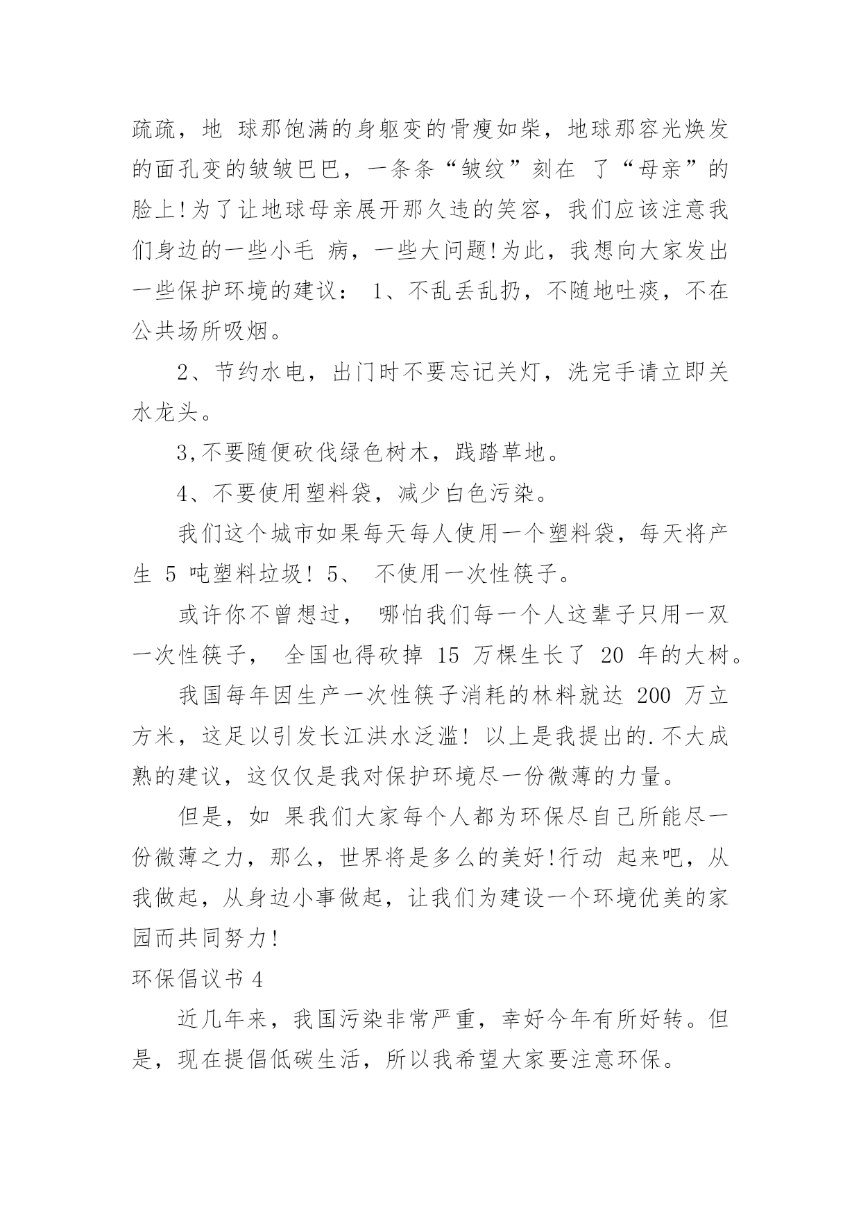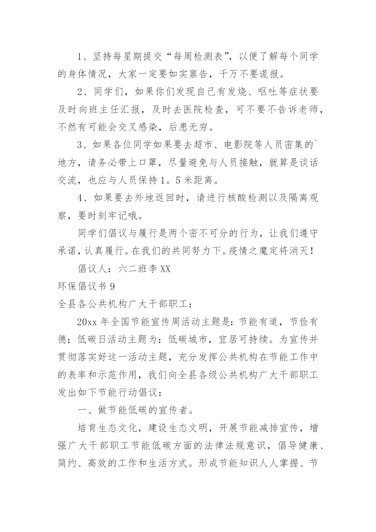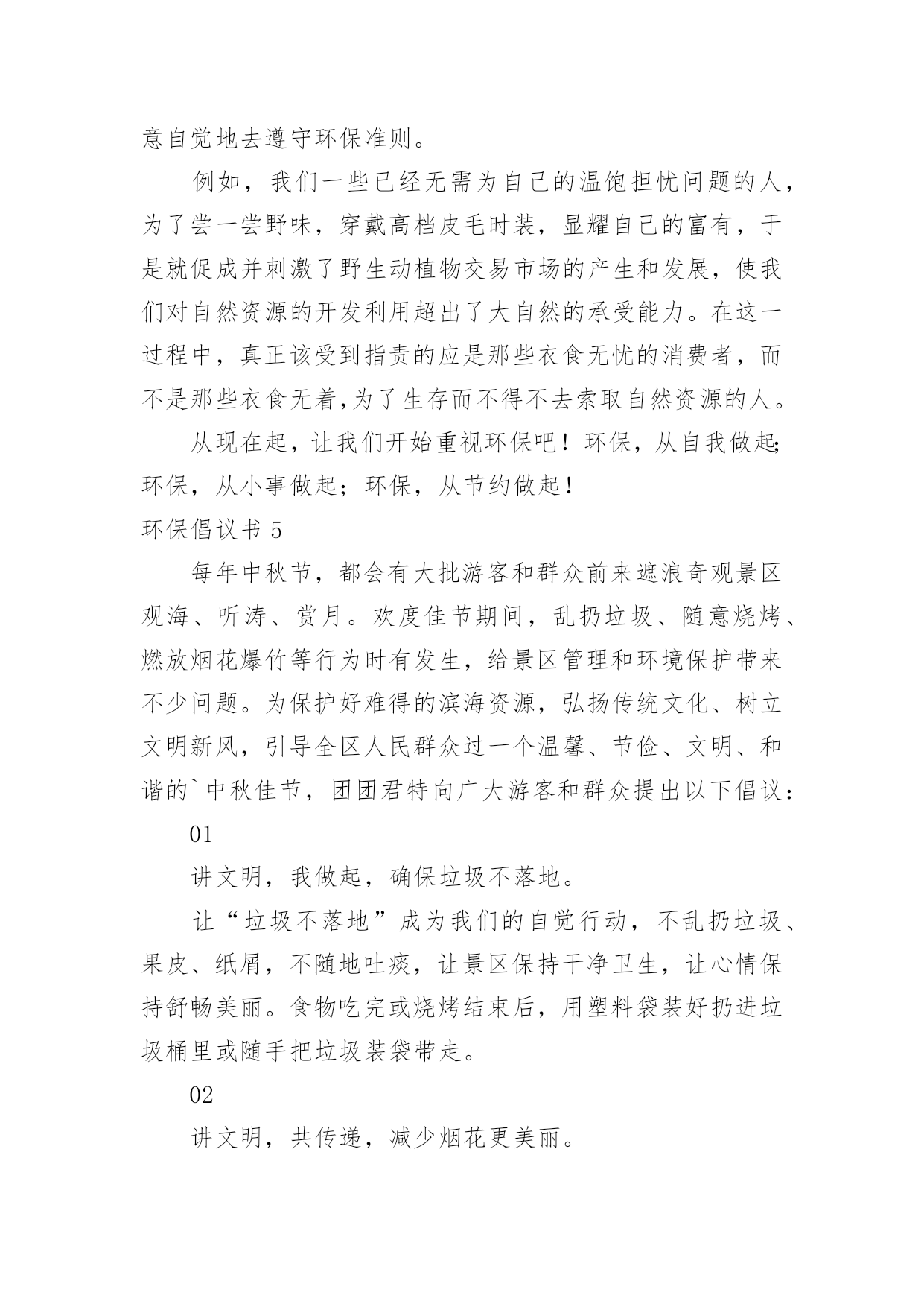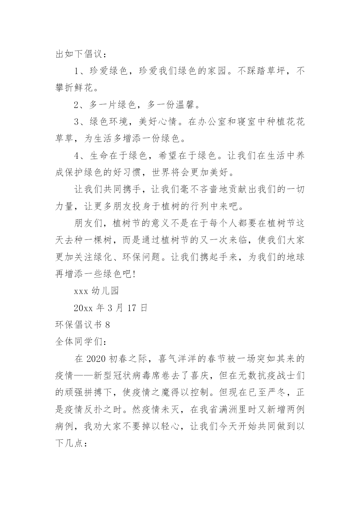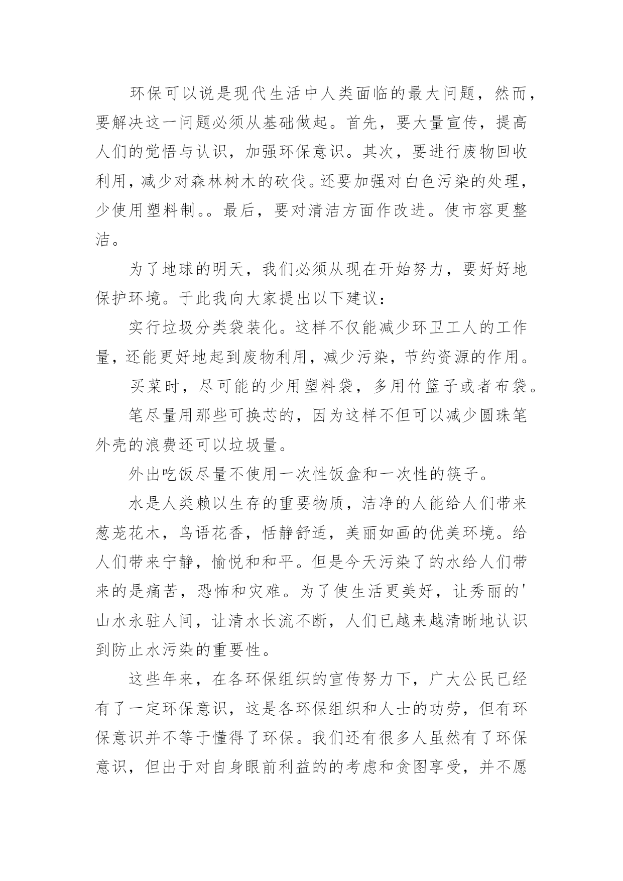 环保倡议书环保倡议书[通用15篇]在现在的社会生活中,能够利用到倡议书的场合越来越多,倡议书有利于倡议者交代清楚倡议活动的原因,以及当时的各种背景事实。倡议书的注意事项有许多,你确定会写吗?下面是小编整理的环保倡议书,欢迎大家分享。环保倡议书1亲爱的朋友们:我们的地球本应该是一个鸟语花香,充满生机的大星球。可正是这样一个美丽的星球却被我们这些不懂欣赏的.人毁灭了。现在沙漠地区风沙很大,风力最大可达到十二级,强大的风卷起大量浮沙行成凶猛的风沙流,不断吹蚀着地面,使地面发生急剧变化。一、禁止乱扔垃圾,这是保护地球的第一点,这样减少了世上的垃圾,也减少对地球的伤害。二、不浪费水,我们一点一滴的水都是从大河海中来的,我们用完水时把水龙头关紧,这样就能节约一些水。三、不浪费纸张,纸张可以通过加工循环利用,也可以节约树木资源。四、不浪费电,电是我们日常生活中必不可少的,没有了电,电灯就亮不起来,我们的夜晚就会陷入黑暗之中。五、不砍伐树木,如果没有了树木,土壤就会变松软,容易造成泥石流,不能阻隔洪水的到来。同学们,保护环境刻不容缓,让我们从自己做起,从现在做起,保护大自然!保护我们的家!环保倡议书2城区广大居民、农村朋友们:大家好!建设生态文明是中华民族永续发展的千年大计,碧水蓝天、健康宜居的生态环境,是我们幸福生活的保障。近年来,县委、县政府高度重视生态文明建设,大气污染防治工作取得积极进展。面对广大群众环境诉求,对标全面小康社会目标,大气污染防治形势依然严峻,任务十分艰巨。为加快改善大气环境质量,打赢蓝天保卫战,在此,我们共同倡议:1、凝聚共识,做“蓝天保卫战”支持者积极响应号召,同呼吸、共奋斗,在思想认识、一言一行上,与攻坚行动保持一致,齐心协力,众志成城,以壮士断腕、破釜沉舟、背水一战的.决心,坚决打赢蓝天保卫战这场大仗、硬仗、苦仗,同创蓝天白云,共建美好家园。2、全民参与,做“蓝天保卫战”宣传者生态环境法律法规是治理大气污染的有力依托,人民群众是治理大气污染的坚强后盾。生产生活中,请您积极宣传法律,自觉维护法律,主动参与大气污染防治,敢于举报和制止各类大气污染行为,做大气环境保护的忠诚卫士。3、从我做起,做“蓝天保卫战”践行者请坚持健康、文明、环保的生活方式:使用清洁能源,抵制燃烧煤炭;拒绝露天烧烤,合理健康饮食;垃圾分类处理,不再焚烧杂物;秸秆综合利用,决不露天焚烧;禁放烟花爆竹,减少空气污染;主动承担社会责任,对露天烧烤、焚烧秸秆、违规燃放烟花爆竹等影响大气环境质量的行为,敢于站出来劝阻制止。对违规使用燃煤小锅炉、乱排餐饮油烟、渣土运输抛洒滴漏、施工扬尘等现象,及时制止或取证举报;让文明在你我之间传递,让洁净从你我身边开始。4、依法经营,做“蓝天保卫战”贡献者生产经营中,请自觉承担环保责任,履行治理和减排义务;主动拆改锅炉,实施能源改造;绿色文明施工,减少建筑扬尘;拒绝超限洒漏,防范交通扬尘;完善治理设施,确保达标排放;规范经营行为,治理餐饮油烟;促进转型升级,实现绿化发展;让,牢记在你我心中;让污染,尽快从你我身边走开。“爱护家园,人人有责”、“牵手蓝天,你我同行”,我们真诚希望广大居民和农村朋友们从身边做起,从点滴做起,爱护环境,积极行动,勇于作为,为建设幸福美丽xx县贡献智慧和力量!环保倡议书3广大市民们:地球,这位人类的母亲,曾是那样的美丽壮观,和蔼可亲。但是,由于我们的滥砍滥伐,由于我们的乱丢乱扔,由于我们随意毁坏自然环境,地球那头美丽的秀发变的稀稀疏疏,地球那饱满的身躯变的骨瘦如柴,地球那容光焕发的面孔变的皱皱巴巴,一条条“皱纹”刻在了“母亲”的脸上!为了让地球母亲展开那久违的笑容,我们应该注意我们身边的一些小毛病,一些大问题!为此,我想向大家发出一些保护环境的建议:1、不乱丢乱扔,不随地吐痰,不在公共场所吸烟。2、节约水电,出门时不要忘记关灯,洗完手请立即关水龙头。3,不要随便砍伐绿色树木,践踏草地。4、不要使用塑料袋,减少白色污染。我们这个城市如果每天每人使用一个塑料袋,每天将产生5吨塑料垃圾!5、不使用一次性筷子。或许你不曾想过,哪怕我们每一个人这辈子只用一双一次性筷子,全国也得砍掉15万棵生长了20年的大树。我国每年因生产一次性筷子消耗的林料就达200万立方米,这足以引发长江洪水泛滥!以上是我提出的.不大成熟的建议,这仅仅是我对保护环境尽一份微薄的力量。但是,如果我们大家每个人都为环保尽自己所能尽一份微薄之力,那么,世界将是多么的美好!行动起来吧,从我做起,从身边小事做起,让我们为建设一个环境优美的家园而共同努力!环保倡议书4近几年来,我国污染非常严重,幸好今年有所好转。但是,现在提倡低碳生活,所以我希望大家要注意环保。环保可以说是现代生活中人类面临的最大问题,然而,要解决这一问题必须从基础做起。首先,